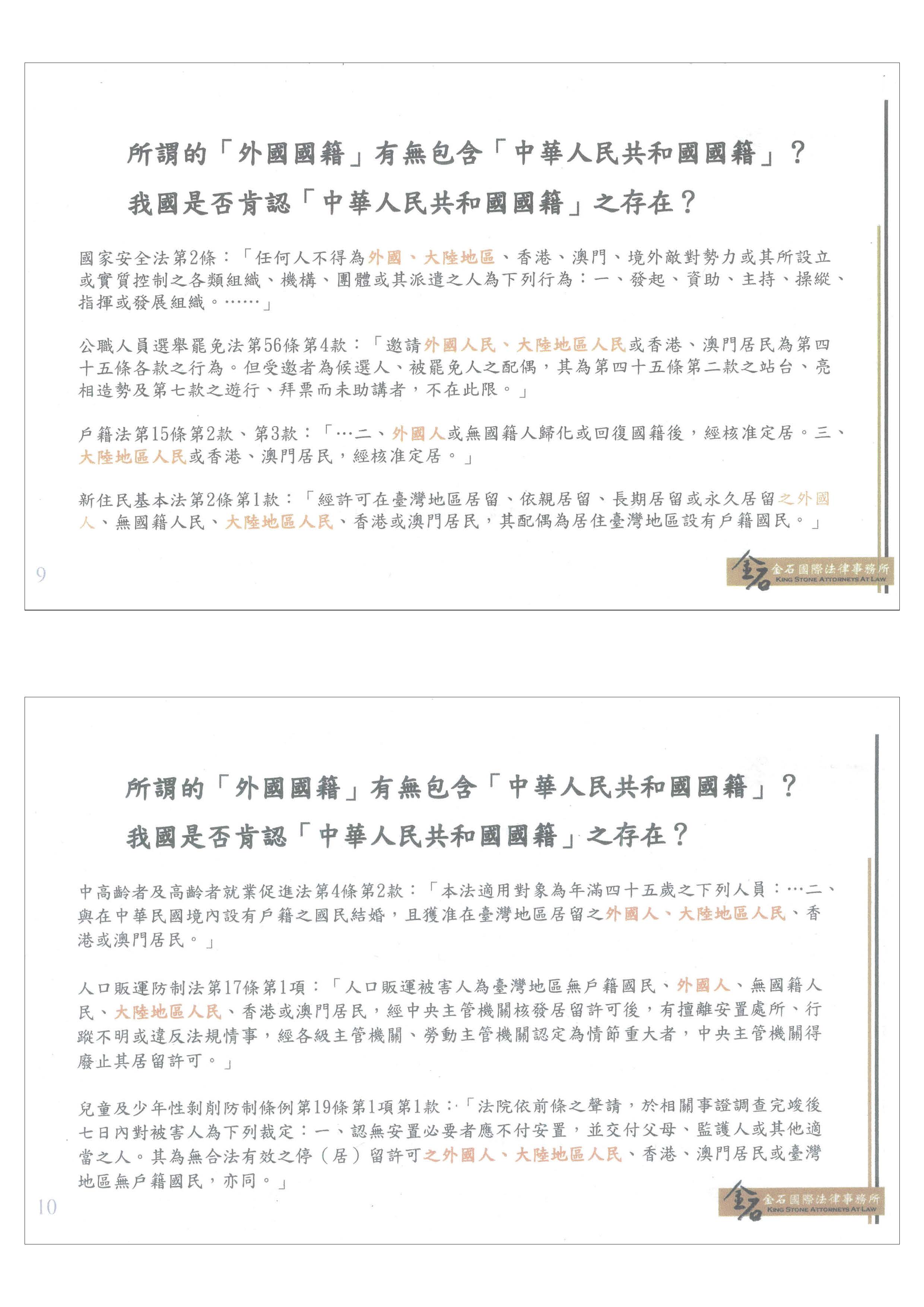 依照我國憲法增修條文前言,還有我國憲法增修條文第十一條的規定,明確揭示對於對岸地區,我們是用大陸地區做為法定用語,並沒有所謂的中華人民共和國的存在。而且在法律上,我國的國家安全法第二條,還有公職人員選舉罷免法第五十六條第四款,還有戶籍法、新住民基本法,都把外國跟大陸地區加以區分,顯見立法者也認為外國人與大陸地區的人民是不同的人。
