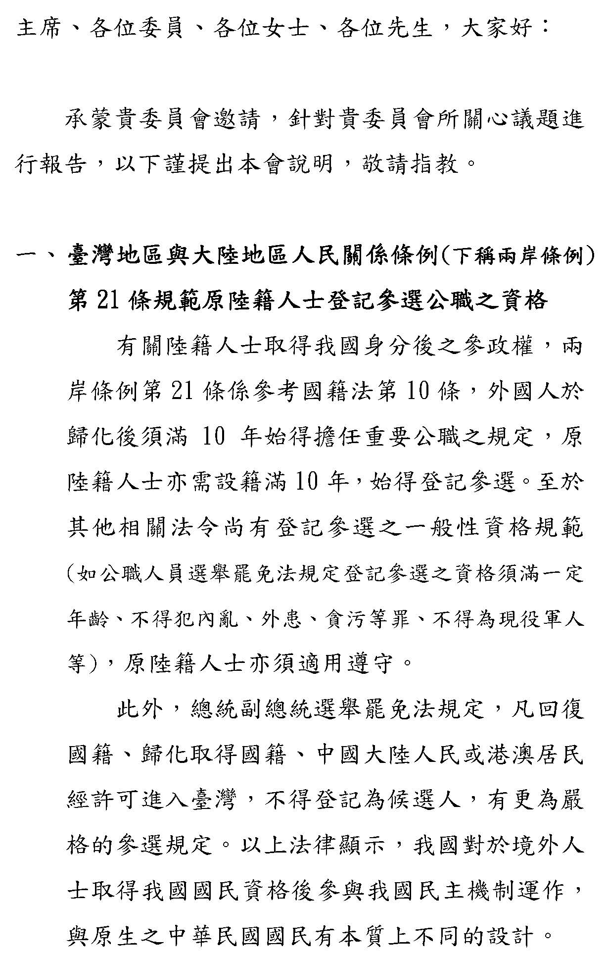 有下面四點報告:第一點,參政權是一個公民權,而非基本人權,並沒有現行法制在原則上剝奪了某一個背景人員參與中華民國政治的權利,這個其實是不存在的。第二點,目前的修法建議說要對於大陸人民取得臺灣身分之後,如果要任職或是參政必須要放棄原國籍不適用於大陸人民,這樣的修法建議我認為是有問題的,並非一個好的方式,也不是負責任政府或是負責任國會、或是政黨應該要採取的態度。第三點,現在涉及的議題非關修憲,也並不是法律衝突。目前國籍法第二十條適用於大陸地區取得臺灣身分的人民,並不會因為憲法規定或是因為兩岸人民關係條例之規定而有排除適用。第四點,跟各位探討一下可行的替代模式,當然第四點要尊重主管機關的意見。