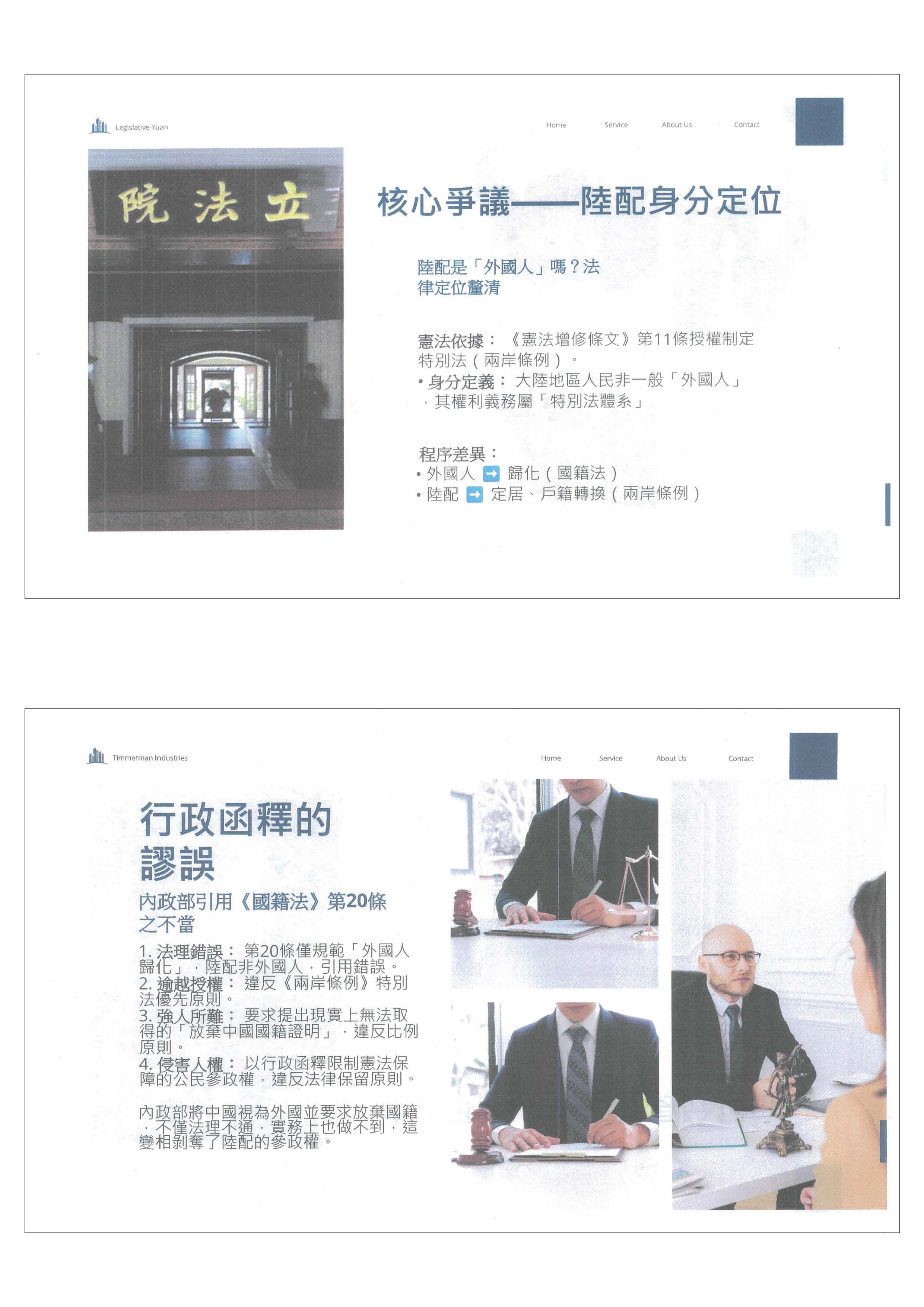 第一個,行政院在112年就已經明確指出兩岸互不隸屬是既成事實,但這樣的事實可能不為在野黨委員所接受,行政院的函其實已經寫得非常清楚,而且我要談的是臺灣走過民主化,政黨輪替、憲政深化,兩岸互不隸屬早就是事實,但是有人不願意見到這個事實,也不願意認清這個現實,還要繼續用三十多年前的法律精神、剛解嚴不久的制度來宣稱中國人民也是我國國民,真的顯得非常荒謬,剛剛陳老師也說得非常清楚了,這種論述跟現實脫節,更是在直接否定、打臉臺灣這三十多年來的民主進化,因此我認為這件事情非常不可取。