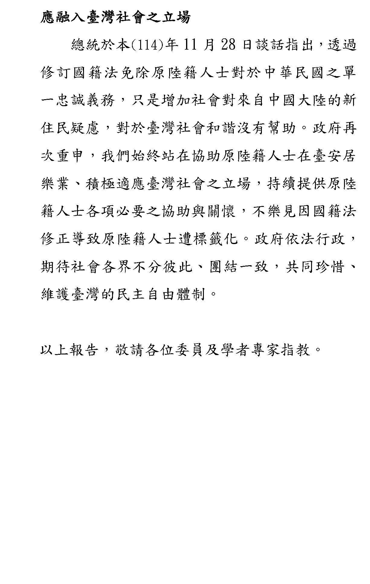 另外,有關取得切結書的部分,我這邊也簡單做說明,第一個,在國籍法第二十條規定,我們並沒有以切結書替代的規定,這個並沒有解釋的空間,而且大陸能不能放棄它的國籍,這是中華人民共和國的權利跟義務,它要不要出具證明給放棄資格的原中國大陸地區人民,那個是由中華人民共和國自行決定,我們也沒有修法的必要。以上先簡單就剛剛委員提到的幾個重點部分,我們內政部把我們的立場做一個說明。以上。