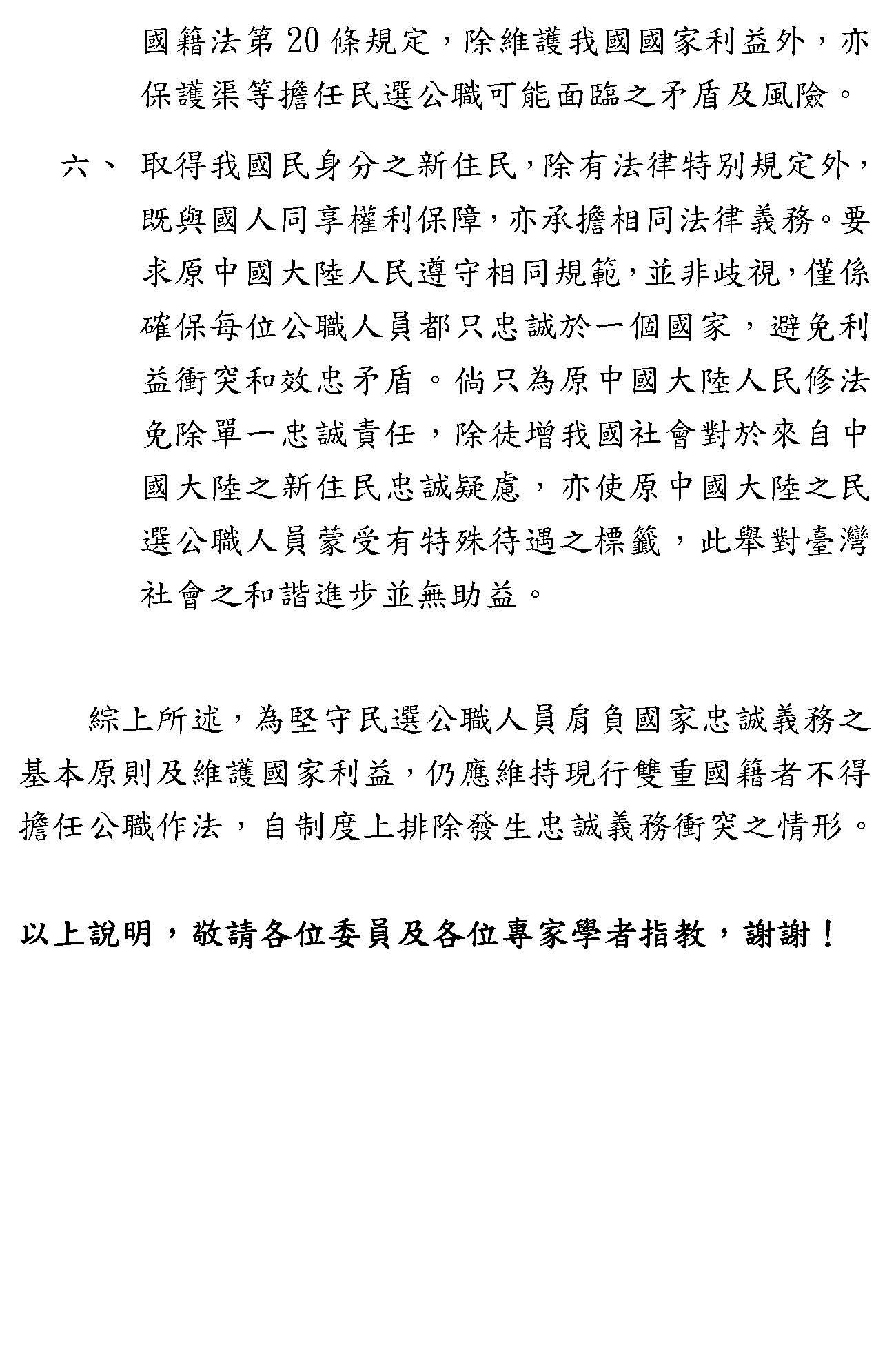 綜上所述,為堅守民選公職人員肩負國家忠誠義務之基本原則及維護國家利益,仍應維持現行雙重國籍者不得擔任公職作法,自制度上排除發生忠誠義務衝突之情形。