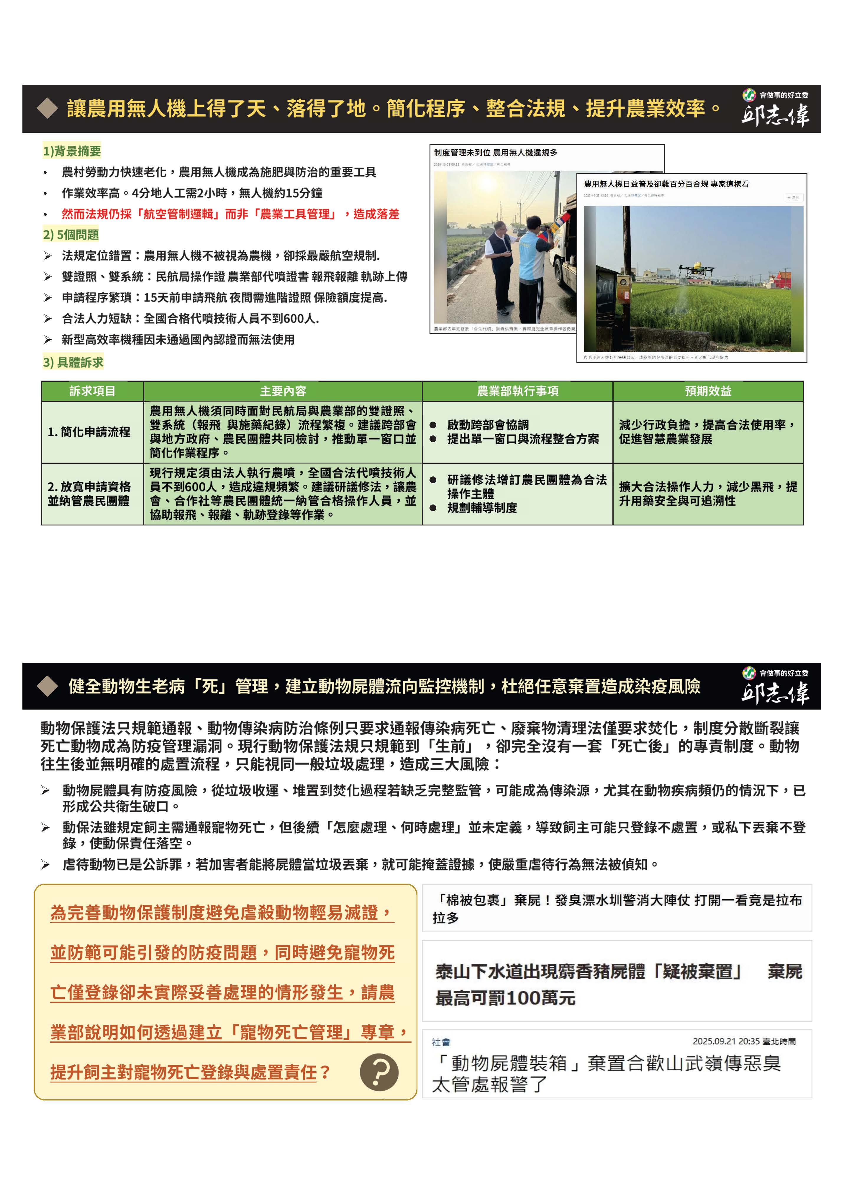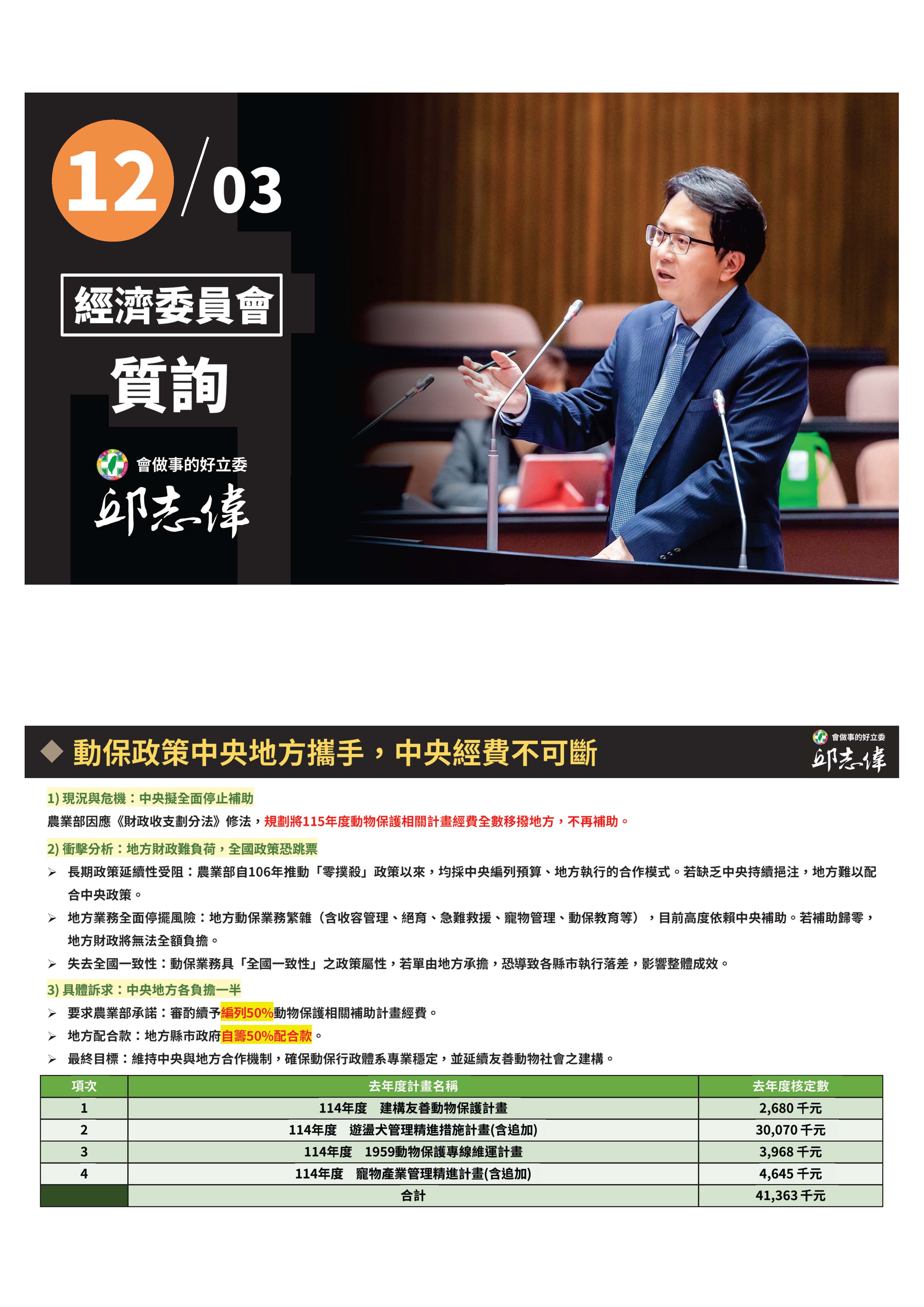 第二個重點是在補強非法繁殖場跟地下寵物市場的執法缺口。現在私繁的問題非常嚴重,以現行動保法第二十五條之二的規定,未經許可沒有特種證而非法營利之人,最低的罰則罰款其實也是偏低,嚴重弱化了源頭的管理。另外,第三十三條之二第三項只規定主管機關得發給檢舉獎金,導致各地方的執行標準不一,所以民眾檢舉私繁案件的意願也不足,進而影響我們查緝的效率。所以,針對這部分,本席提案的修法重點特別包含提高非法繁殖跟販售業者最低的罰鍰,讓業者不能再用極低的成本來從事非法繁殖的暴利行為。另外,檢舉獎金的獎勵制度從「得」改為「應」,建立全國一致的執行標準以提升檢舉的誘因。另外第三個就是我一直不斷地強調,要強化源頭管理跟跨縣市查緝的效率,使非法的繁殖黑市能夠無所遁形,希望藉此修法能夠打擊地下繁殖場。