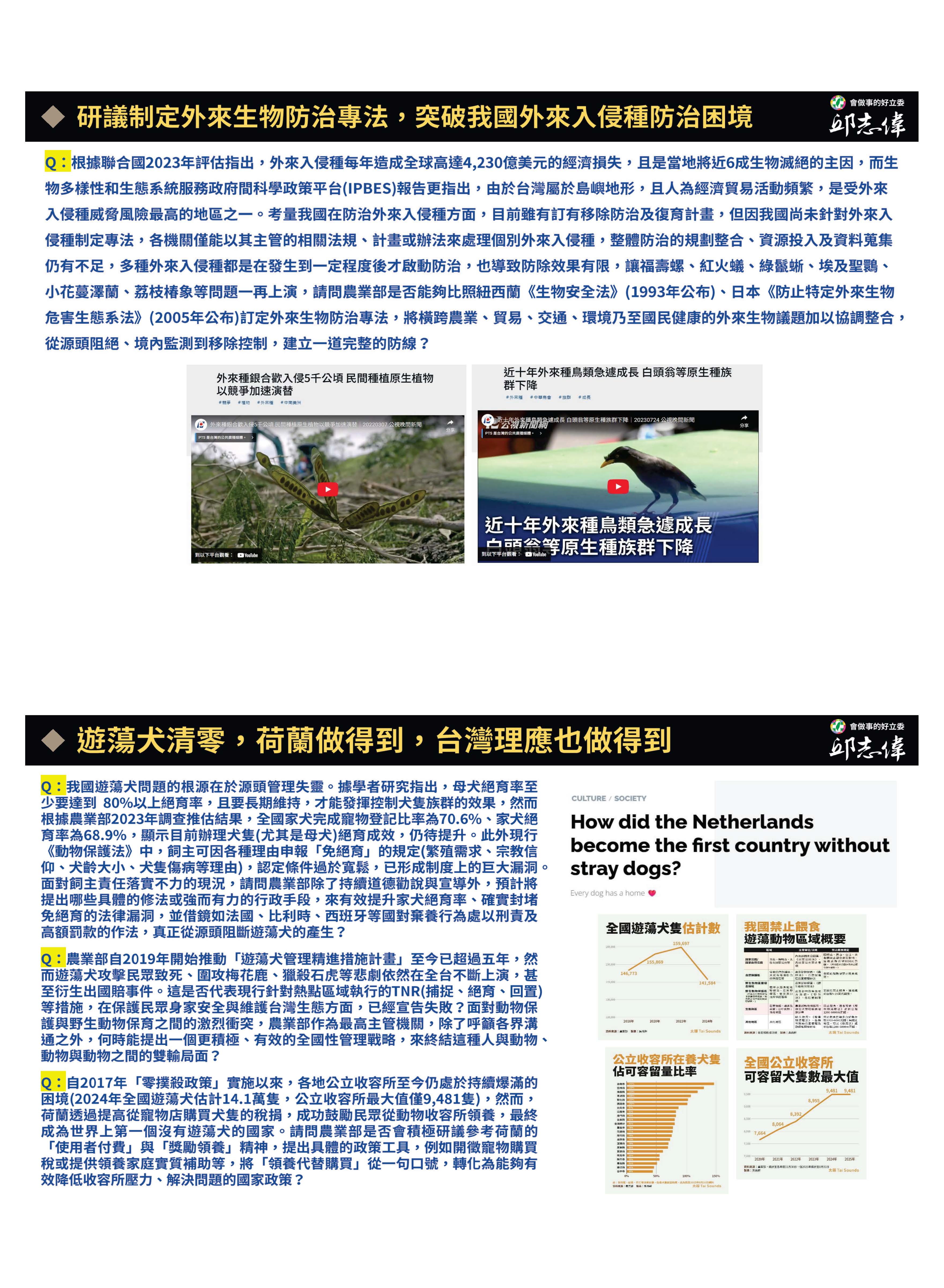 再來第三個,就是我一直不斷地在關心私繁的問題,私人繁殖場、非法繁殖場。有特寵證的人人犬舍都會出事,更何況是私繁的問題現在也潛藏在整個所有的網路平台。不管是利用IG也好,用LINE也好,他們其實都在做這樣的私繁的延伸。這個部分我們常常只有追究所謂的行為人,強調行為人的責任,但是平台的責任誰要來管?我們是不是可以負起這樣的監管責任?這是第三個問題。