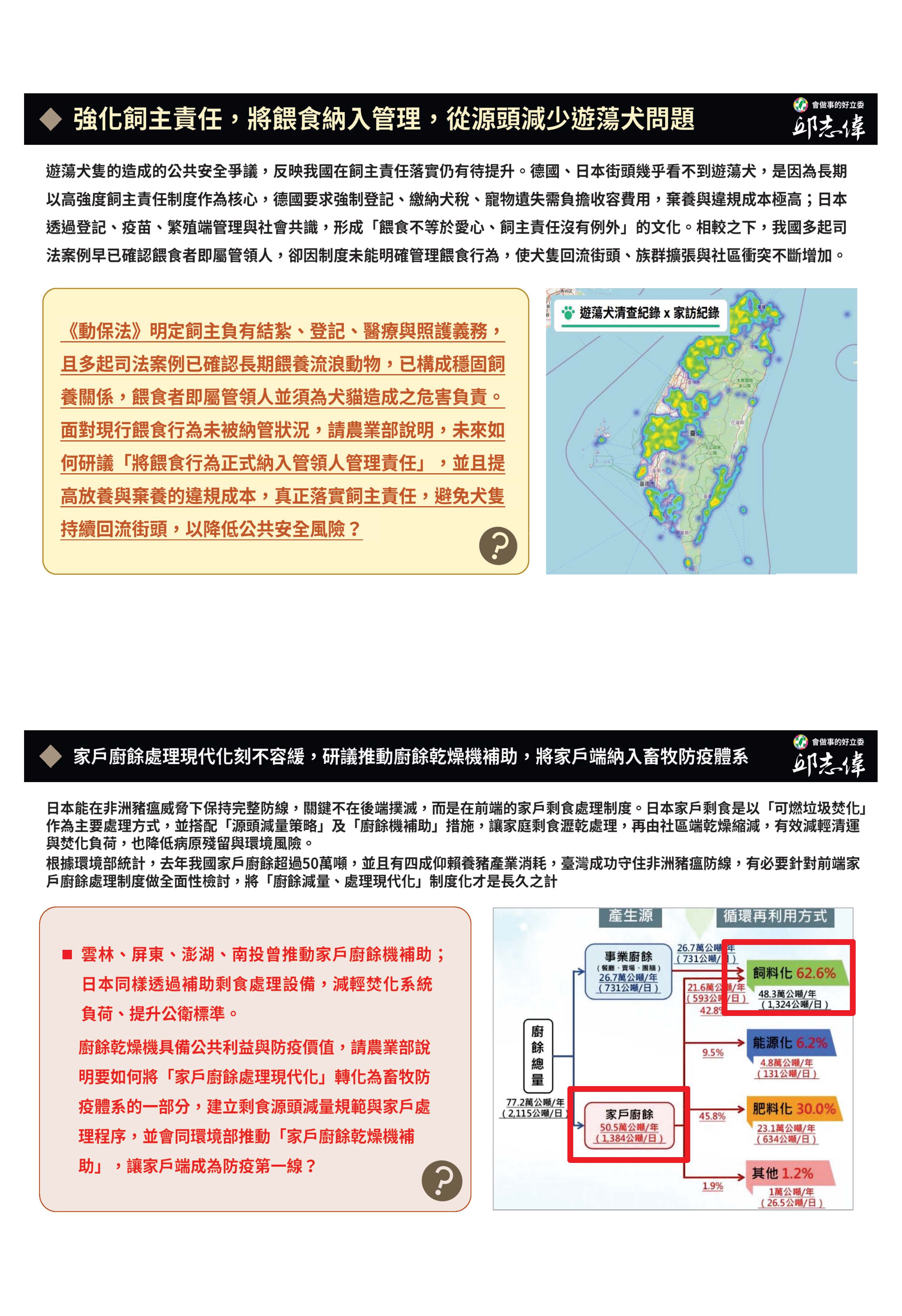 第二個問題,現在在網路上面流竄的,還有很多食品安全危害的問題。我所謂的食品安全問題是包含自製的,不管是鮮食也好,或者是風乾過後的一些產品也好,分裝成所謂的寵物食品在網路上做販售。但是它沒有成分的檢驗,也沒有產品的責任險等等,這些我們應該要怎麼樣才有法可管?這是第二個問題。