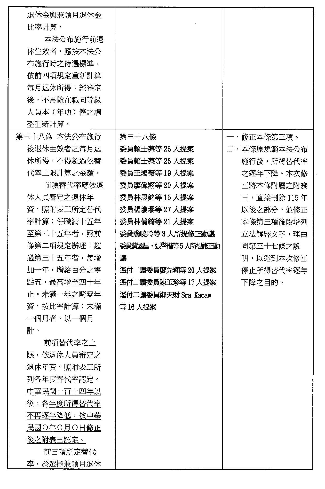 一、有關提案第37條及第38條自113年1月1日起停止逐年降低退休所得替代率,以及恢復退休人員月退休所得隨現職人員待遇調整部分: