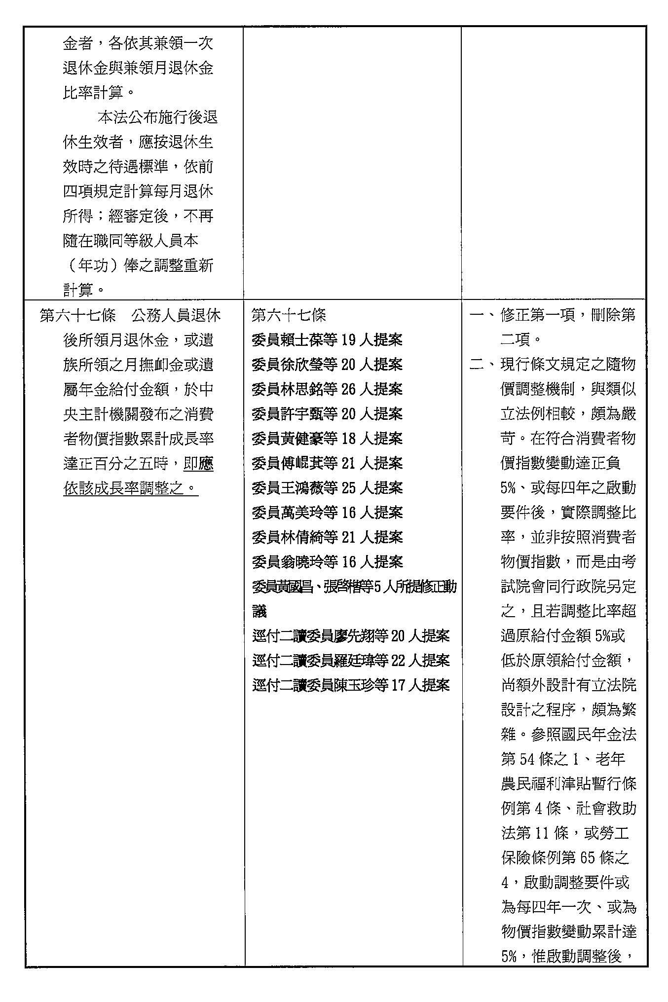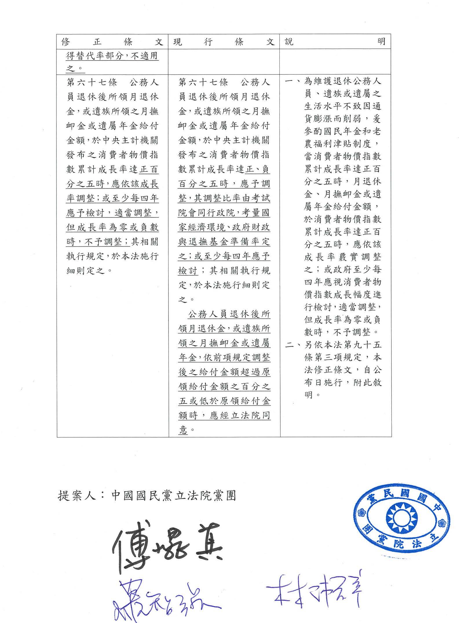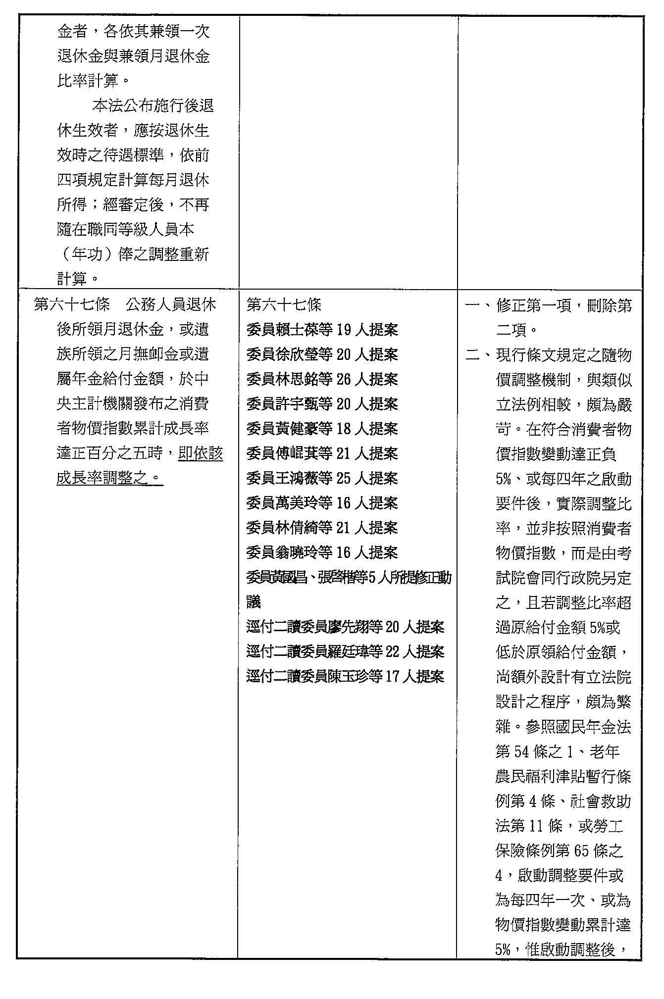 案由:本院委員陳玉珍等17人,有鑑於現行公務人員退休資遣撫卹法之規定,大幅減少已依法審定年金之所得替代率,且連續十年內每年減少百分之一點五之所得替代率,更規定年金不再隨在職人員薪俸調整。有鑑於近年通貨膨脹、物價指數飛漲,逐年減少所得替代率將使退休公務人員生活條件逐年陷入不利,而有違公平正義、信賴保護原則之嫌,且調整、定期檢討規定有所不足,無法及時因應金融環境、物價波動調整本法各類年金之給付金額。爰擬具「公務人員退休資遣撫卹法第三十七條、第三十八條及第六十七條條文修正草案」,以保障退休公務人員之生活。是否有當?敬請公決。