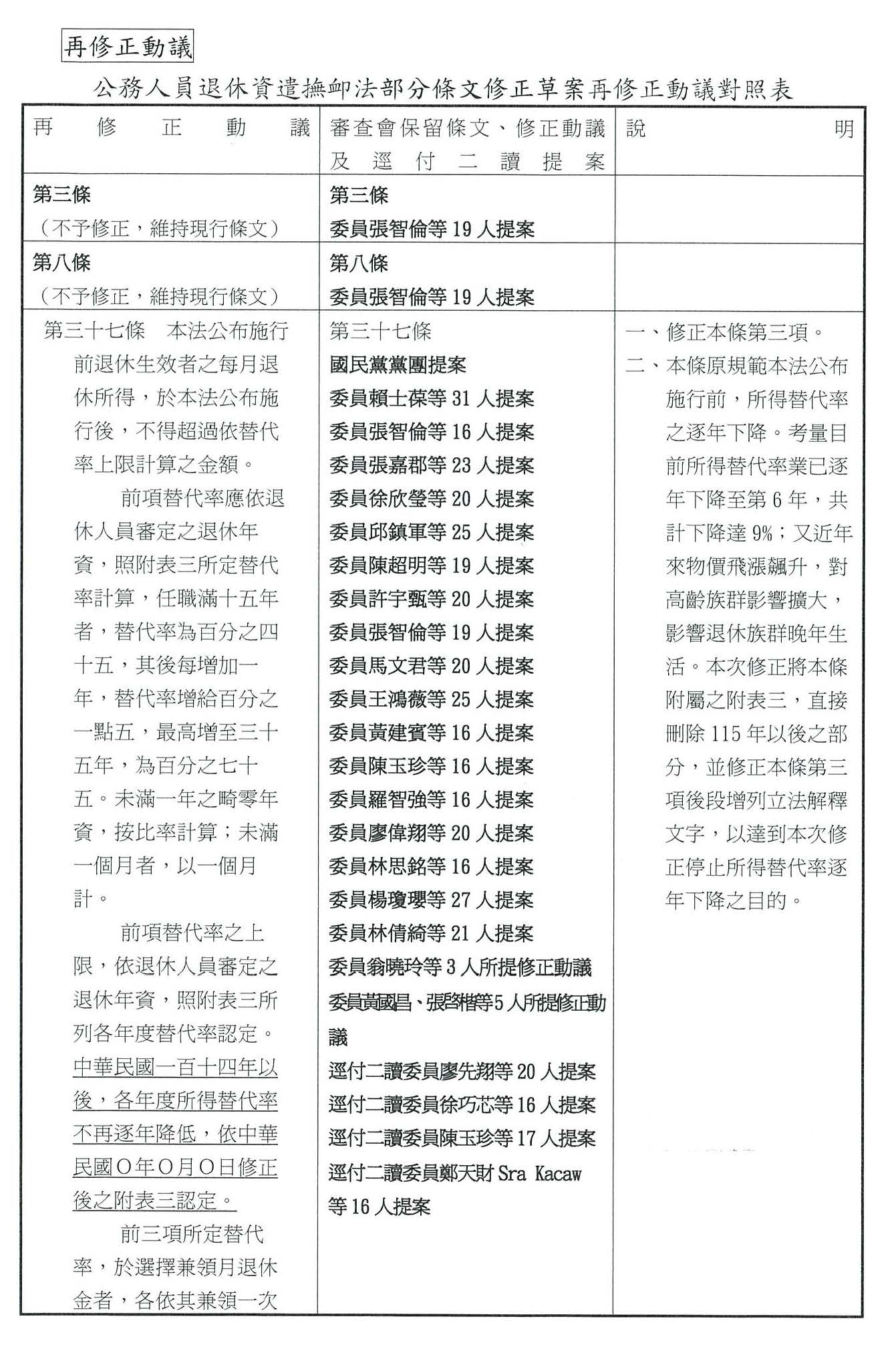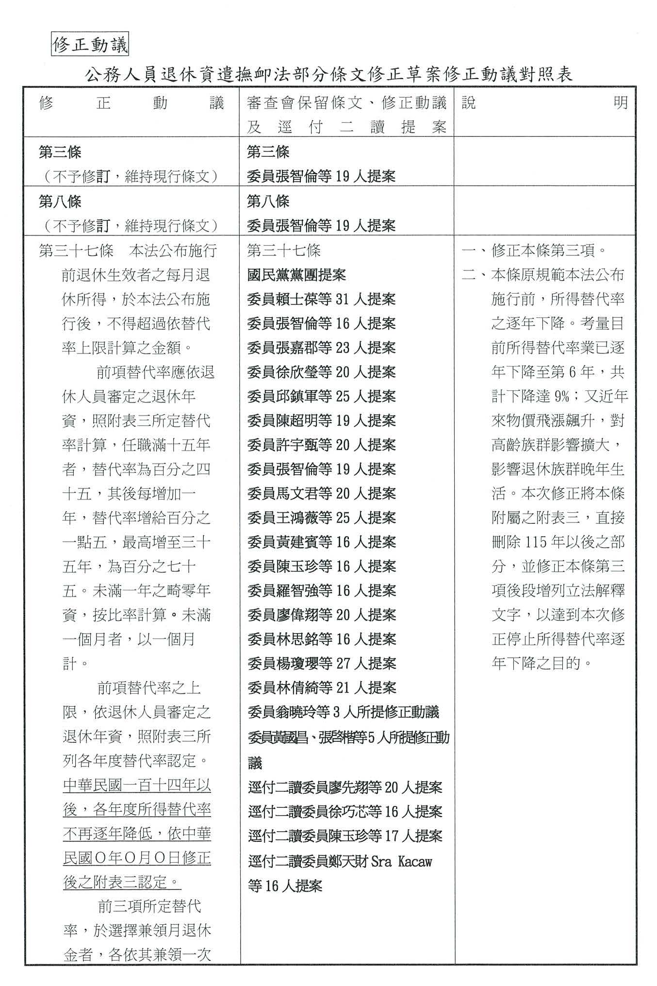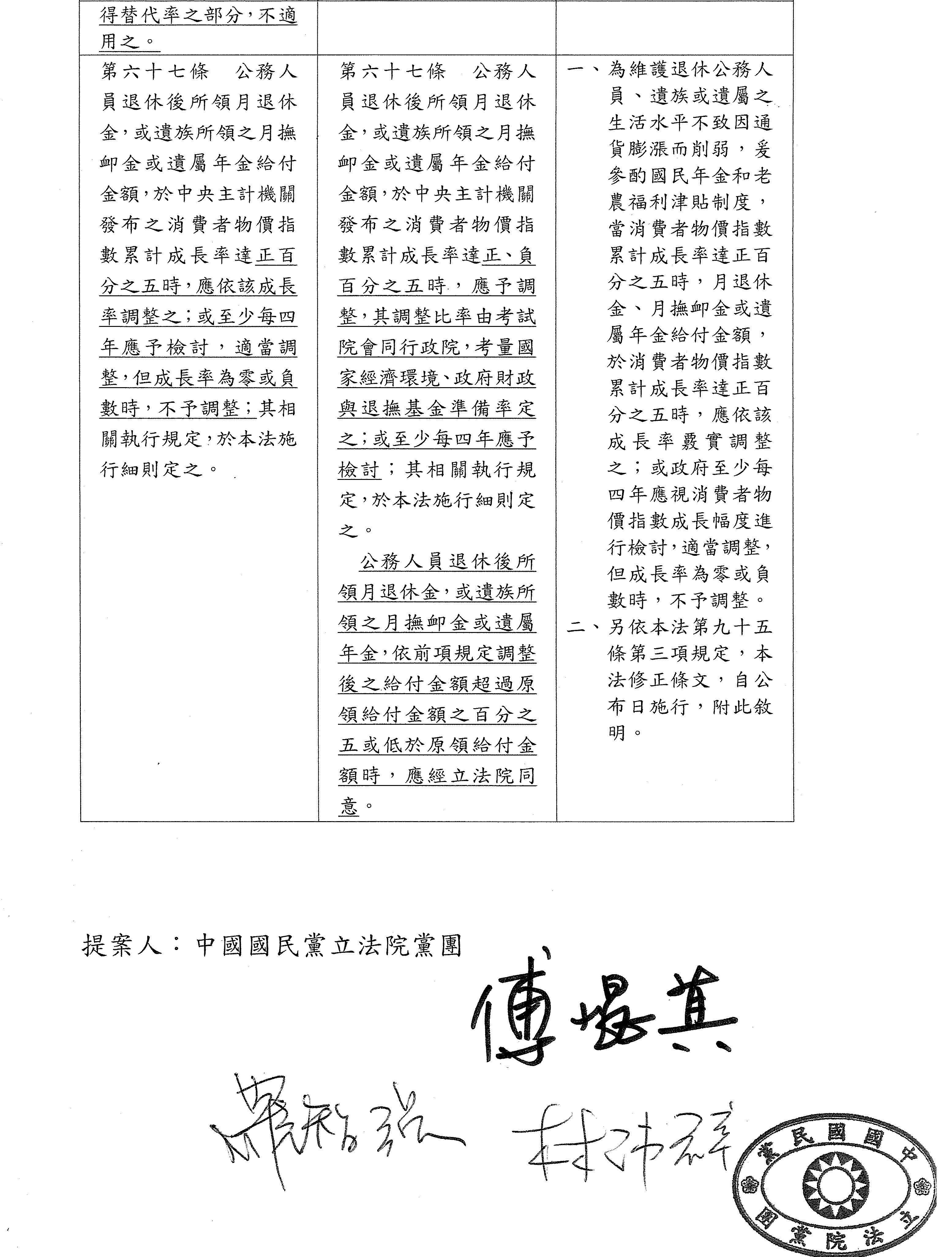 案由:本院委員陳玉珍等17人,有鑑於現行公務人員退休資遣撫卹法之規定,大幅減少已依法審定年金之所得替代率,且連續十年內每年減少百分之一點五之所得替代率,更規定年金不再隨在職人員薪俸調整。有鑑於近年通貨膨脹、物價指數飛漲,逐年減少所得替代率將使退休公務人員生活條件逐年陷入不利,而有違公平正義、信賴保護原則之嫌,且調整、定期檢討規定有所不足,無法及時因應金融環境、物價波動調整本法各類年金之給付金額。爰擬具「公務人員退休資遣撫卹法第三十七條、第三十八條及第六十七條條文修正草案」,以保障退休公務人員之生活。是否有當?敬請公決。