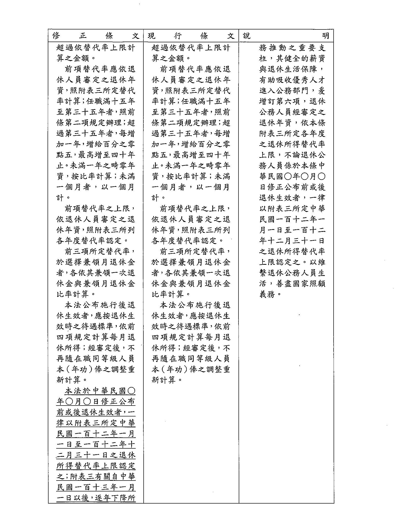 一、修正本條第五項,增訂本條第六項。 二、基於維護公務人員退休生活,同時完善公務體系薪資與保障,並考量近年來消費者物價指數年年上漲,對於以退休者生活產生實質影響,原將本條明「不再」隨在職人員予以修正,維護以退休之高齡者生活。 三、另綜合本條各項規定,使退休公務人員年金逐年減少共十年,直到所得替代率變為最高60%、最低30%,基於上述維持老年生活之同一原因,亦有修正之必要。爰增訂第六項,規定附表三有關於所得替代率之部分,於一百十三年一月一日之後 部分均不適用,停止所得替代之逐年降低。 |