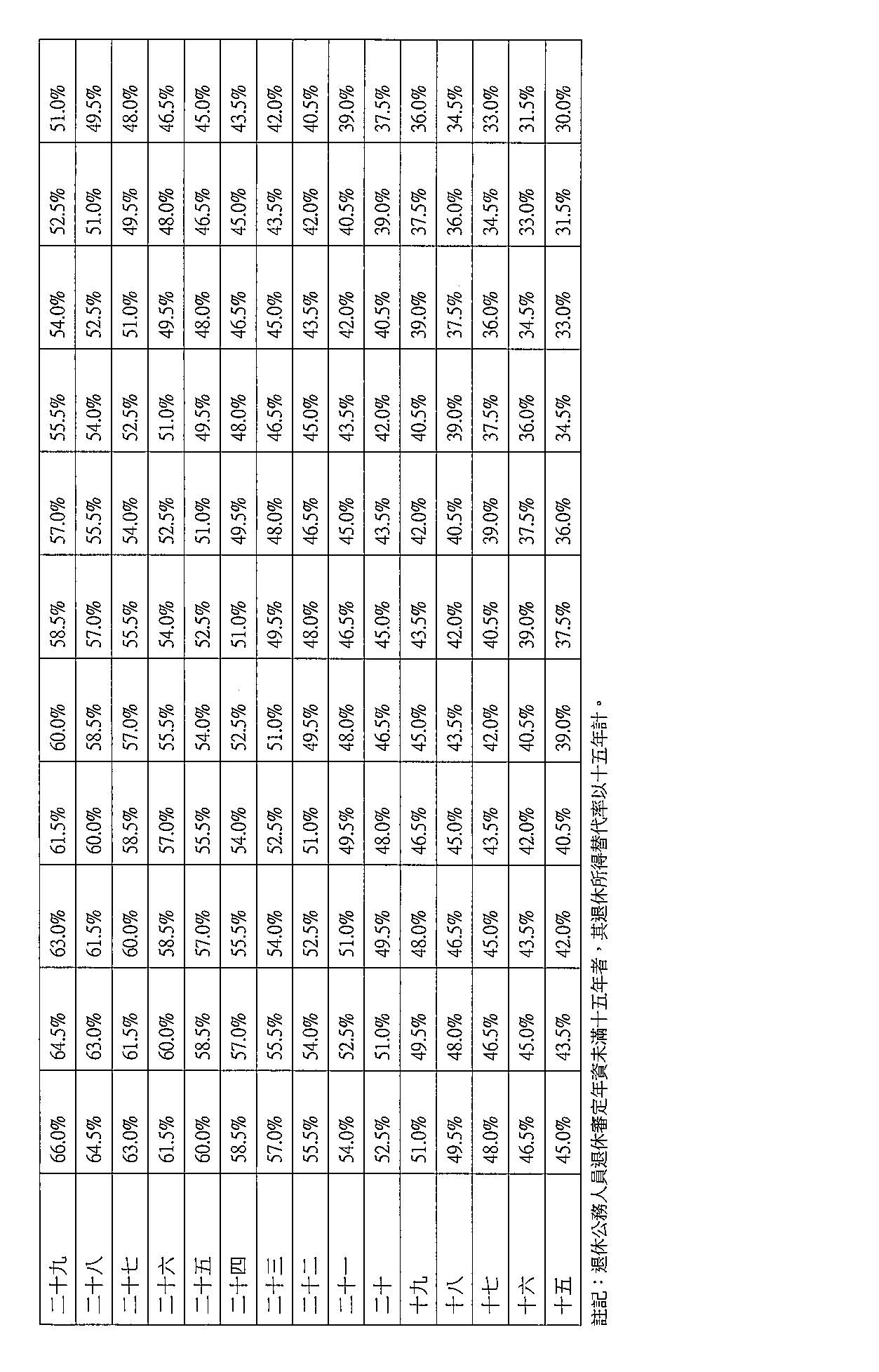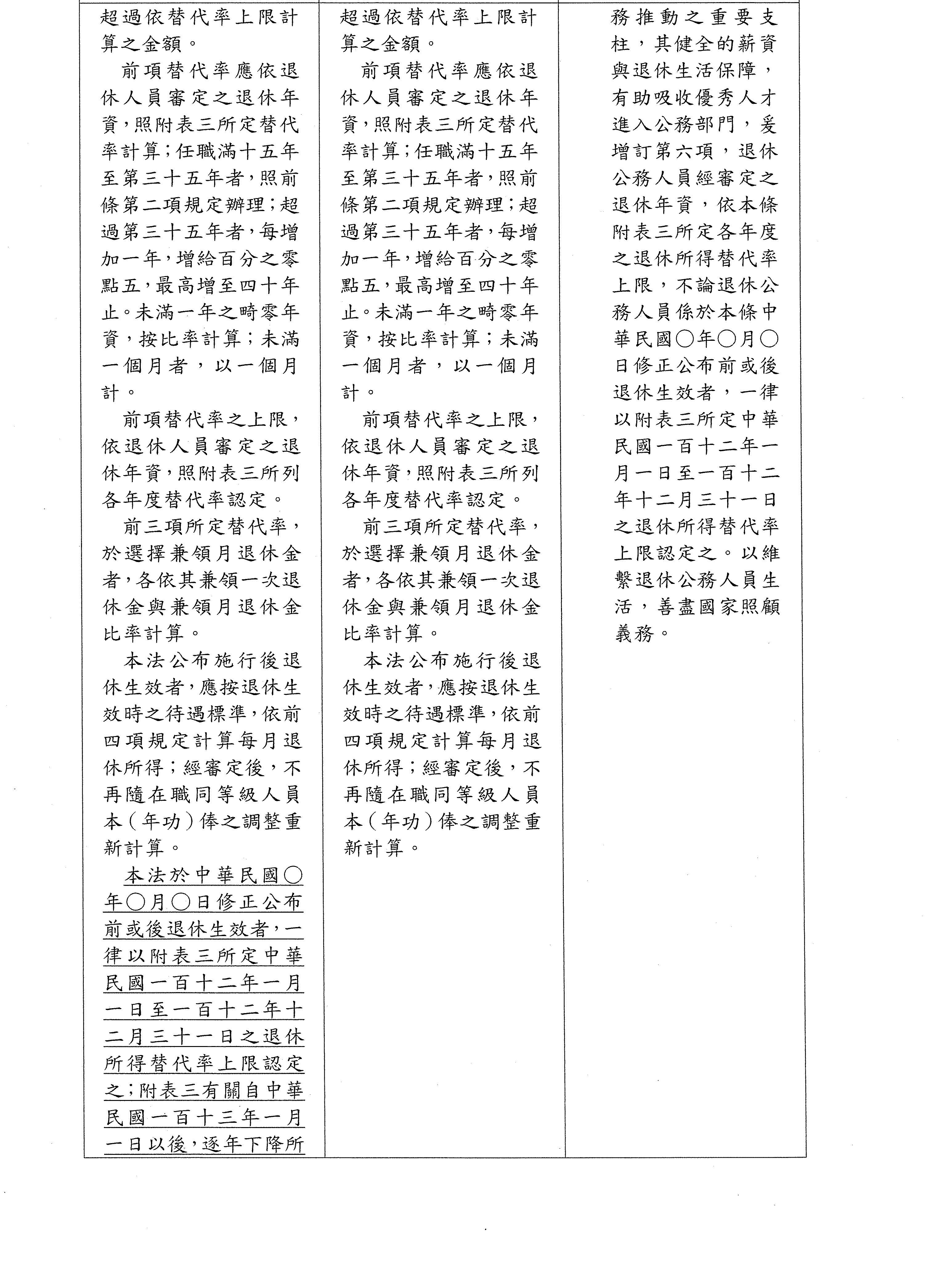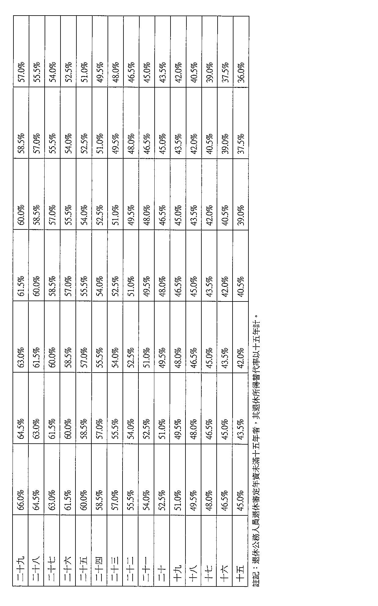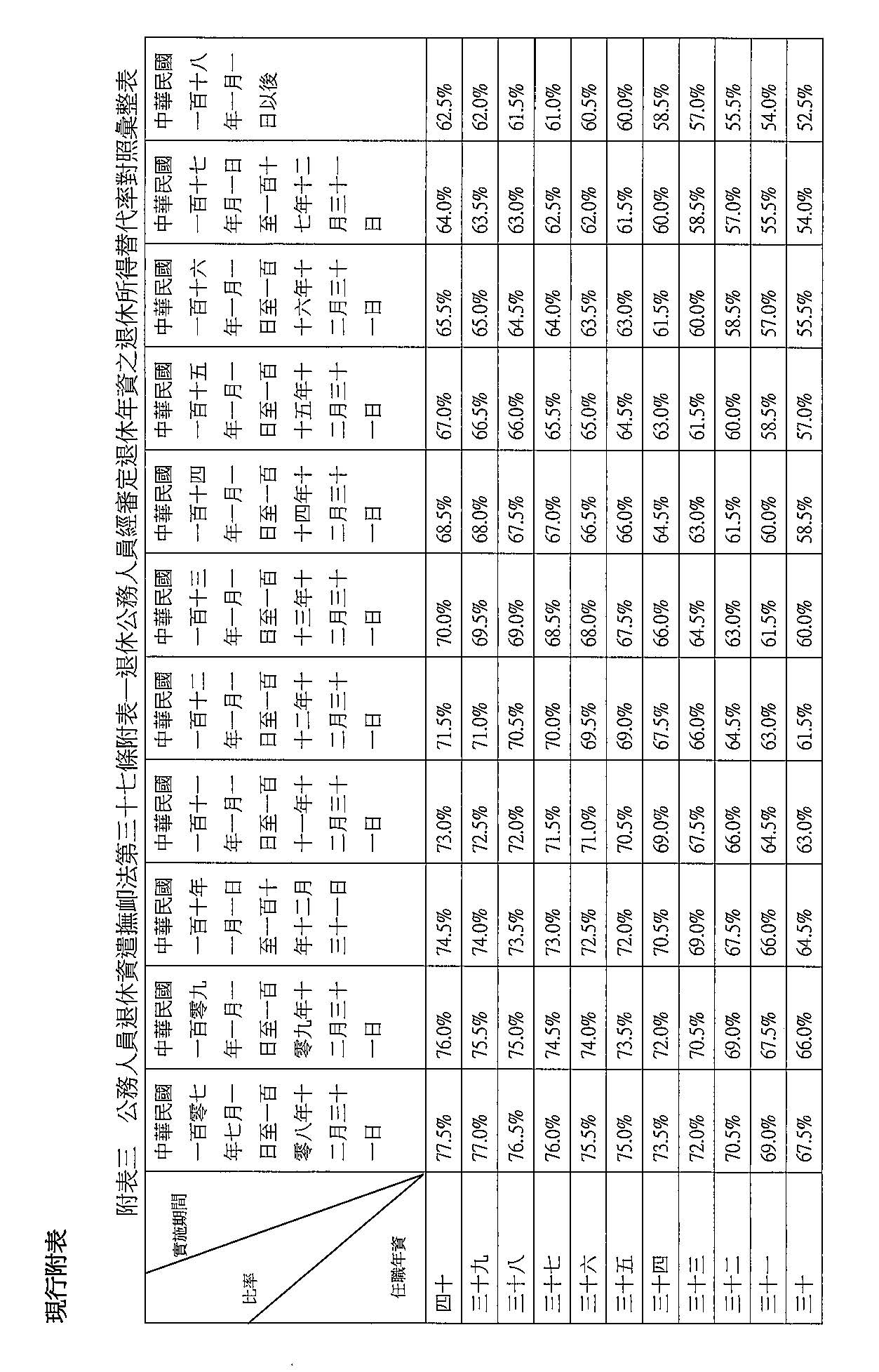 第 前項替代率應依退休人員審定之退休年資,照附表三所定替代率計算;任職滿十五年至第三十五年者,照前條第二項規定辦理;超過第三十五年者,每增加一年,增給百分之零點五,最高增至四十年止。未滿一年之畸零年資,按比率計算;未滿一個月者,以一個月計。 前項替代率之上限,依退休人員審定之退休年資,照附表三所列各年度替代率認定。 前三項所定替代率,於選擇兼領月退休金者,各依其兼領一次退休金與兼領月退休金比率計算。 本法公布施行後退休生效者,應按退休生效時之待遇標準,依前四項規定計算每月退休所得;經審定後,隨在職同等級人員本(年功)俸之調整重新計算。 |