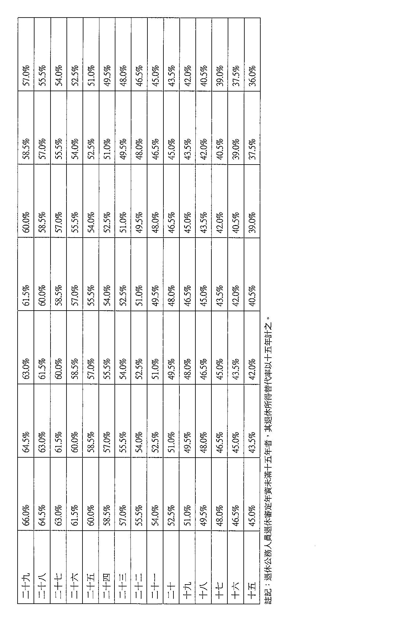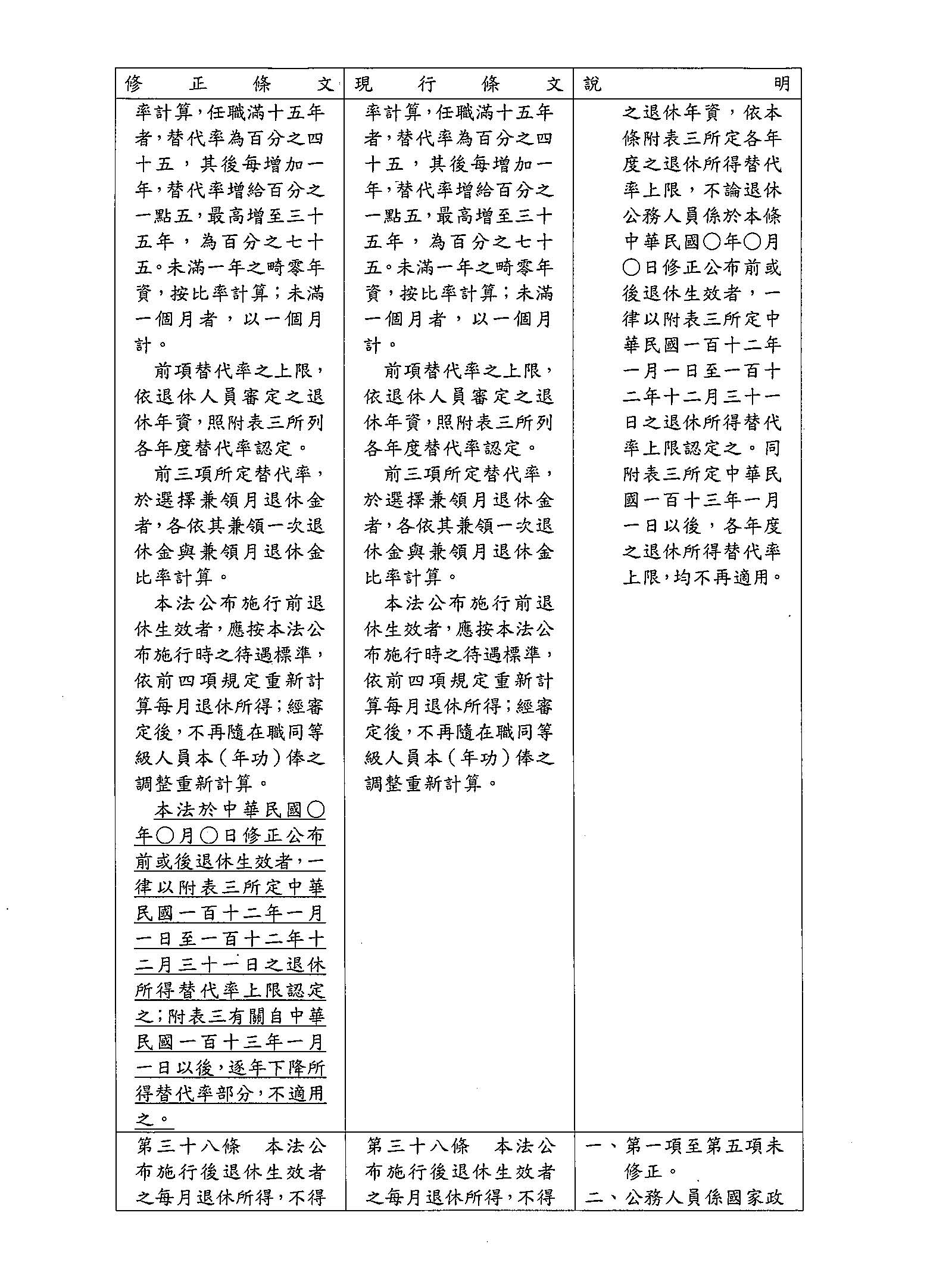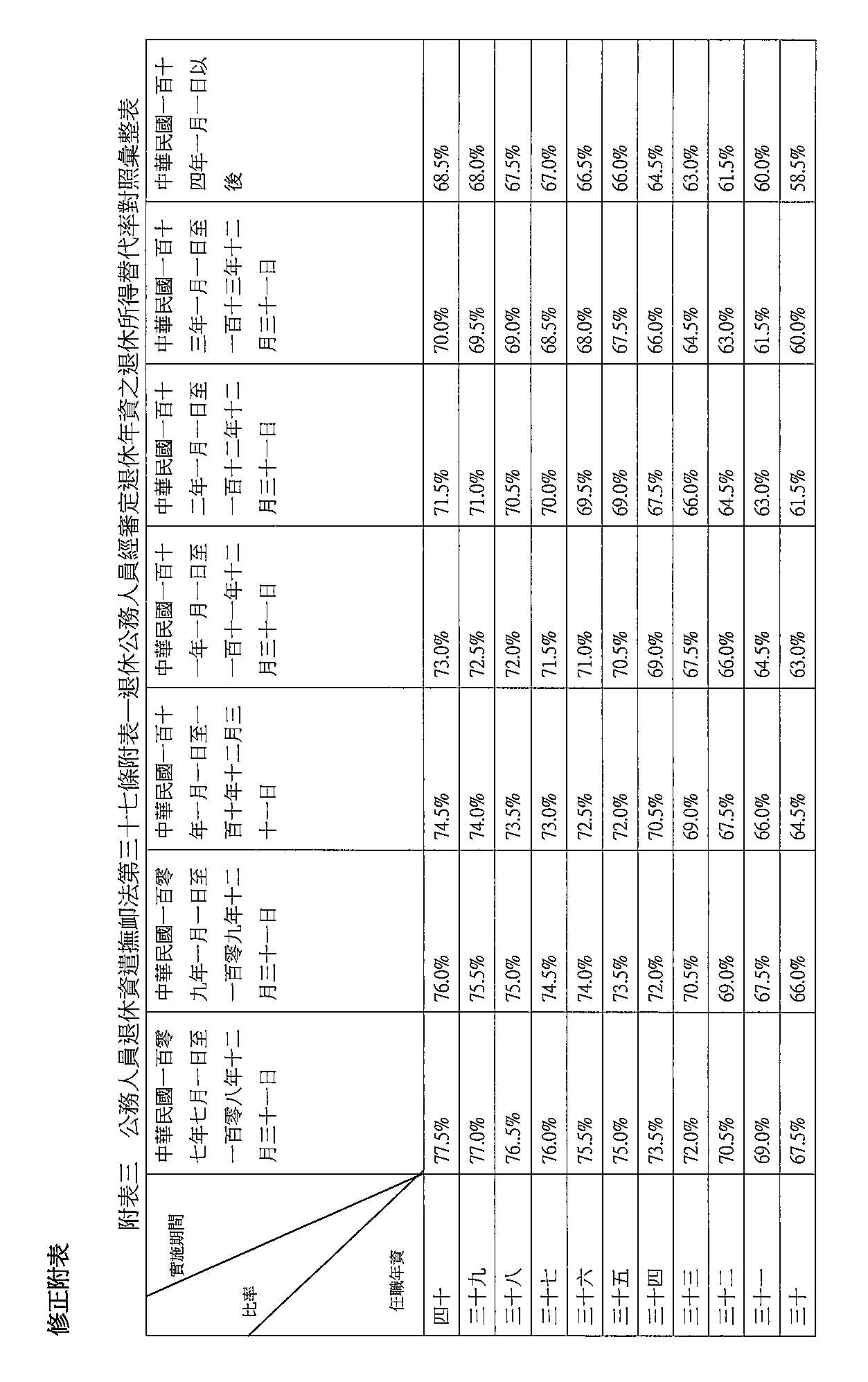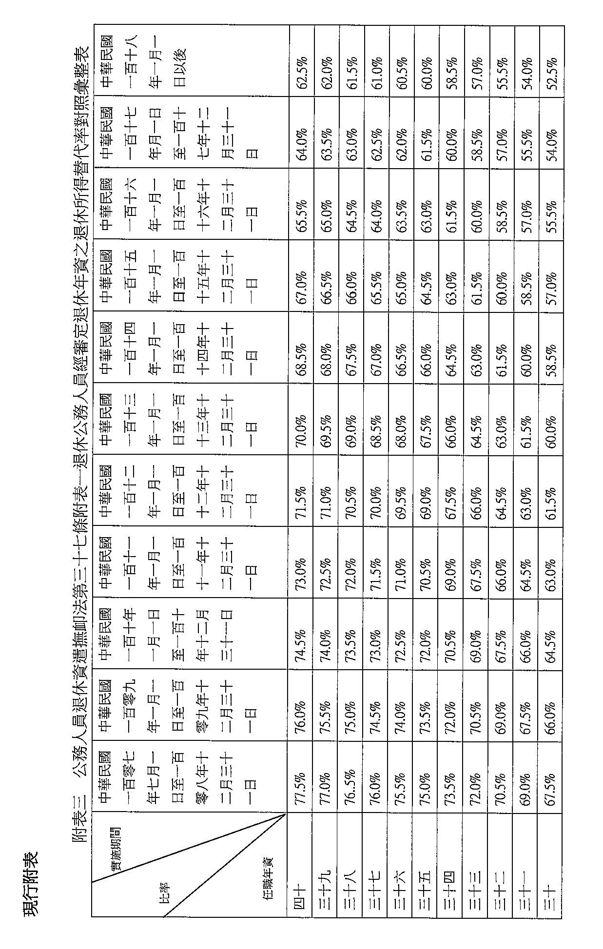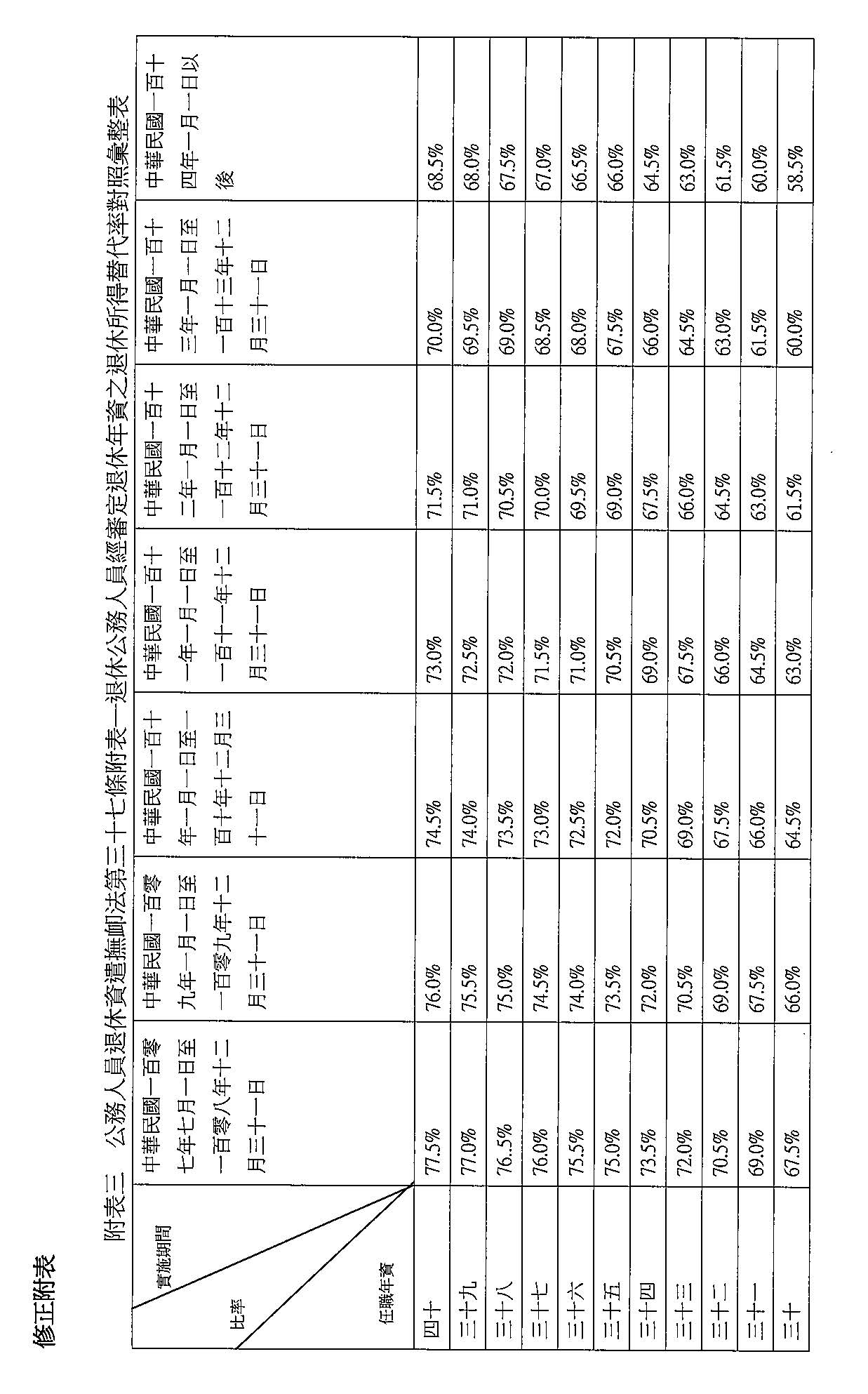 第 前項替代率應依退休人員審定之退休年資,照附表三所定替代率計算;任職滿十五年至第三十五年者,照前條第二項規定辦理;超過第三十五年者,每增加一年,增給百分之零點五,最高增至四十年止。未滿一年之畸零年資,按比率計算;未滿一個月者,以一個月計。 前項替代率之上限,依退休人員審定之退休年資,照附表三所列各年度替代率認定。 前三項所定替代率,於選擇兼領月退休金者,各依其兼領一次退休金與兼領月退休金比率計算。 本法公布施行後退休生效者,應按退休生效時之待遇標準,依前四項規定計算每月退休所得;經審定後,隨在職同等級人員本(年功)俸之調整重新計算。 |