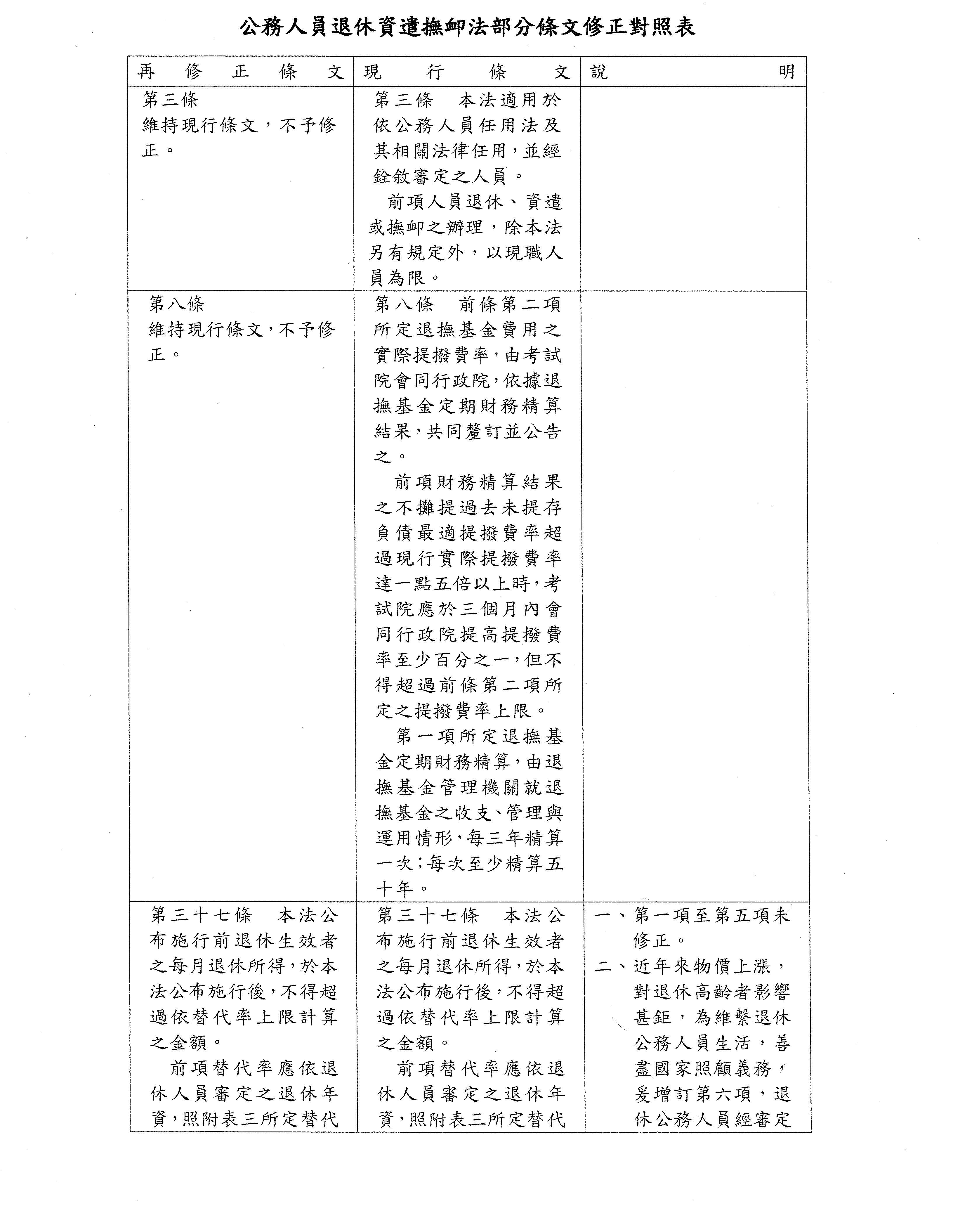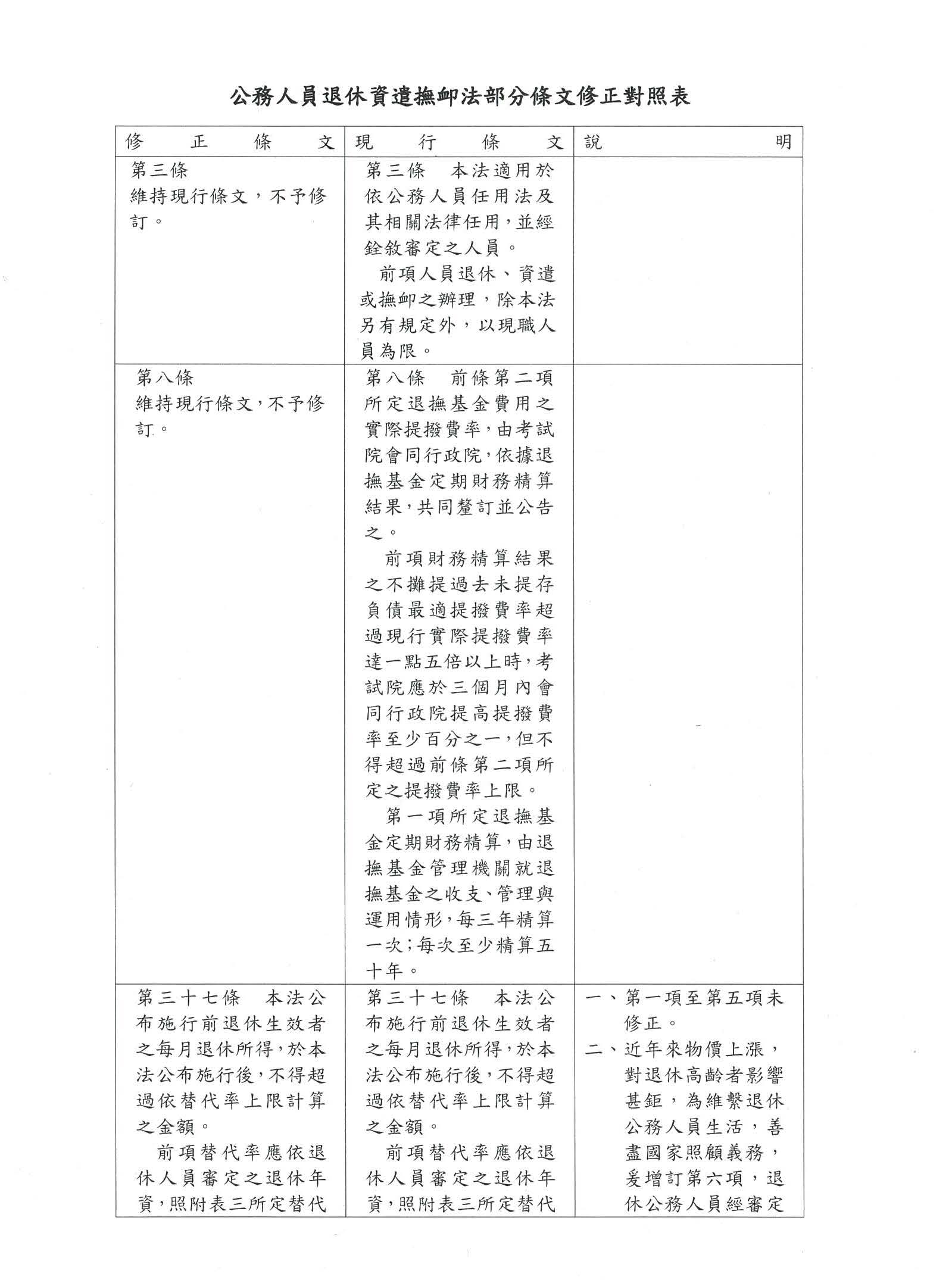 三、為強化政府對已退休公務人員之權益,爰提案修正公務人員退休資遣撫卹法第三十七條及第三十八條,保障退休人員面臨逐年攀升之物價仍得維持基本生存權益。