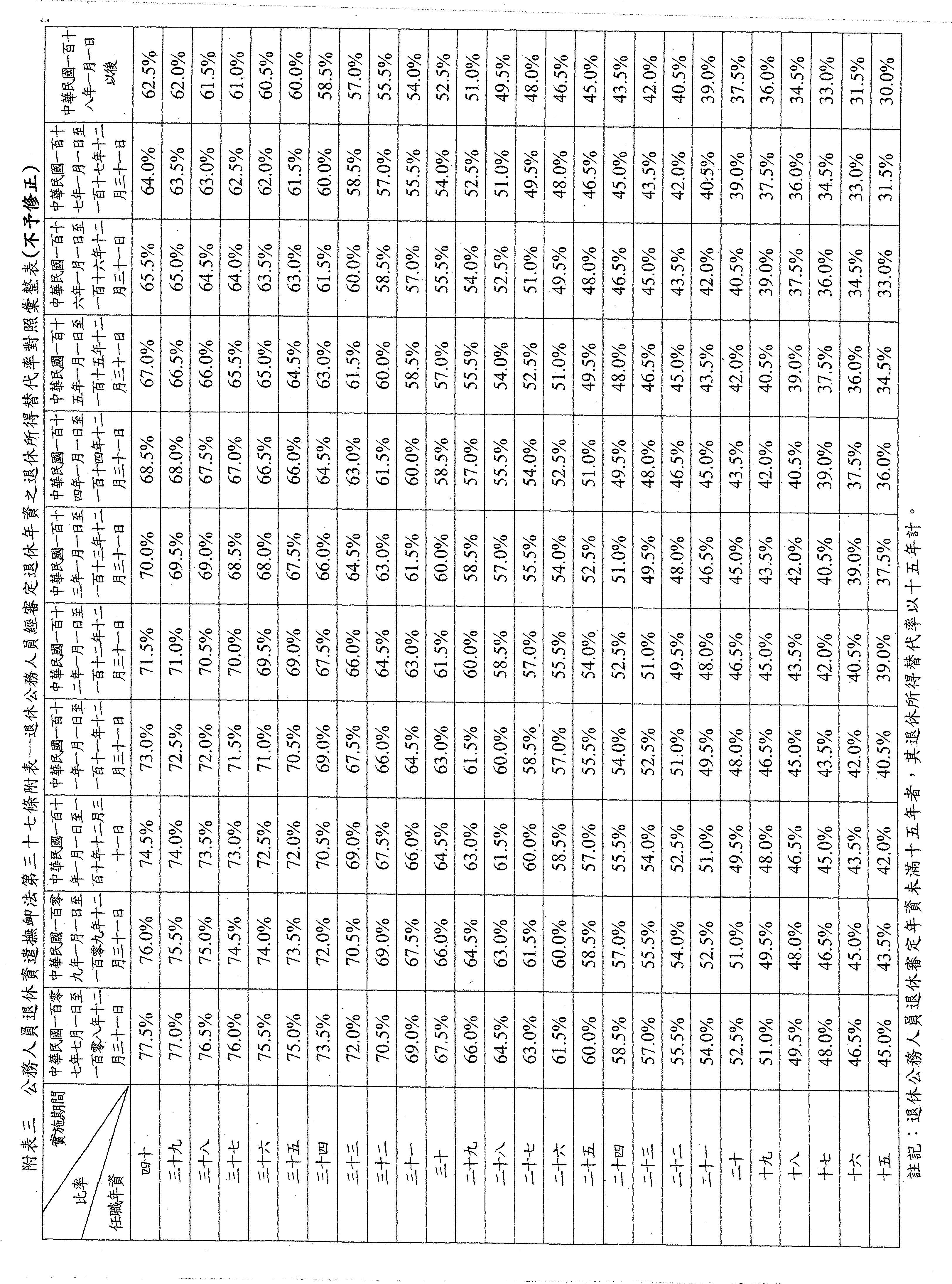 第 前項替代率應依退休人員審定之退休年資,照附表三所定替代率計算,任職滿十五年者,替代率為百分之四十五,其後每增加一年,替代率增給百分之一點五,最高增至三十五年,為百分之七十五。未滿一年之畸零年資,按比率計算;未滿一個月者,以一個月計。 前項替代率之上限,依退休人員審定之退休年資,照附表三所列各年度替代率認定。 前三項所定替代率,於選擇兼領月退休金者,各依其兼領一次退休金與兼領月退休金比率計算。 本法公布施行前退休生效者,應按本法公布施行時之待遇標準,依前四項規定重新計算每月退休所得;經審定後,隨在職同等級人員本(年功)俸之調整重新計算。 本條附表三有關自中華民國一百十四年一月一日起,逐年下降所得替代率之部分,不適用之。