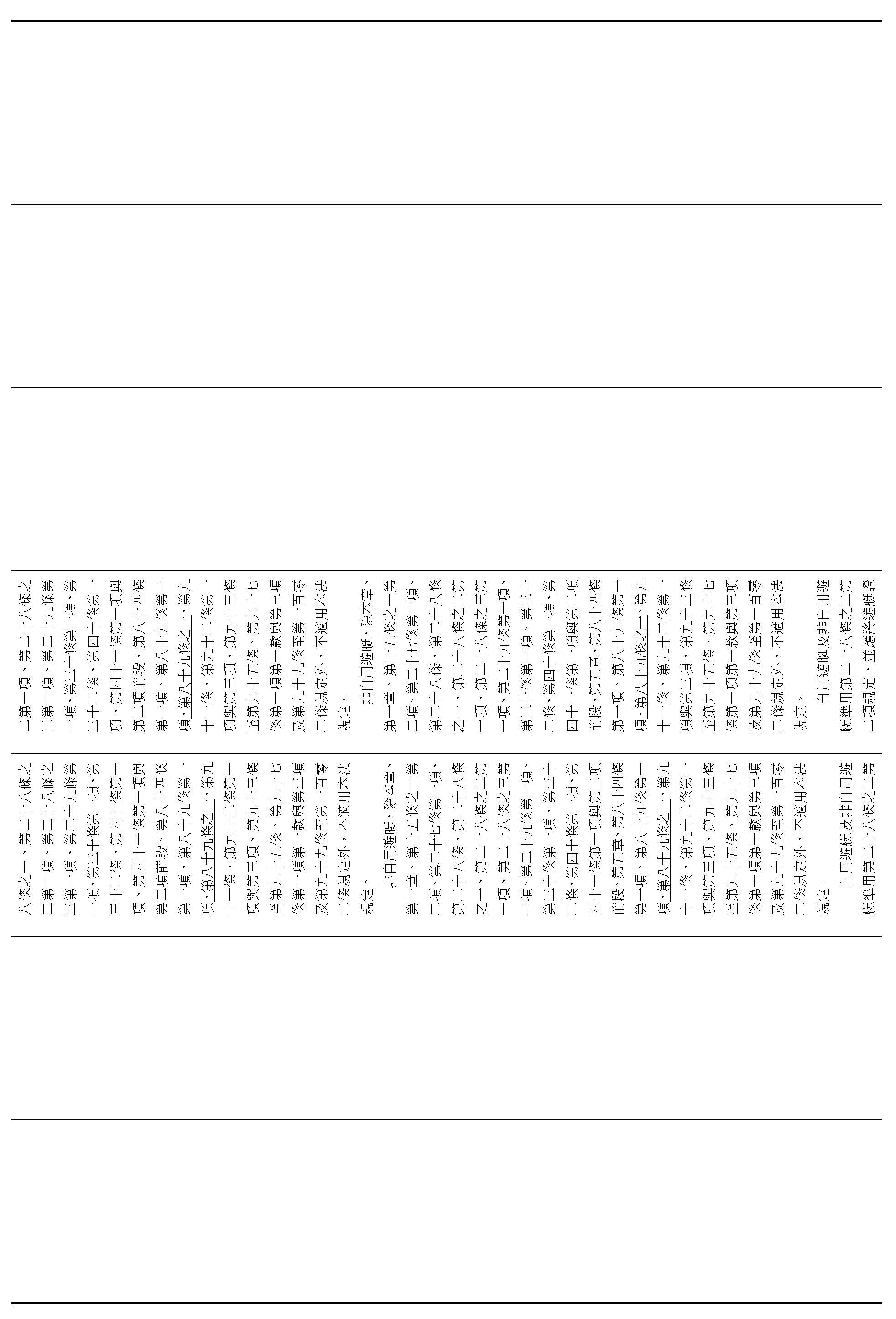 非自用遊艇,除本章、第一章、第十五條之一第二項、第二十七條第一項、第二十八條、第二十八條之一、第二十八條之二第一項、第二十八條之三第一項、第二十九條第一項、第三十條第一項、第三十二條、第四十條第一項、第四十一條第一項與第二項前段、第五章、第八十四條第一項、第八十九條第一項、第八十九條之一、第九十一條、第九十二條第一項與第三項、第九十三條至第九十五條、第九十七條第一項第一款與第三項及第九十九條至第一百零二條規定外,不適用本法規定。
