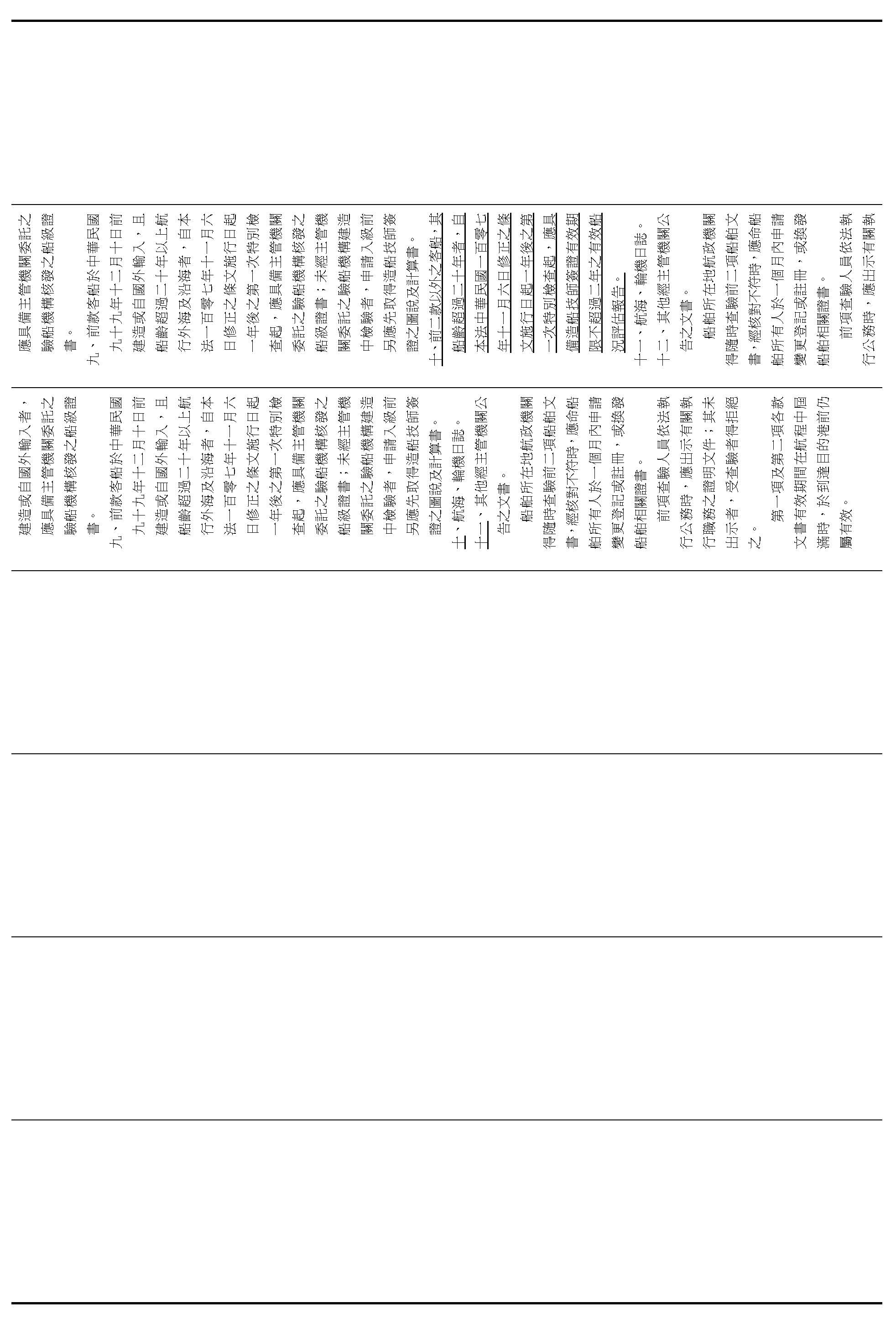 第十一條之一 總噸位一百五十以上之非中華民國船舶於中華民國領海外界線以內水域或臺灣地區禁止水域航行或錨泊時,應具備航海日誌,詳實記載航行活動;遇有事故者,並應一併載明。