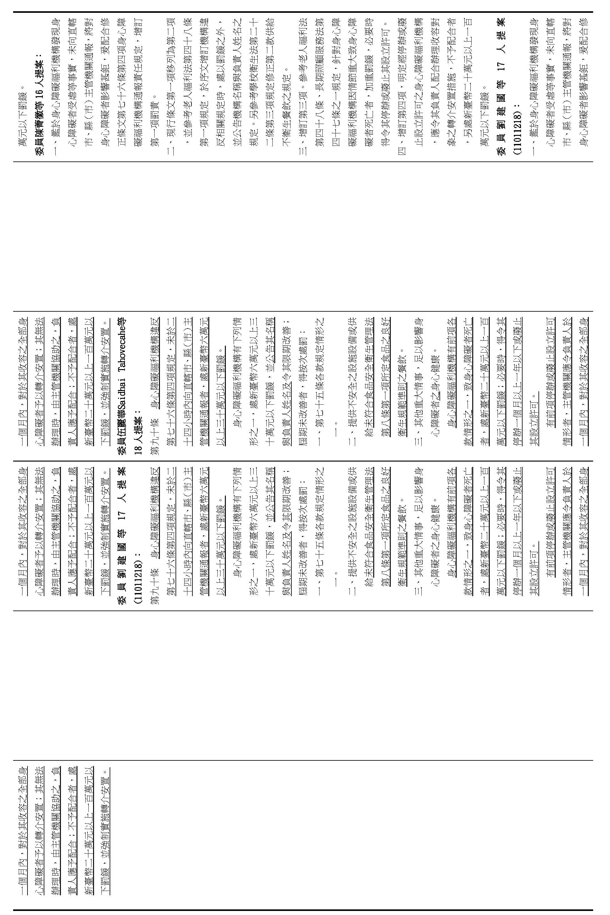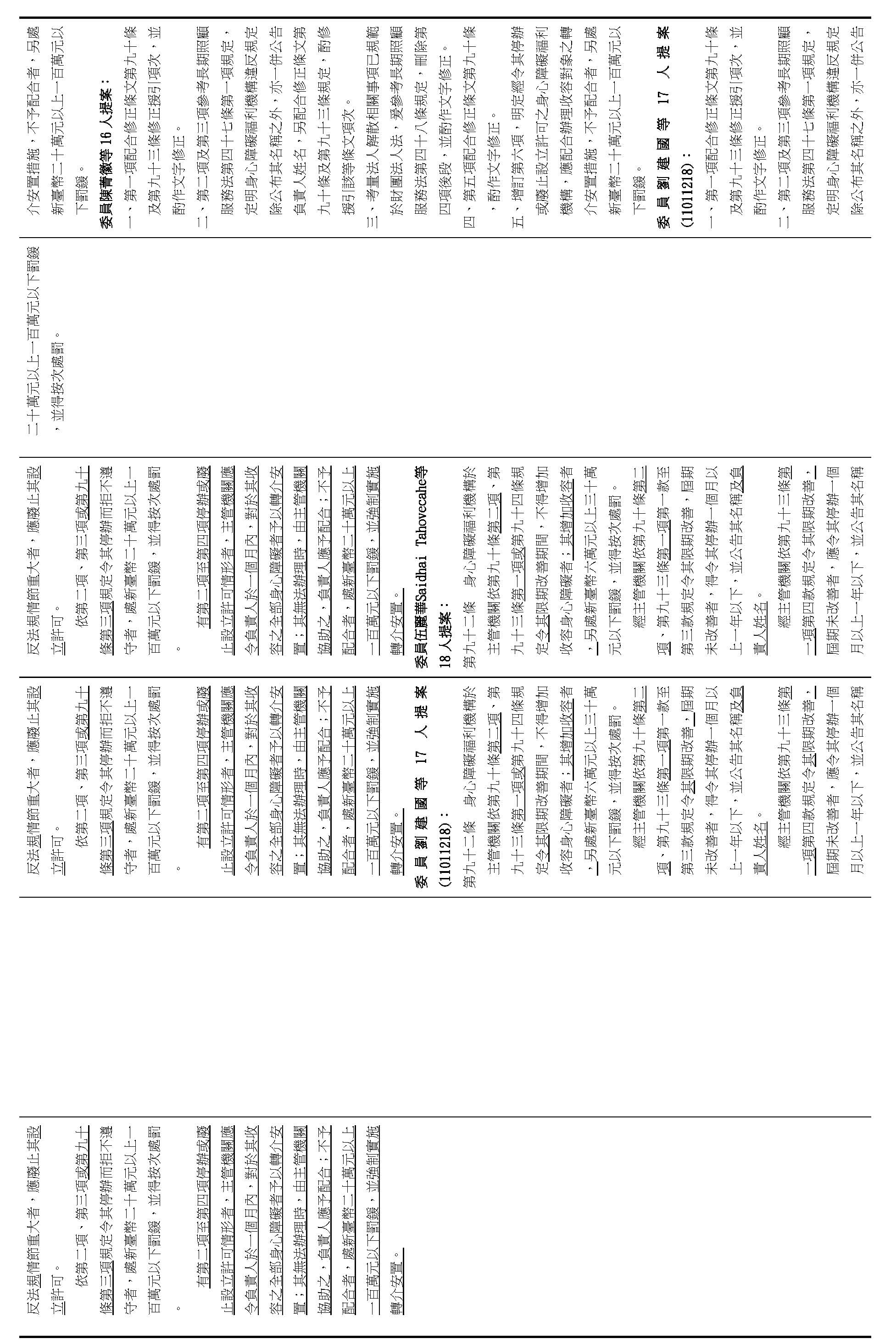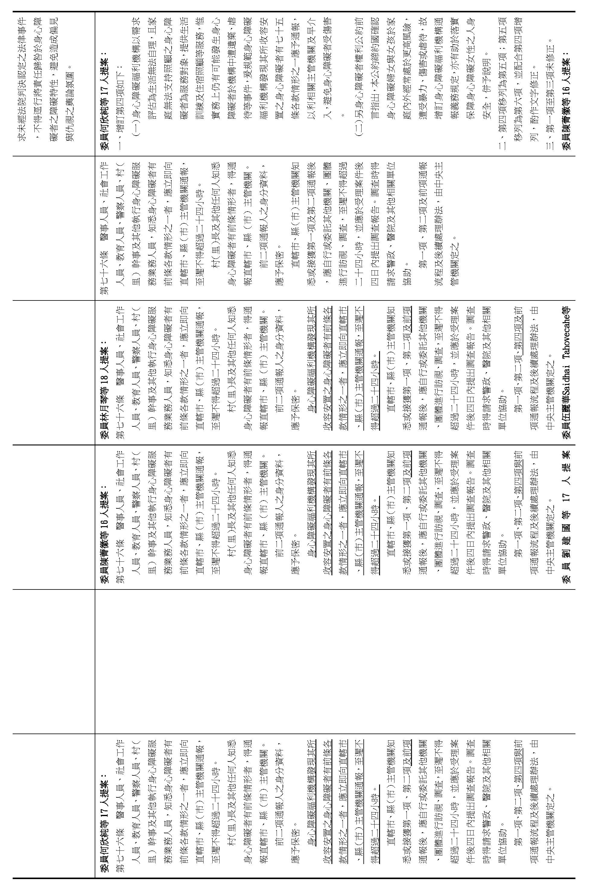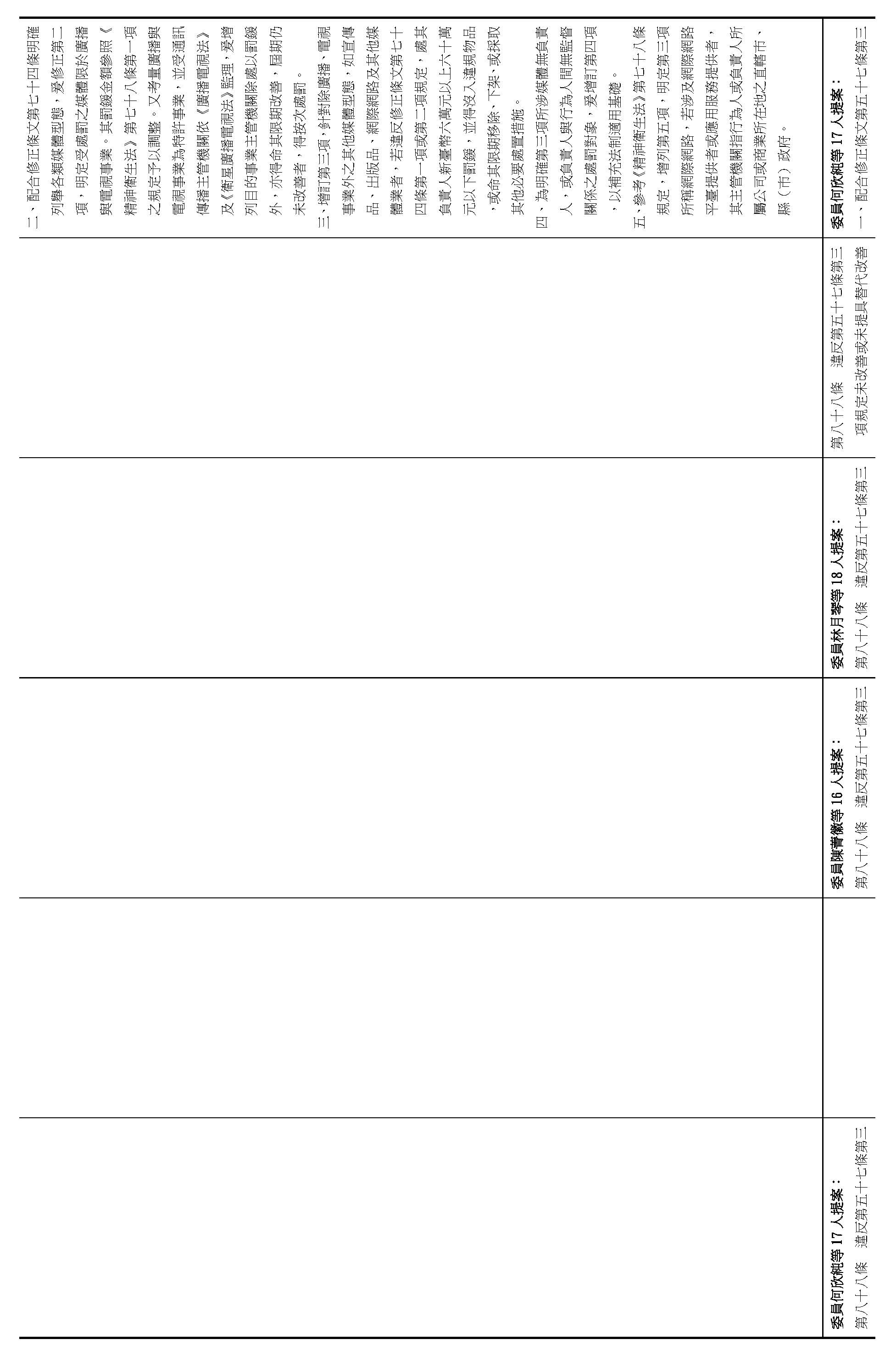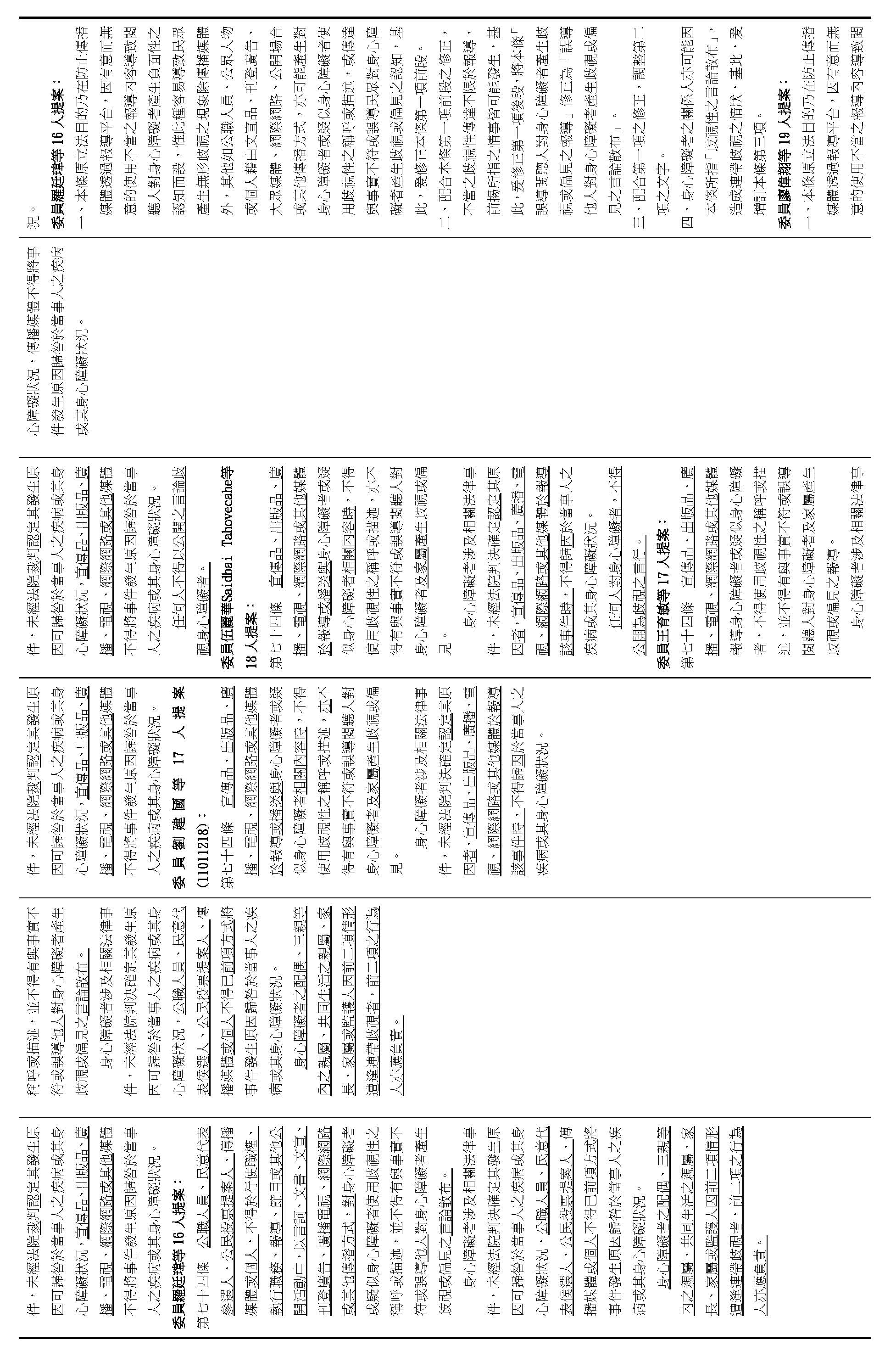 最後,有關林月琴委員等18人、伍麗華Saidhai Tahovecahe委員等18人、王育敏委員等17人以及台灣民眾黨黨團提案,明定各類傳播媒體之報導不得使用歧視性稱呼或描述,並配合修正罰則。對於各類媒體都不應有歧視性的報導,來落實平等及不歧視精神,本部敬表支持。至於增訂罰則的部分,考慮到型態的多元化,建議如果要訂定罰則的話,要審慎的研議。