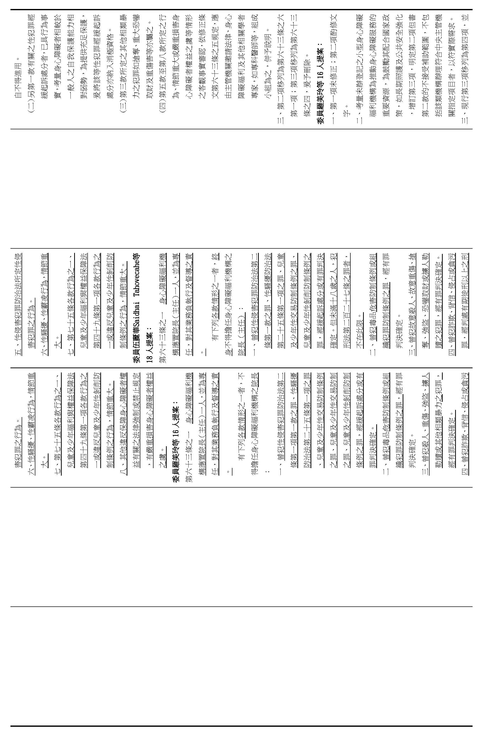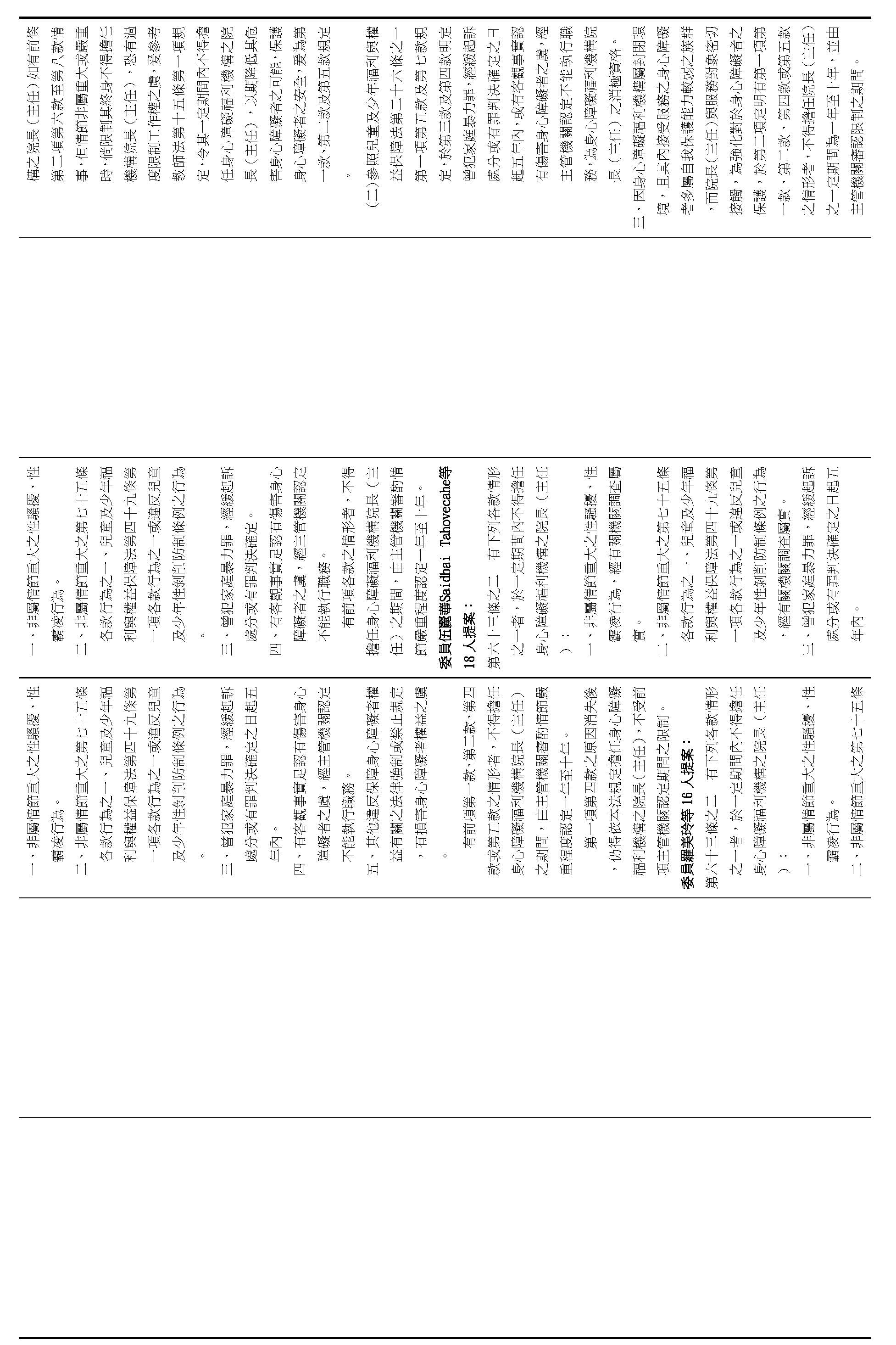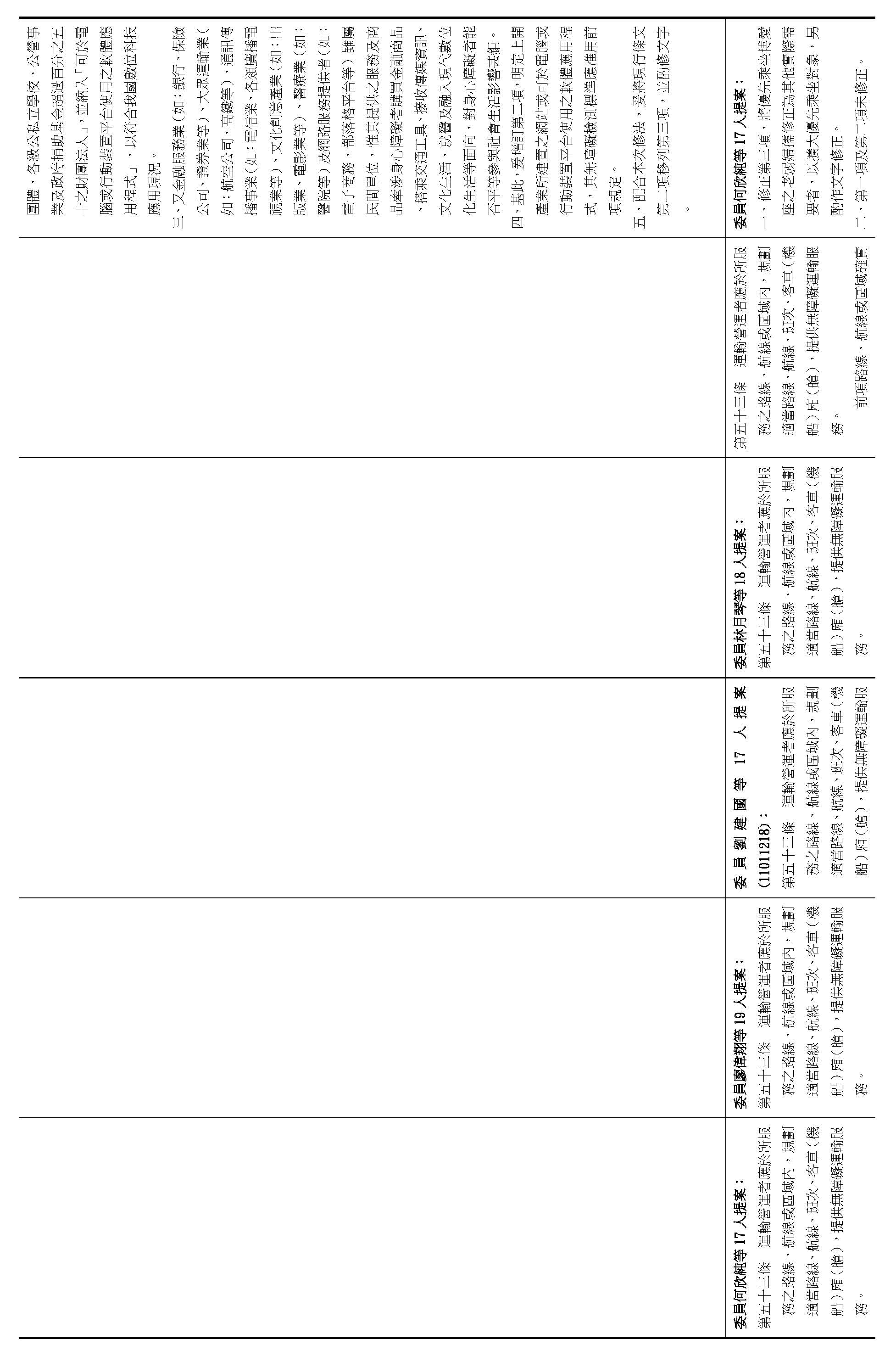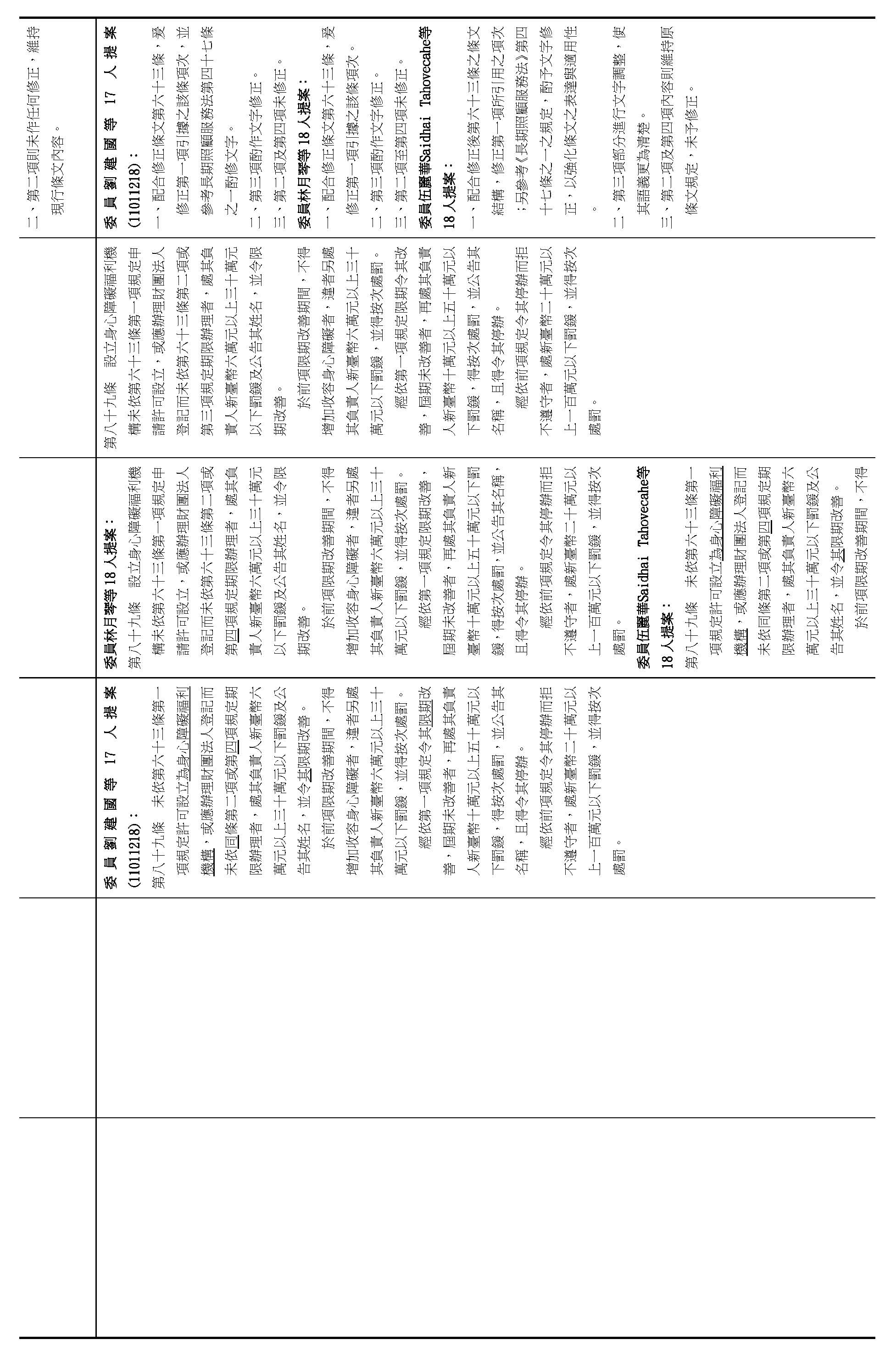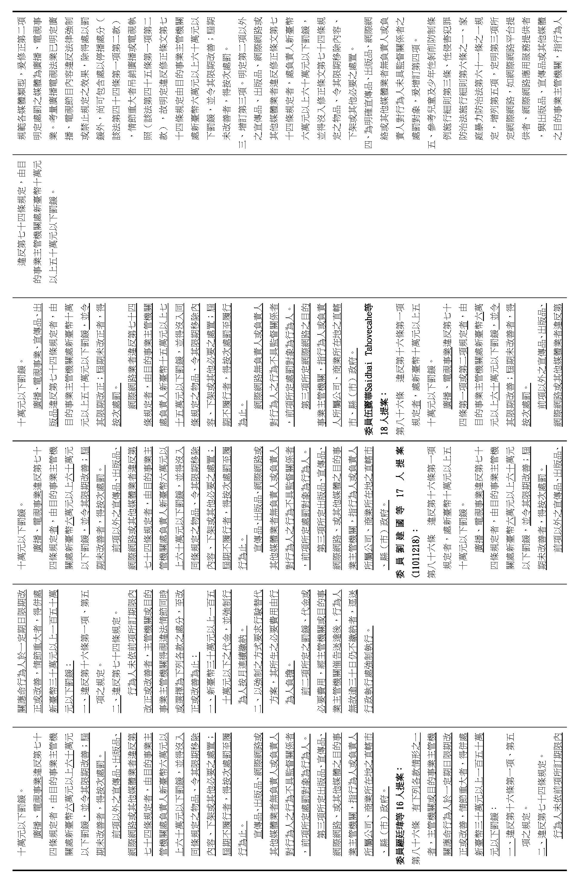 最後,有關林月琴委員等18人、伍麗華Saidhai Tahovecahe委員等18人、王育敏委員等17人以及台灣民眾黨黨團提案,明定各類傳播媒體之報導不得使用歧視性稱呼或描述,並配合修正罰則。對於各類媒體都不應有歧視性的報導,來落實平等及不歧視精神,本部敬表支持。至於增訂罰則的部分,考慮到型態的多元化,建議如果要訂定罰則的話,要審慎的研議。