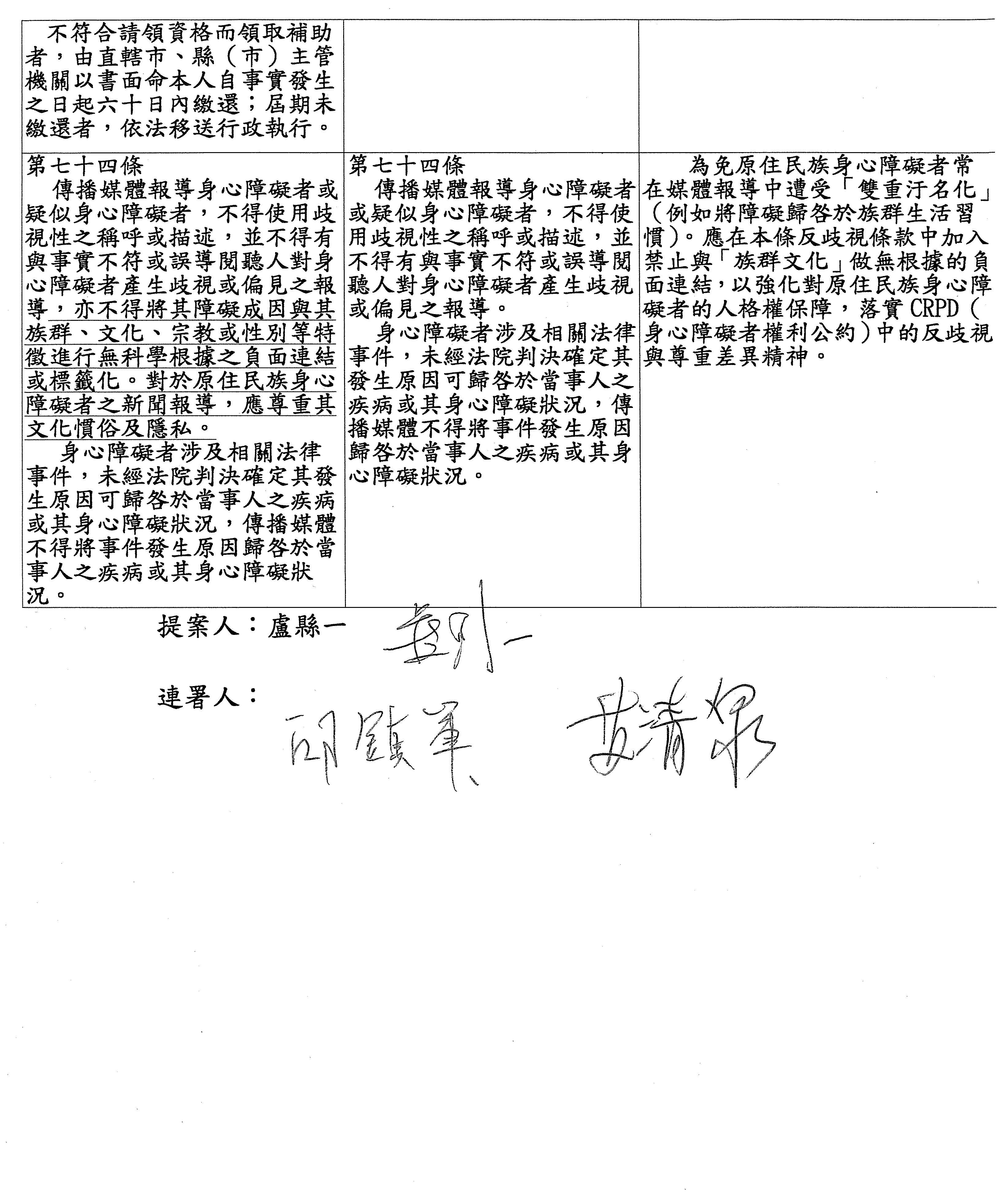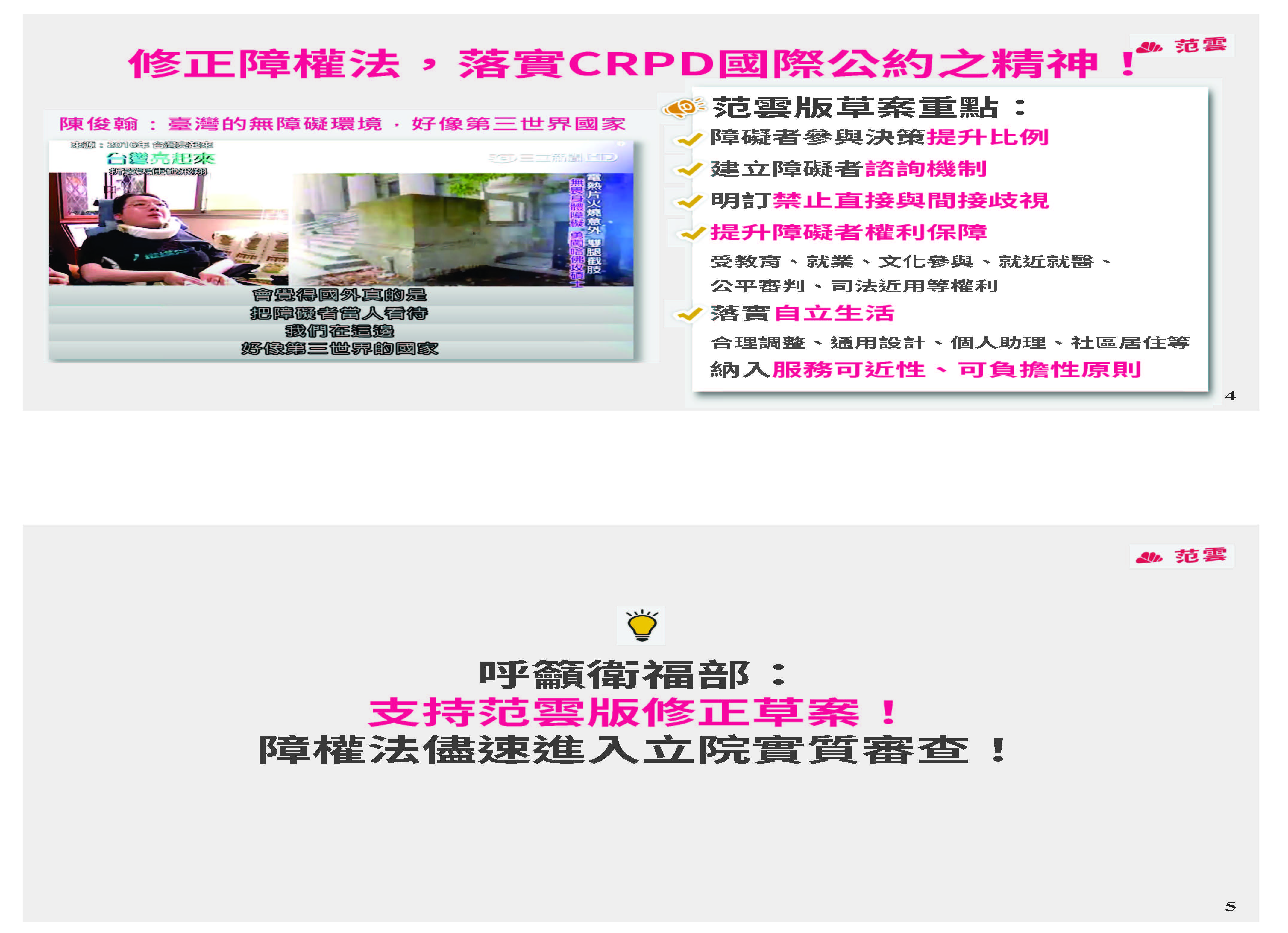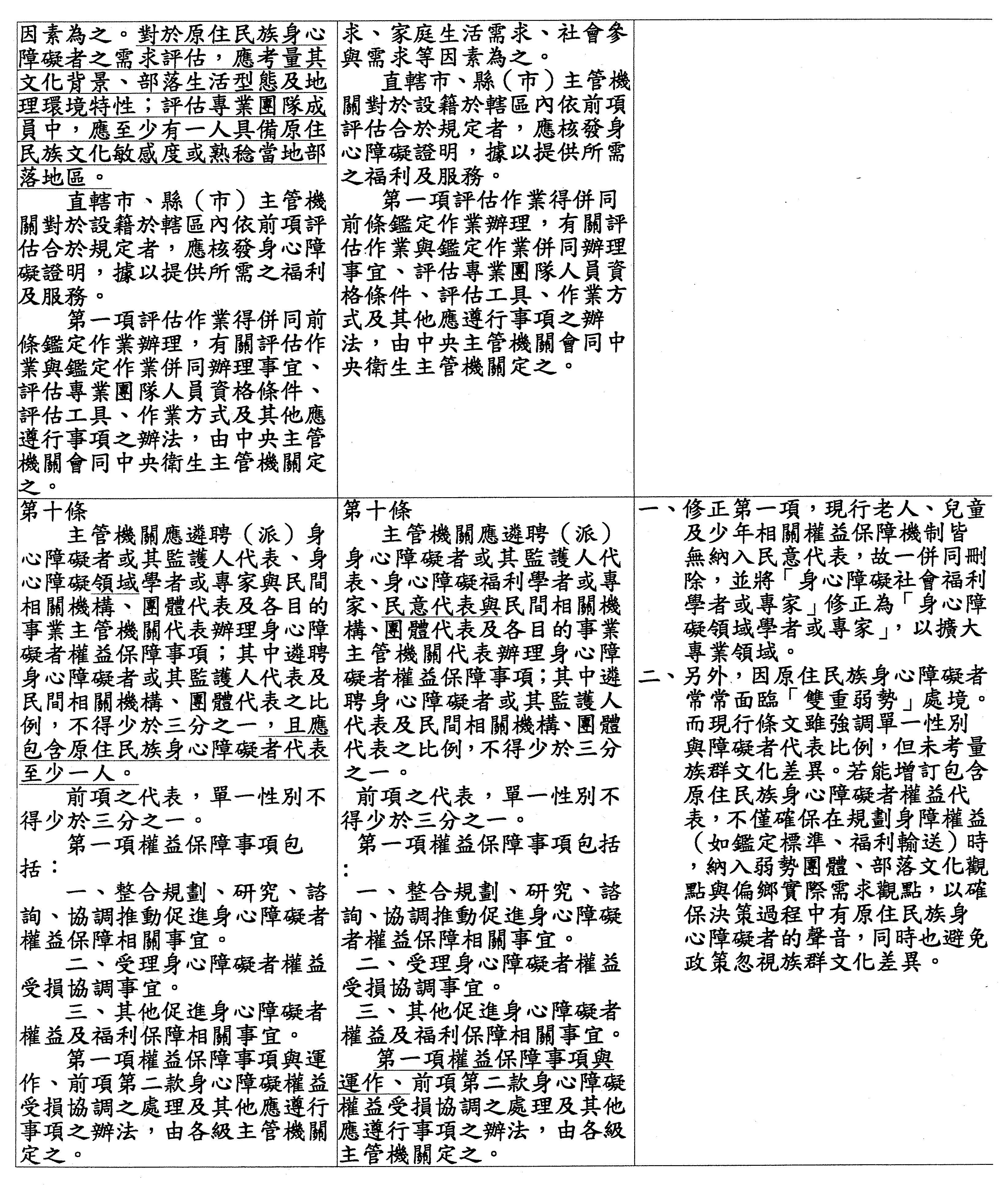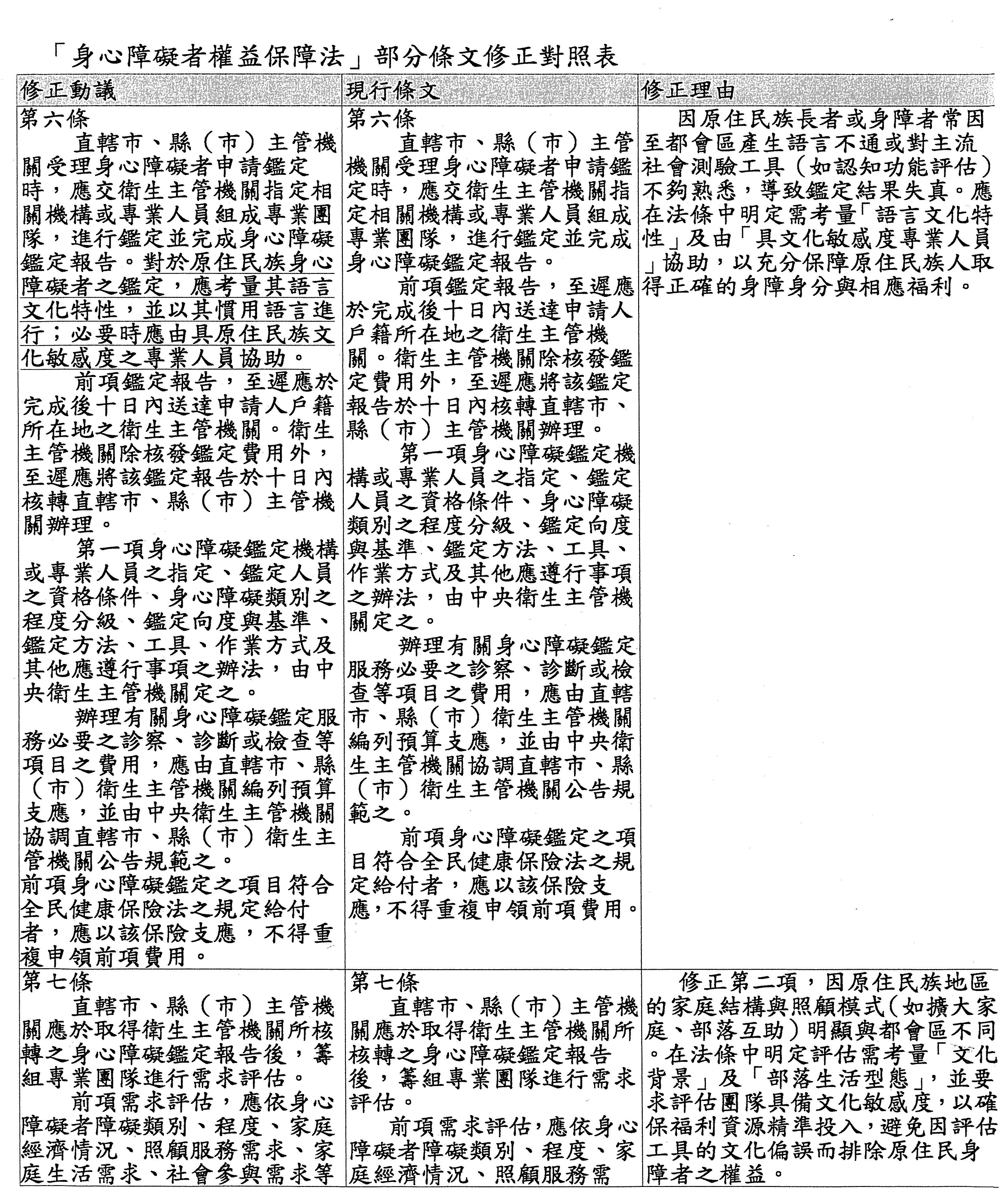 以上是本部對於委員修訂版本的初步意見,至於行政院的版本,目前也在積極的研修中,希望能夠很快地送到大院來併同審查。此外,本部也會持續與障礙團體溝通,提供更友善的服務。以上報告,再請大院各位委員指教,謝謝!