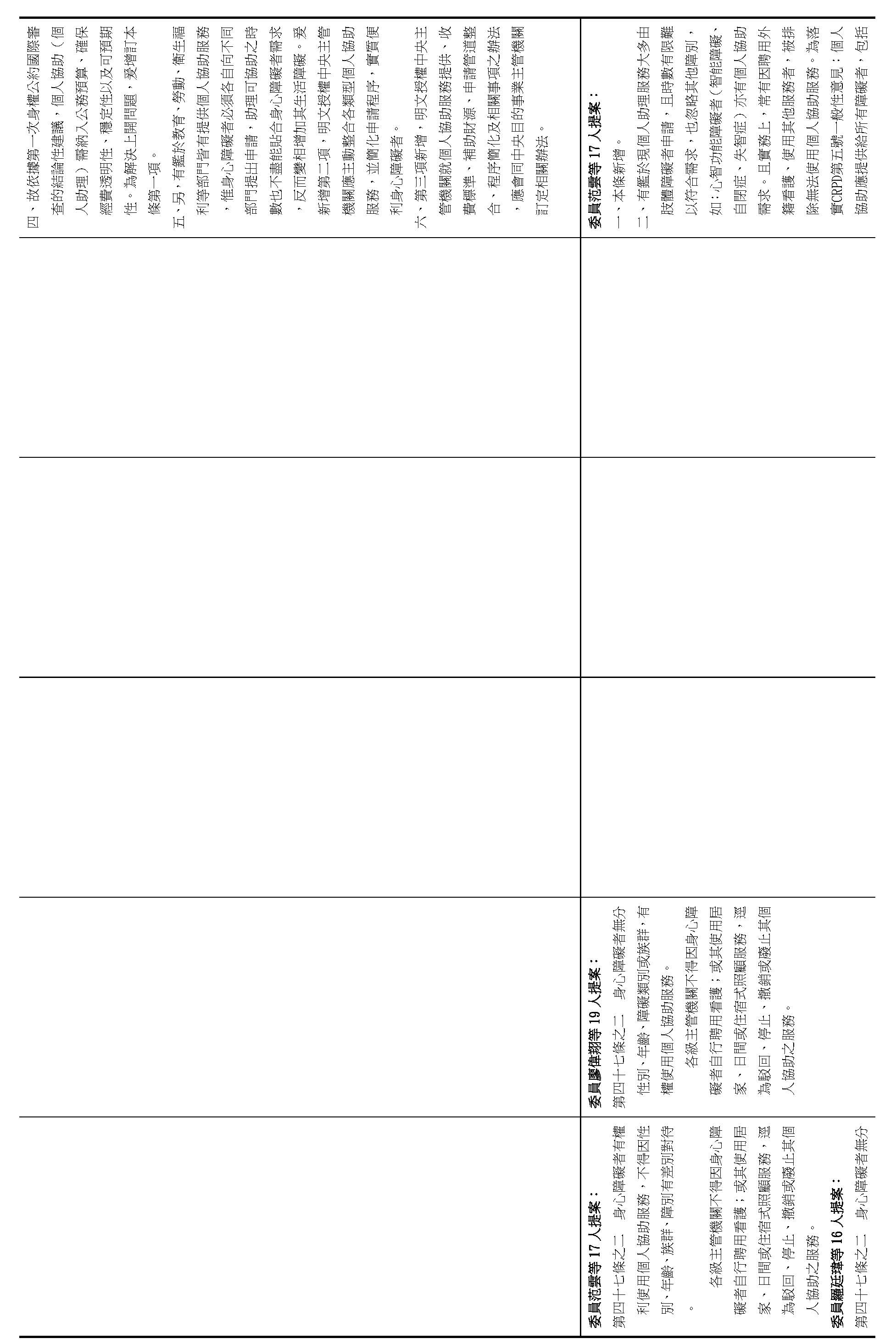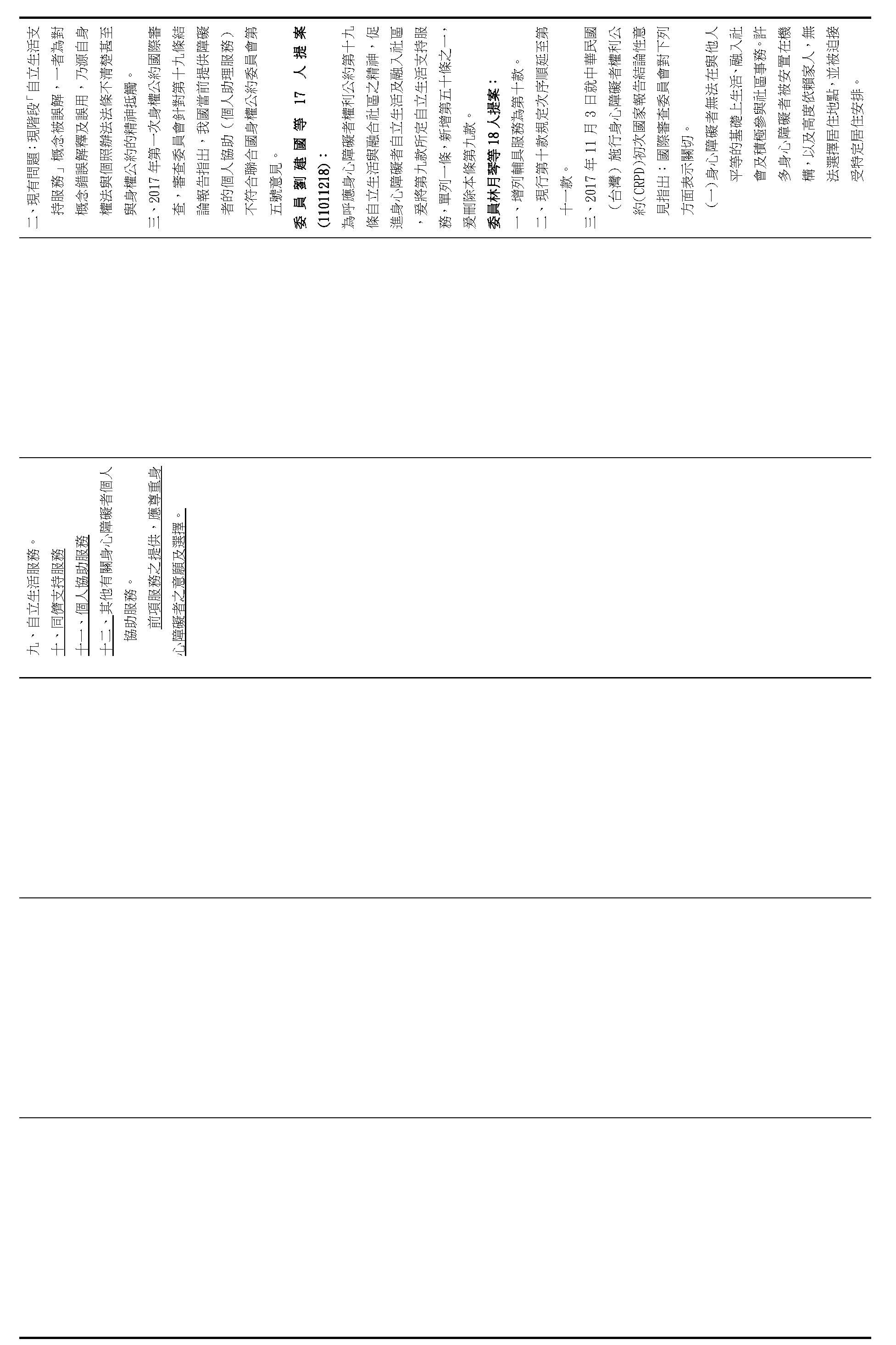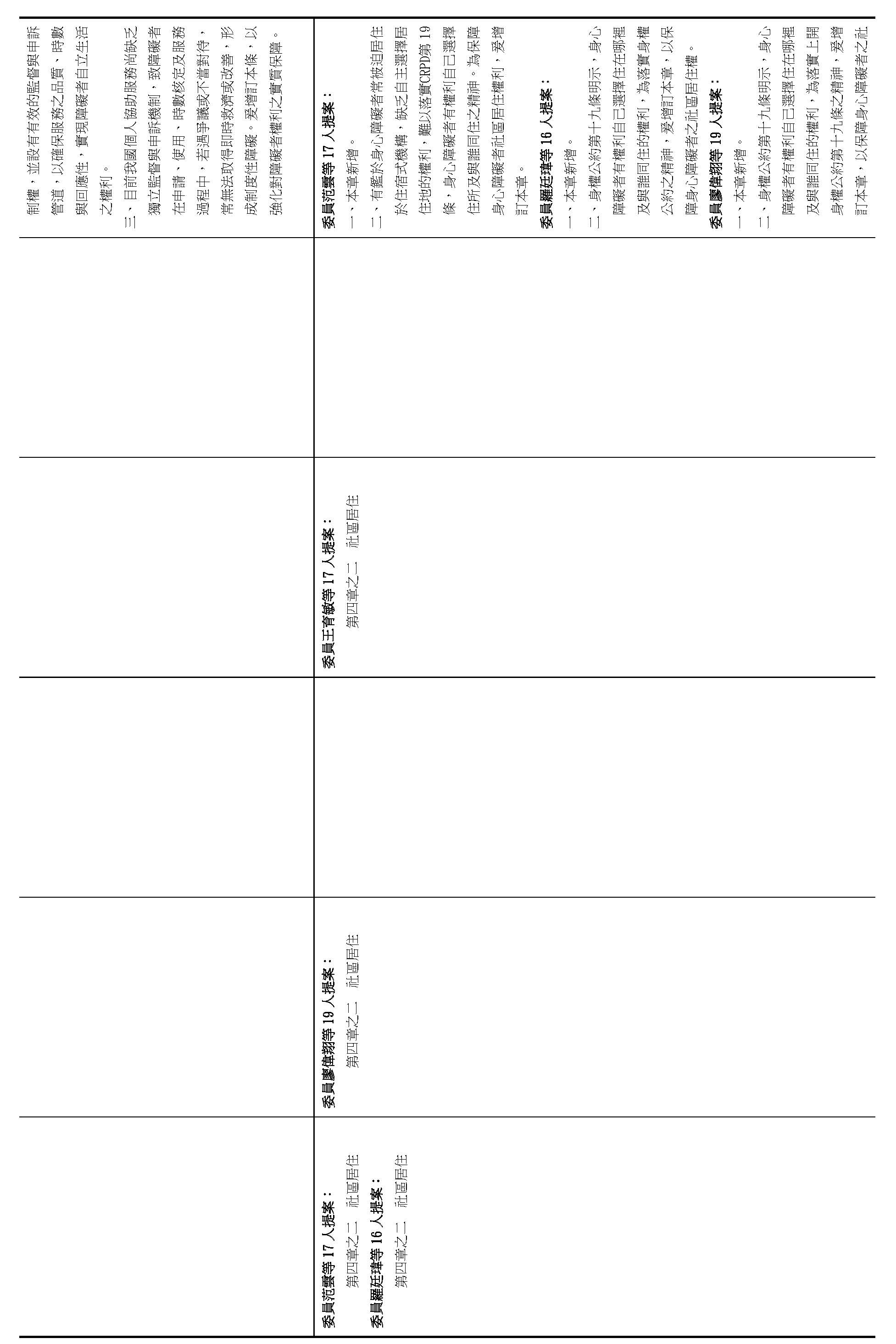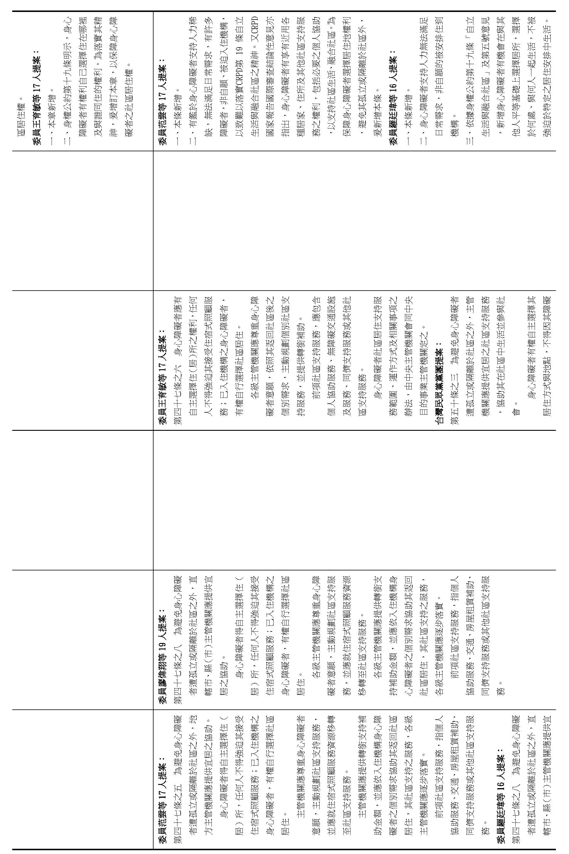 第三,有關伍麗華Saidhai Tahovecahe委員等18人、王育敏委員等17人、台灣民眾黨黨團所提,增訂同儕支持、個人助理與社區居住專章及專條,如同前面所述,在本法第五十條已經訂定相關的,包含社區居住服務還有支持自立生活的服務項目,並且由第五十一條第二項的授權法規訂定相關的執行細節了,所以我們認為為了保持法規的彈性跟能夠及時調整,應以授權法規──身心障礙者個人照顧服務辦法來研修就可以,無須在本法上明定。