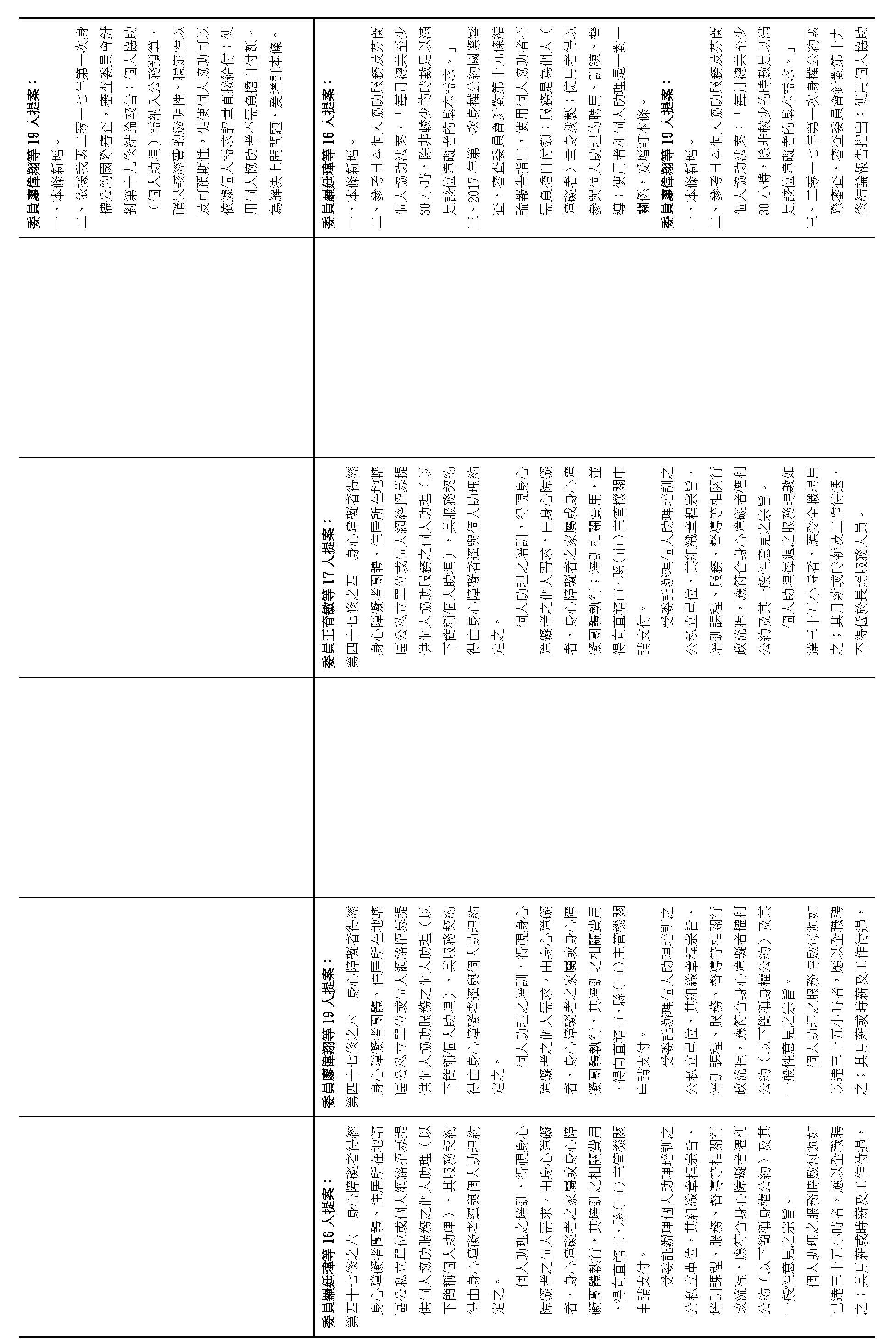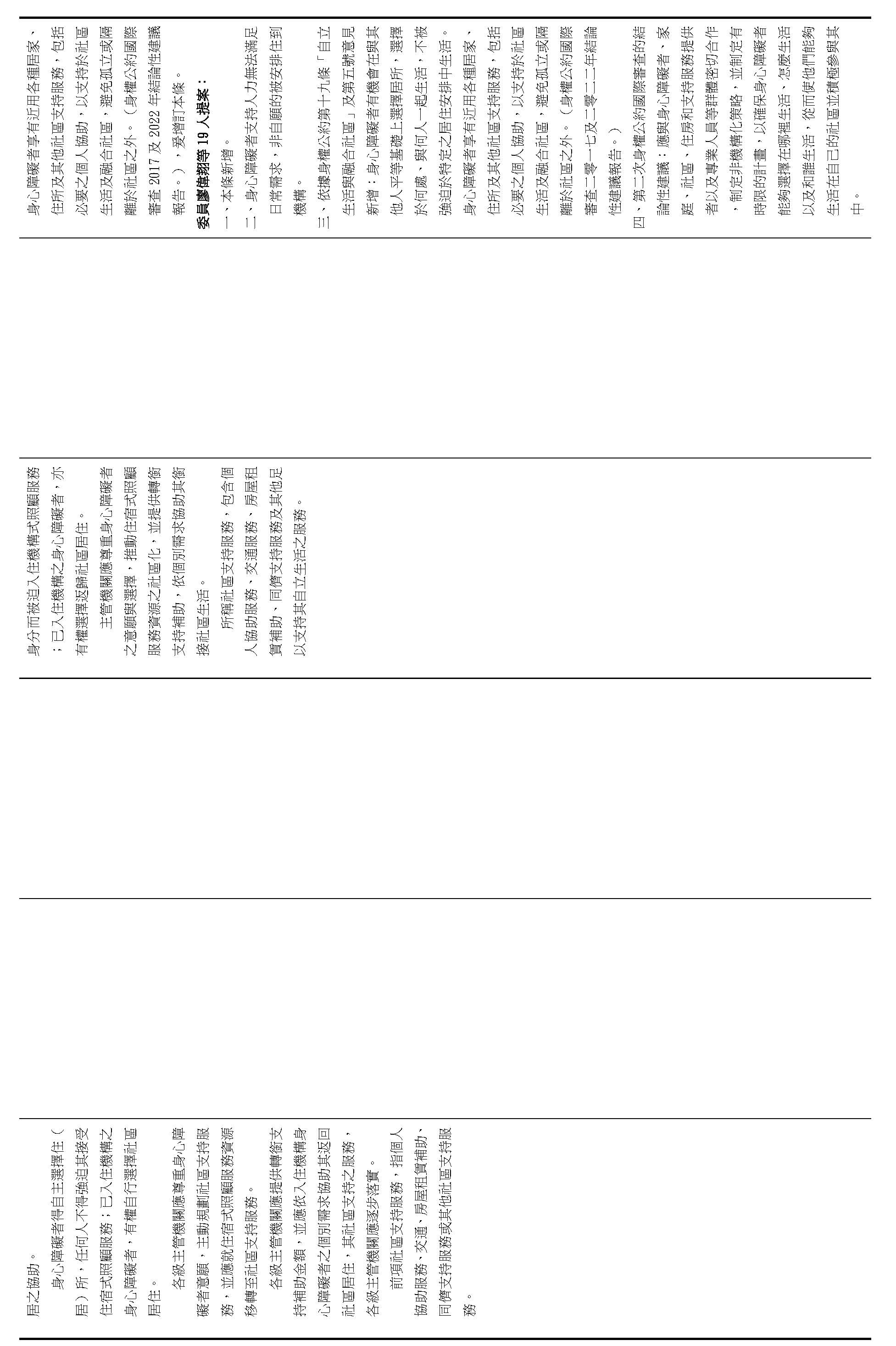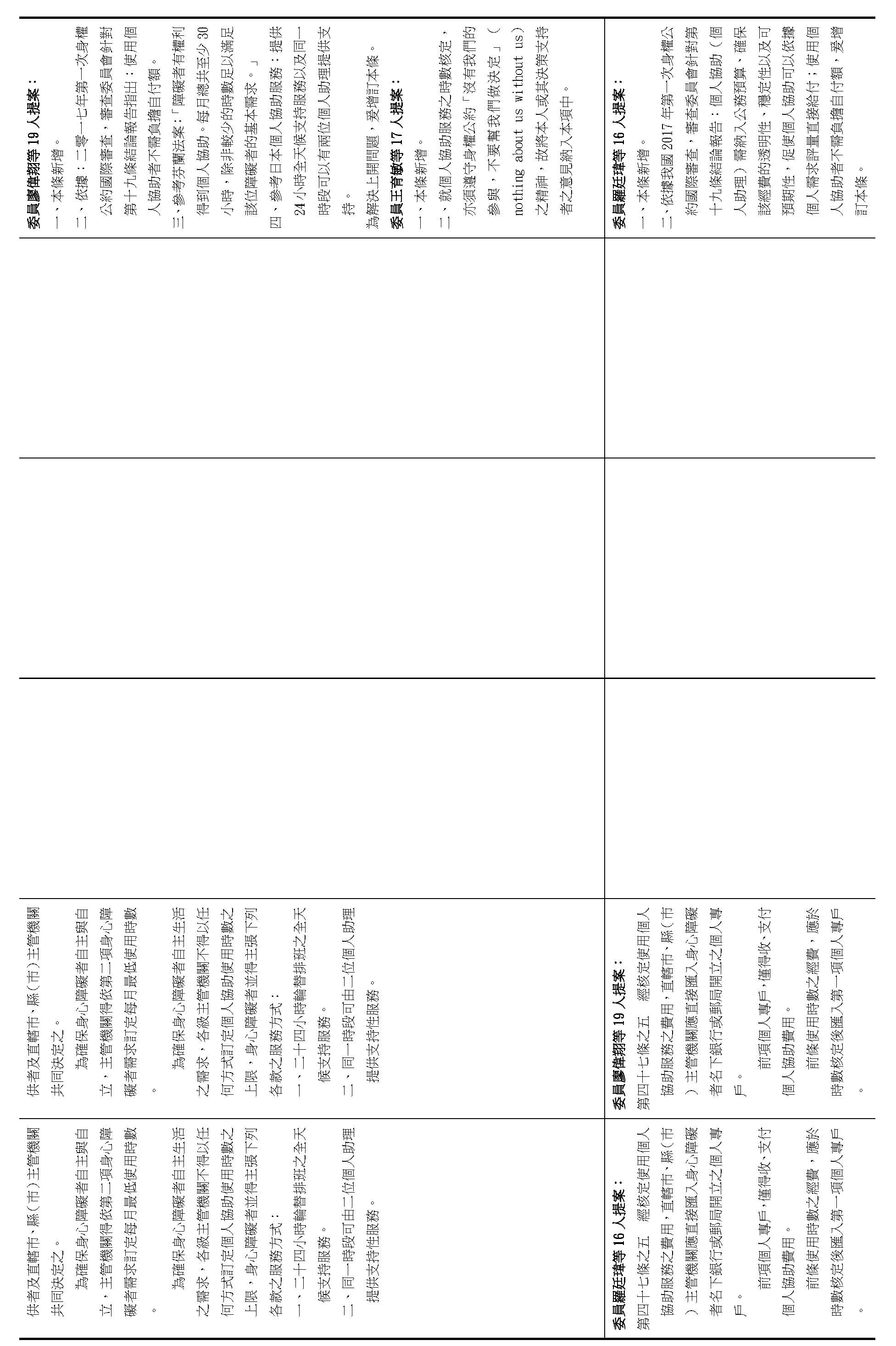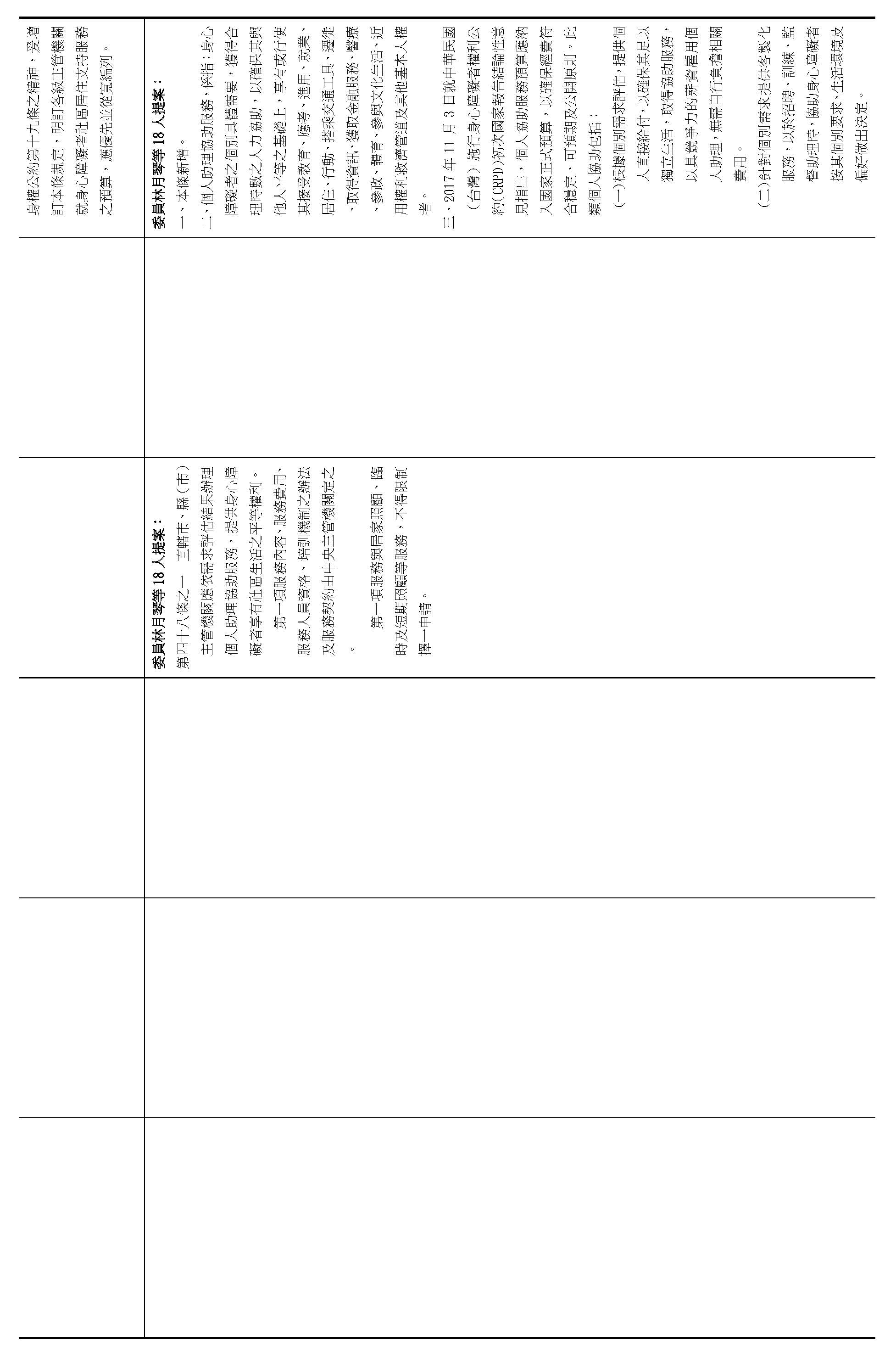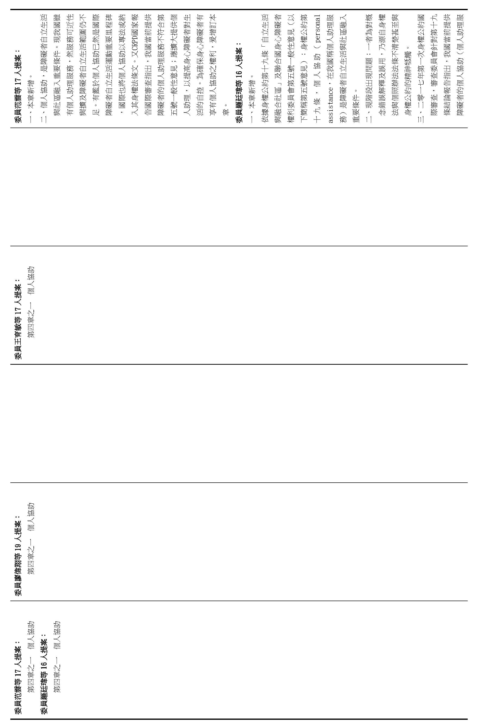 第三,有關伍麗華Saidhai Tahovecahe委員等18人、王育敏委員等17人、台灣民眾黨黨團所提,增訂同儕支持、個人助理與社區居住專章及專條,如同前面所述,在本法第五十條已經訂定相關的,包含社區居住服務還有支持自立生活的服務項目,並且由第五十一條第二項的授權法規訂定相關的執行細節了,所以我們認為為了保持法規的彈性跟能夠及時調整,應以授權法規──身心障礙者個人照顧服務辦法來研修就可以,無須在本法上明定。