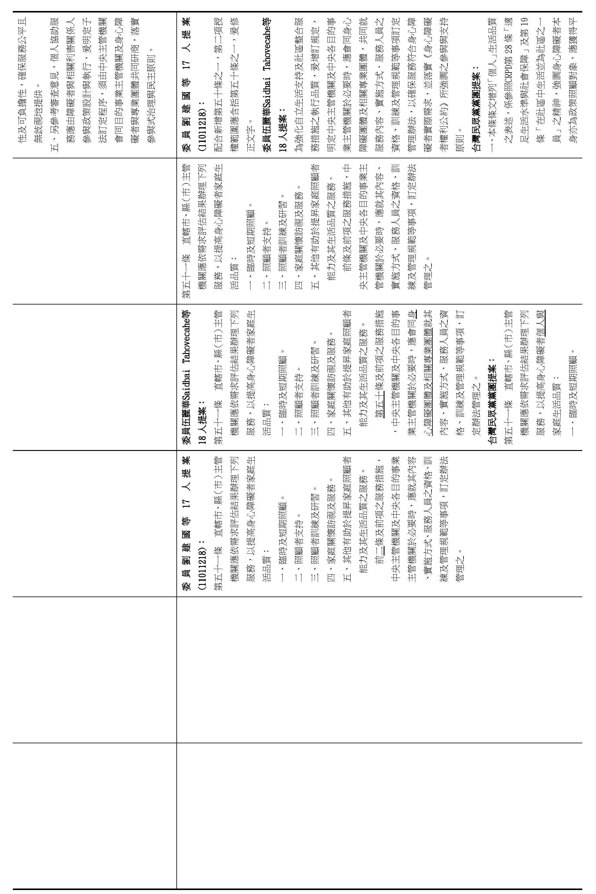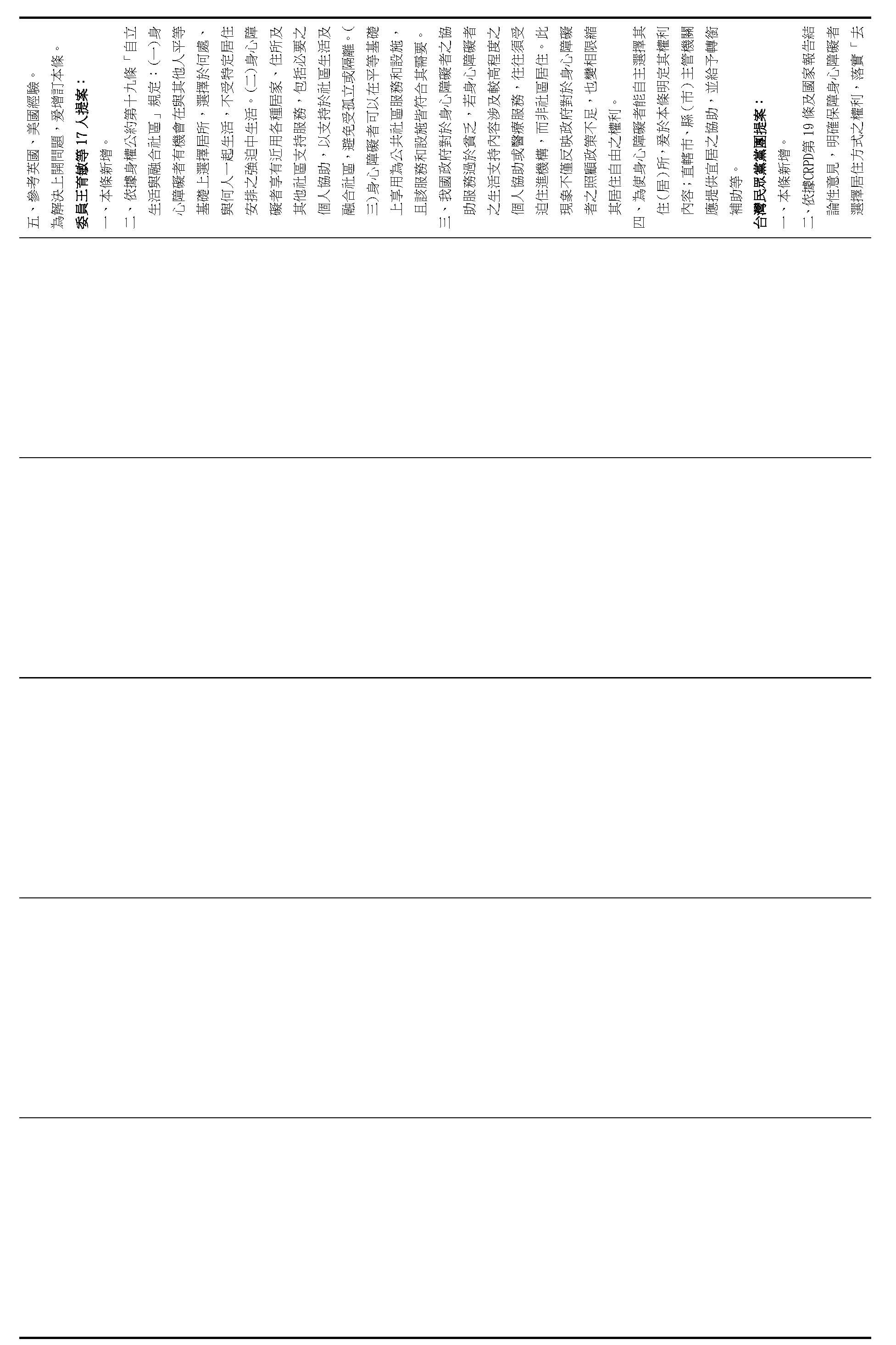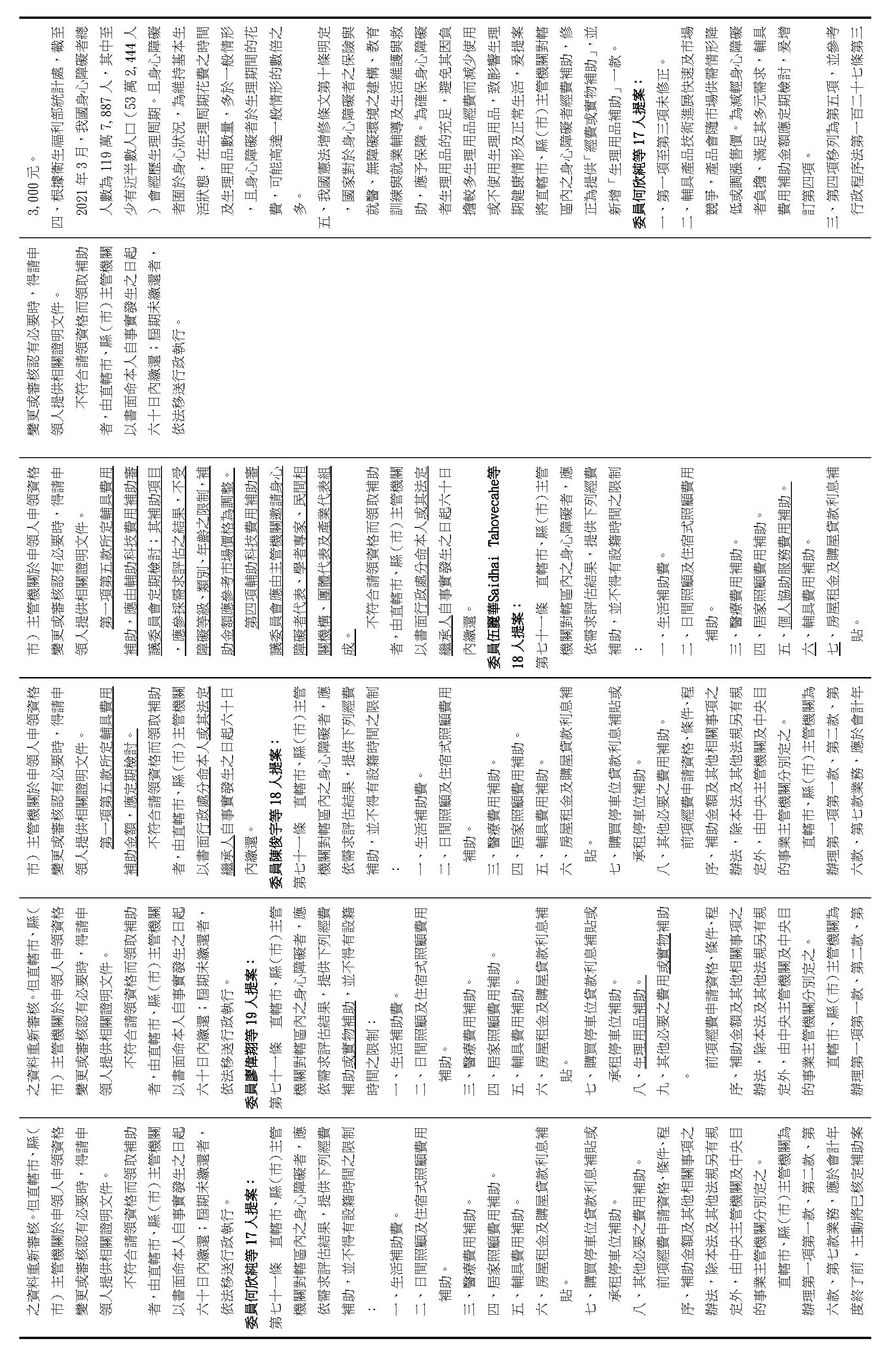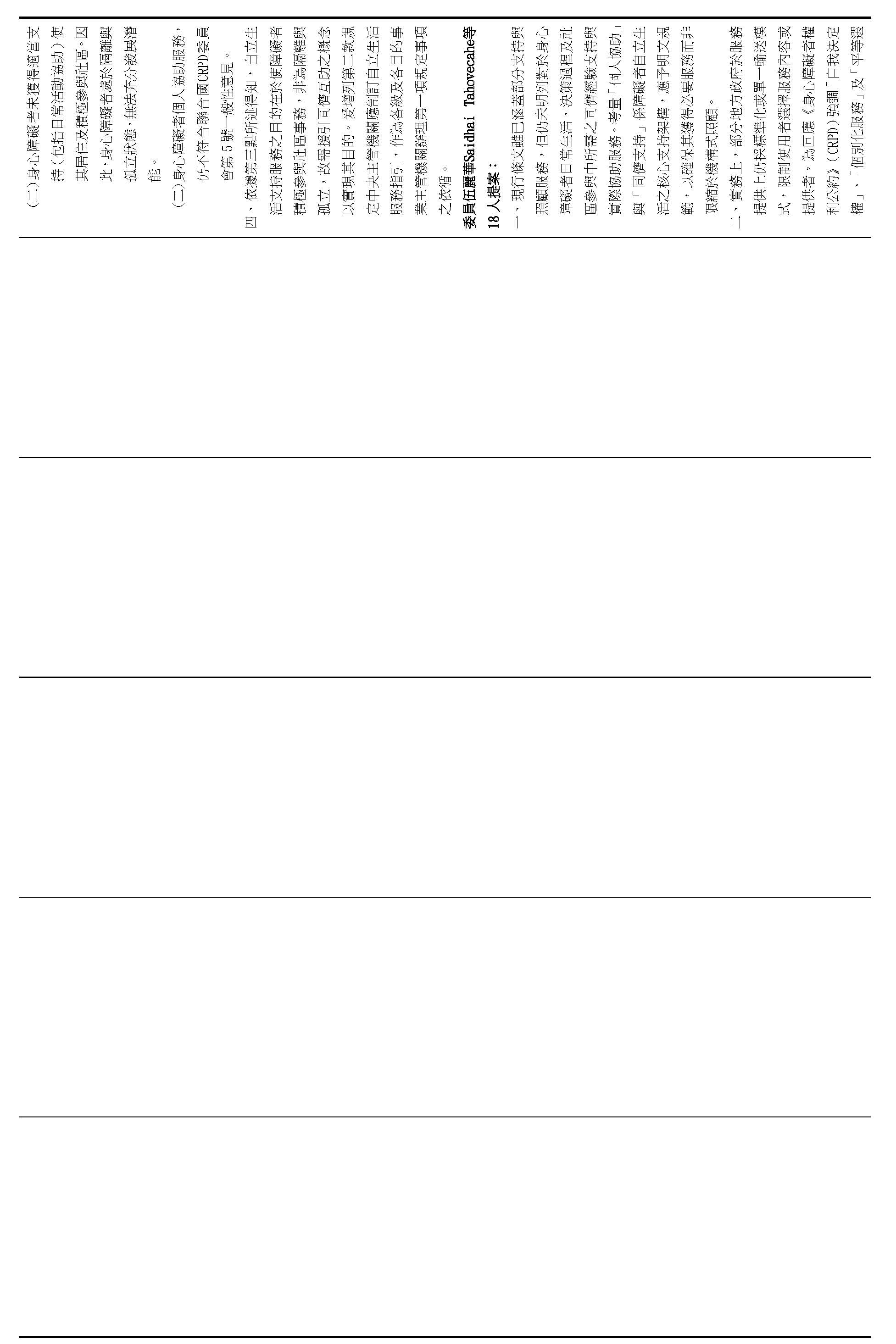 第三,有關伍麗華Saidhai Tahovecahe委員等18人、王育敏委員等17人、台灣民眾黨黨團所提,增訂同儕支持、個人助理與社區居住專章及專條,如同前面所述,在本法第五十條已經訂定相關的,包含社區居住服務還有支持自立生活的服務項目,並且由第五十一條第二項的授權法規訂定相關的執行細節了,所以我們認為為了保持法規的彈性跟能夠及時調整,應以授權法規──身心障礙者個人照顧服務辦法來研修就可以,無須在本法上明定。