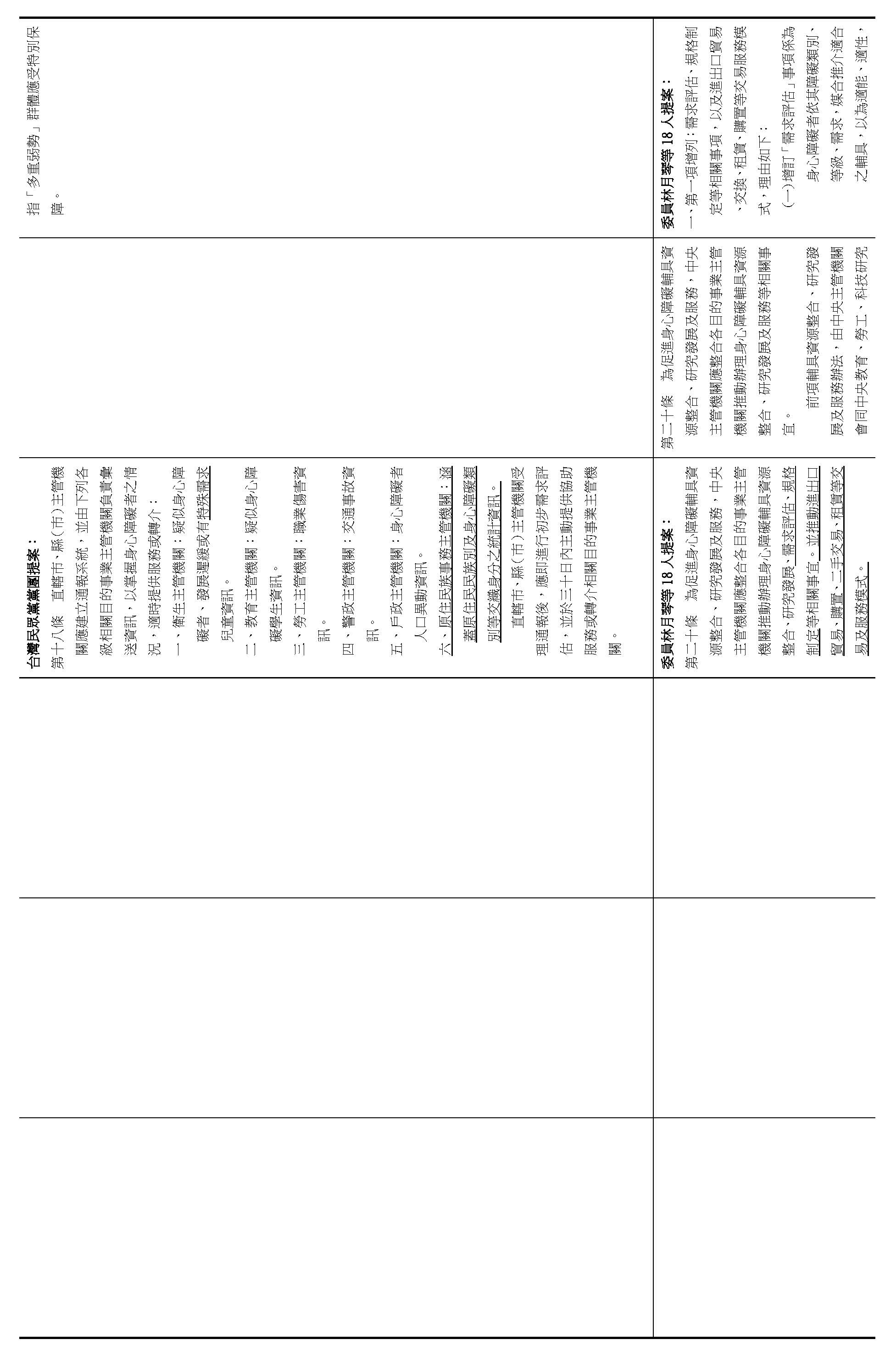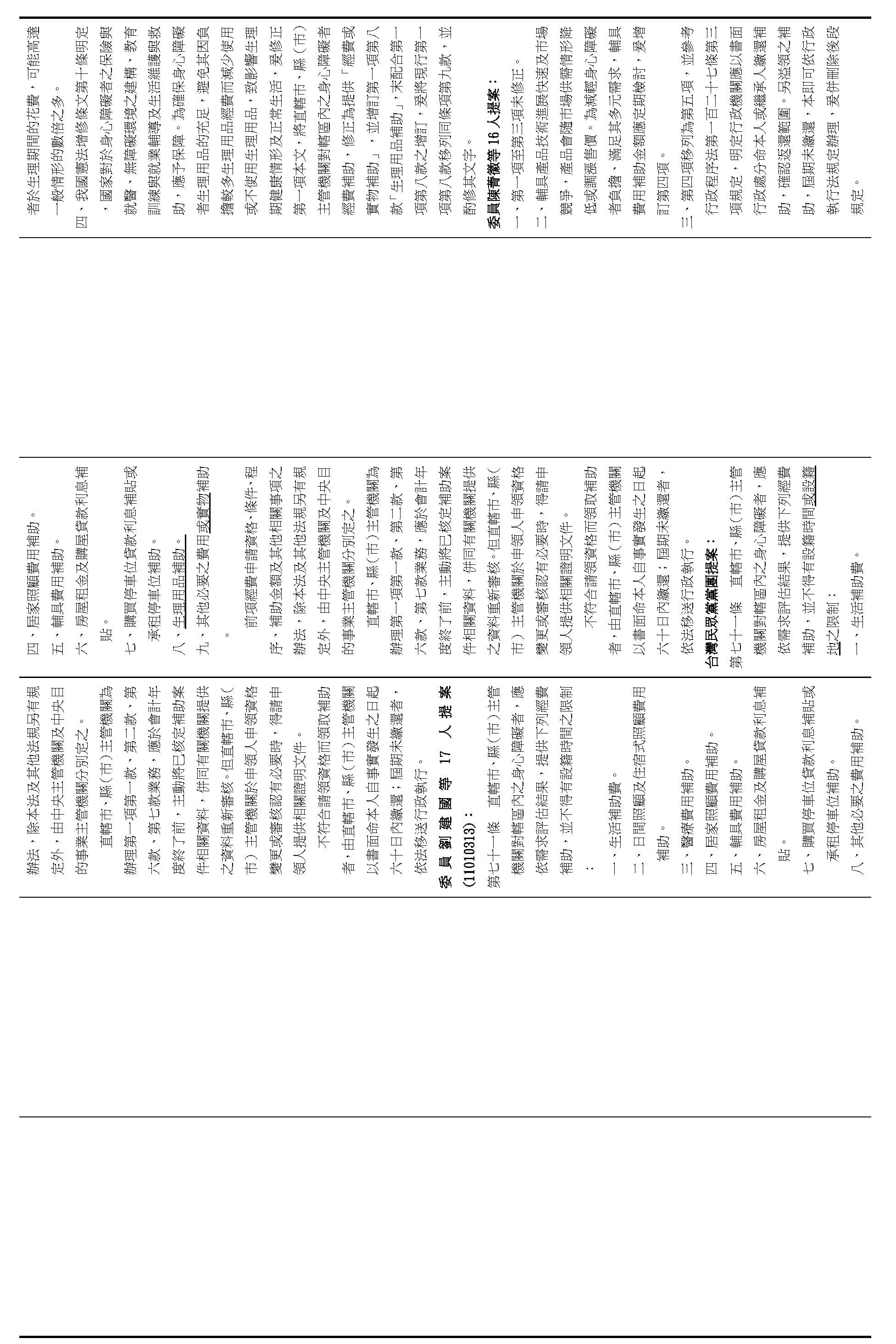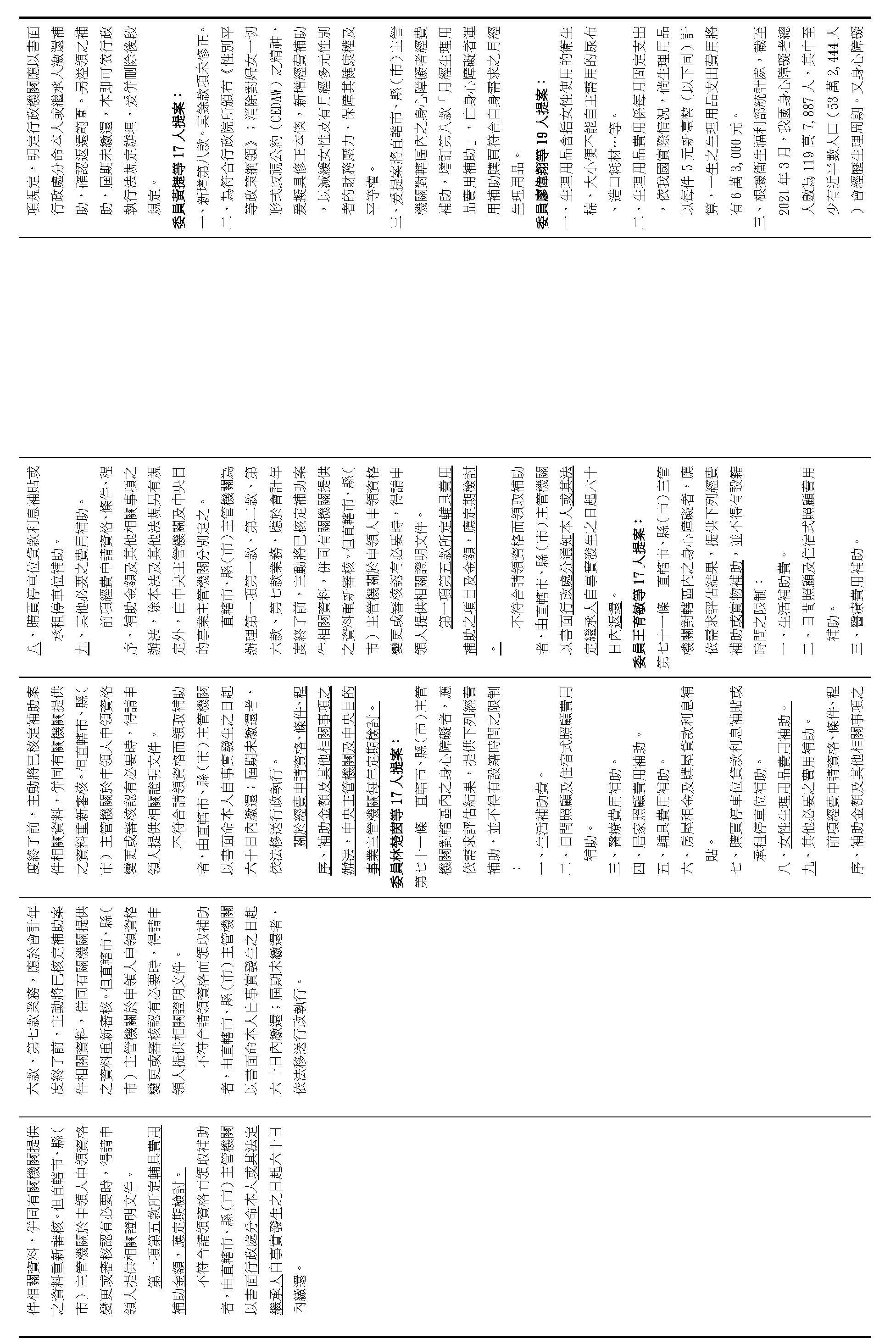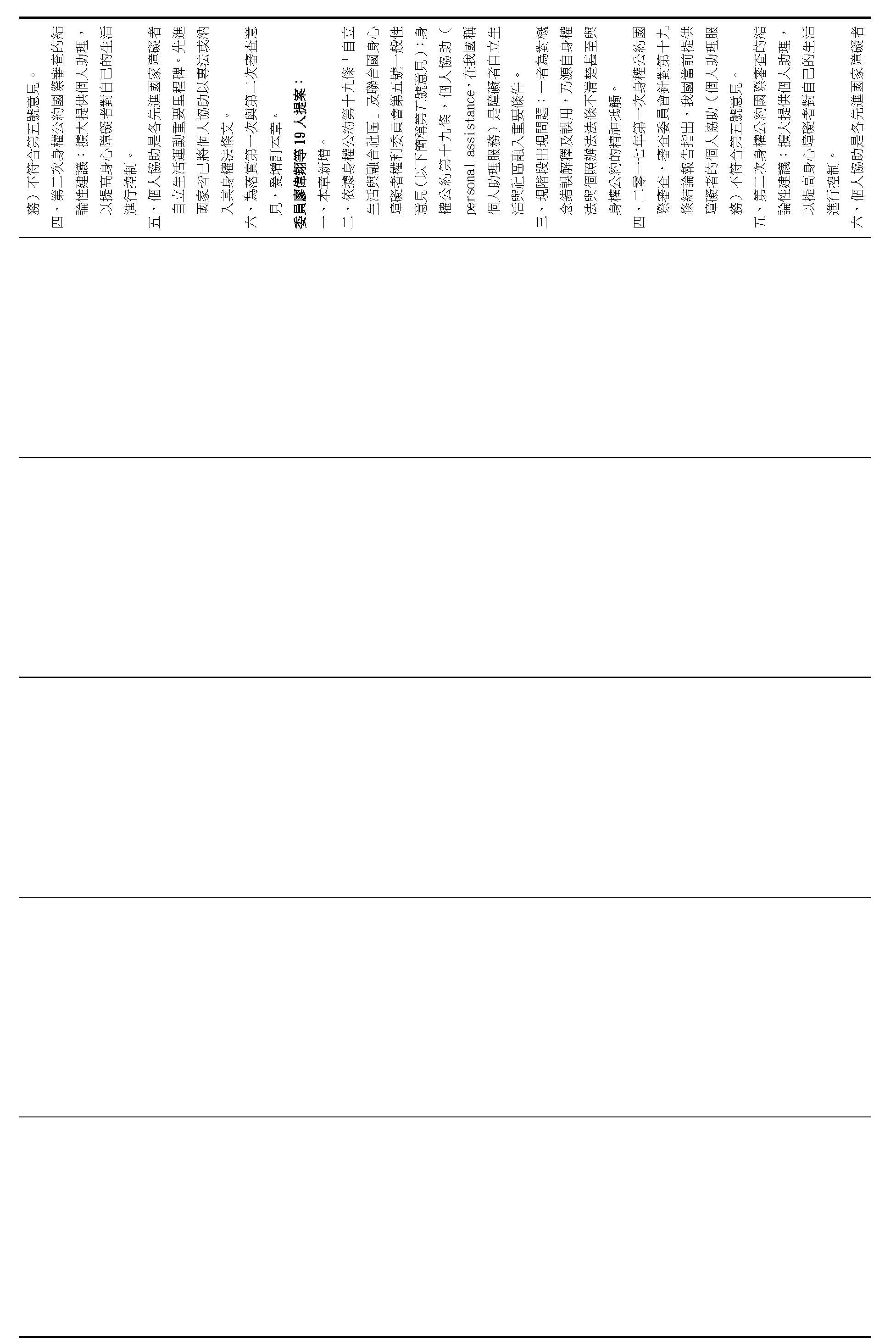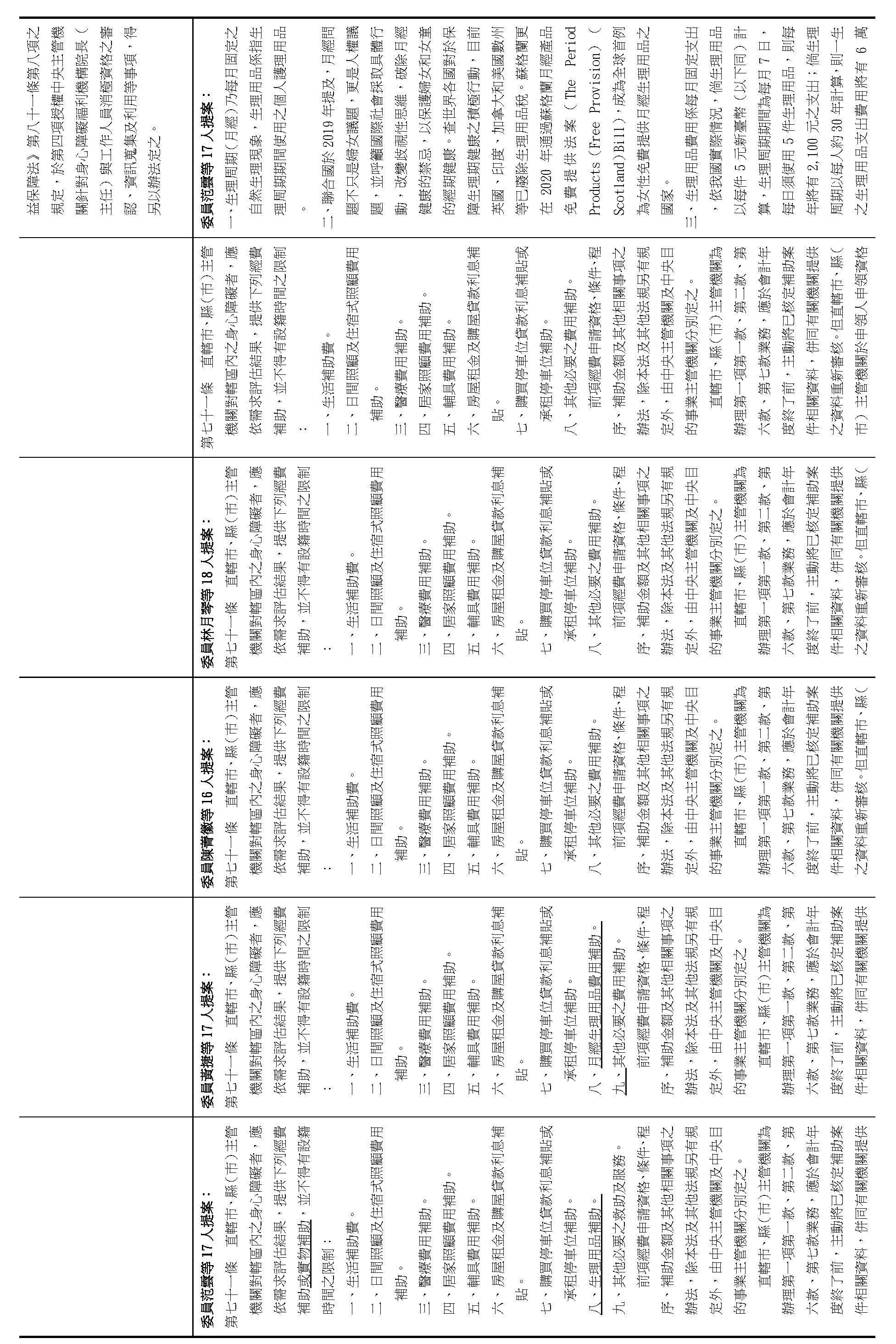 第三,有關伍麗華Saidhai Tahovecahe委員等18人、王育敏委員等17人、台灣民眾黨黨團所提,增訂同儕支持、個人助理與社區居住專章及專條,如同前面所述,在本法第五十條已經訂定相關的,包含社區居住服務還有支持自立生活的服務項目,並且由第五十一條第二項的授權法規訂定相關的執行細節了,所以我們認為為了保持法規的彈性跟能夠及時調整,應以授權法規──身心障礙者個人照顧服務辦法來研修就可以,無須在本法上明定。