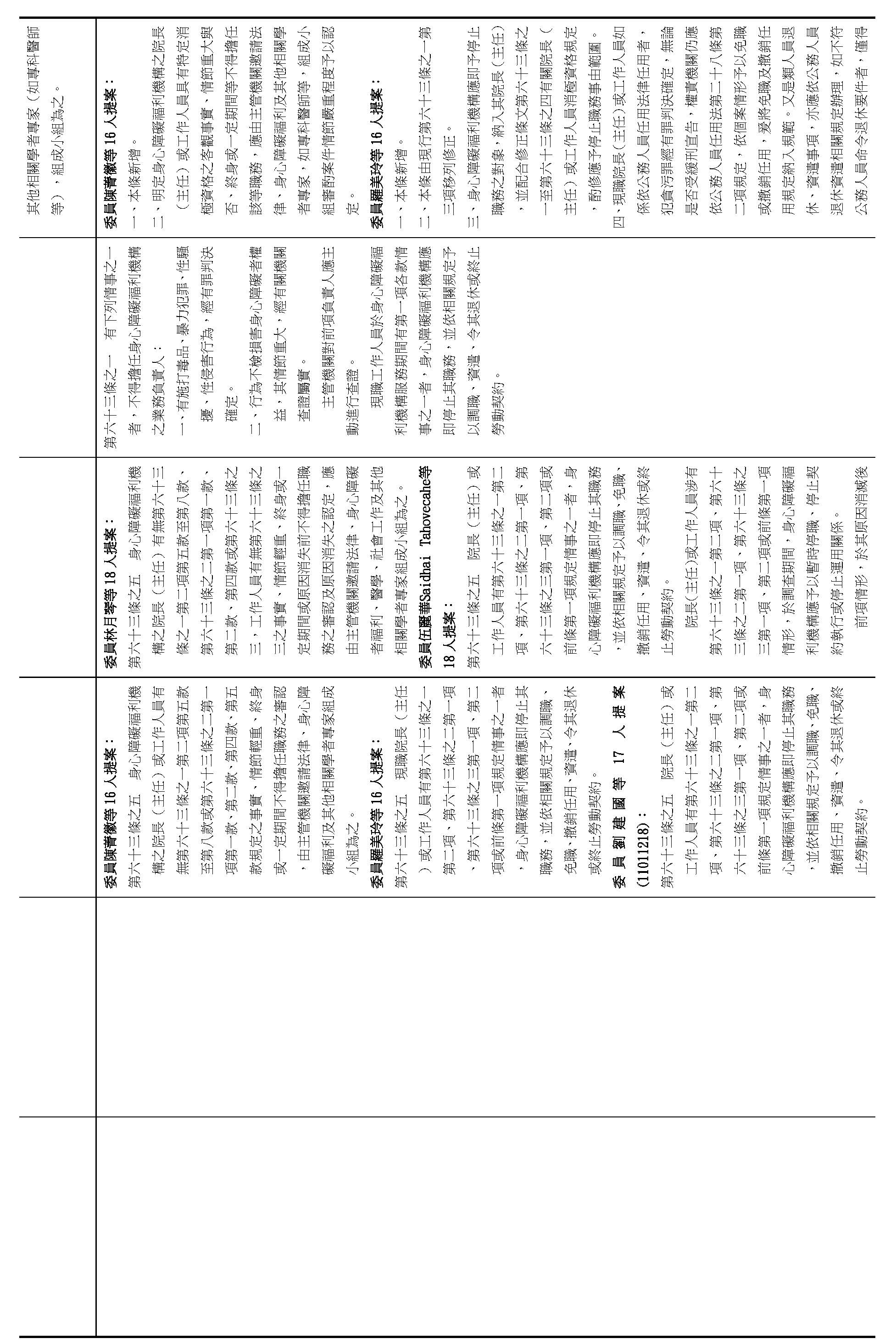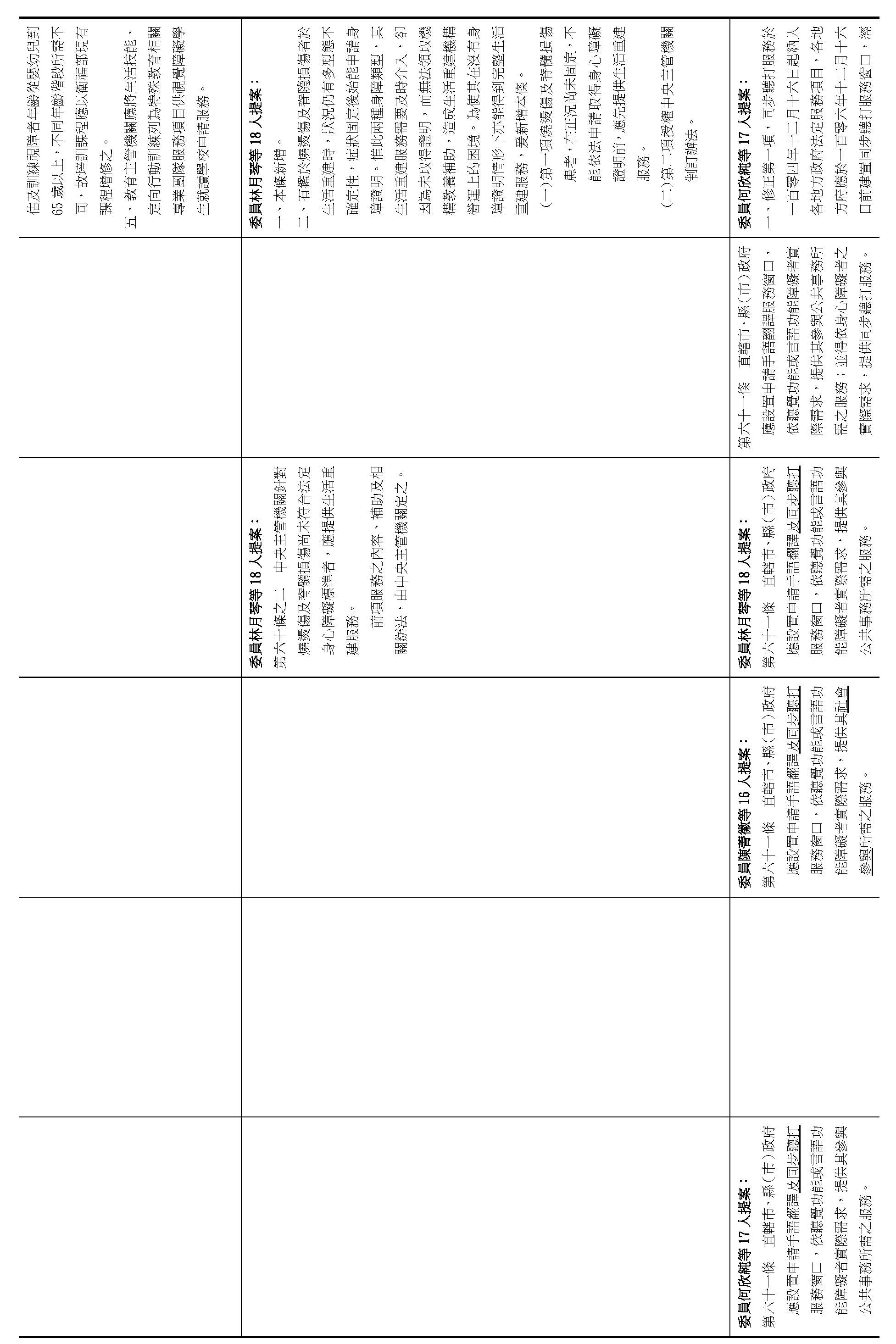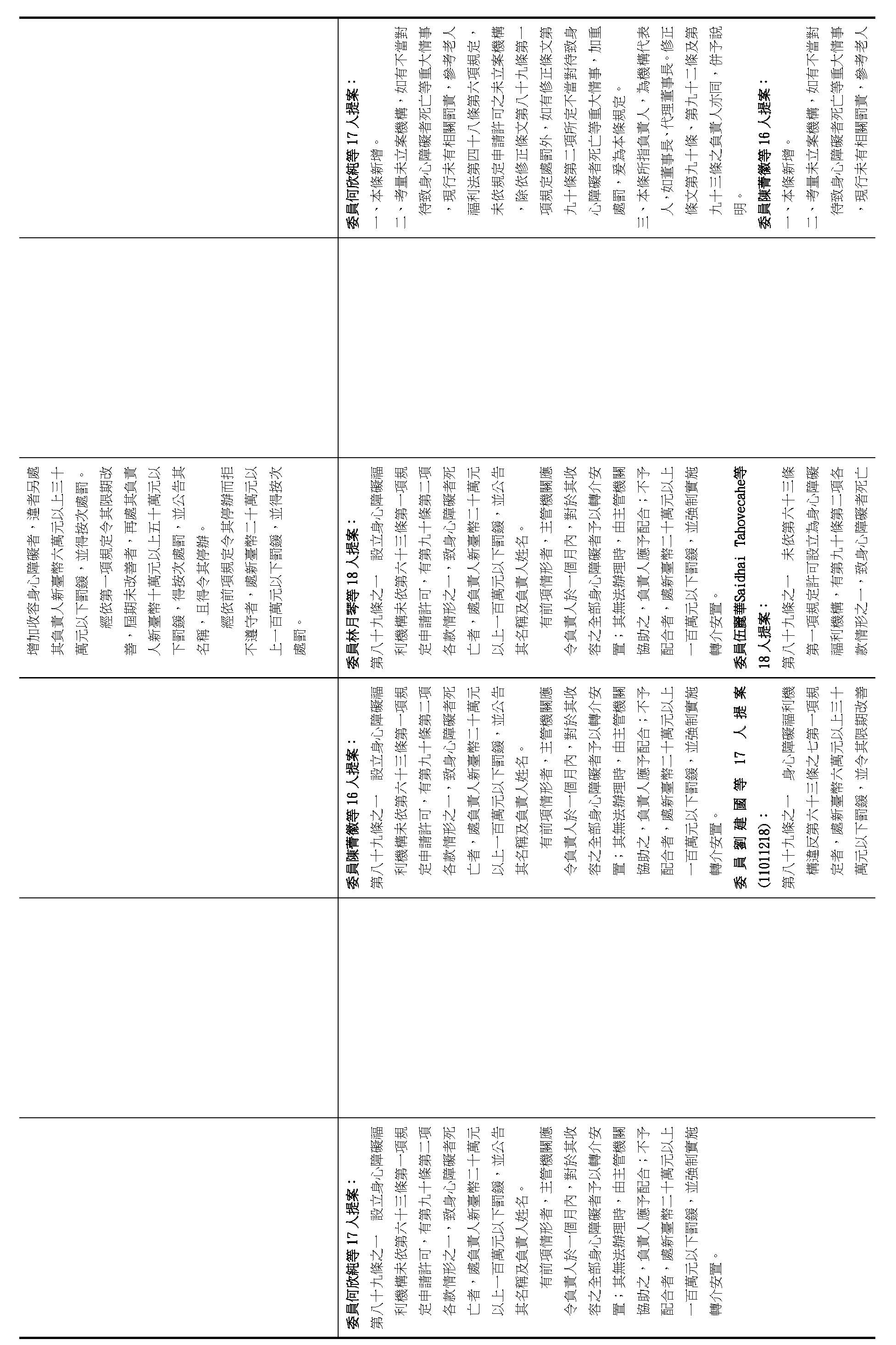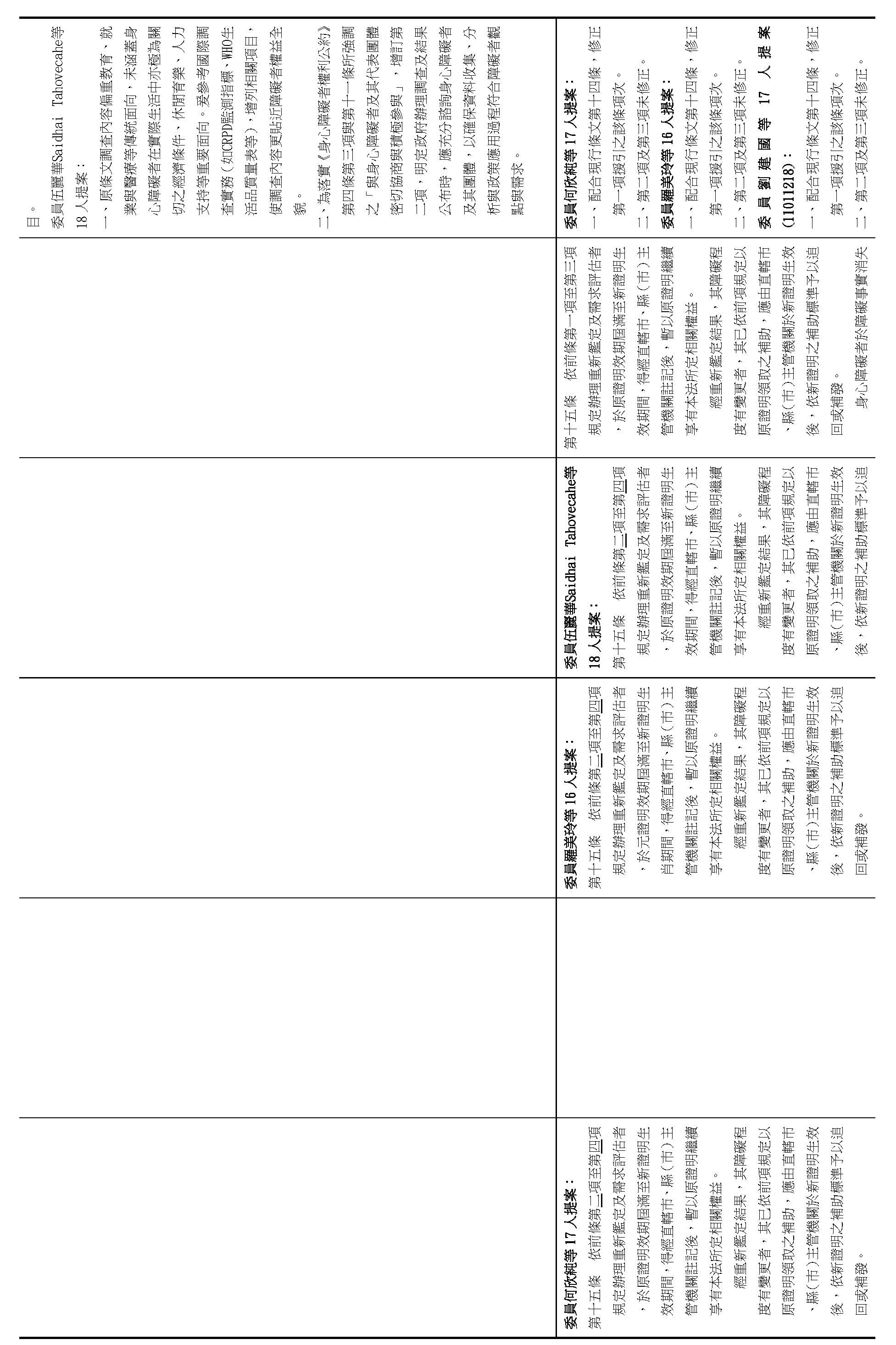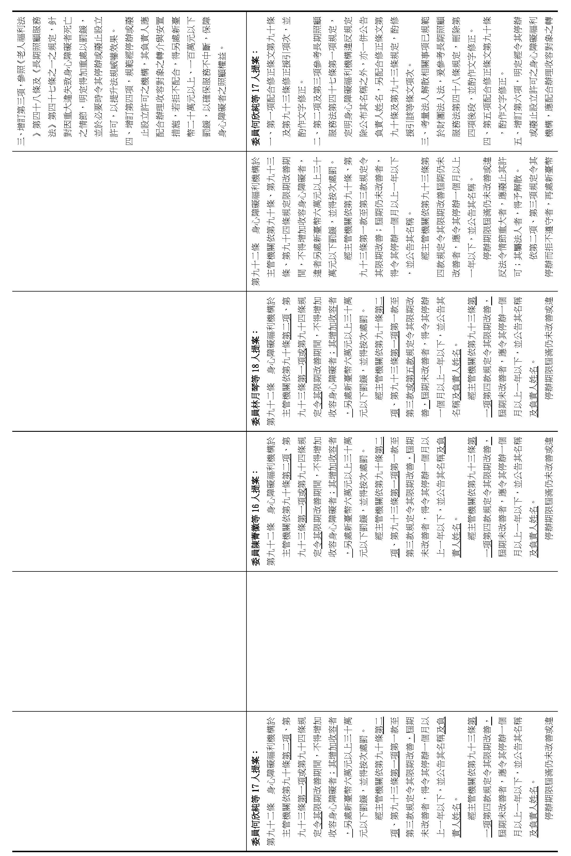 第四是有關林月琴委員等18人、伍麗華Saidhai Tahovecahe委員等18人、王育敏委員等17人提案,增訂身心障礙福利機構之院長(主任)或工作人員的消極資格,並訂定違反法規的罰則,來保障服務對象的權益,以確保機構服務品質,本部敬表支持。