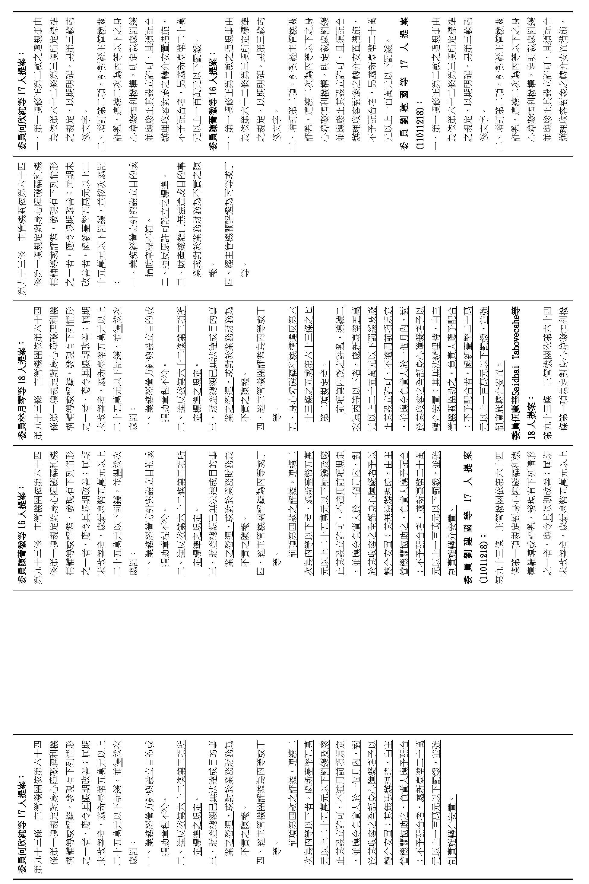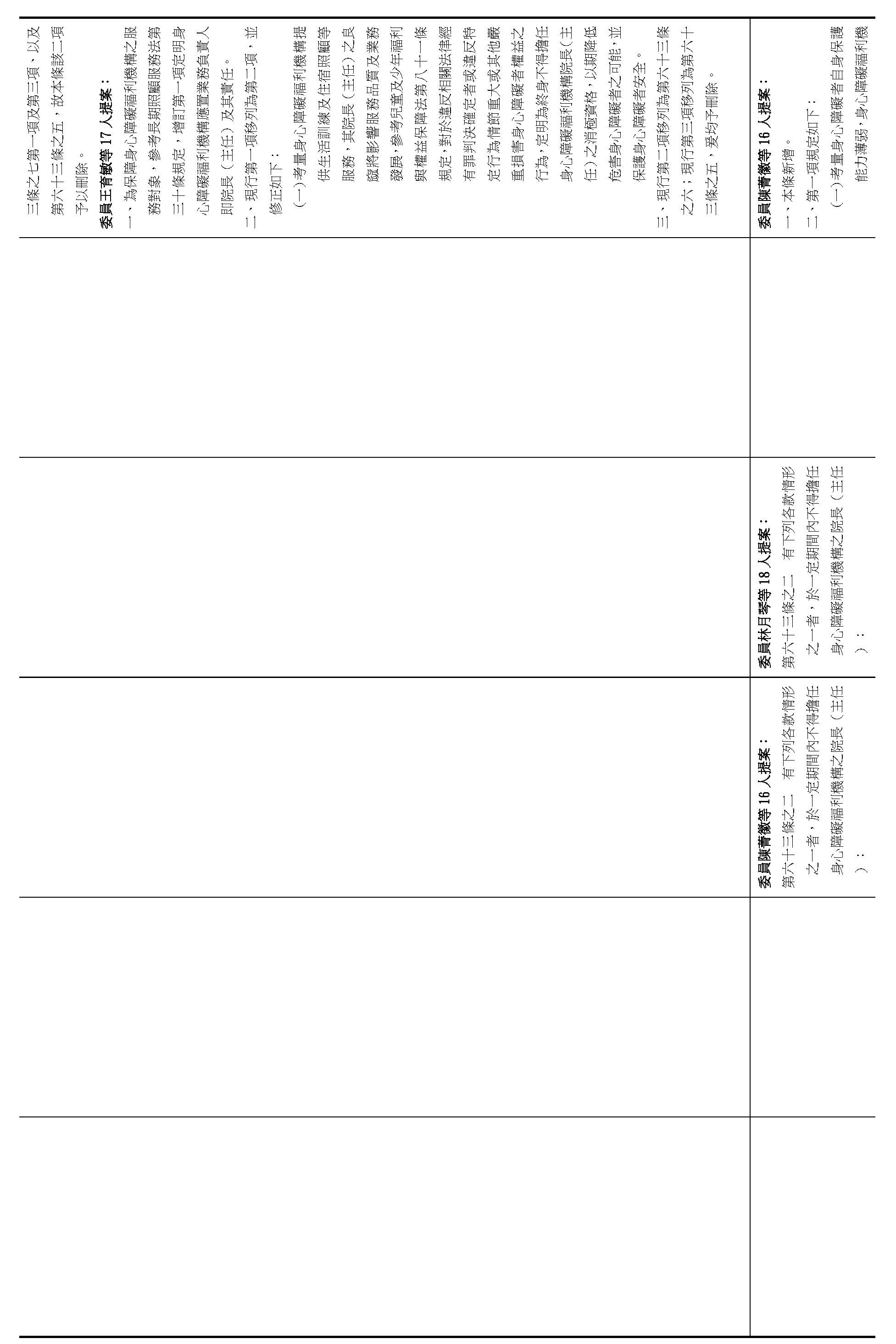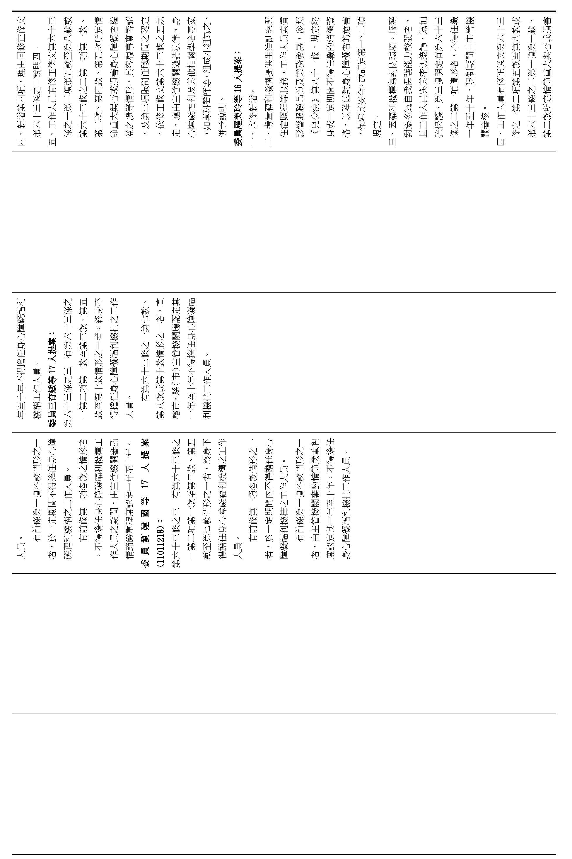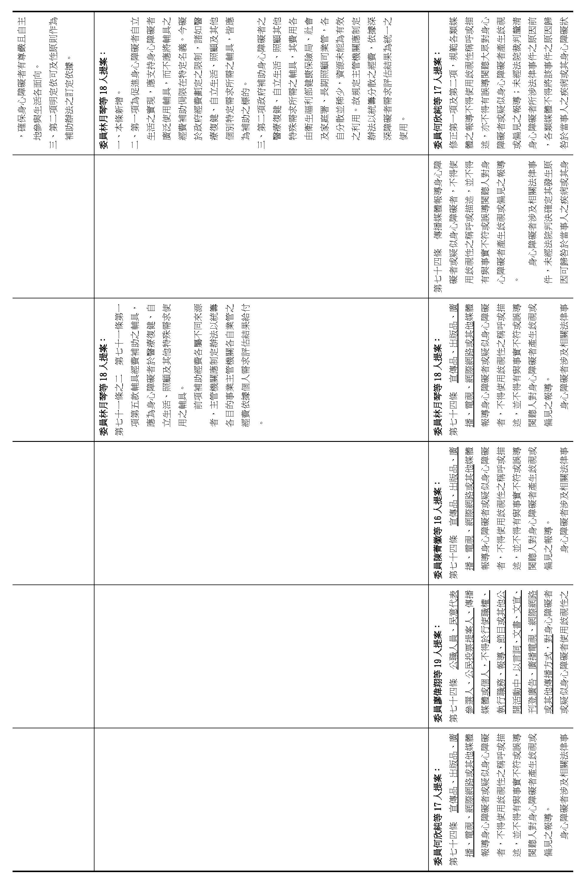 第四是有關林月琴委員等18人、伍麗華Saidhai Tahovecahe委員等18人、王育敏委員等17人提案,增訂身心障礙福利機構之院長(主任)或工作人員的消極資格,並訂定違反法規的罰則,來保障服務對象的權益,以確保機構服務品質,本部敬表支持。
