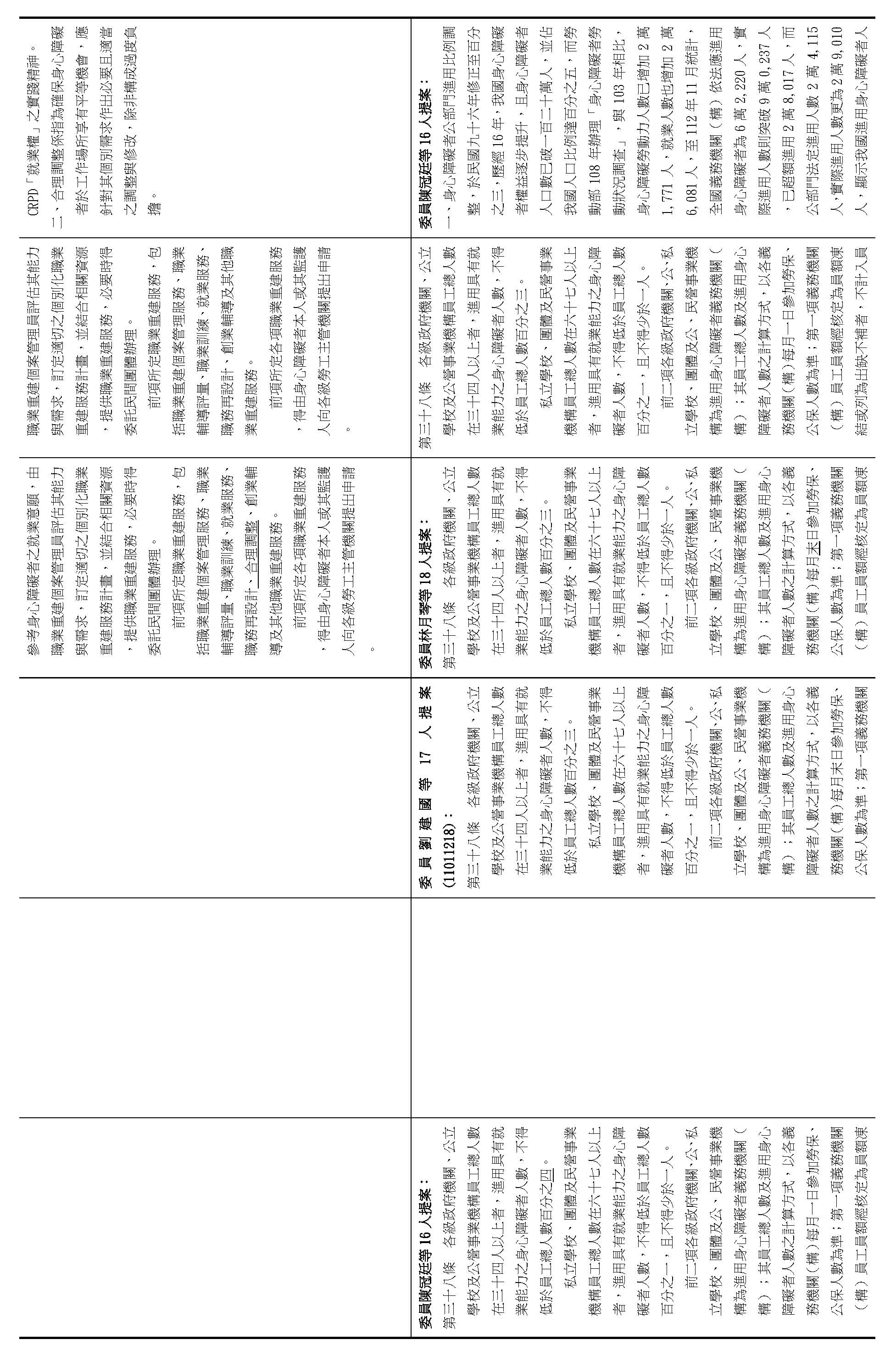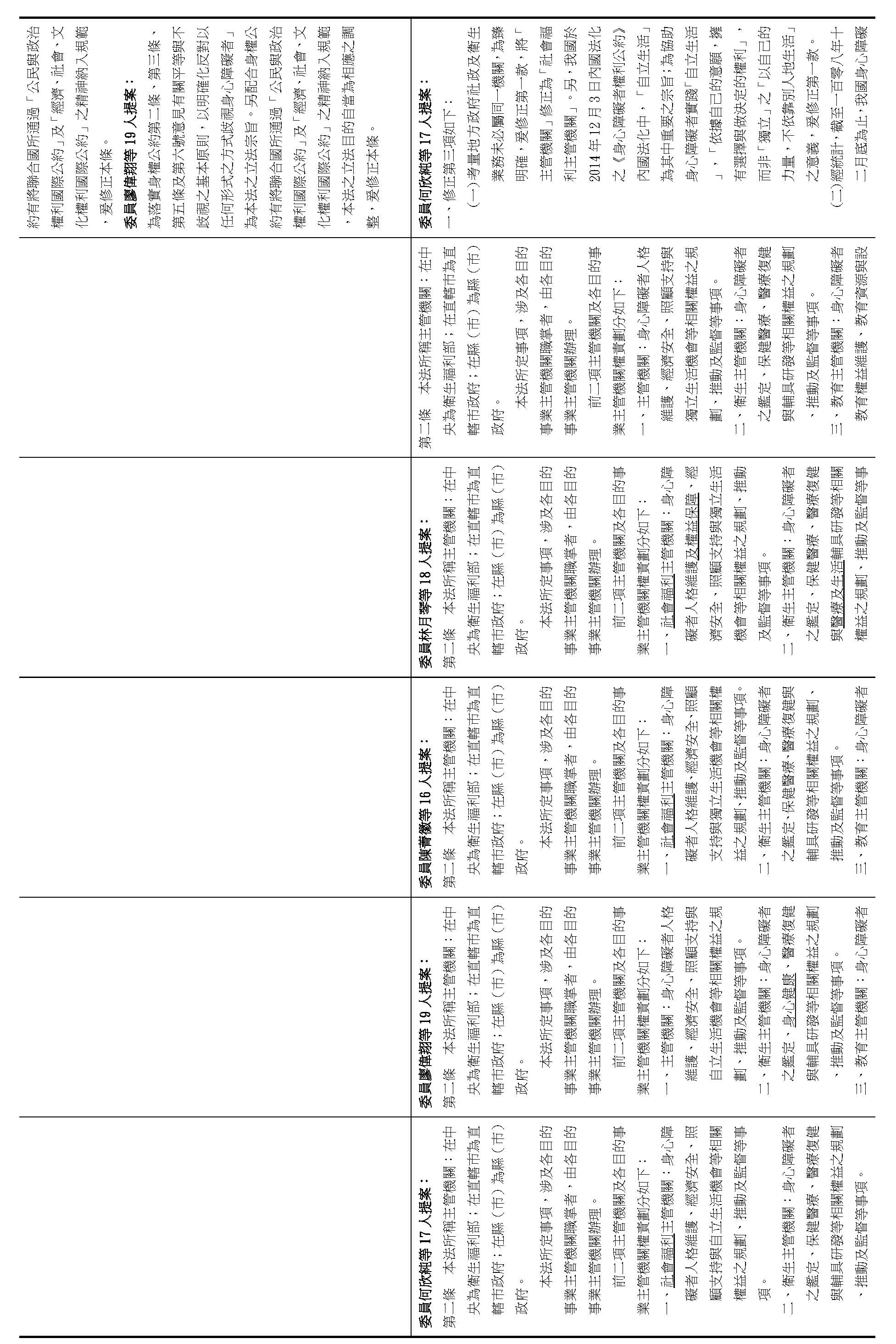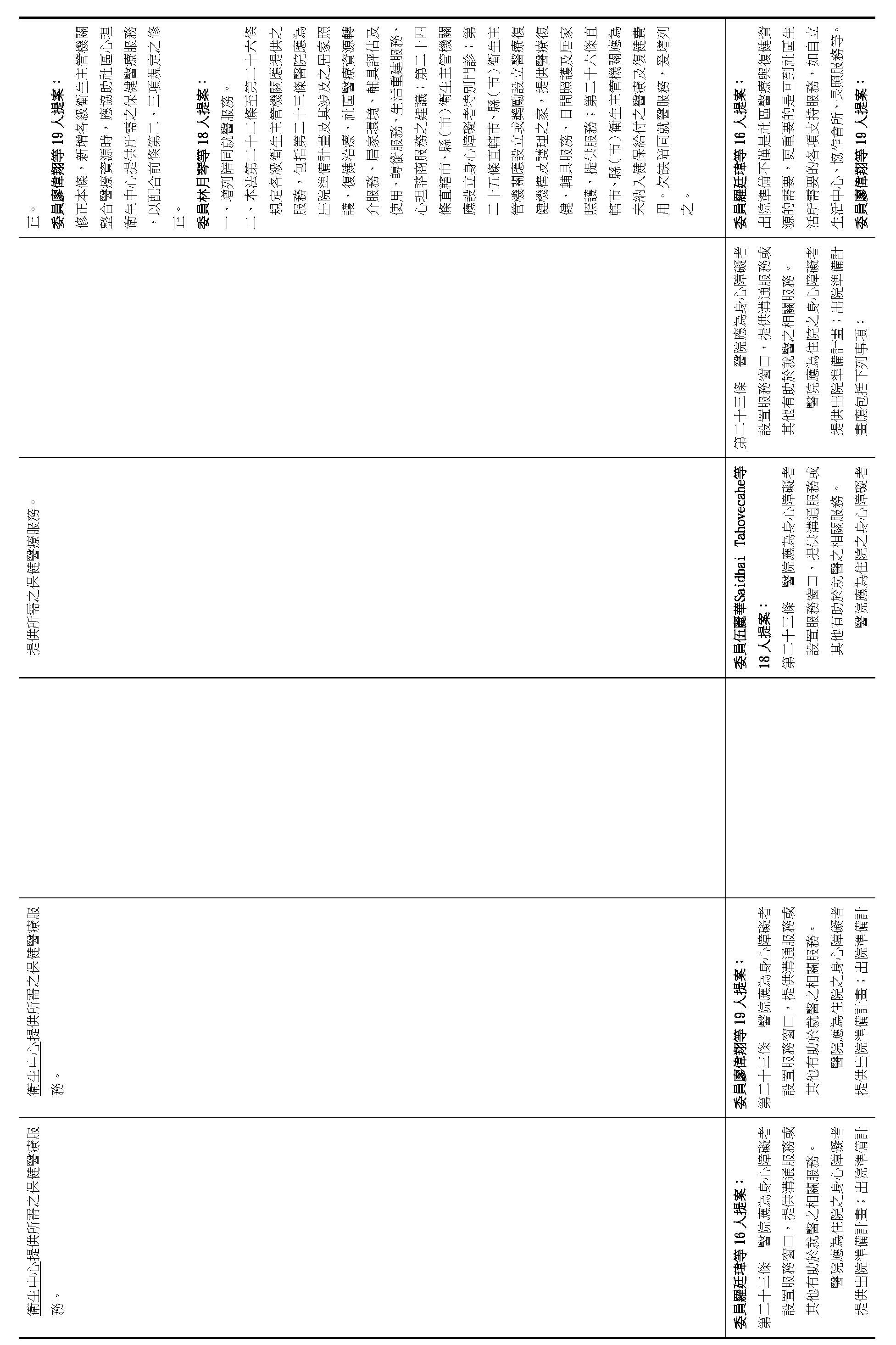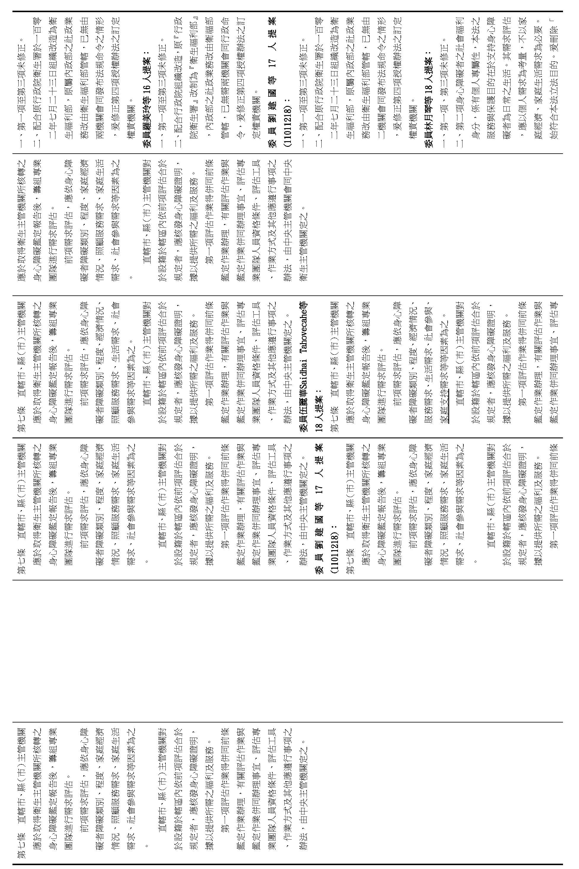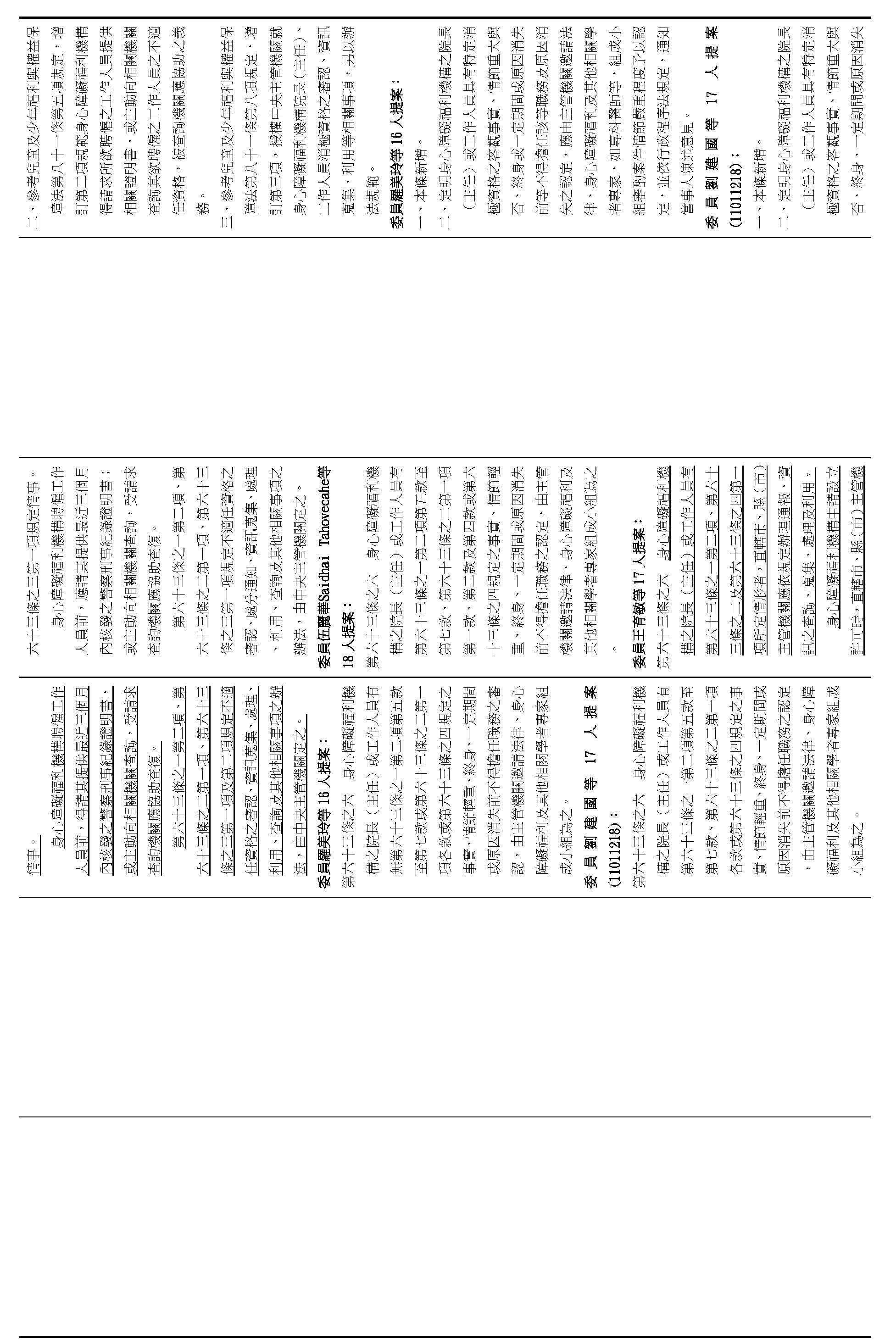 第四是有關林月琴委員等18人、伍麗華Saidhai Tahovecahe委員等18人、王育敏委員等17人提案,增訂身心障礙福利機構之院長(主任)或工作人員的消極資格,並訂定違反法規的罰則,來保障服務對象的權益,以確保機構服務品質,本部敬表支持。