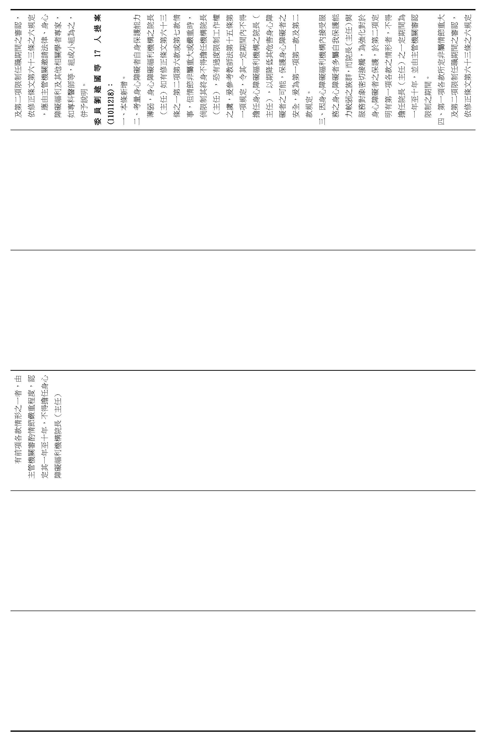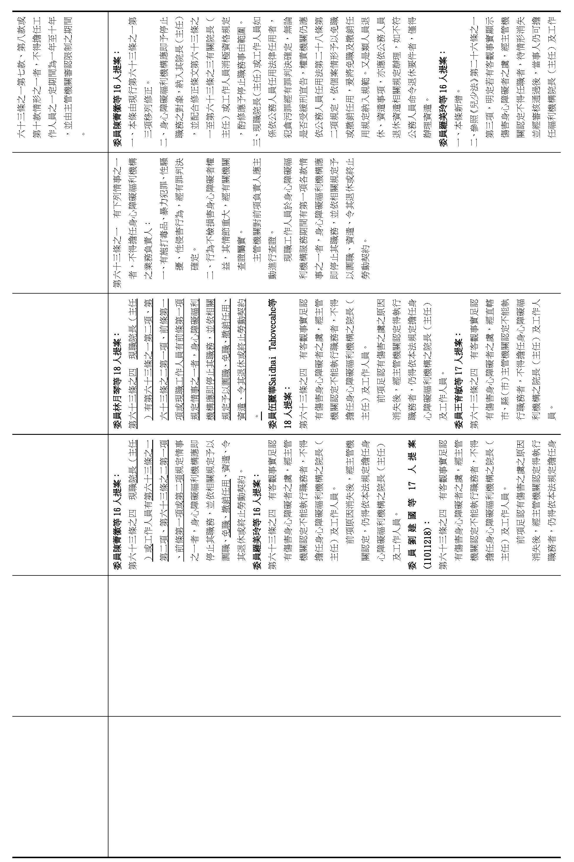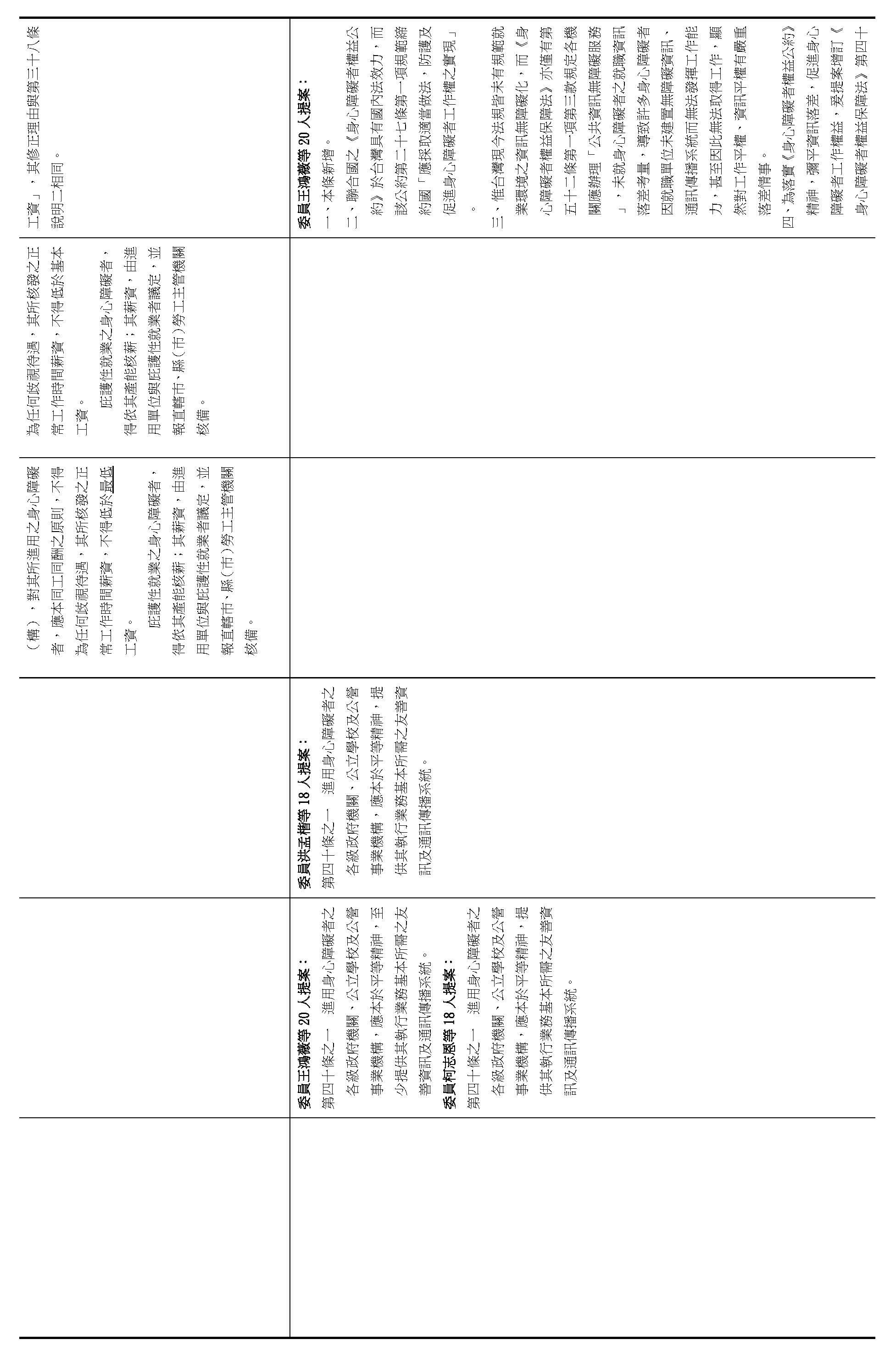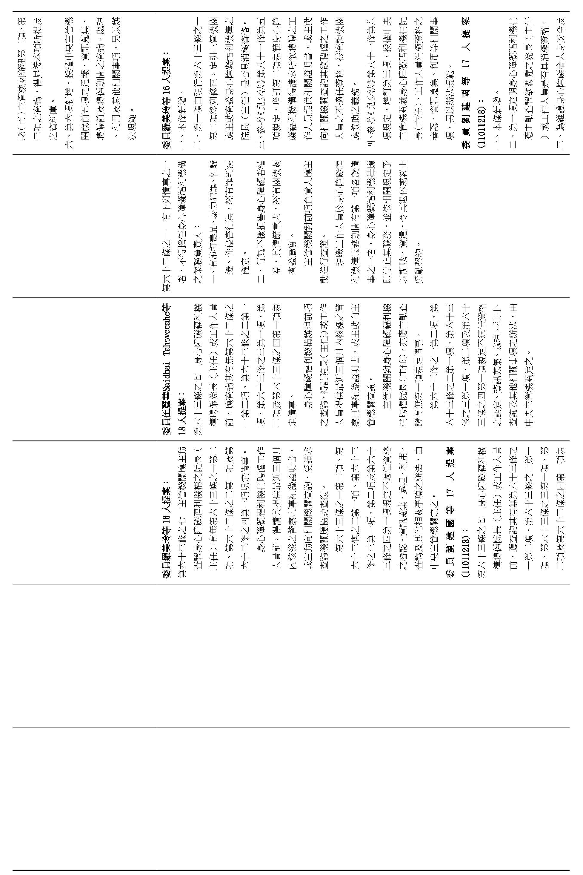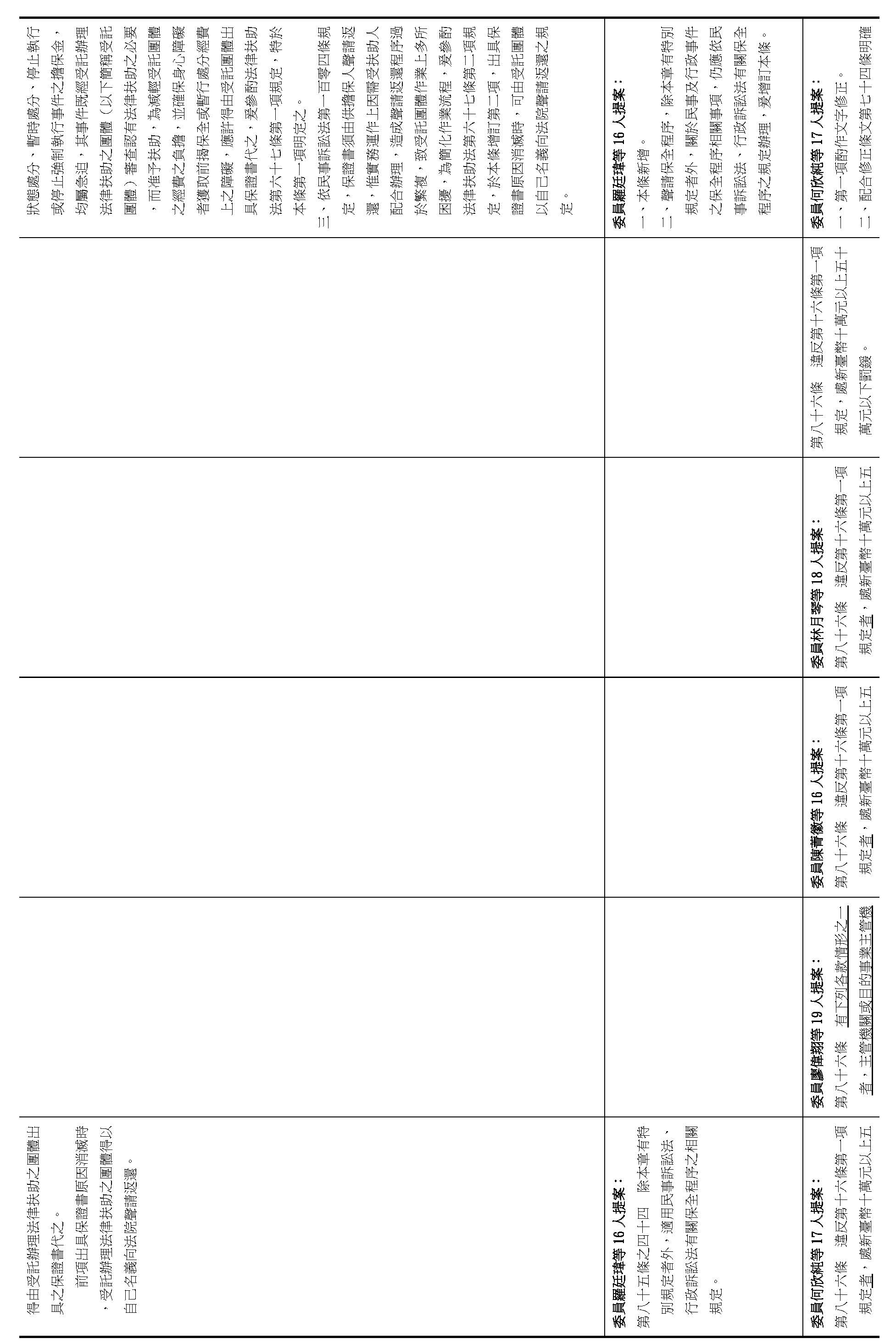 第四是有關林月琴委員等18人、伍麗華Saidhai Tahovecahe委員等18人、王育敏委員等17人提案,增訂身心障礙福利機構之院長(主任)或工作人員的消極資格,並訂定違反法規的罰則,來保障服務對象的權益,以確保機構服務品質,本部敬表支持。