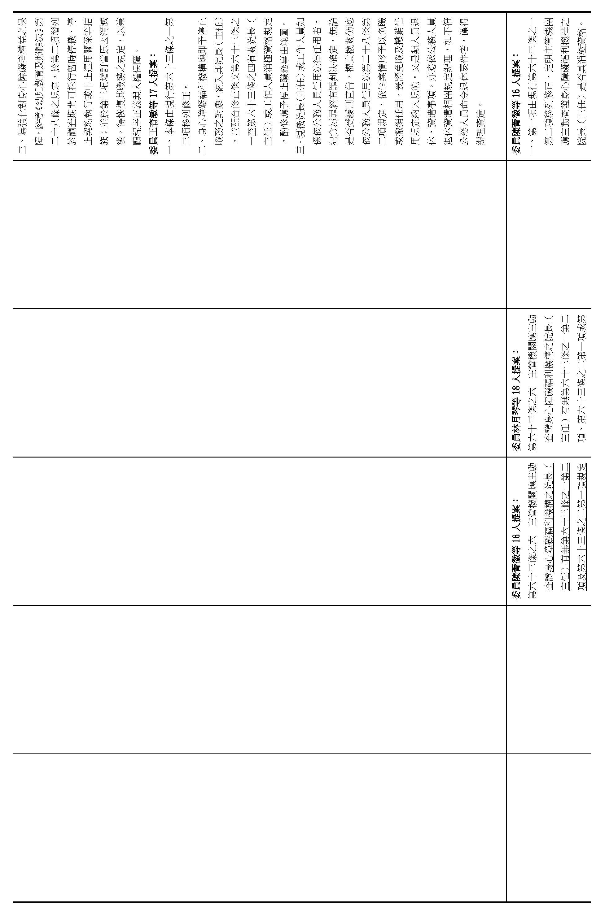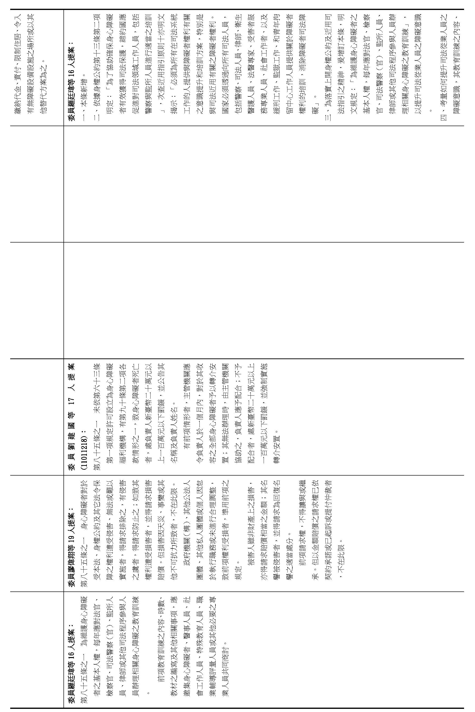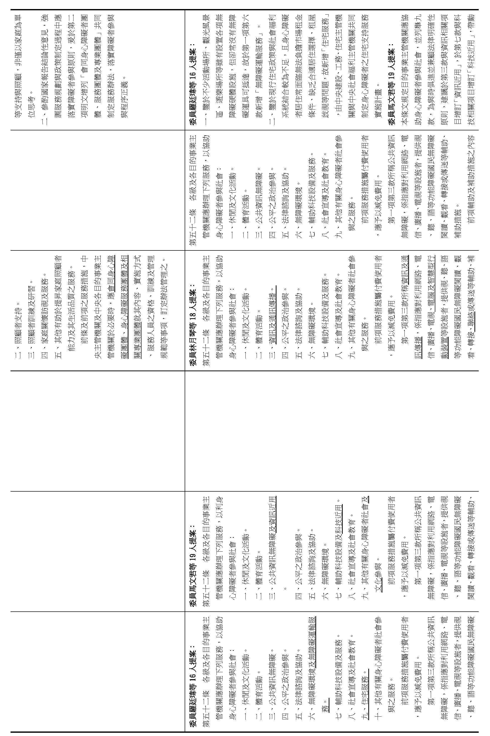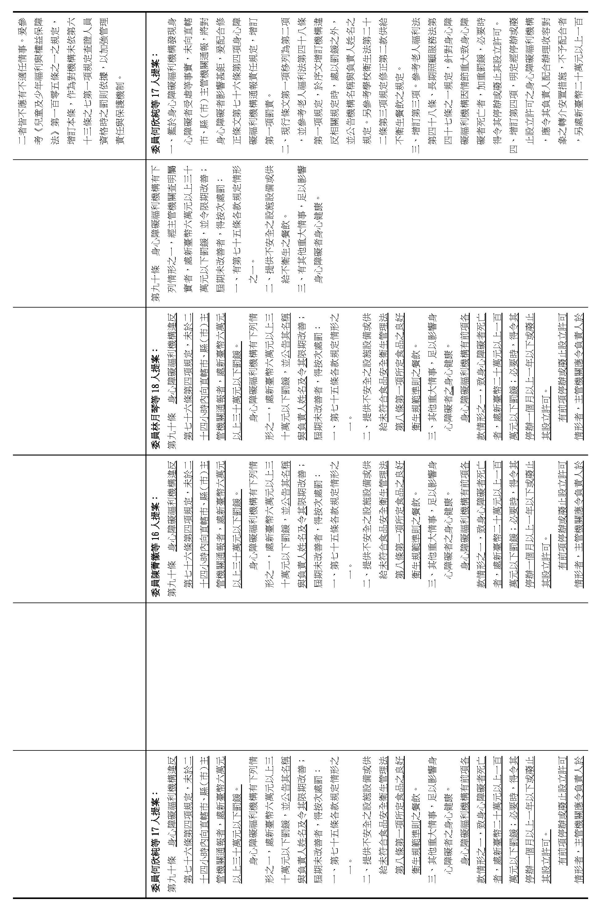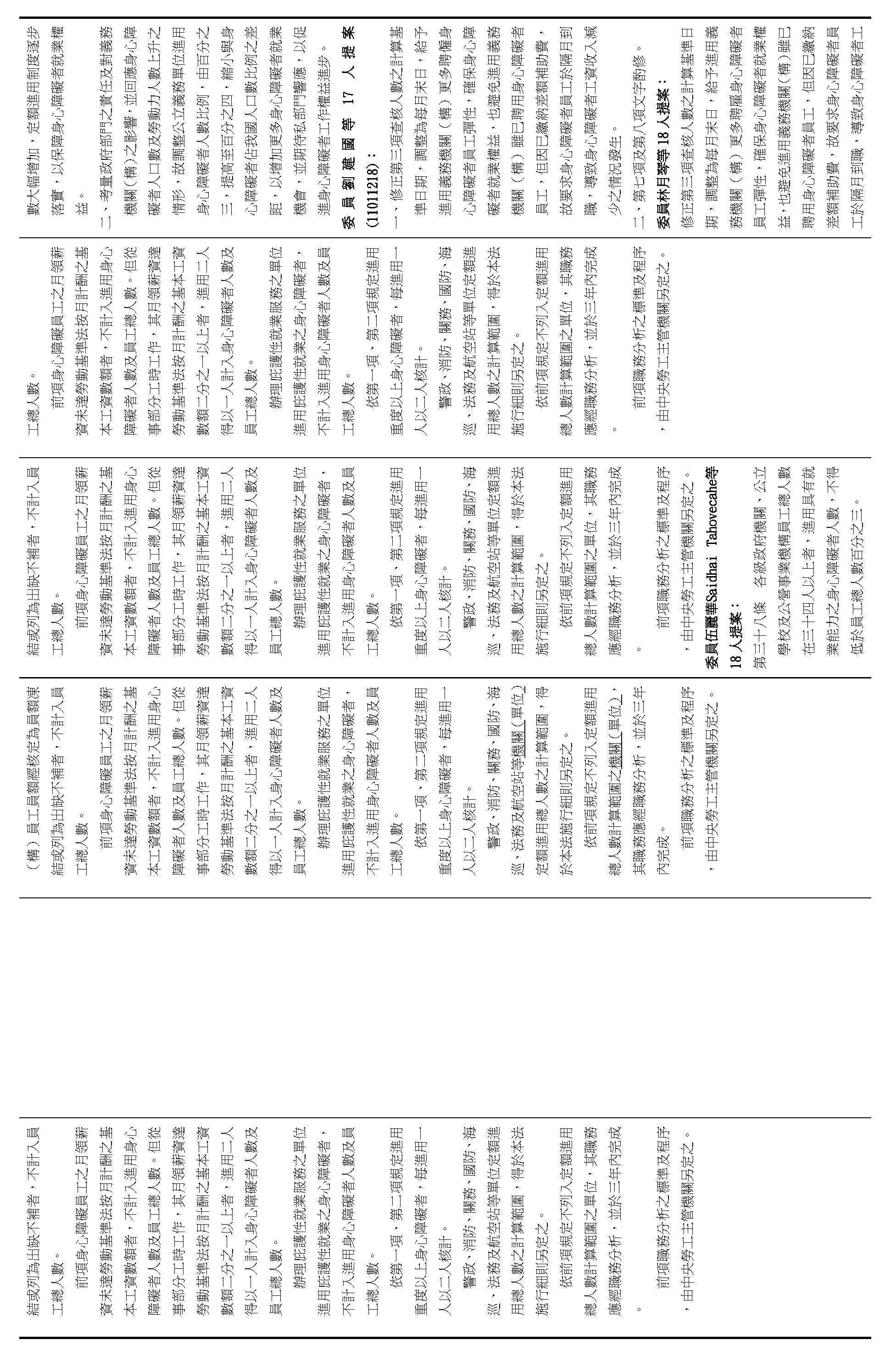 第四是有關林月琴委員等18人、伍麗華Saidhai Tahovecahe委員等18人、王育敏委員等17人提案,增訂身心障礙福利機構之院長(主任)或工作人員的消極資格,並訂定違反法規的罰則,來保障服務對象的權益,以確保機構服務品質,本部敬表支持。