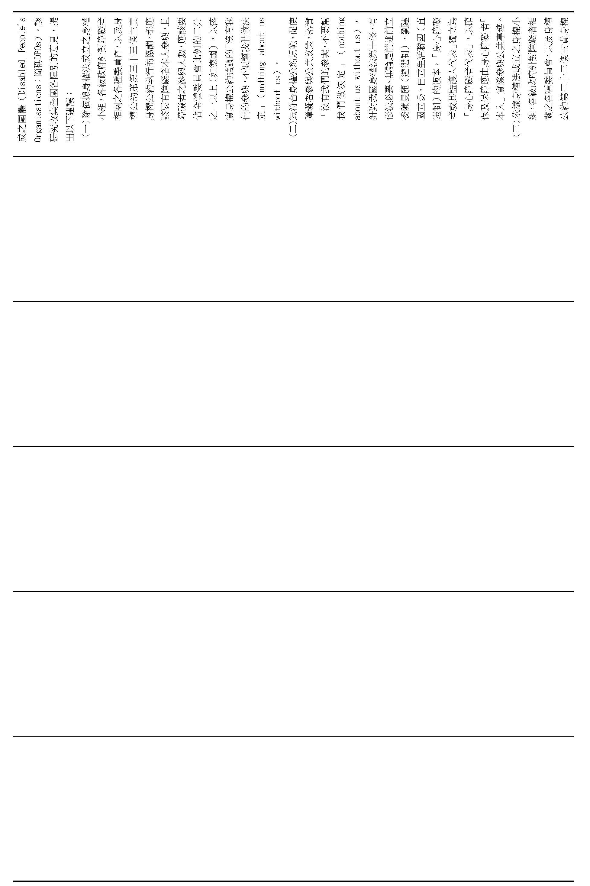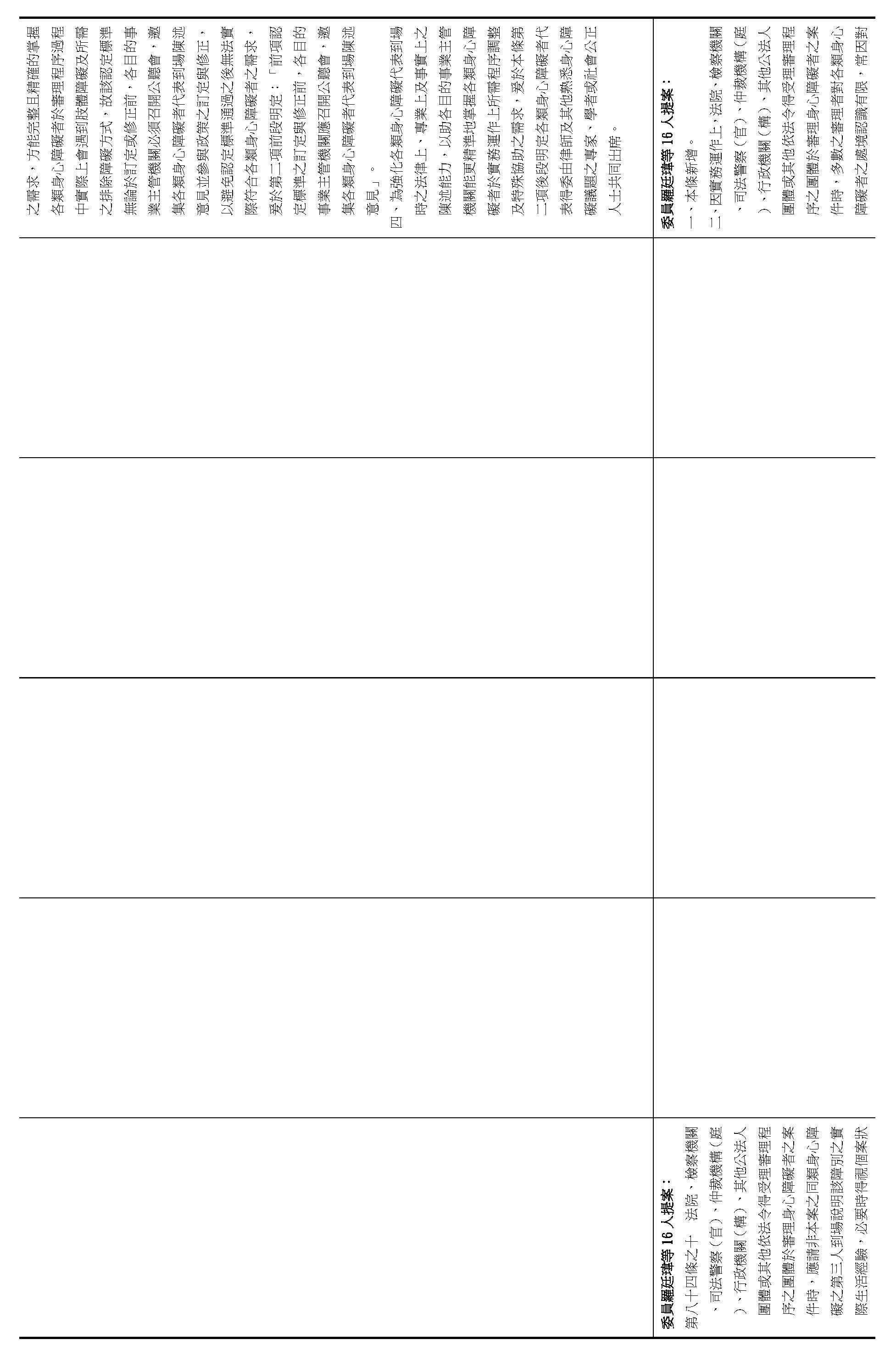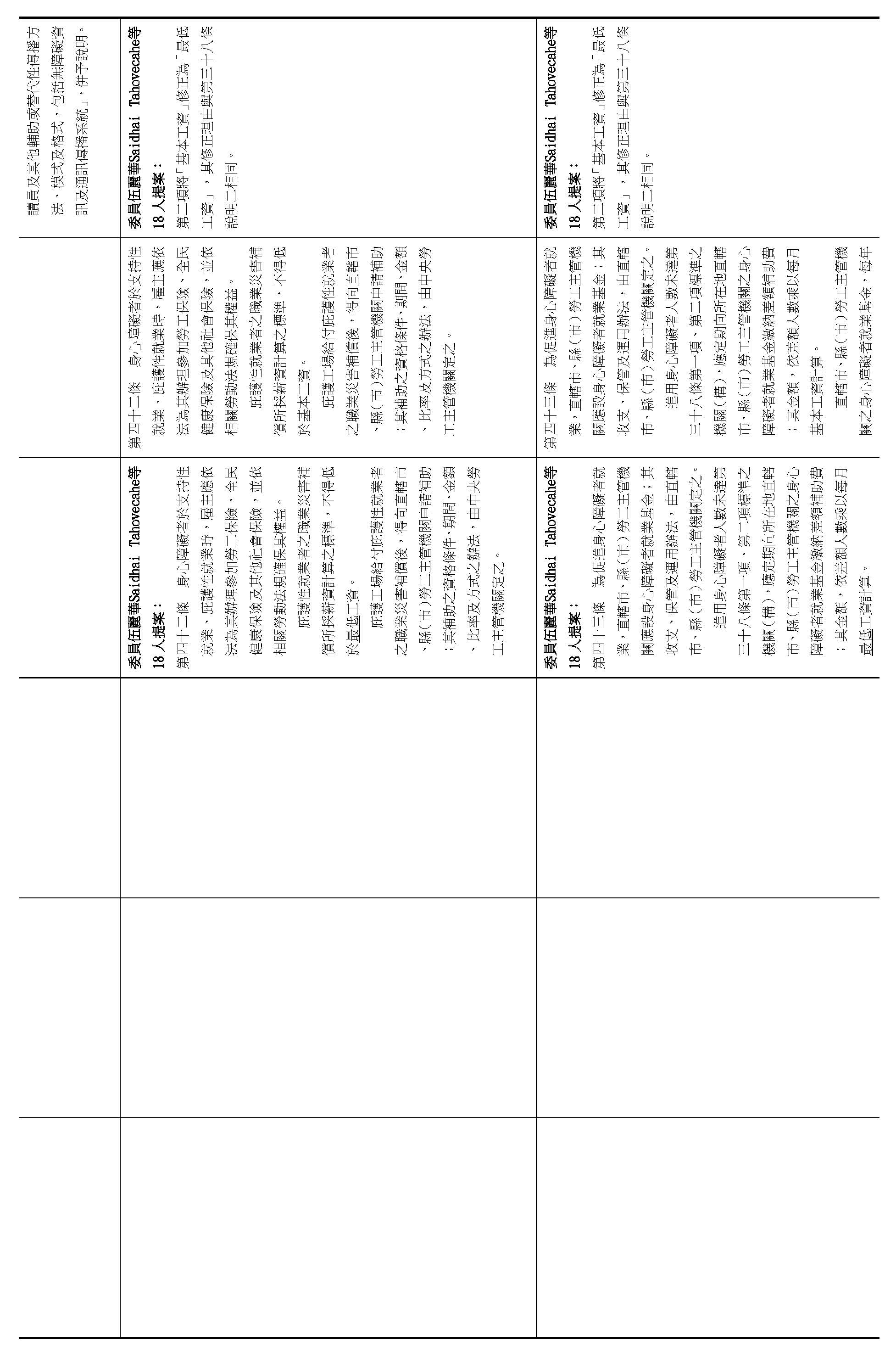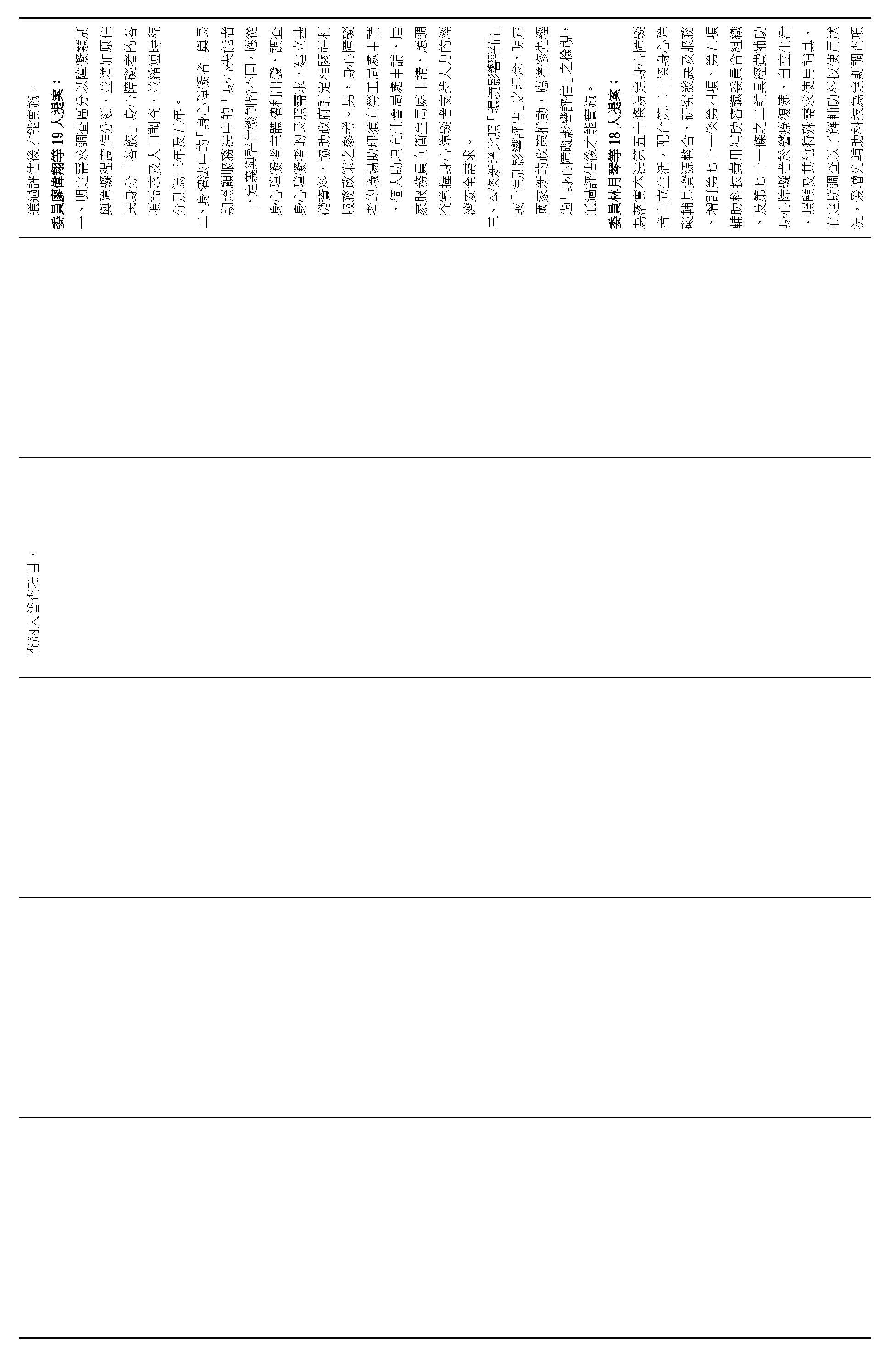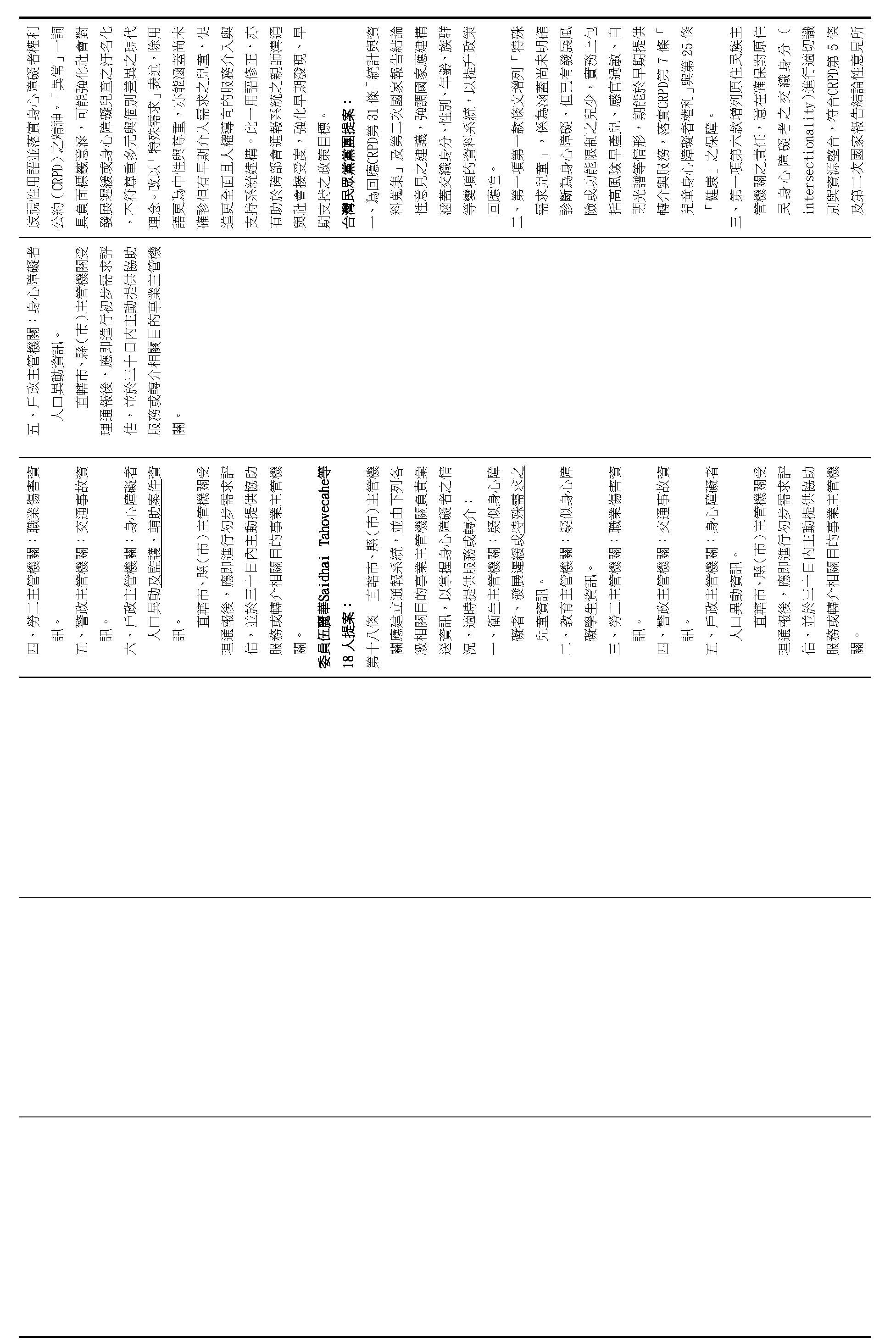 第一個修法是把身心障礙者權益推動小組正式寫到法律裡面,給它清楚的定位及應有的權責。本席的版本規定,障礙者代表最終計算起來至少要達到四分之一,這也呼應了過去衛福部所期待的。不過委員會裡也有同仁提出更高比例的方案,我認為這是一個非常好的現象,代表國會正在往更進步、更符合CRPD精神的方向討論。未來逐條審查、整合版本時,本席也願意讓障礙者更能真正上桌的方案納進來討論,因為這部法律不只有中央要設,地方同樣也要遵守。既然財劃法都已經讓地方擁有更多的預算、更多的資源,那麼我們更同步賦予相同的權責,讓制度不只是框架,而是更能夠運作。