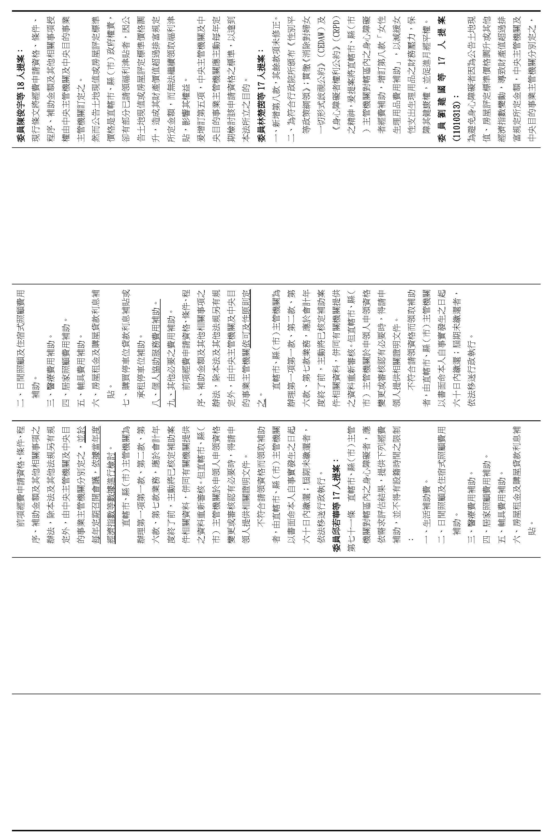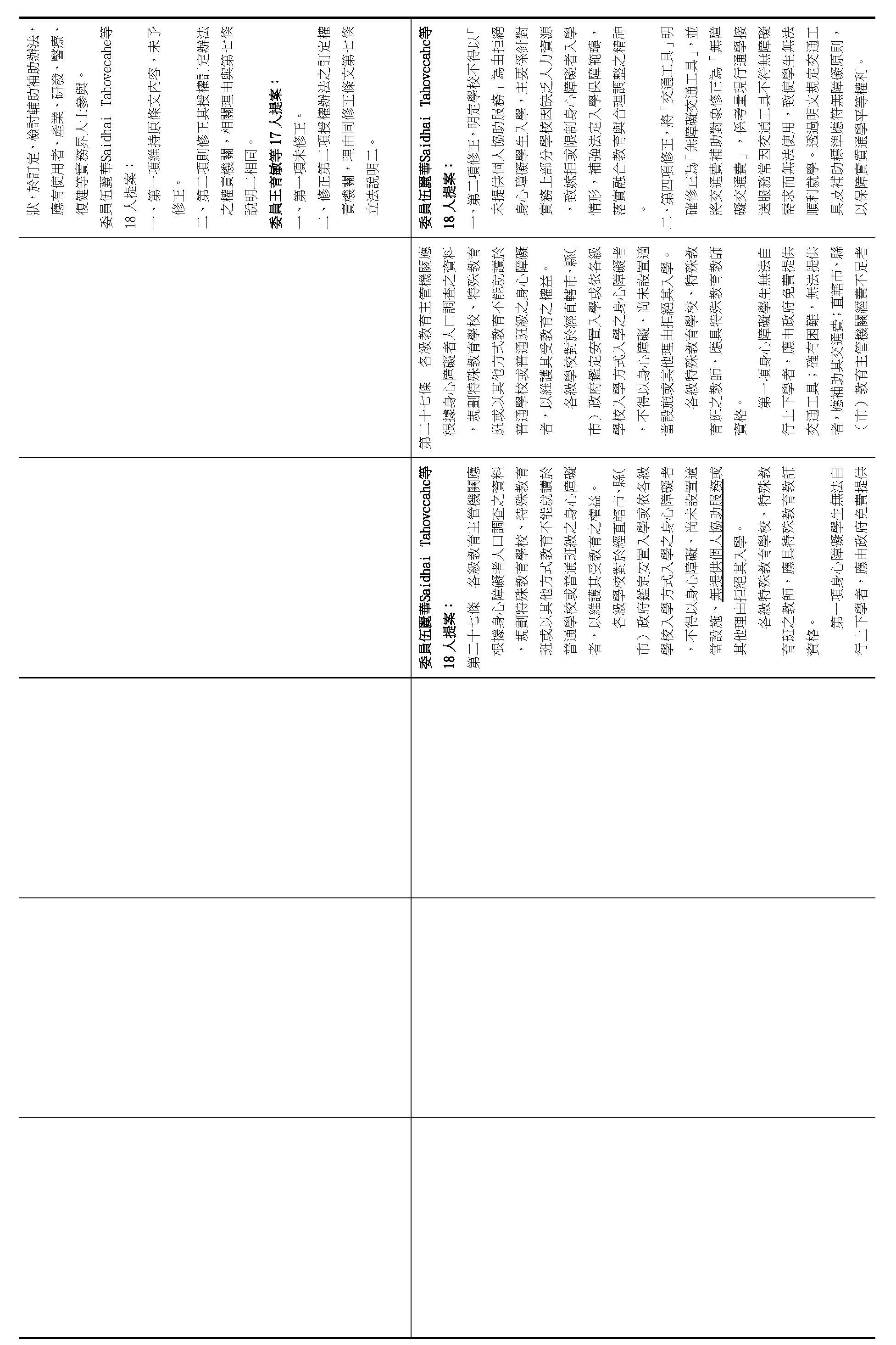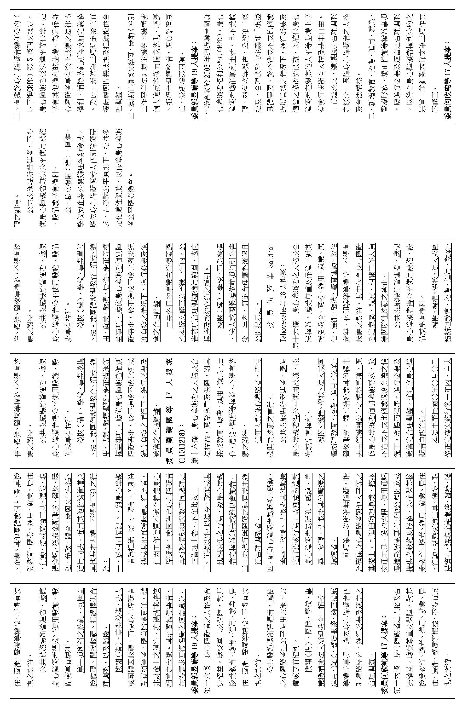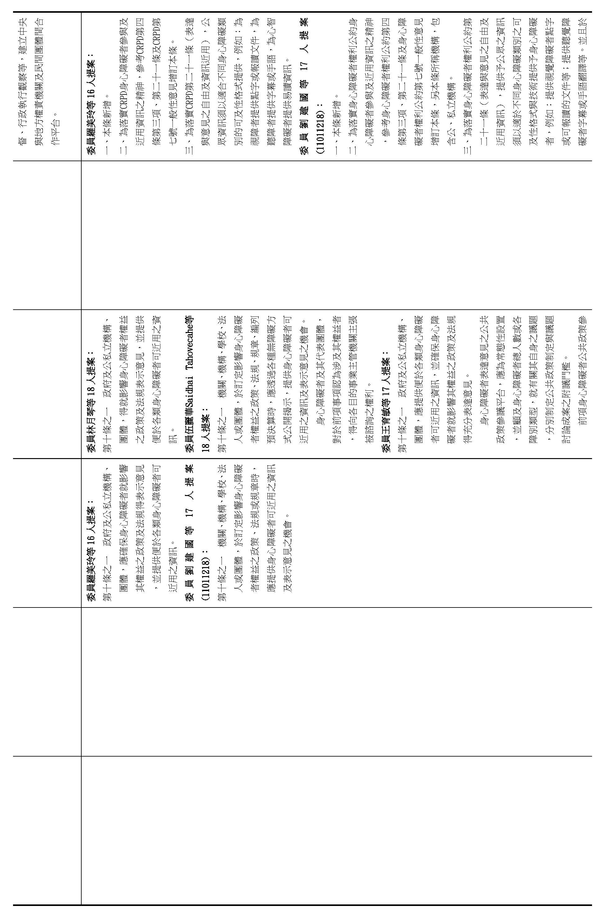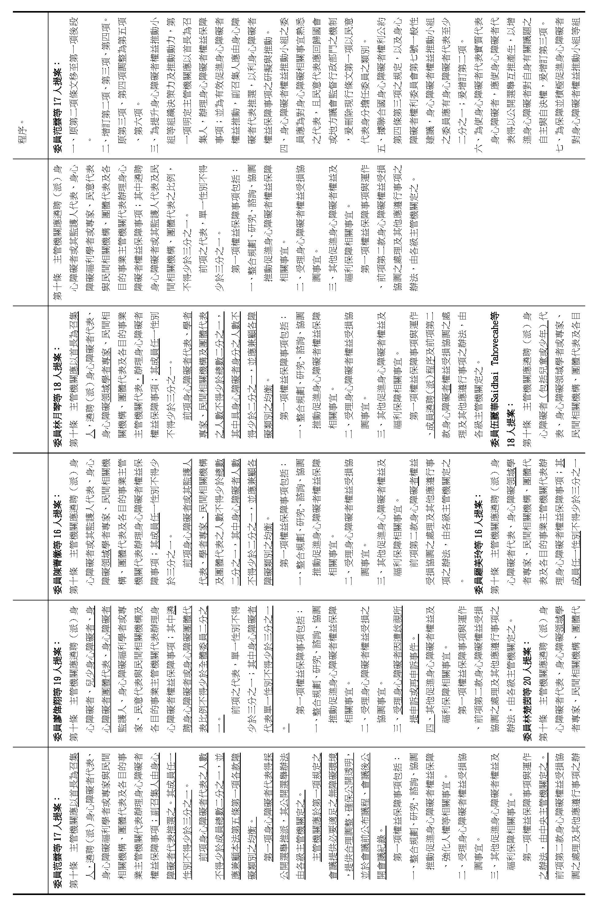 至於有關委員提案的版本,以下謹就共通性的意見做簡要的說明。首先是有關林月琴委員等18人、伍麗華Saidhai Tahovecahe委員等18人、王育敏委員等17人以及台灣民眾黨黨團提案,增訂身心障礙者代表組成比例與受理申訴案件部分。為了支持身心障礙者能夠積極的參與各項決策過程,本部支持提高參與各項身障者委員會的人數比例,至於對於受損協調機制的部分,可以透過行政調查及裁處,本部認為無須再訂定申訴制度。