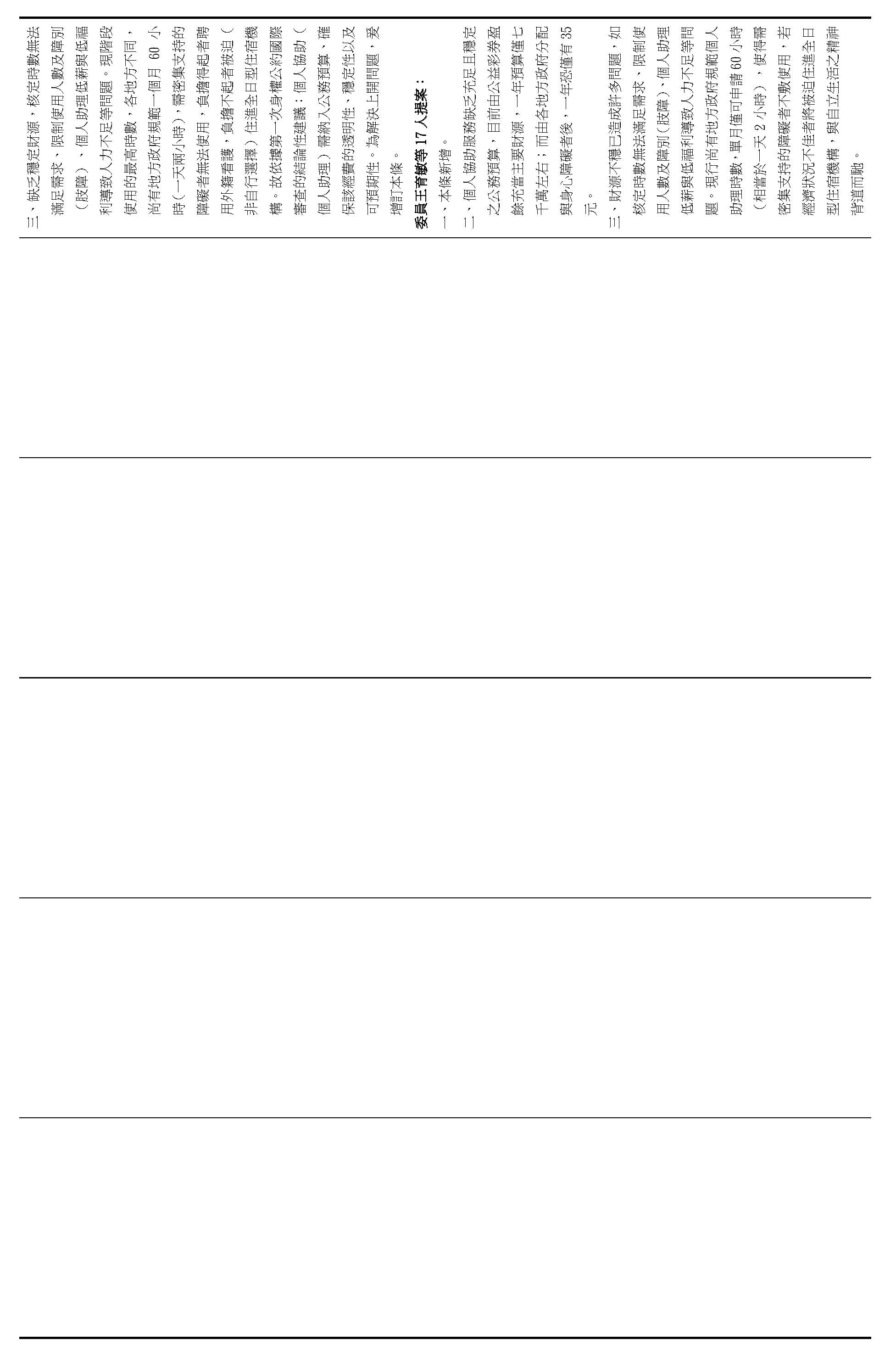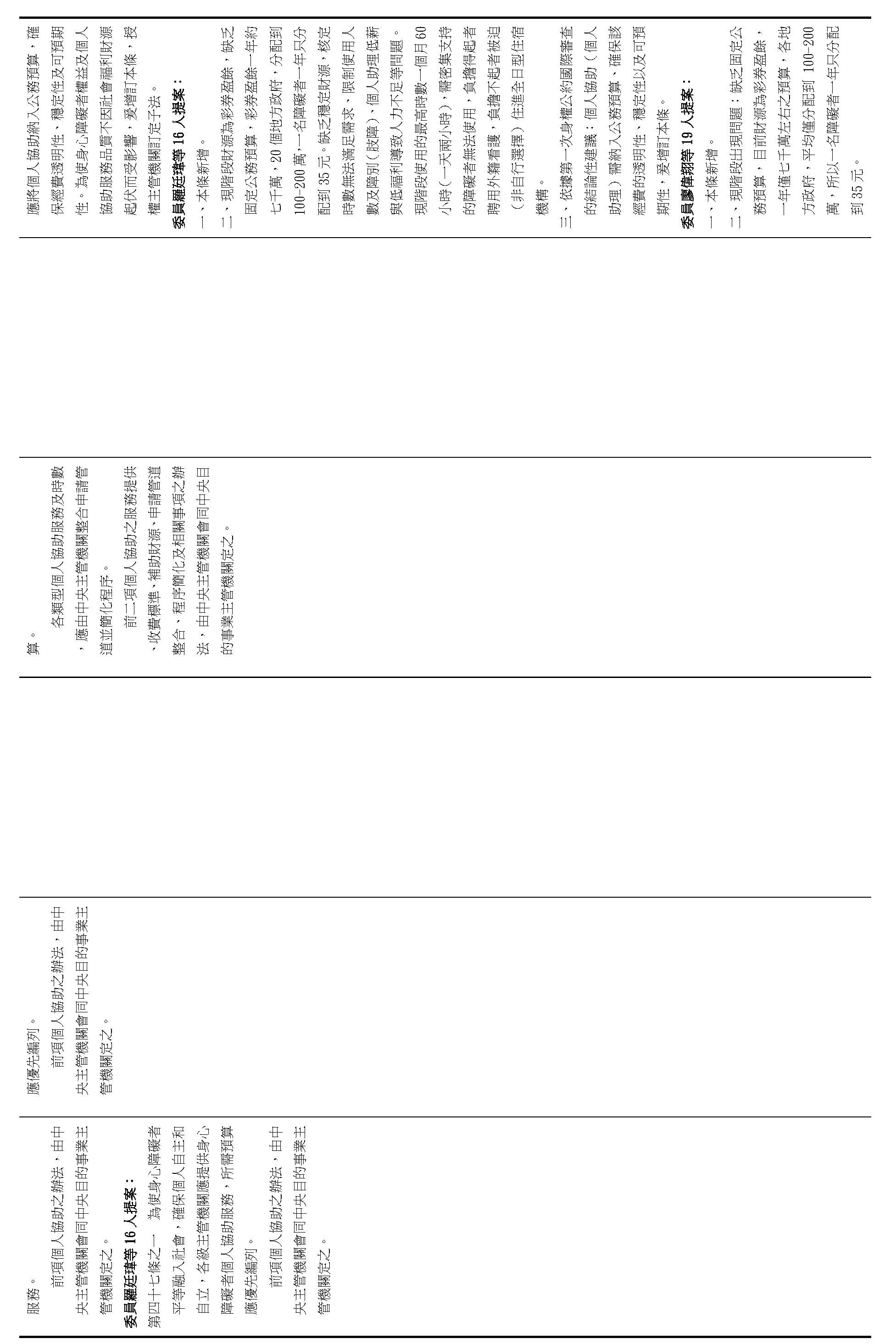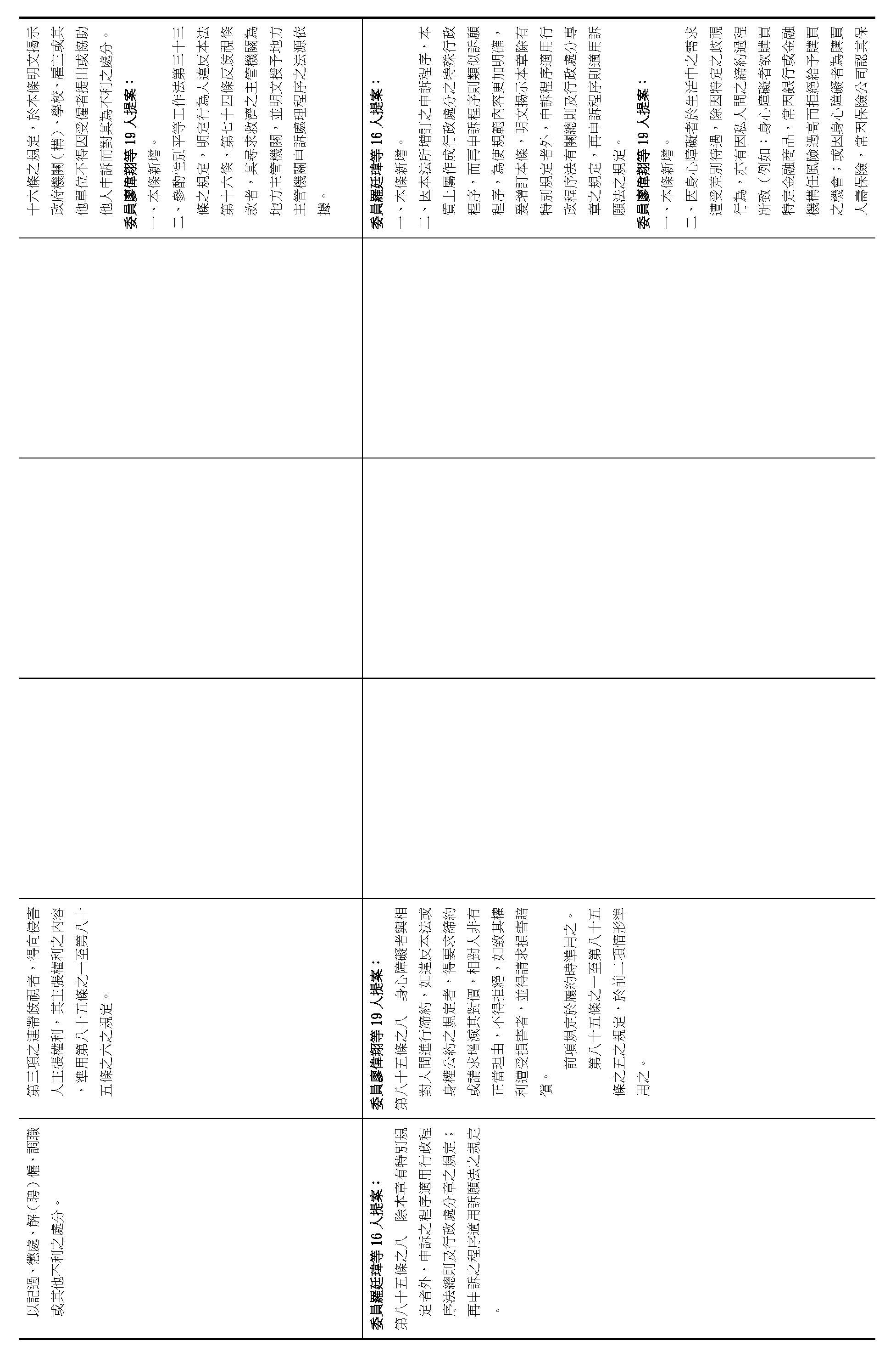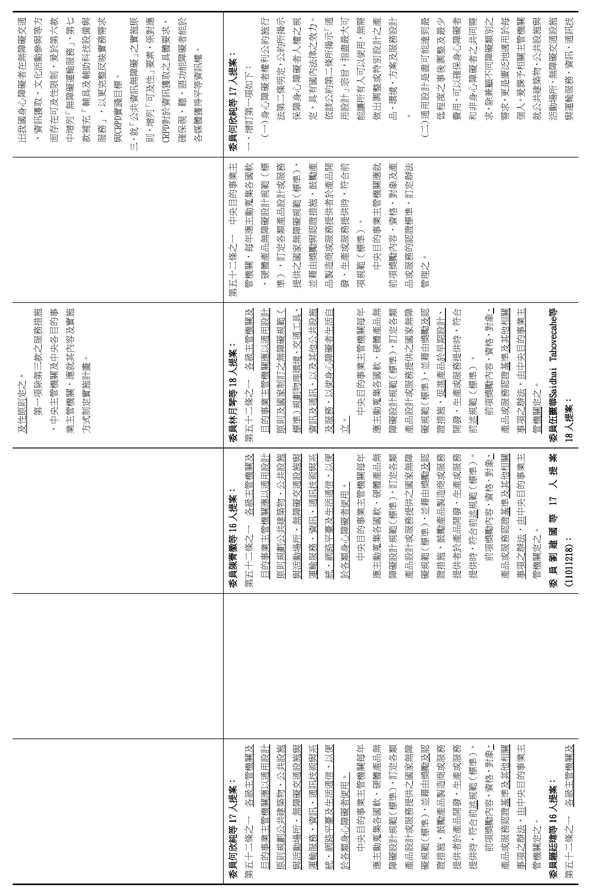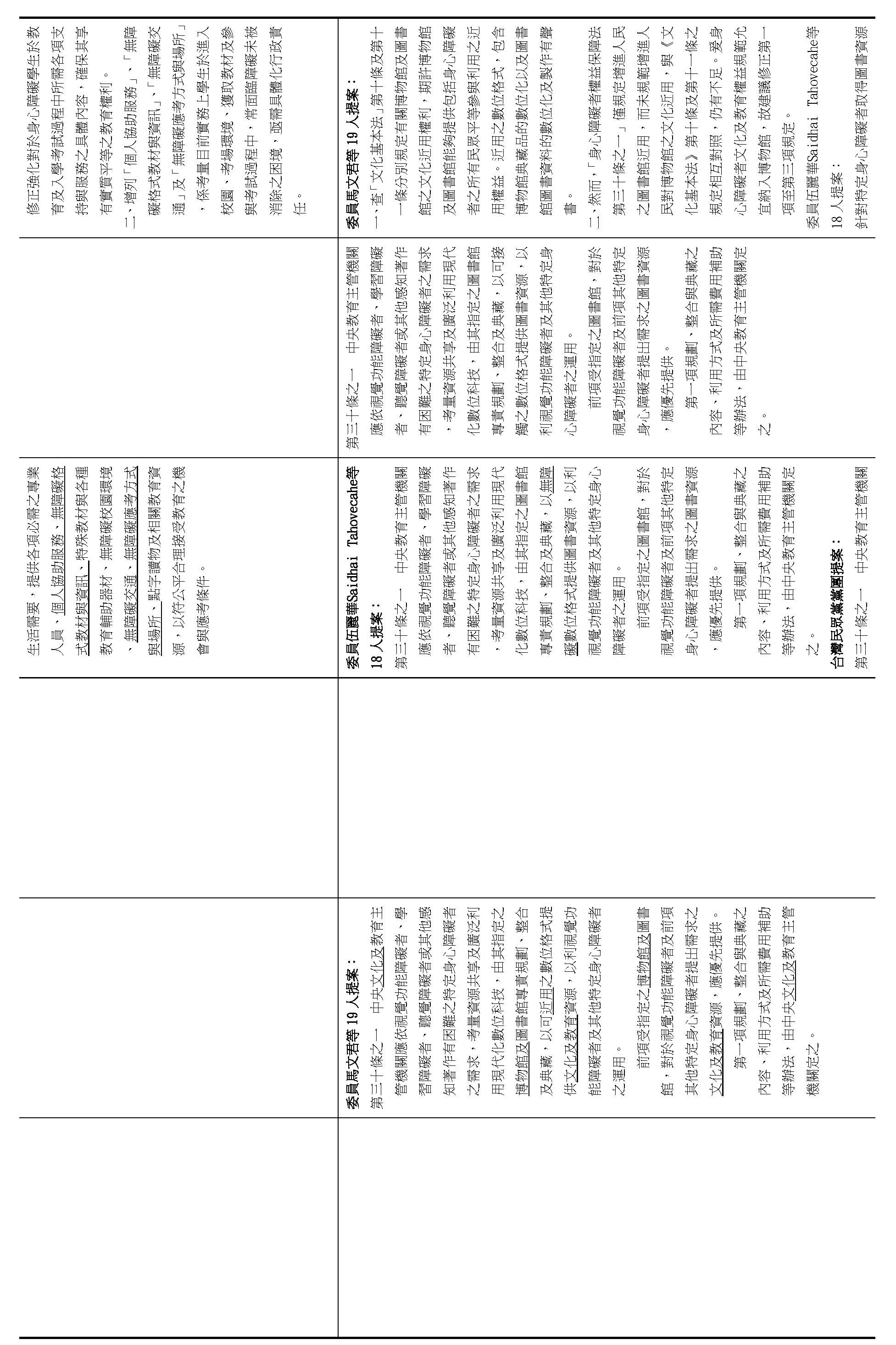 至於有關委員提案的版本,以下謹就共通性的意見做簡要的說明。首先是有關林月琴委員等18人、伍麗華Saidhai Tahovecahe委員等18人、王育敏委員等17人以及台灣民眾黨黨團提案,增訂身心障礙者代表組成比例與受理申訴案件部分。為了支持身心障礙者能夠積極的參與各項決策過程,本部支持提高參與各項身障者委員會的人數比例,至於對於受損協調機制的部分,可以透過行政調查及裁處,本部認為無須再訂定申訴制度。