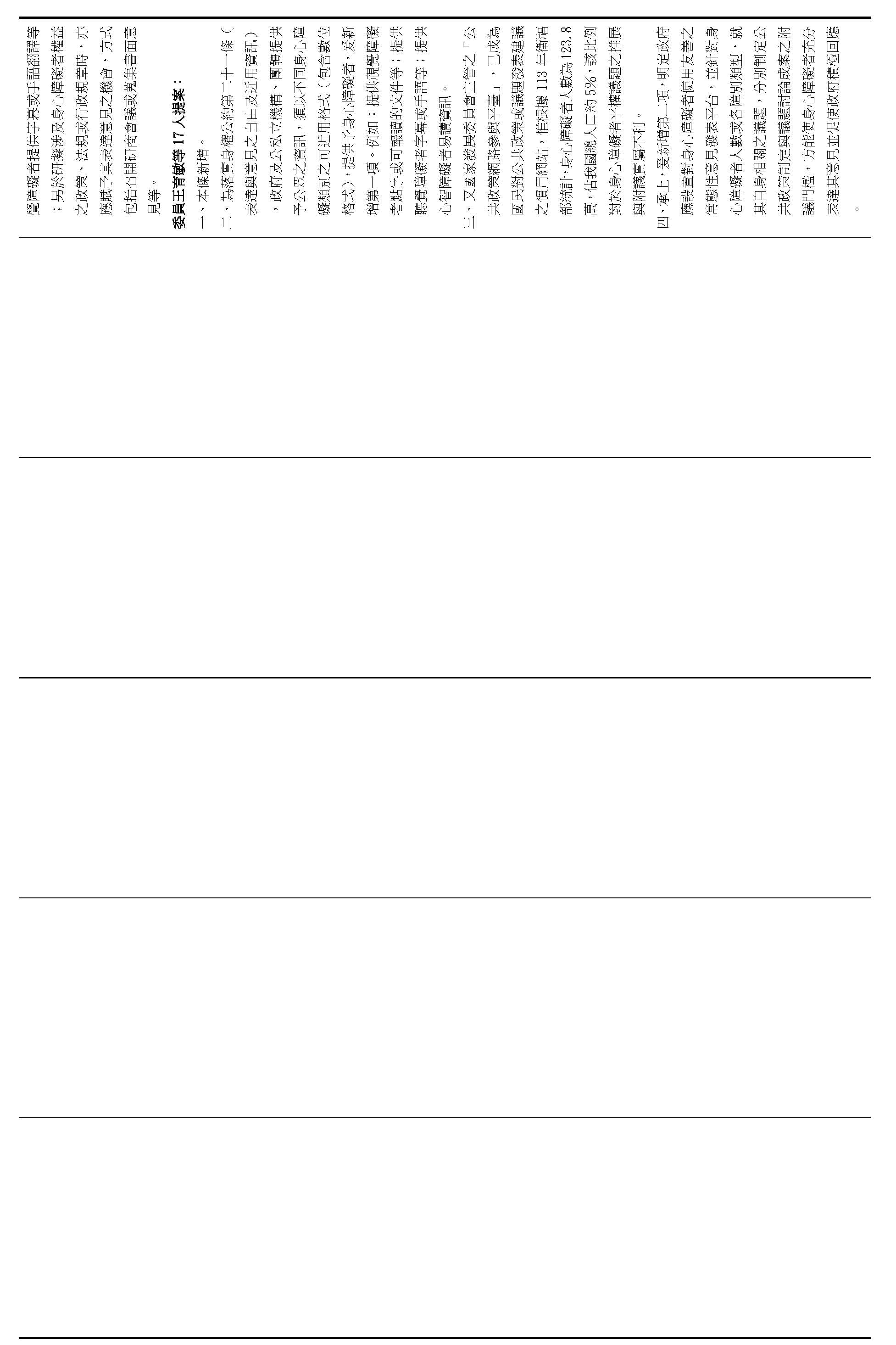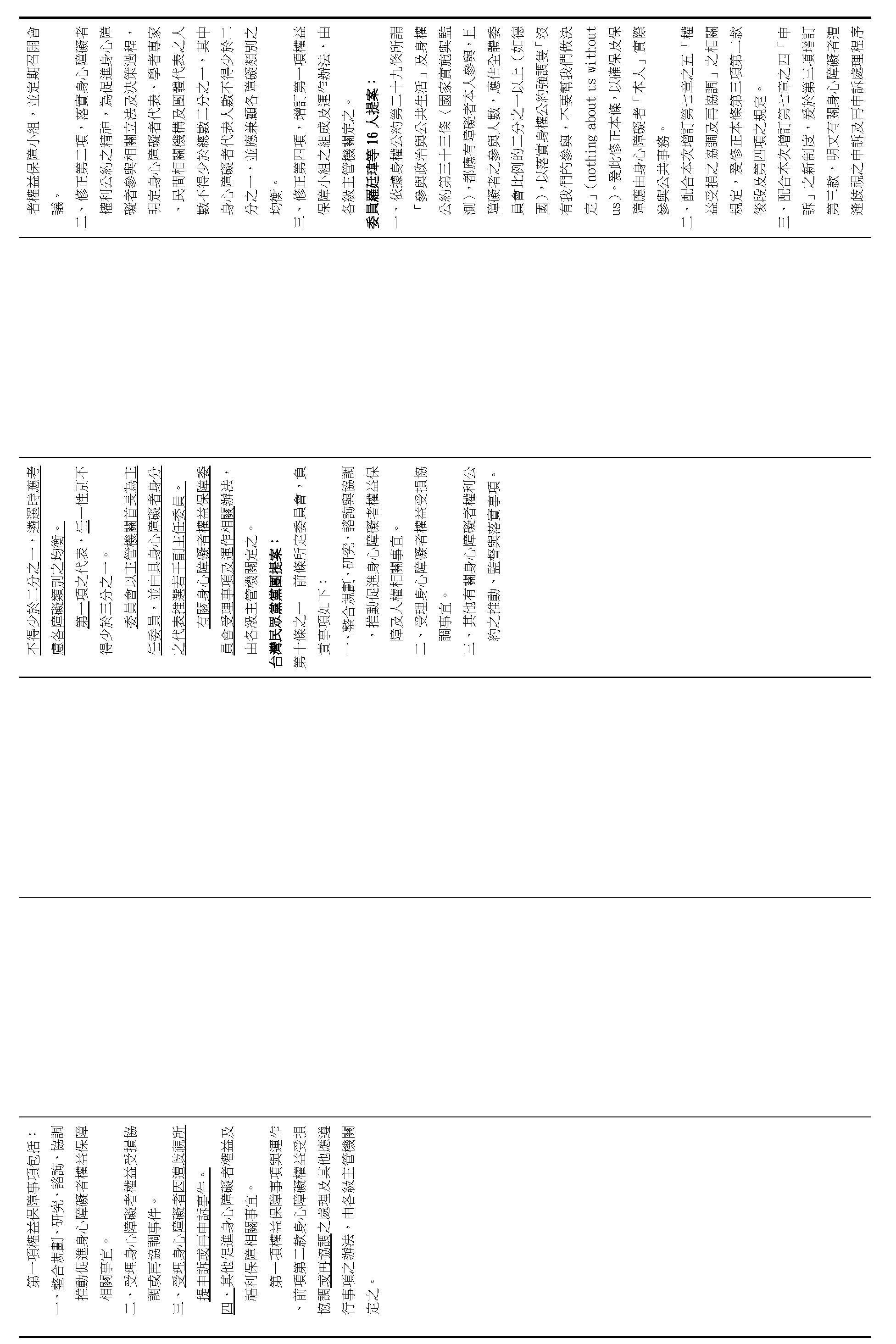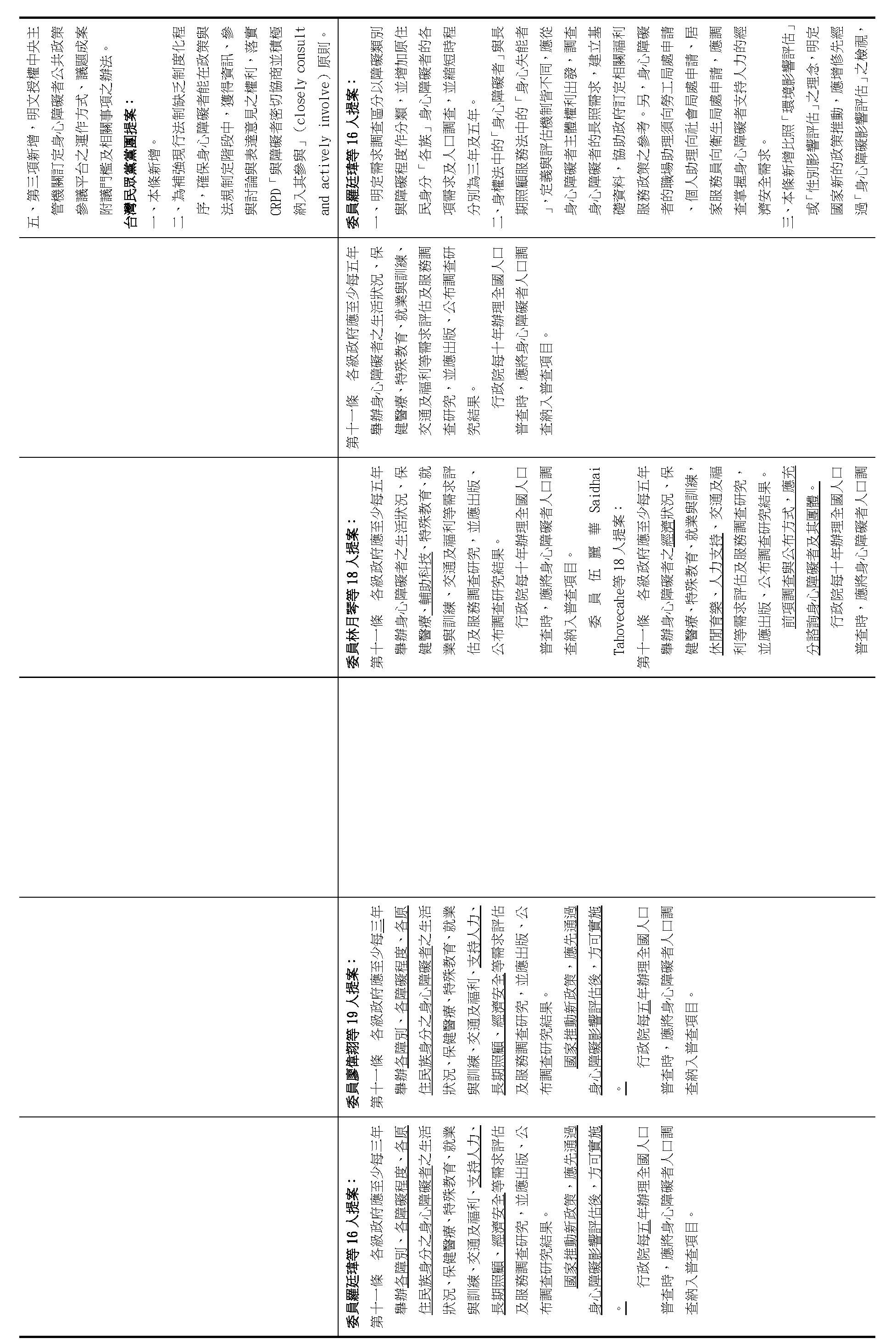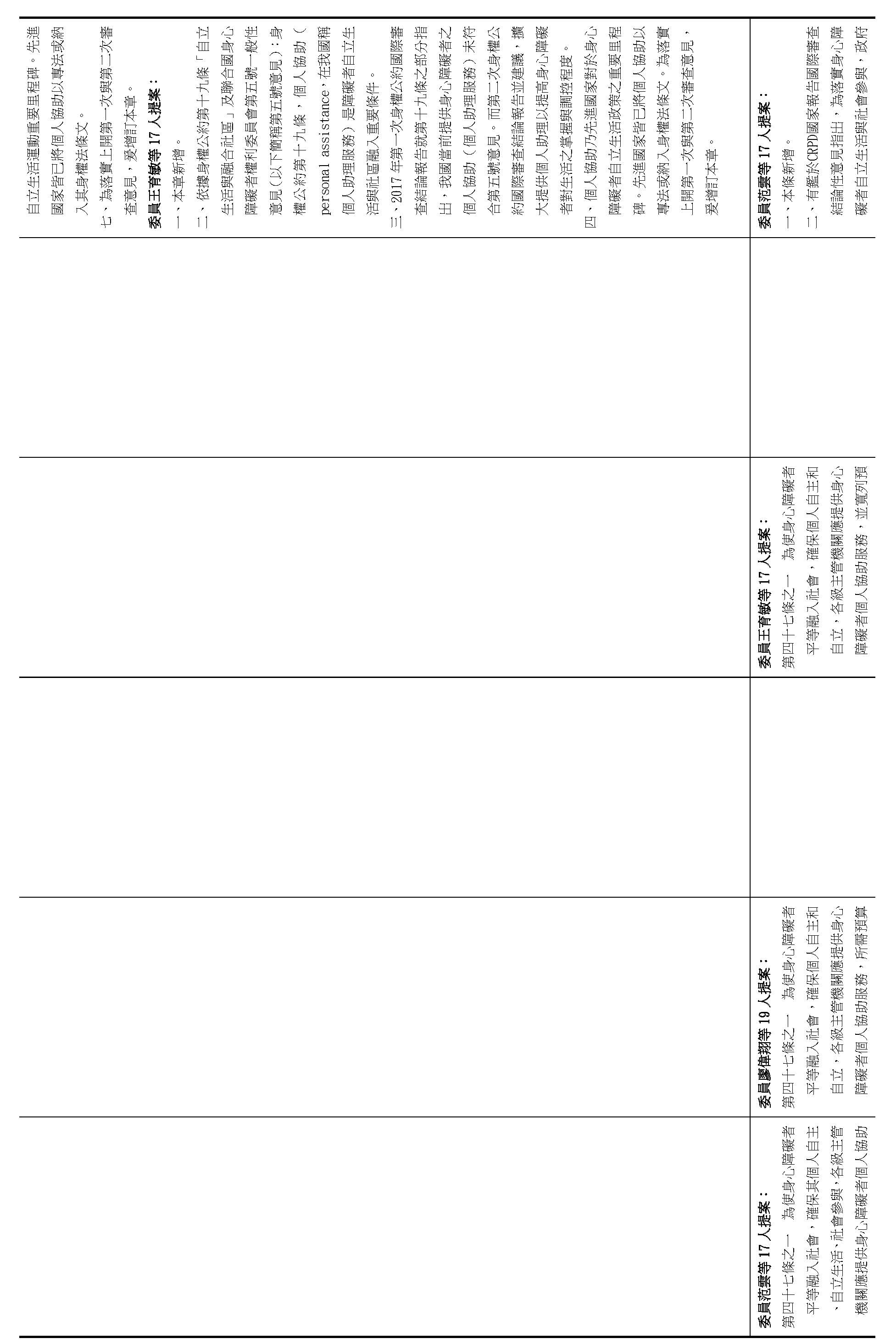 陳委員昭姿:主席、各位同事、各位媒體朋友。這十多年來,身障者的權益一次又一次的被忽視,我們看到的是無障礙問題在倒退、資訊越來越不好取得、個人助理的時間始終不足,甚至臺鐵的無障礙措施協助服務又開始出錯及延誤。我今天要負責任告訴大家,台灣民眾黨所提出來的身心障礙者權益保障法修正草案是按照身障者的訴求、CRPD的精神以及參考其他國家的作法,一條一條把它寫到我們的法案裡。