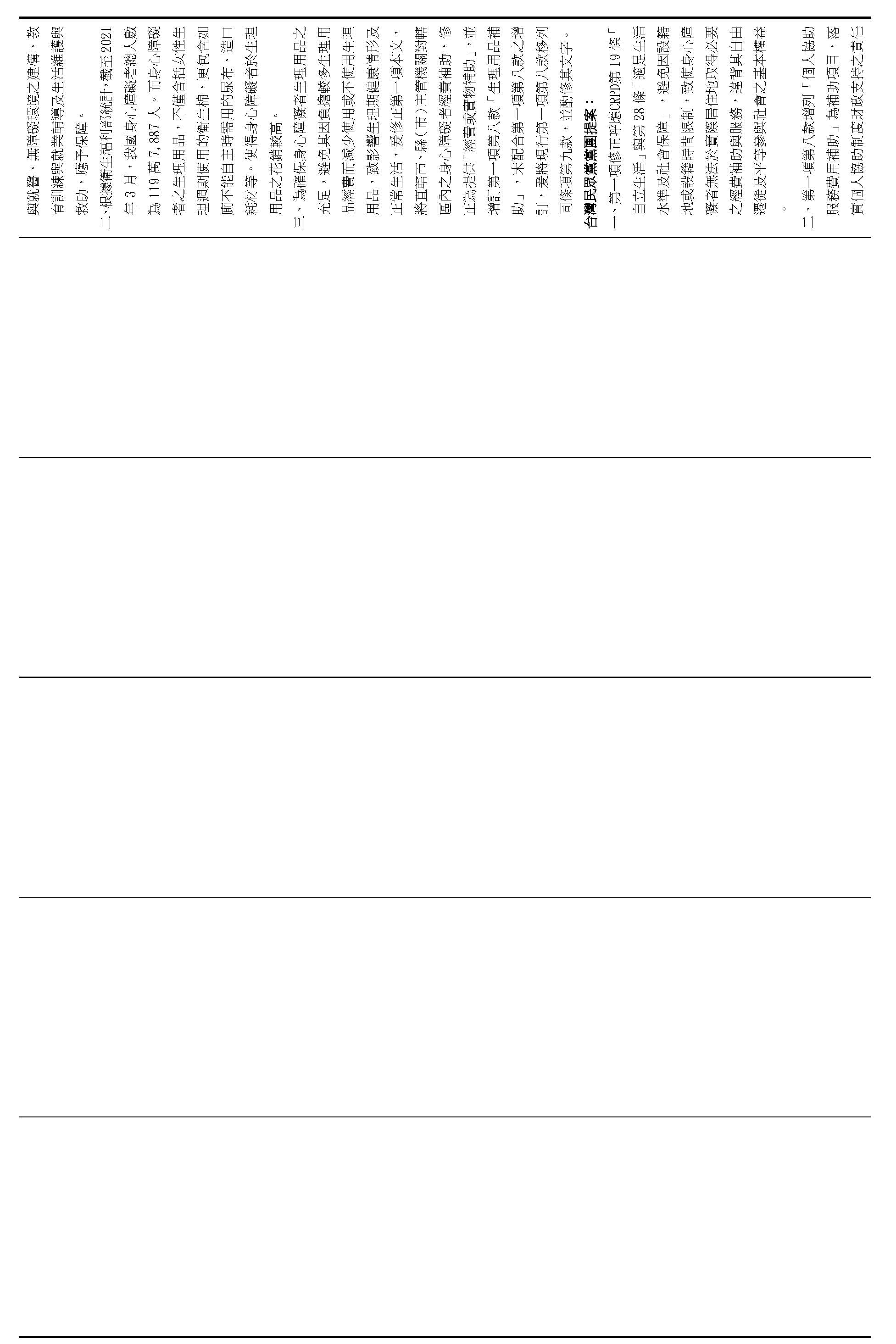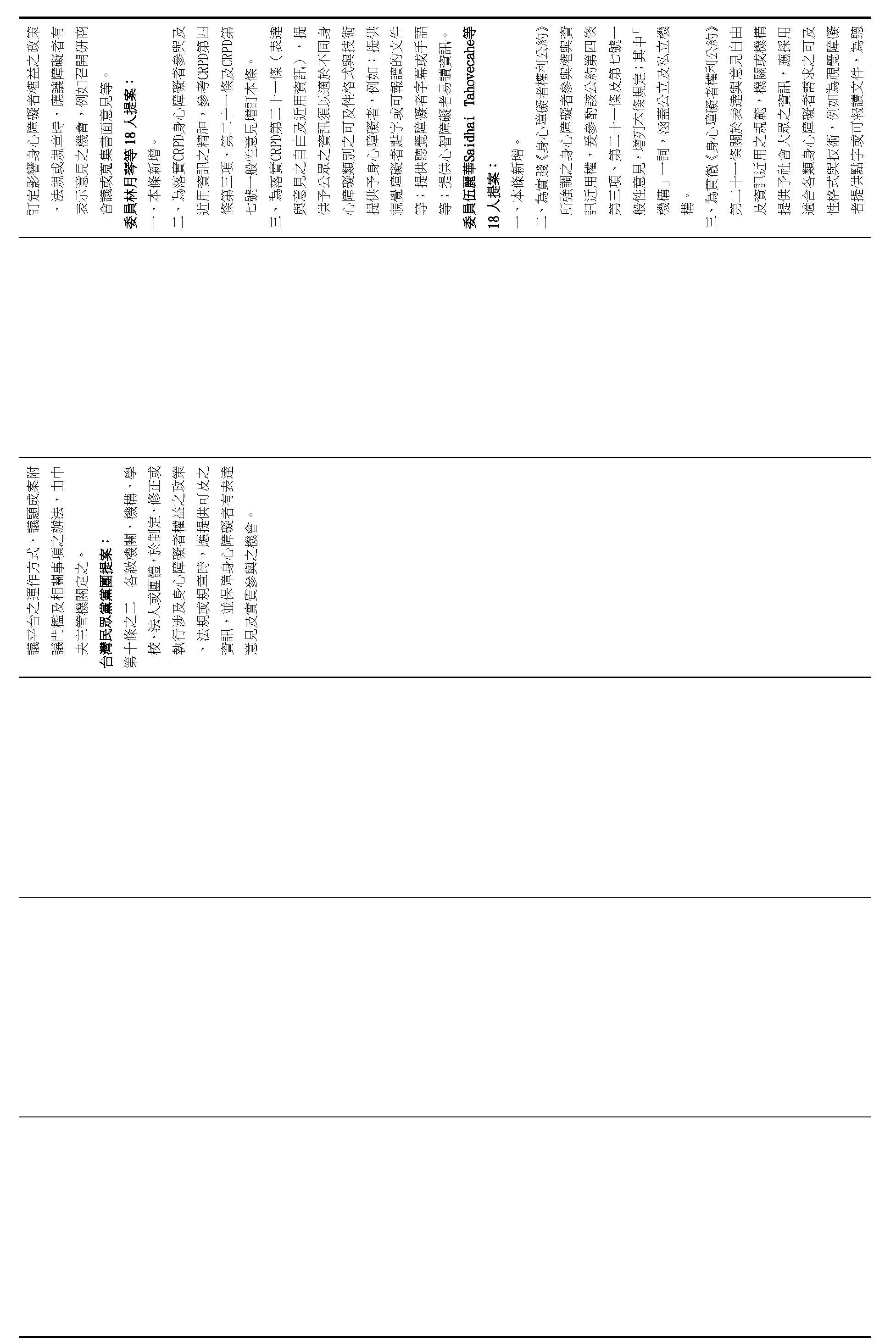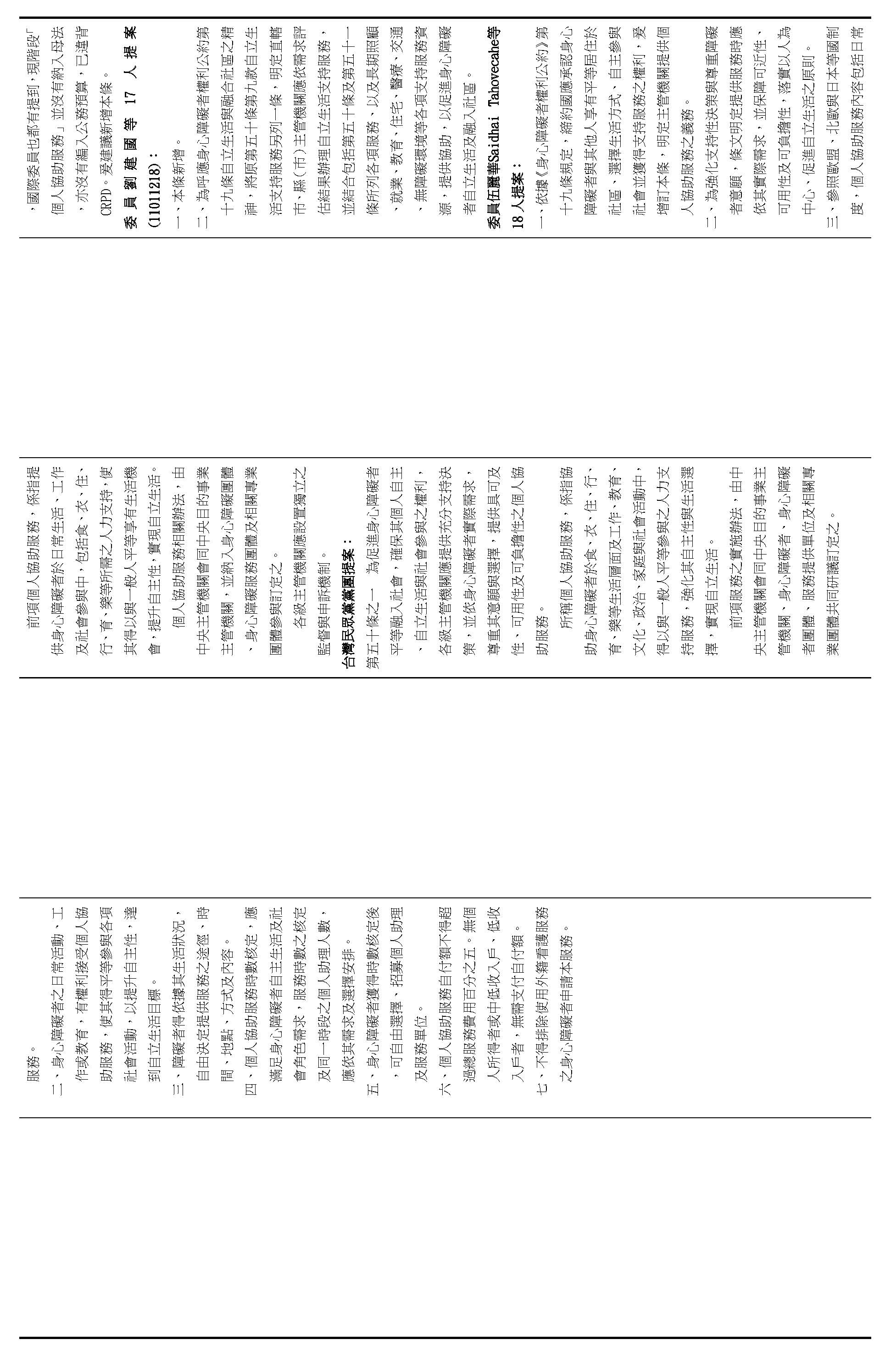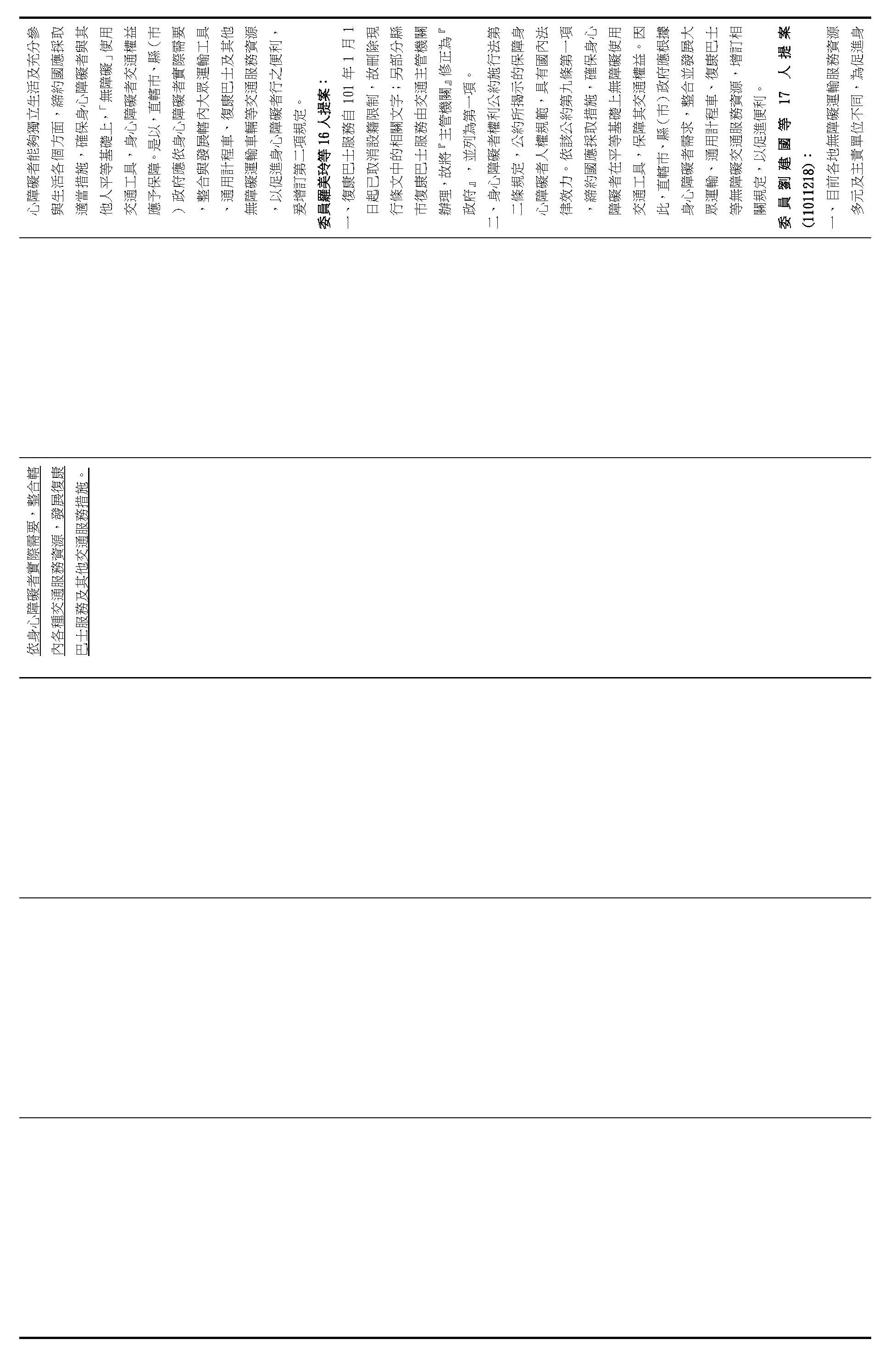 陳委員昭姿:主席、各位同事、各位媒體朋友。這十多年來,身障者的權益一次又一次的被忽視,我們看到的是無障礙問題在倒退、資訊越來越不好取得、個人助理的時間始終不足,甚至臺鐵的無障礙措施協助服務又開始出錯及延誤。我今天要負責任告訴大家,台灣民眾黨所提出來的身心障礙者權益保障法修正草案是按照身障者的訴求、CRPD的精神以及參考其他國家的作法,一條一條把它寫到我們的法案裡。