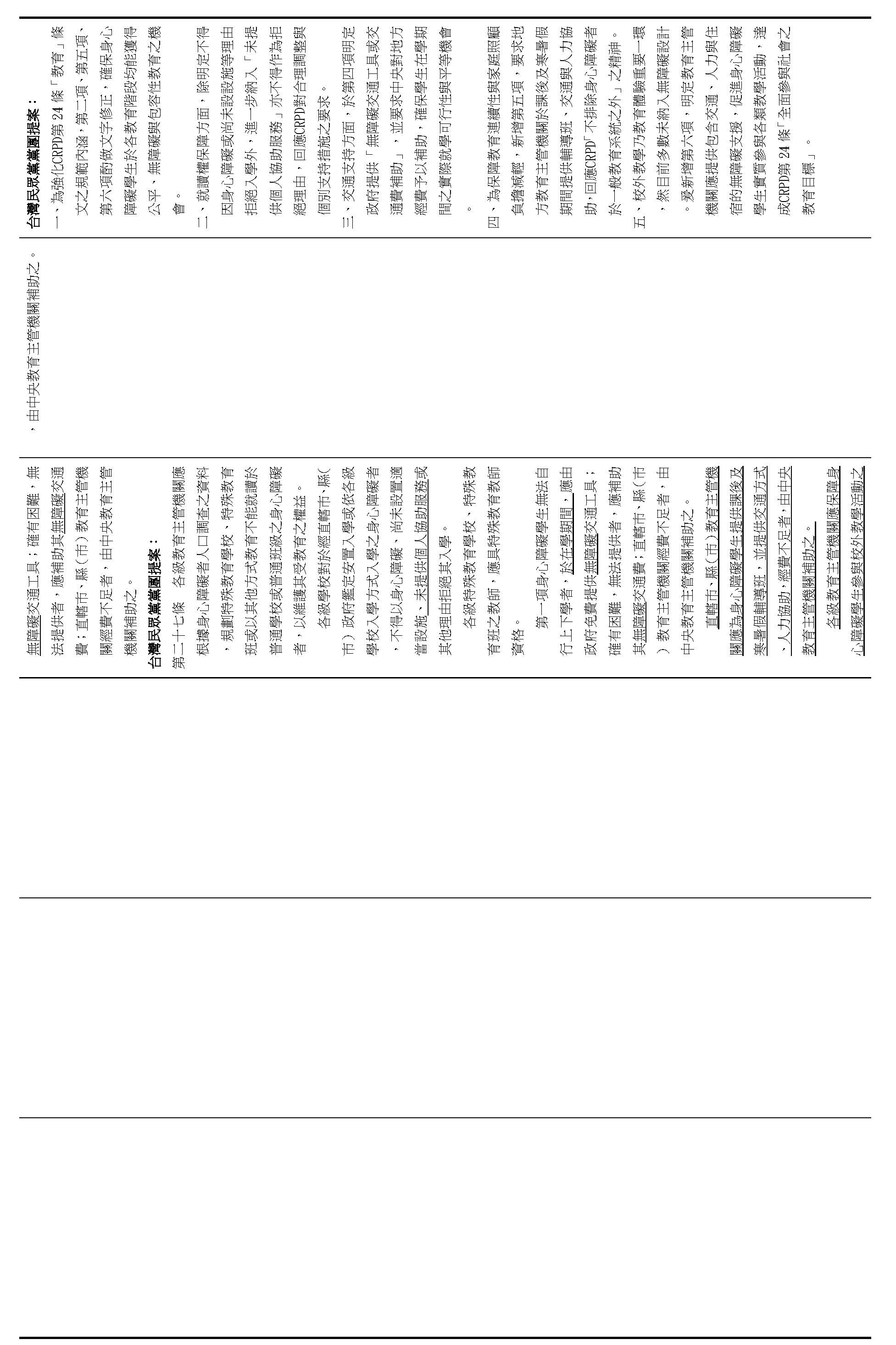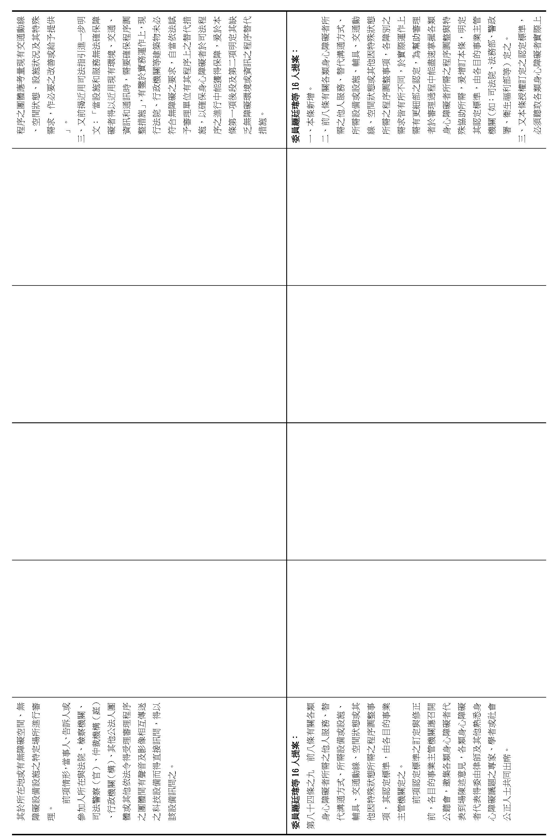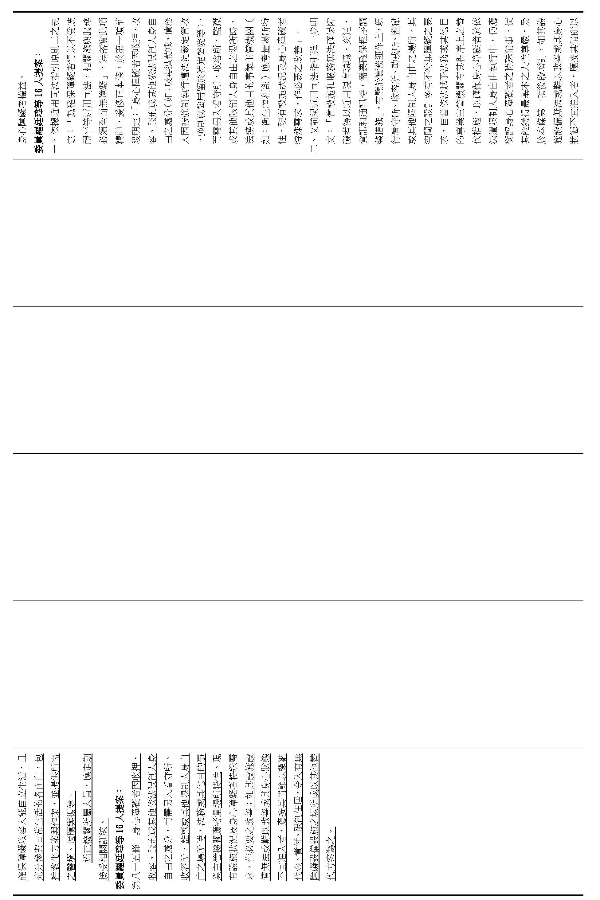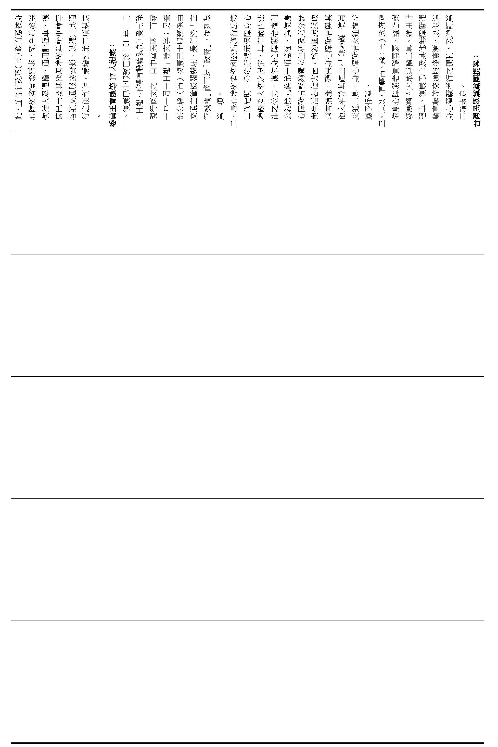 陳委員昭姿:主席、各位同事、各位媒體朋友。這十多年來,身障者的權益一次又一次的被忽視,我們看到的是無障礙問題在倒退、資訊越來越不好取得、個人助理的時間始終不足,甚至臺鐵的無障礙措施協助服務又開始出錯及延誤。我今天要負責任告訴大家,台灣民眾黨所提出來的身心障礙者權益保障法修正草案是按照身障者的訴求、CRPD的精神以及參考其他國家的作法,一條一條把它寫到我們的法案裡。