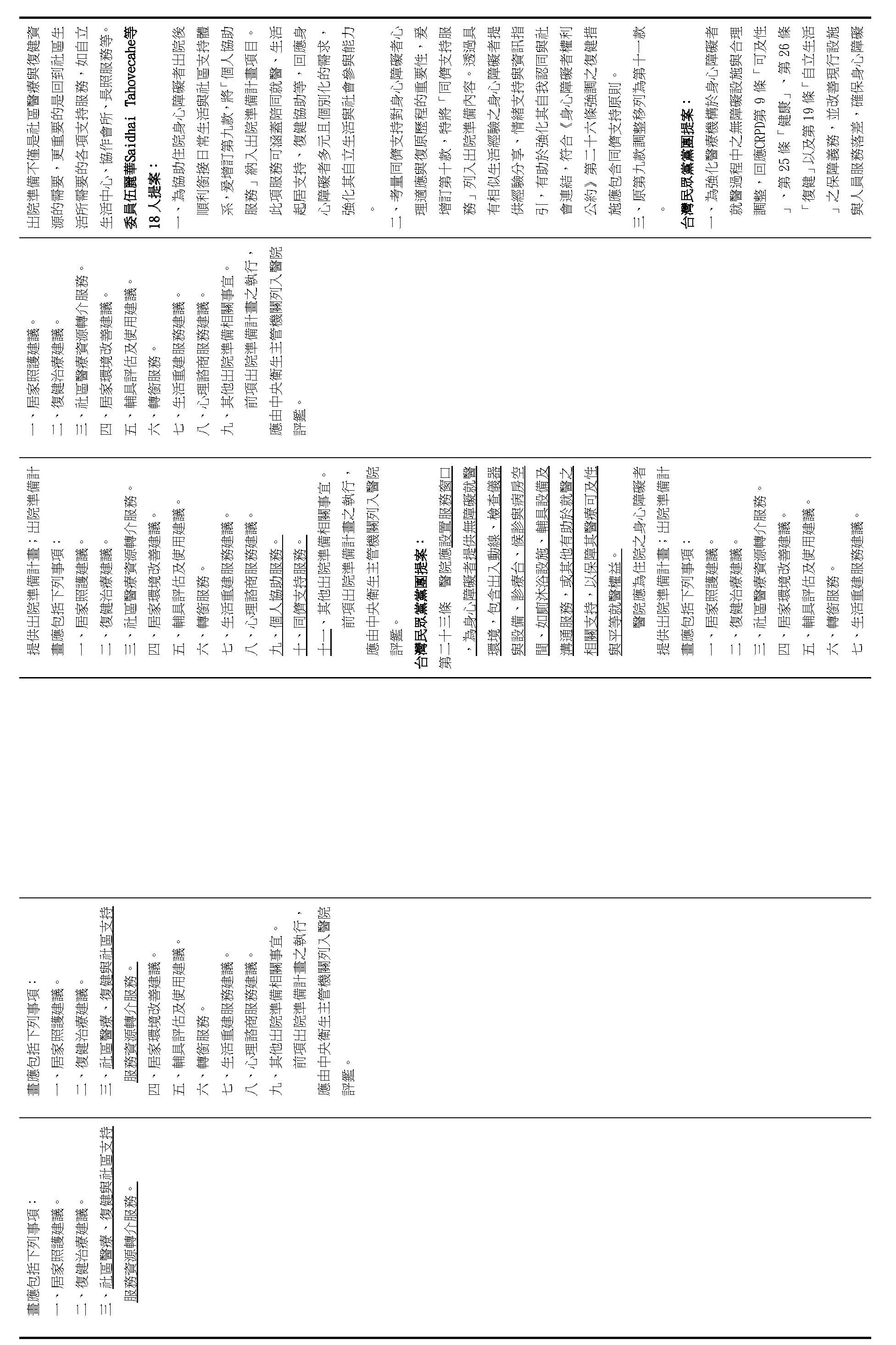 現行自立生活支持服務除為身心障礙者權益保障法第50條第9款明定之法定服務項目,並已於身心障礙者個人照顧服務辦法第9章(第67條至第71條)定明服務內涵、服務單位及專業人員組成等。