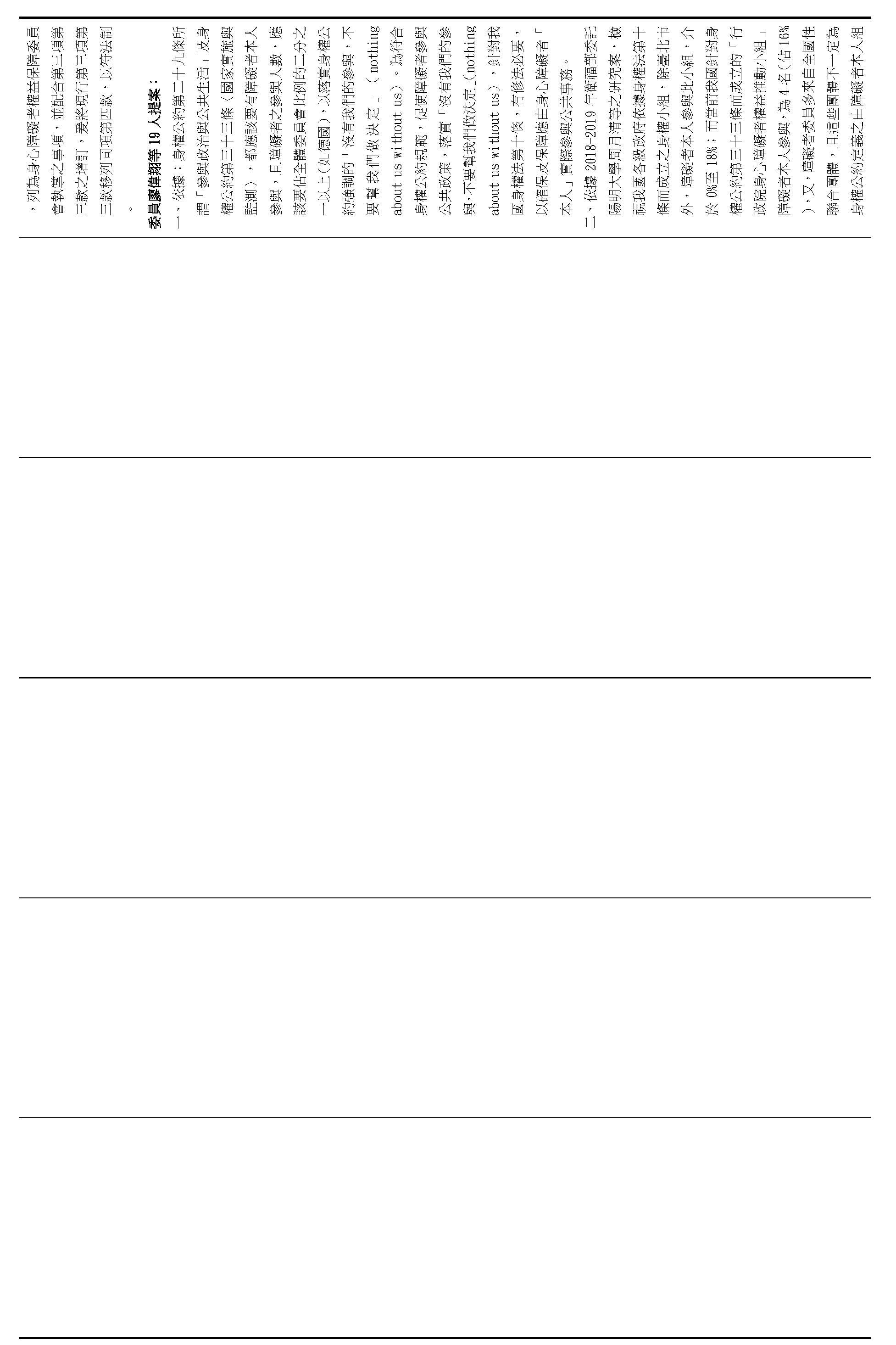 林委員楚茵:謝謝主席,各位立院同仁、出席的官員以及媒體朋友。本席今天有兩項提案,身心障礙者權益保障法第十條的修正案以及身心障礙者權益保障法第七十一條條文的修正案,核心都是相同的,就是希望讓身心障礙者不只是被服務,而是成為真正擁有權力、能夠參與決策的人。