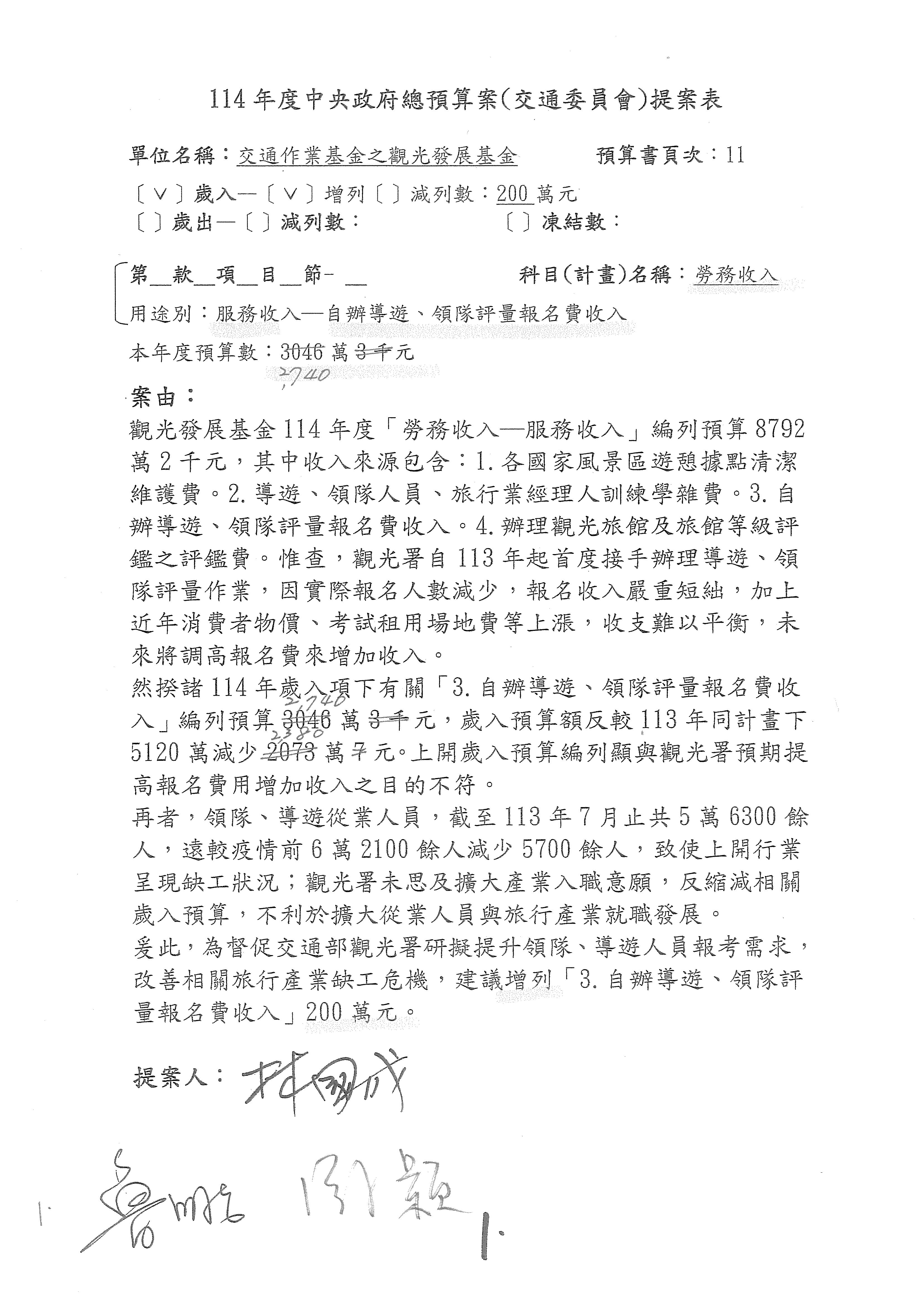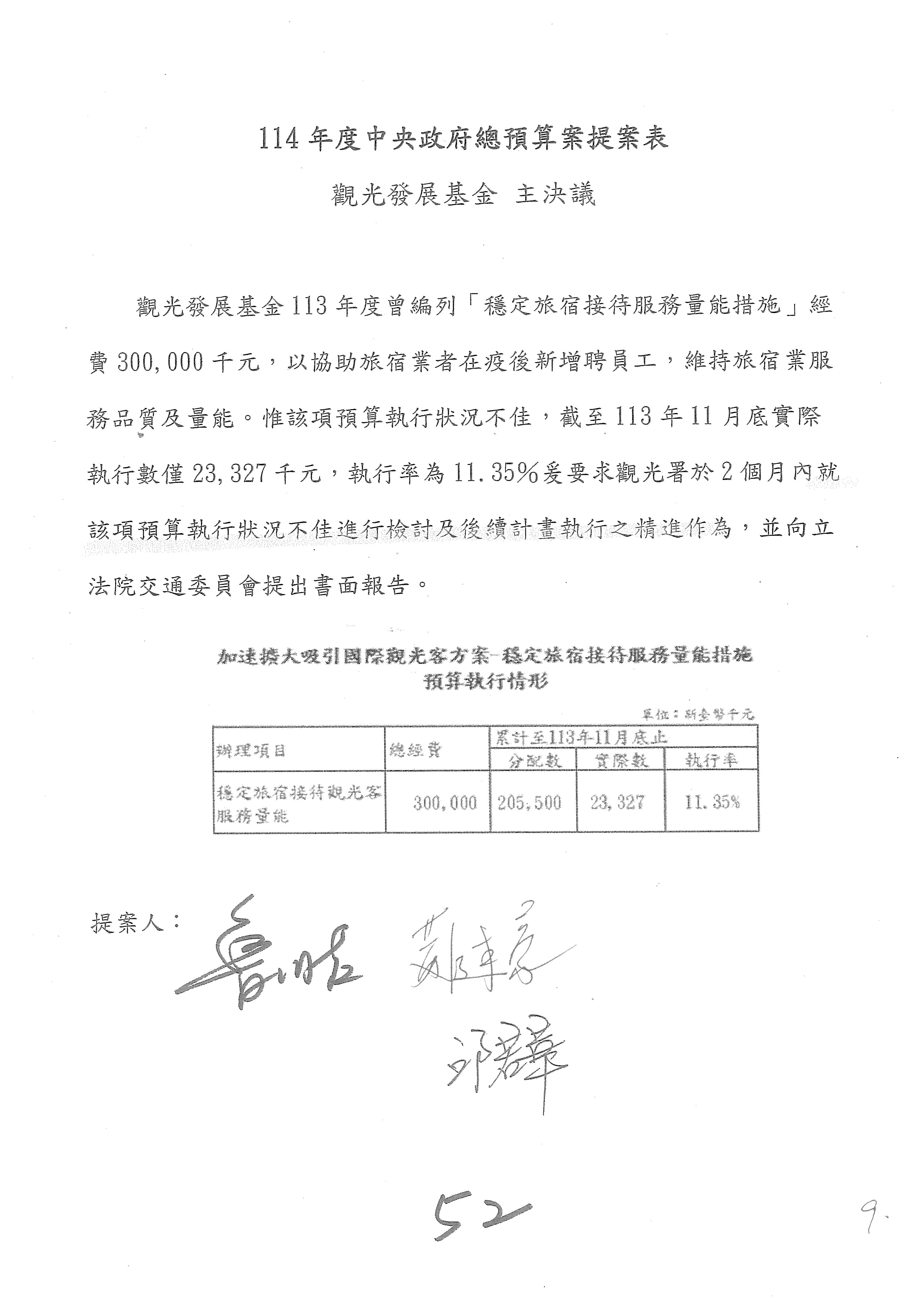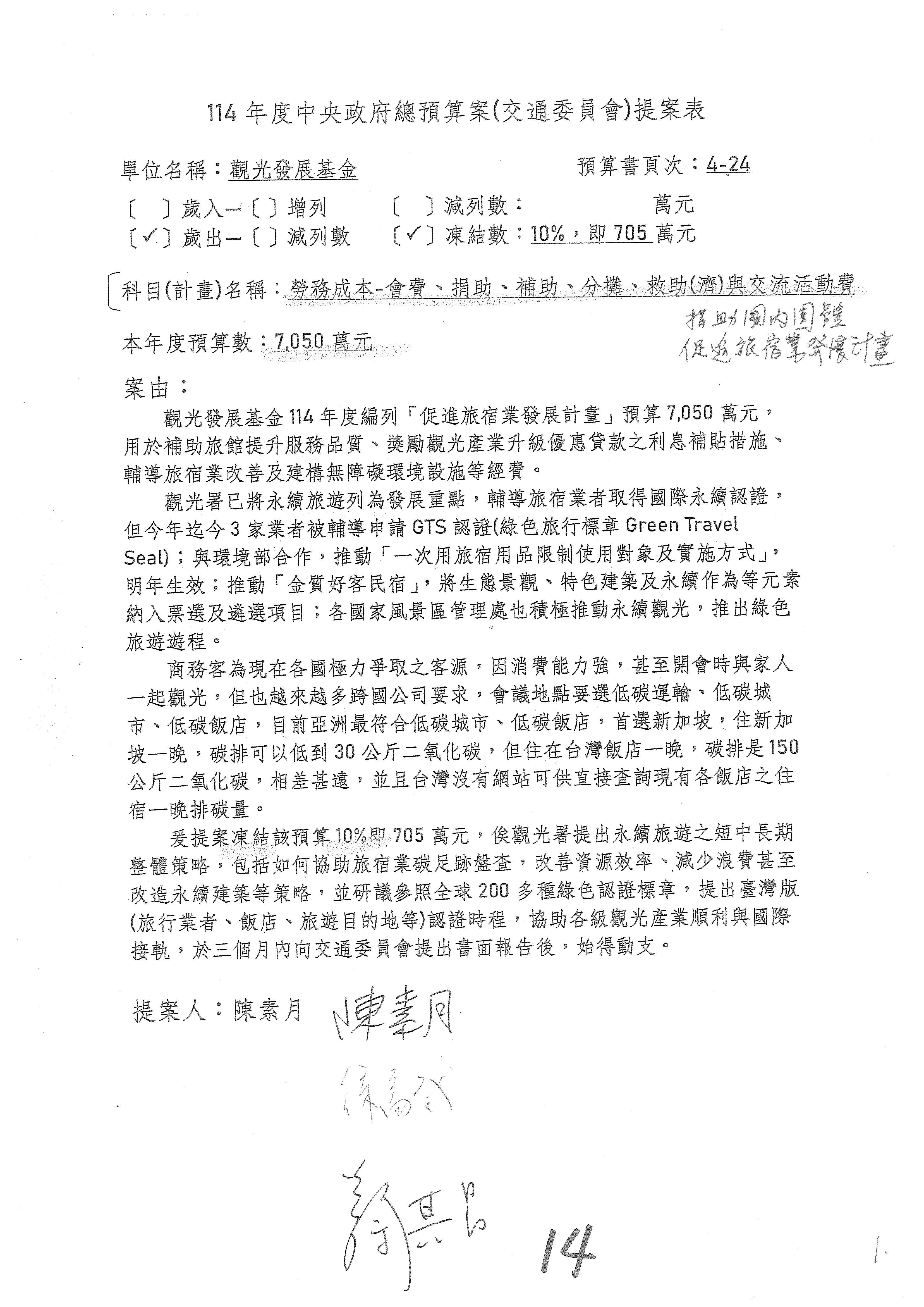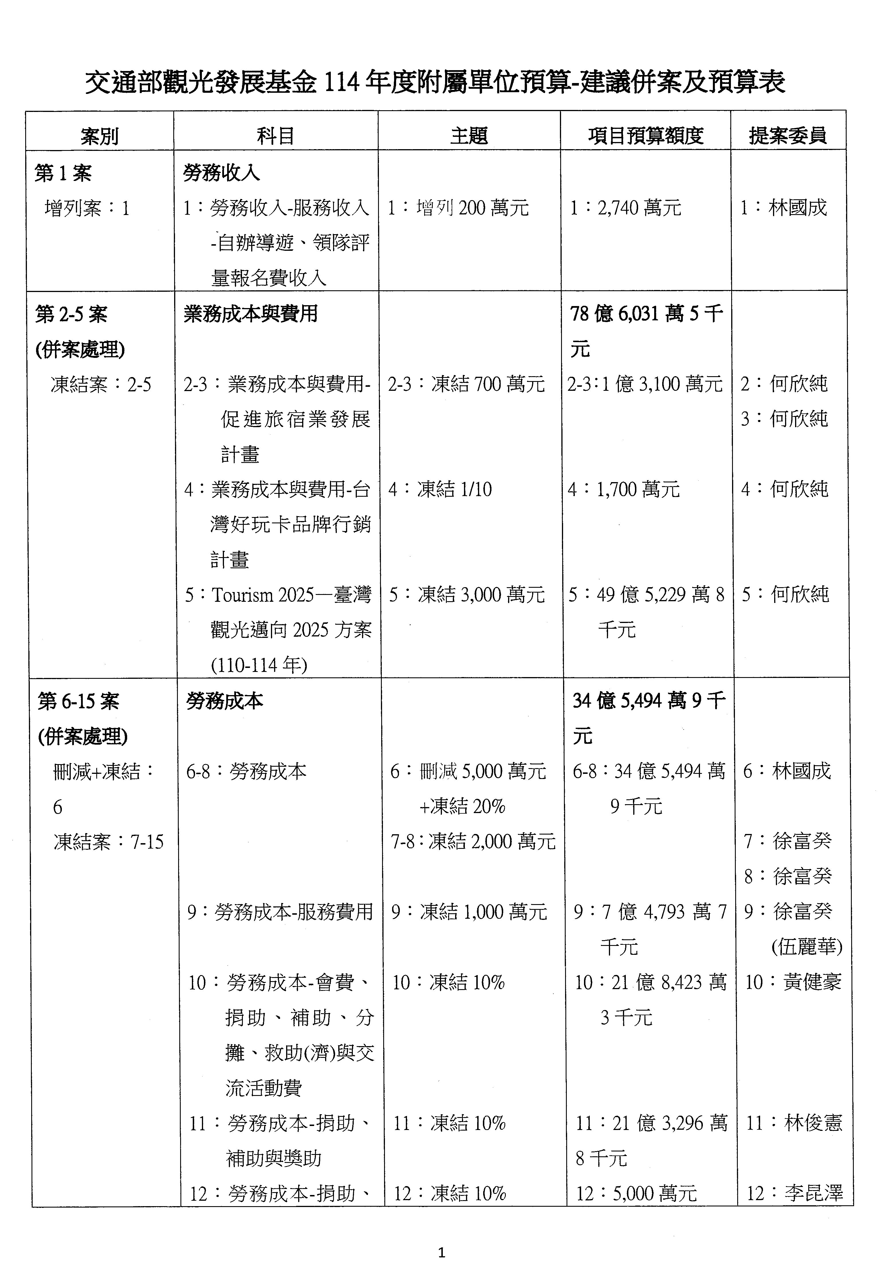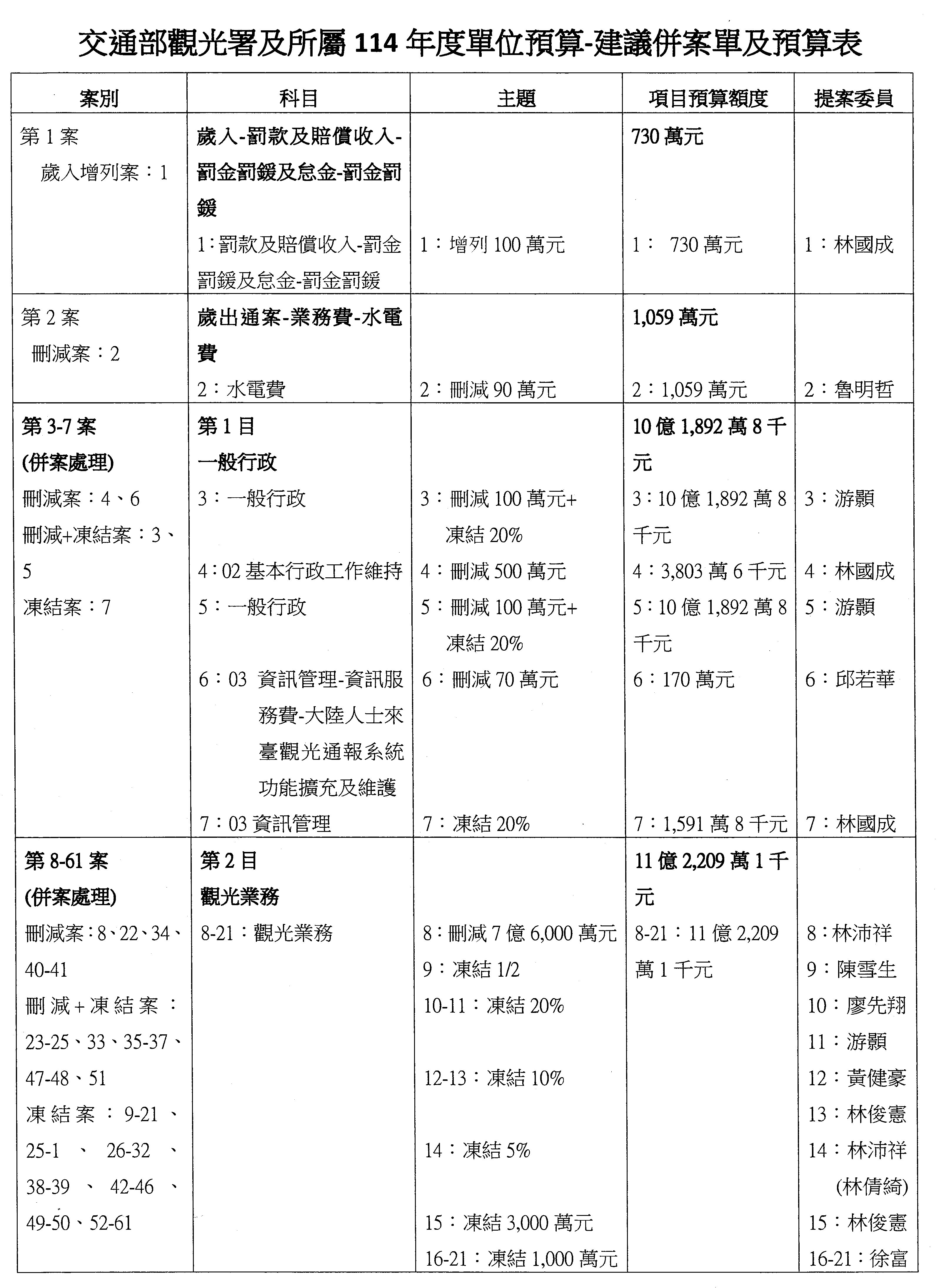接下來處理交通部觀光發展基金114年度附屬單位預算,請各位參照建議併案及預算表。開始處理第1案。第1案林國成委員已經改主決議,沒問題吧?