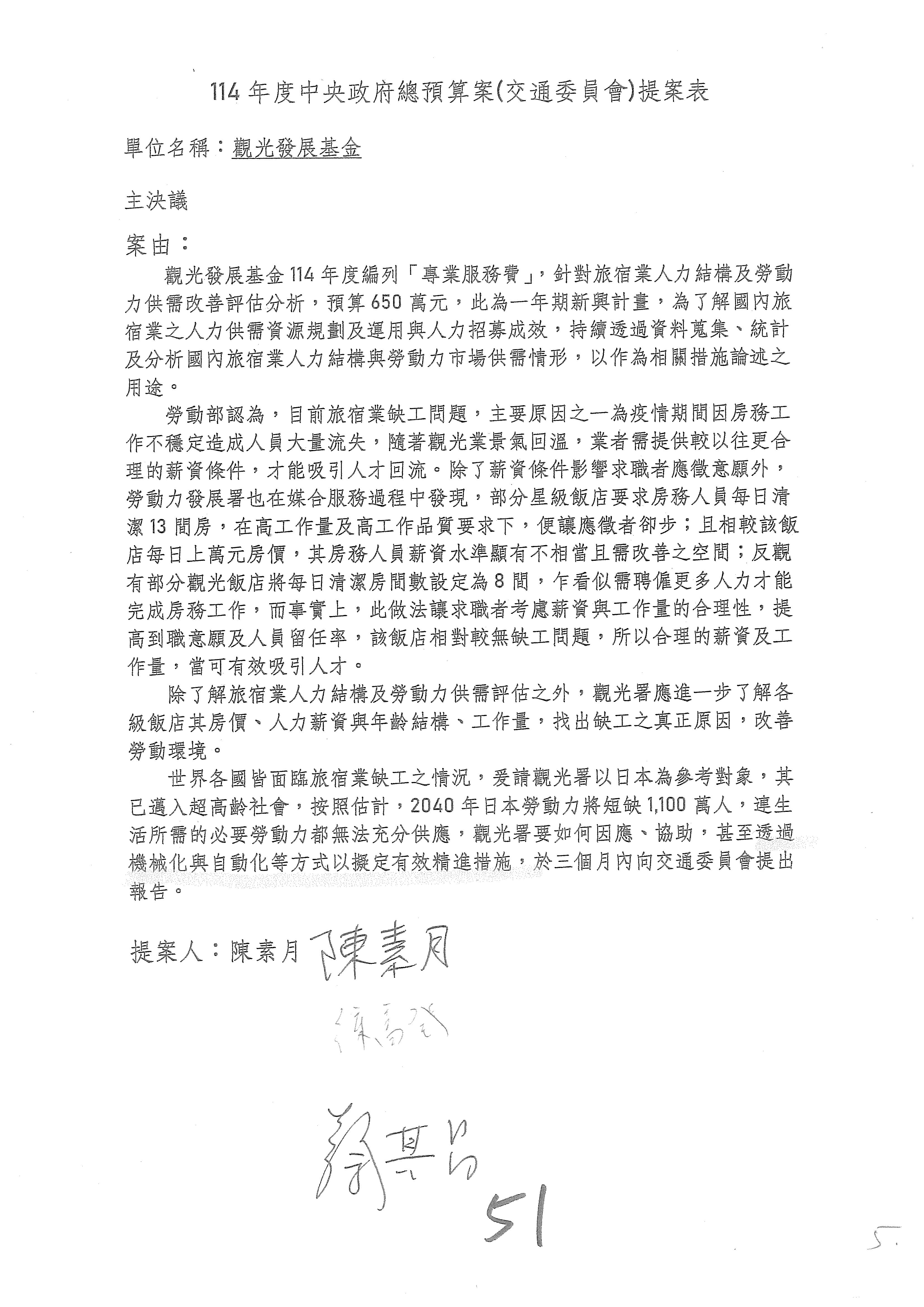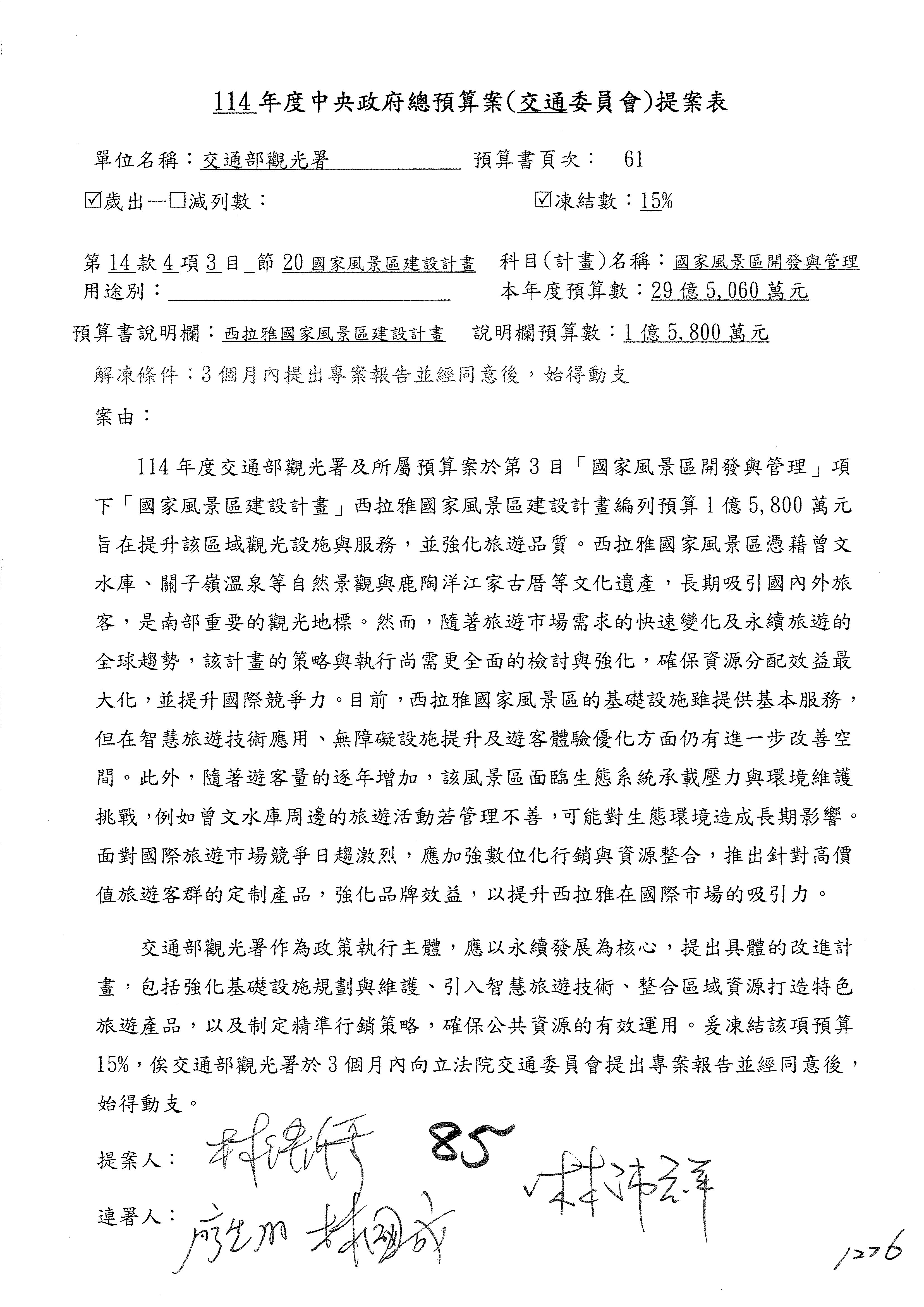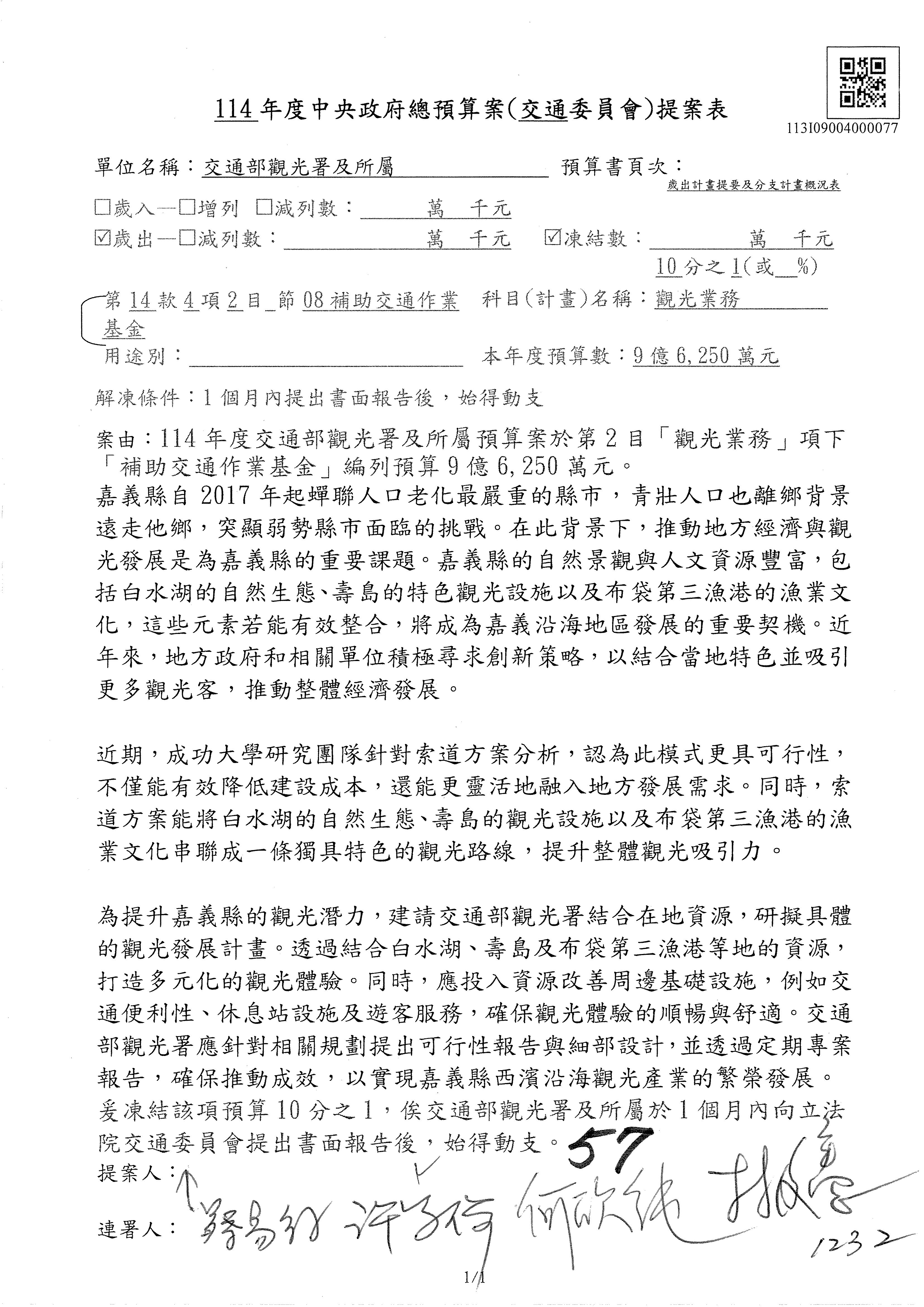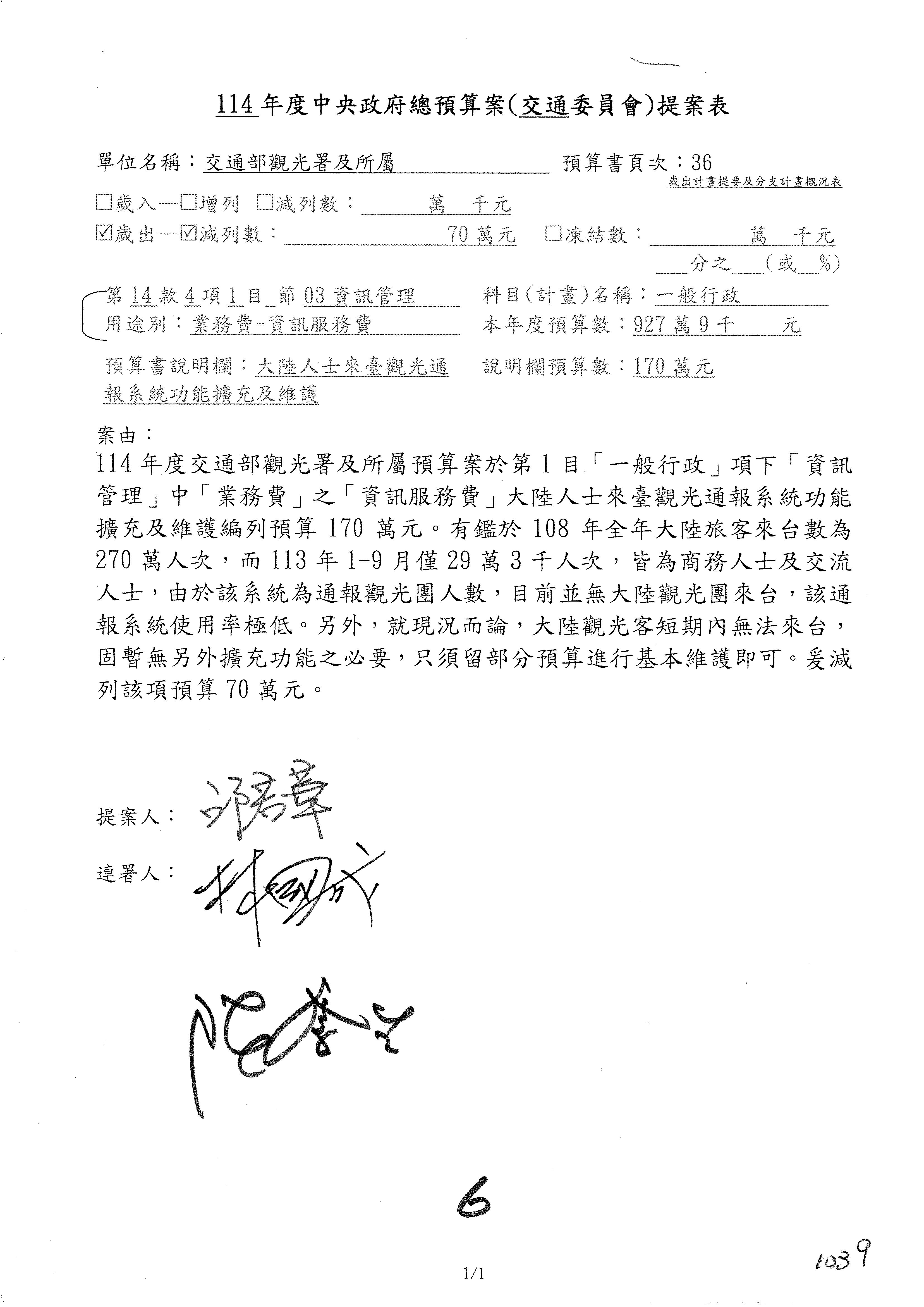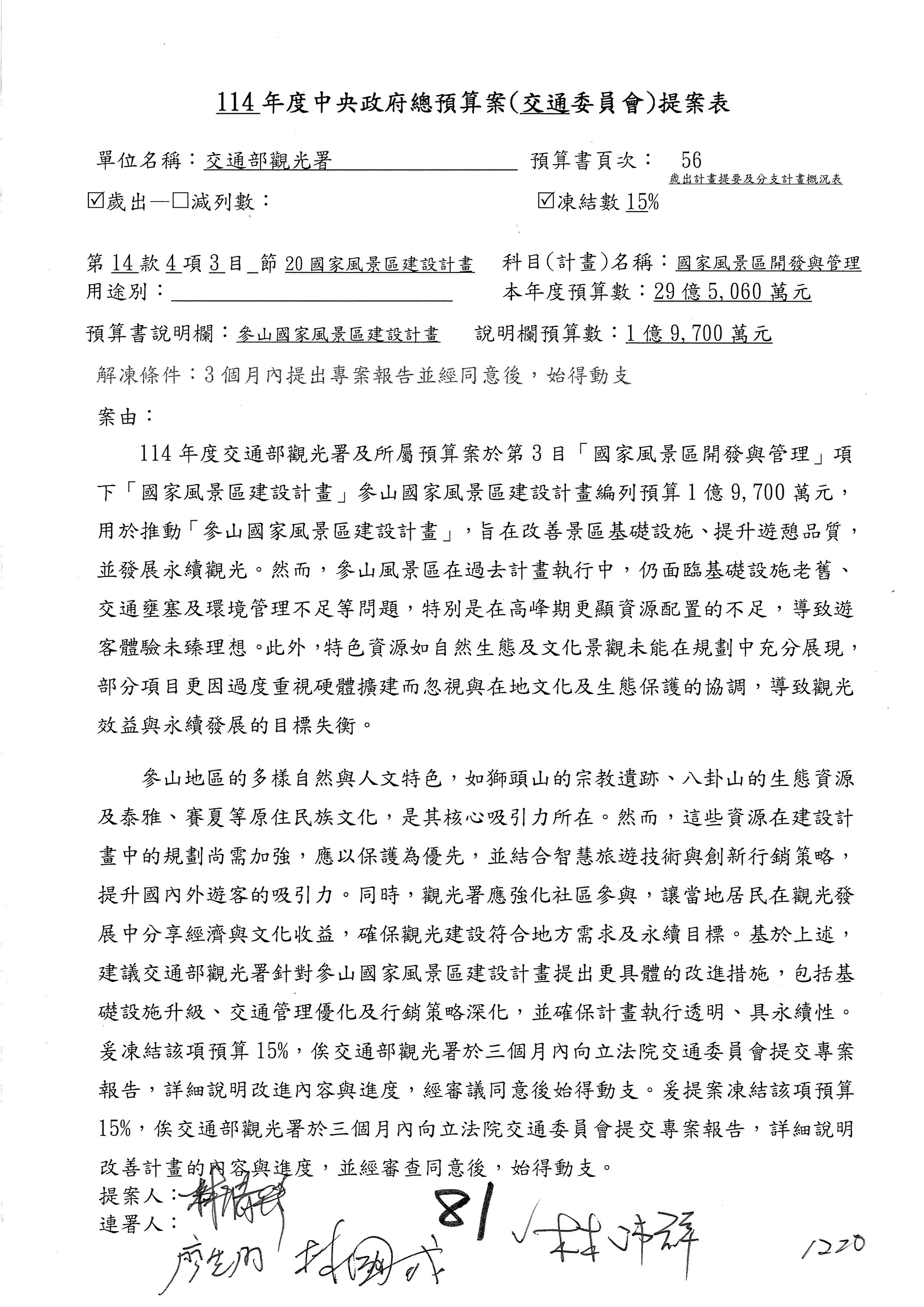 接下來處理交通部觀光發展基金114年度附屬單位預算,請各位參照建議併案及預算表。開始處理第1案。第1案林國成委員已經改主決議,沒問題吧?