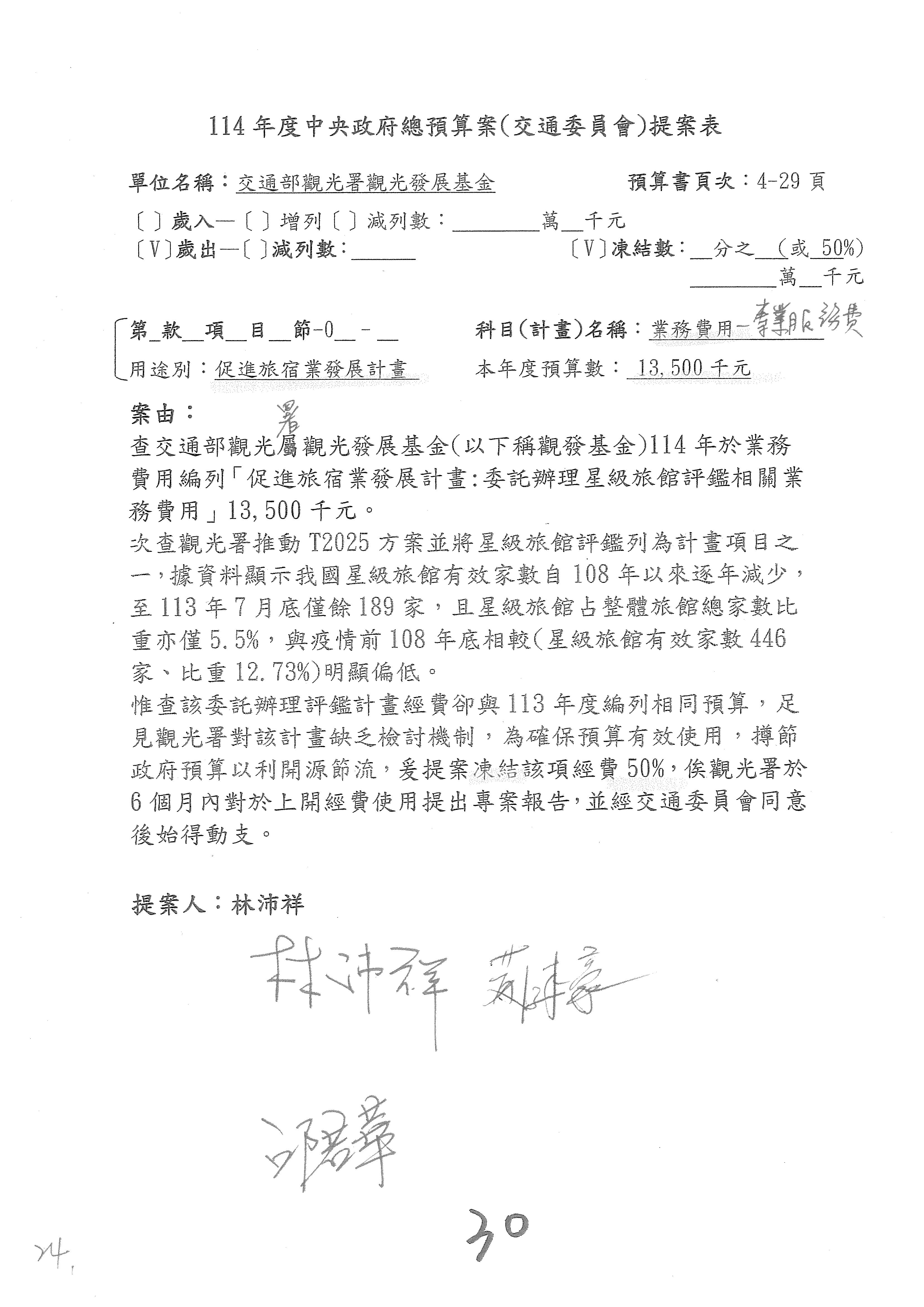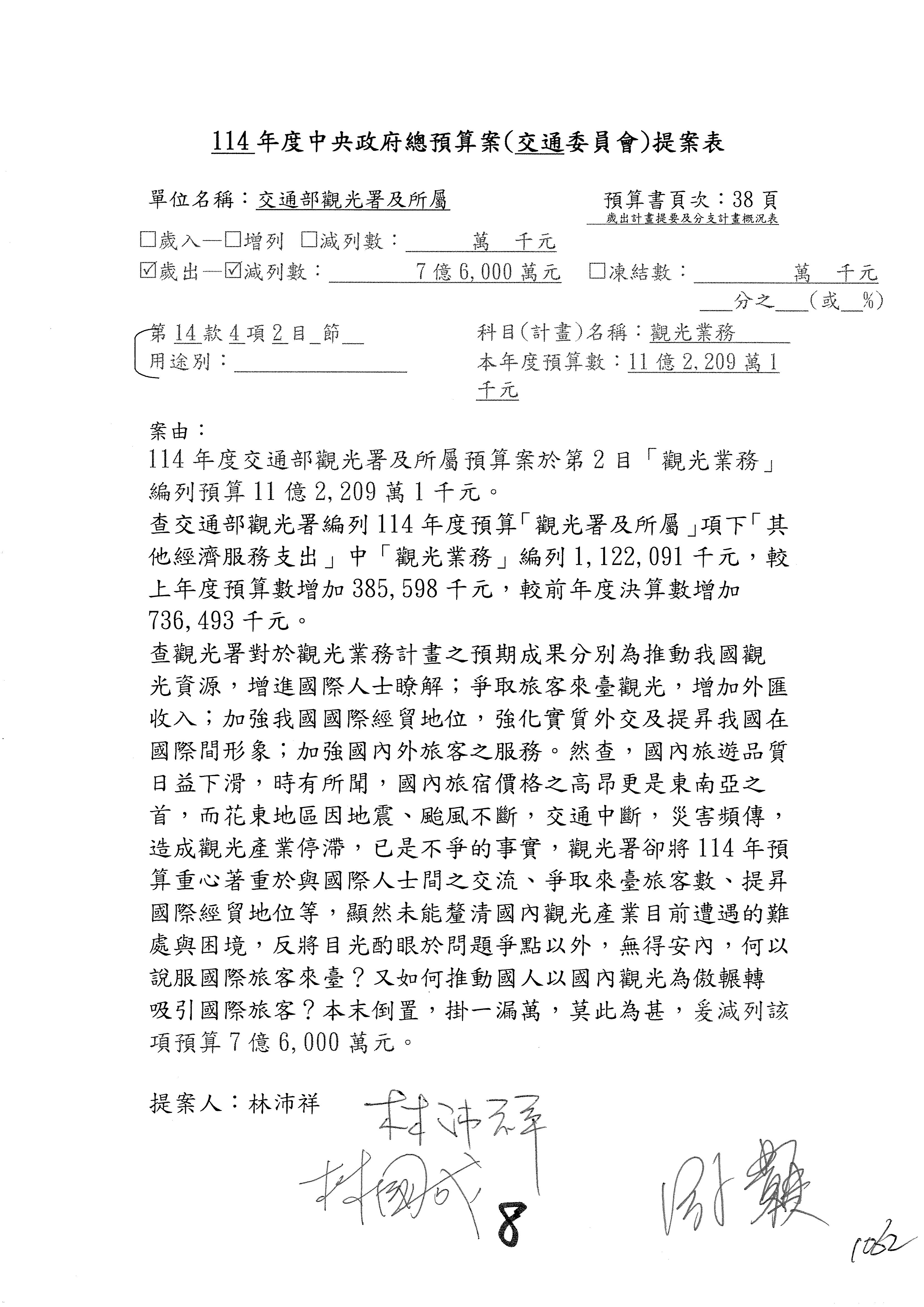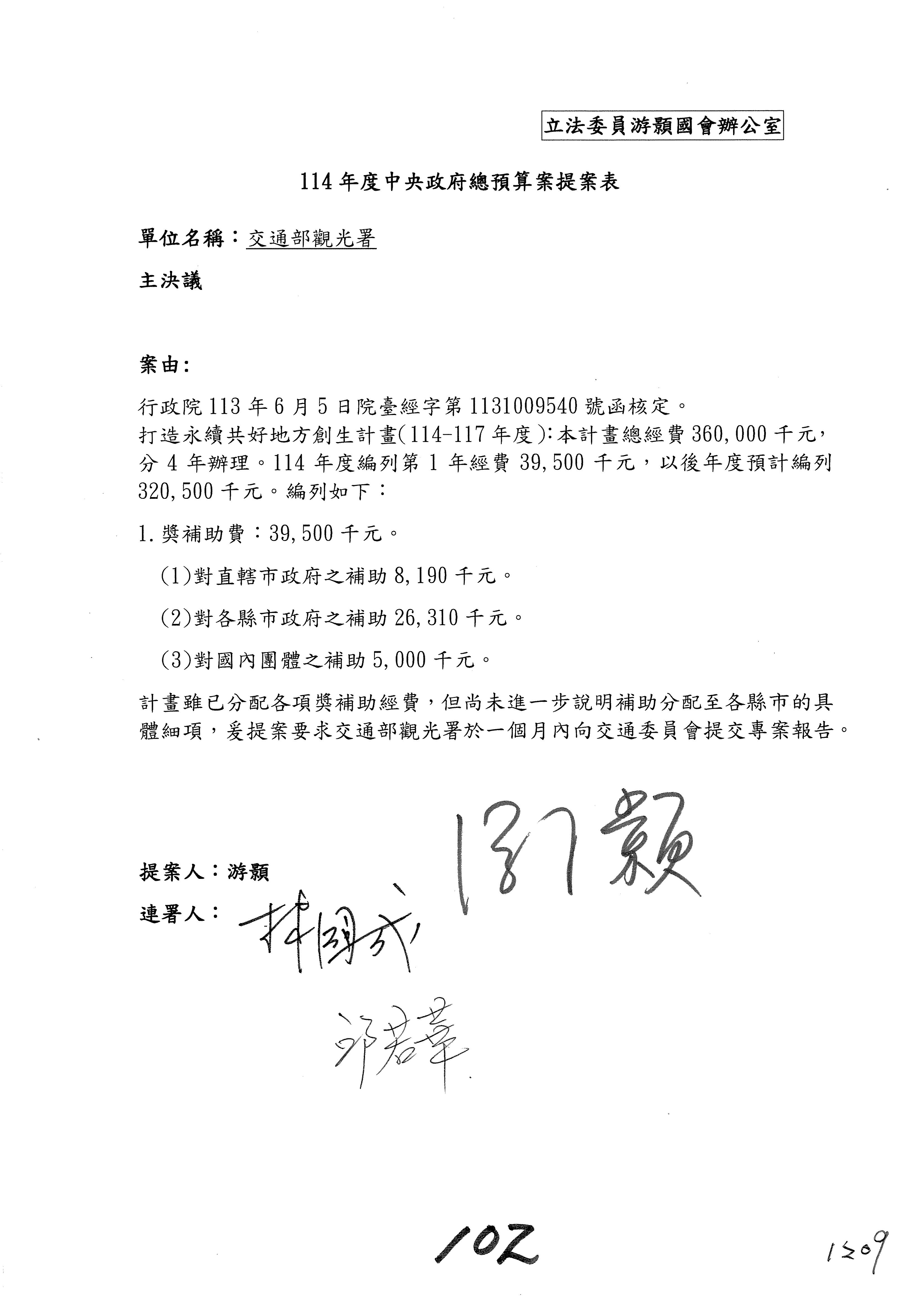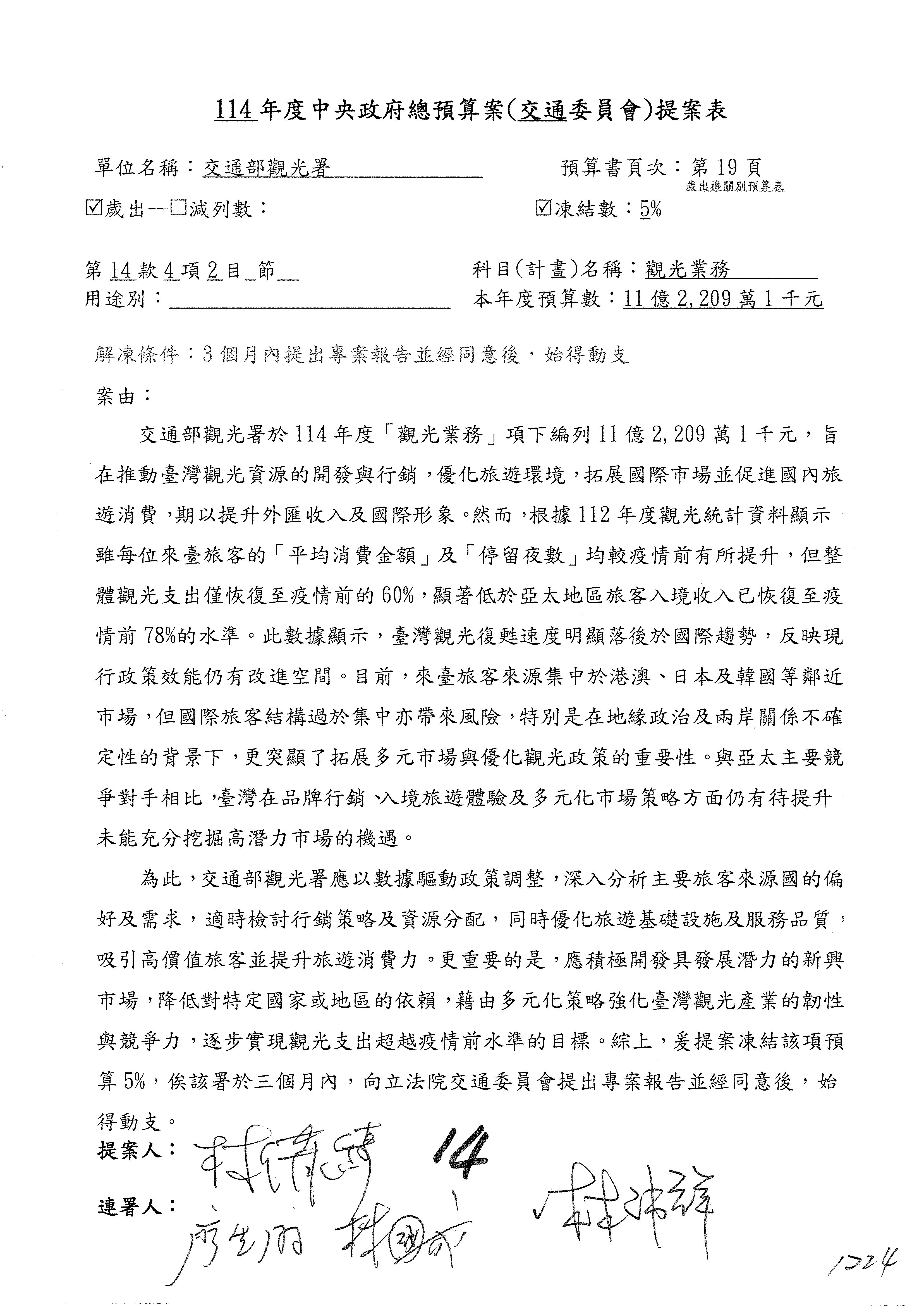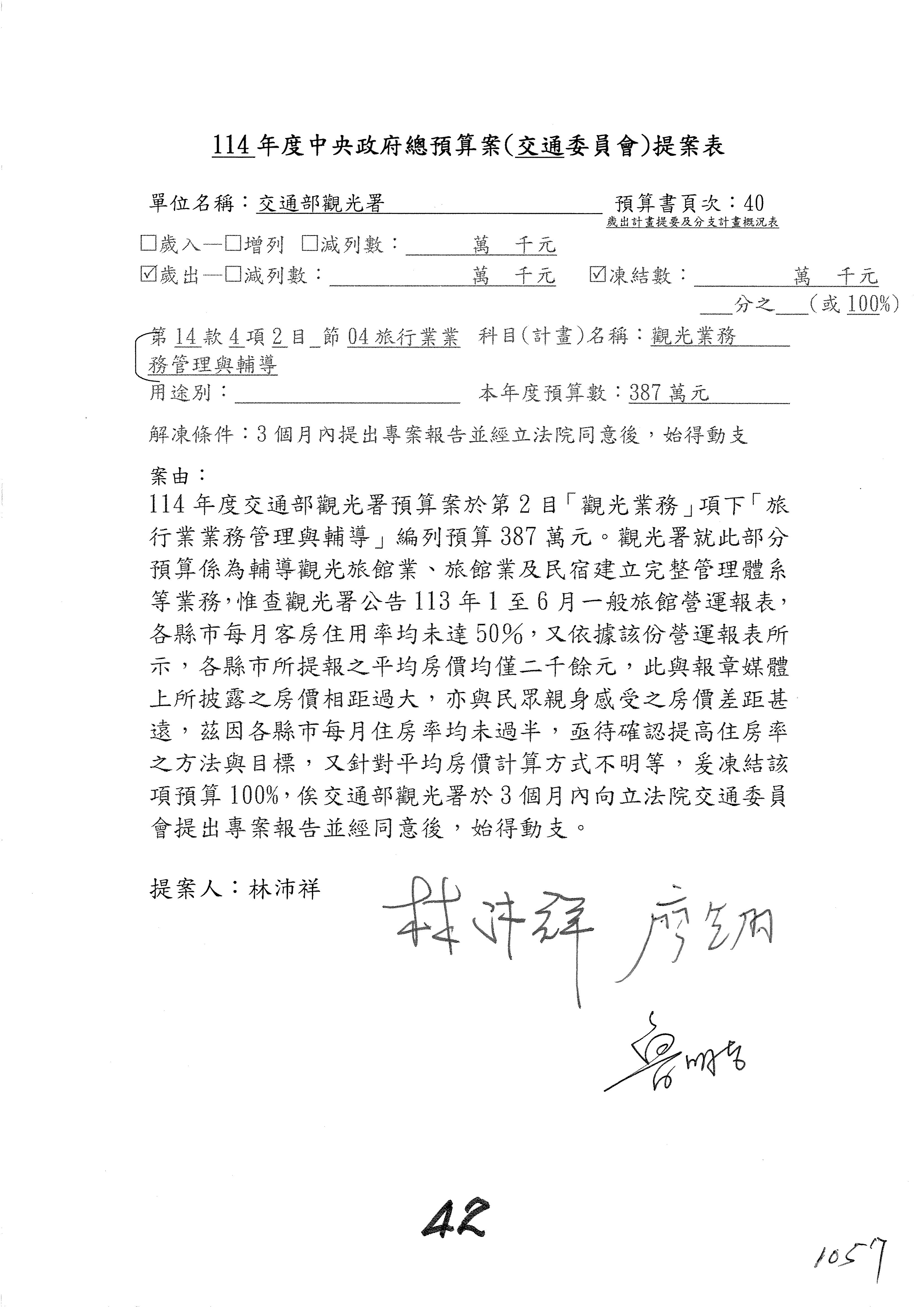 接下來處理交通部觀光發展基金114年度附屬單位預算,請各位參照建議併案及預算表。開始處理第1案。第1案林國成委員已經改主決議,沒問題吧?