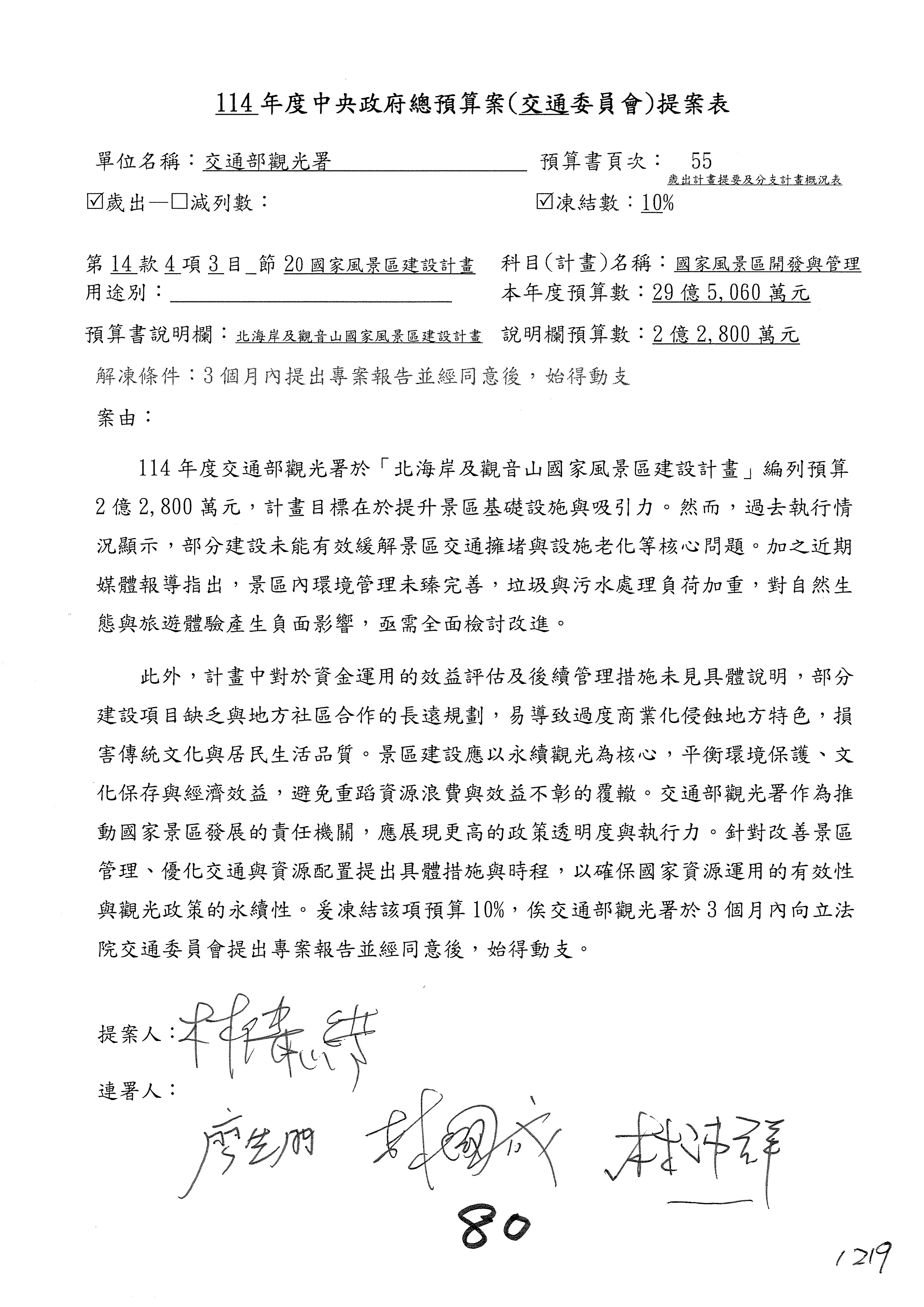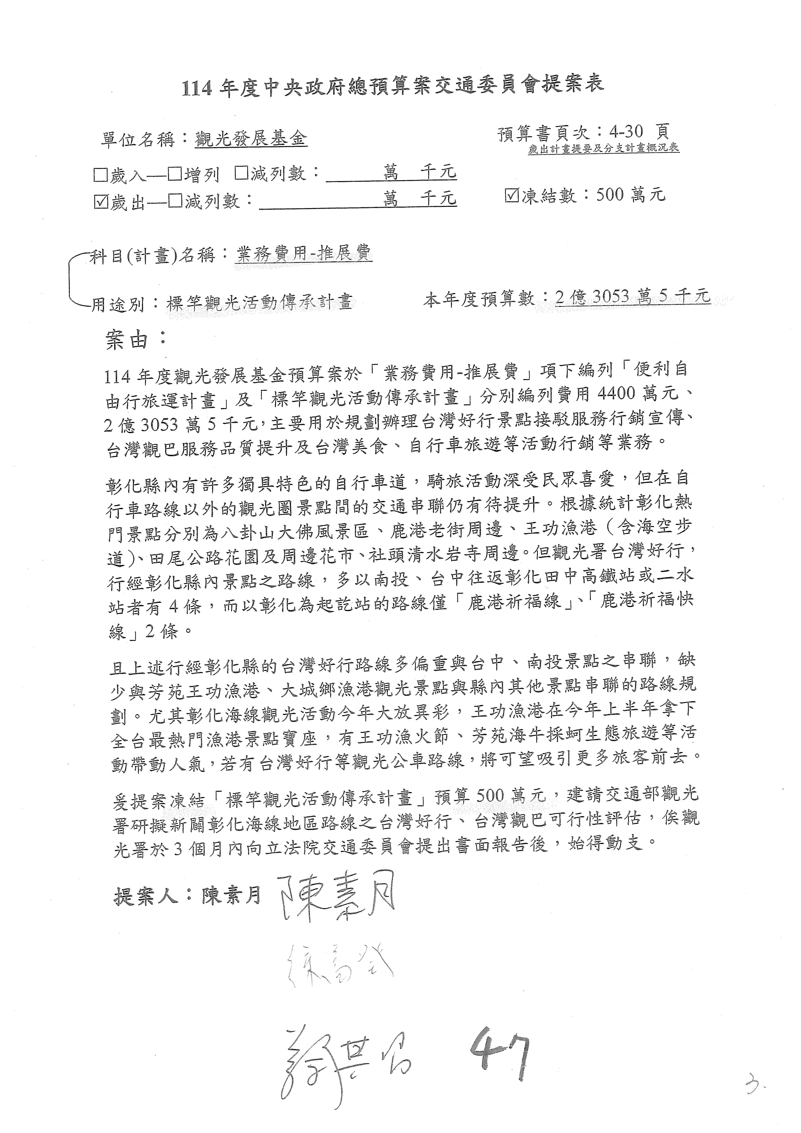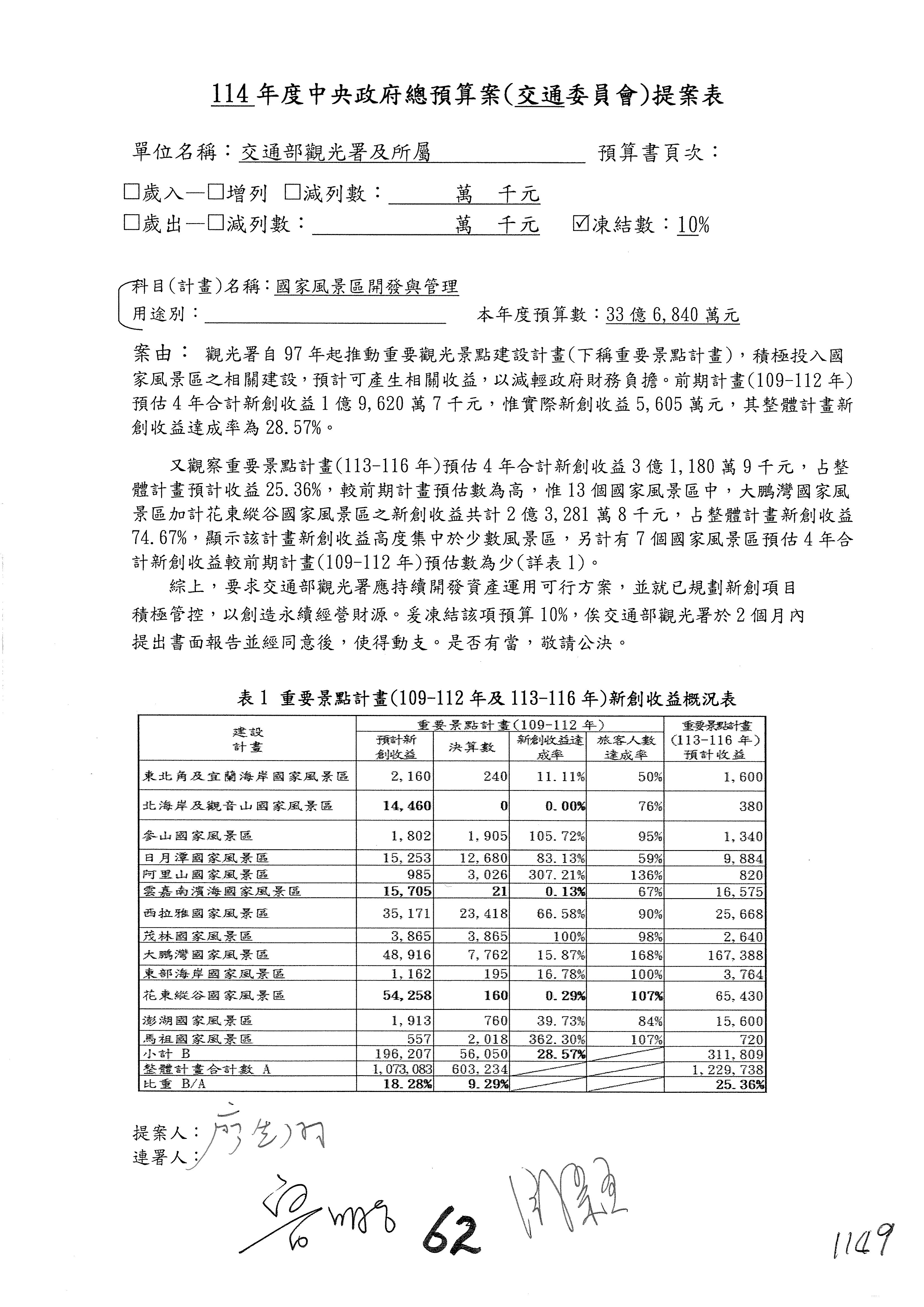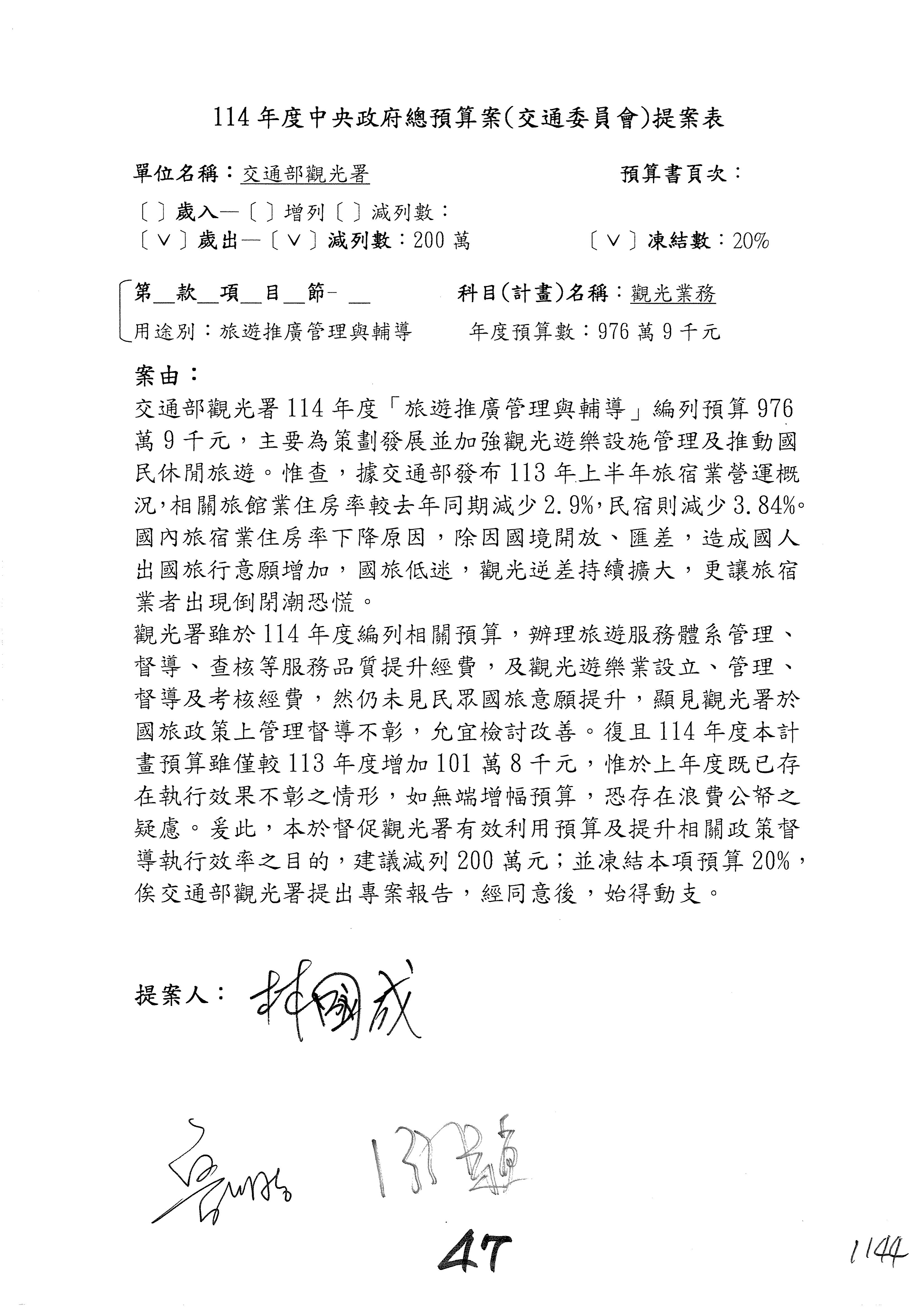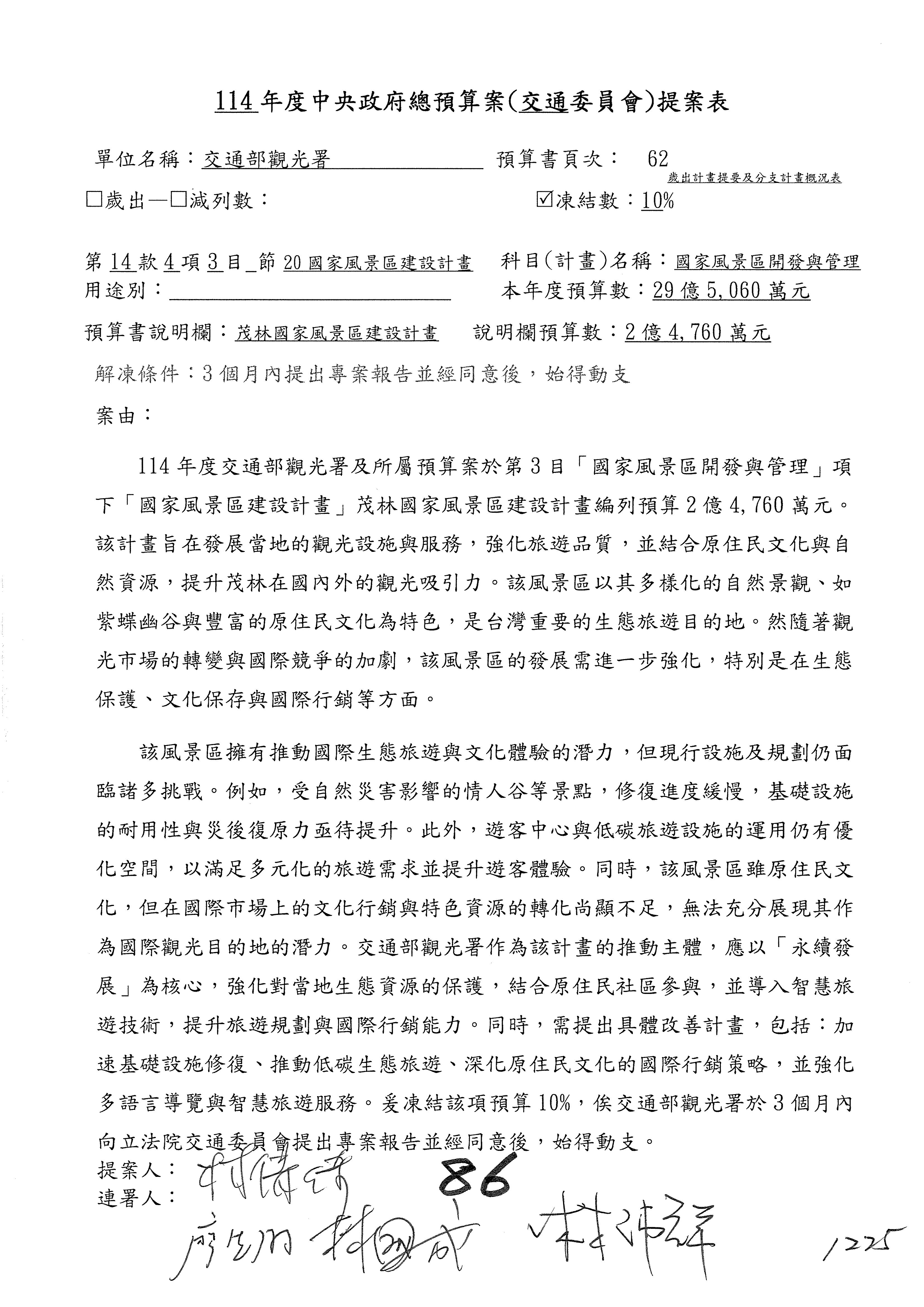 接下來處理交通部觀光發展基金114年度附屬單位預算,請各位參照建議併案及預算表。開始處理第1案。第1案林國成委員已經改主決議,沒問題吧?