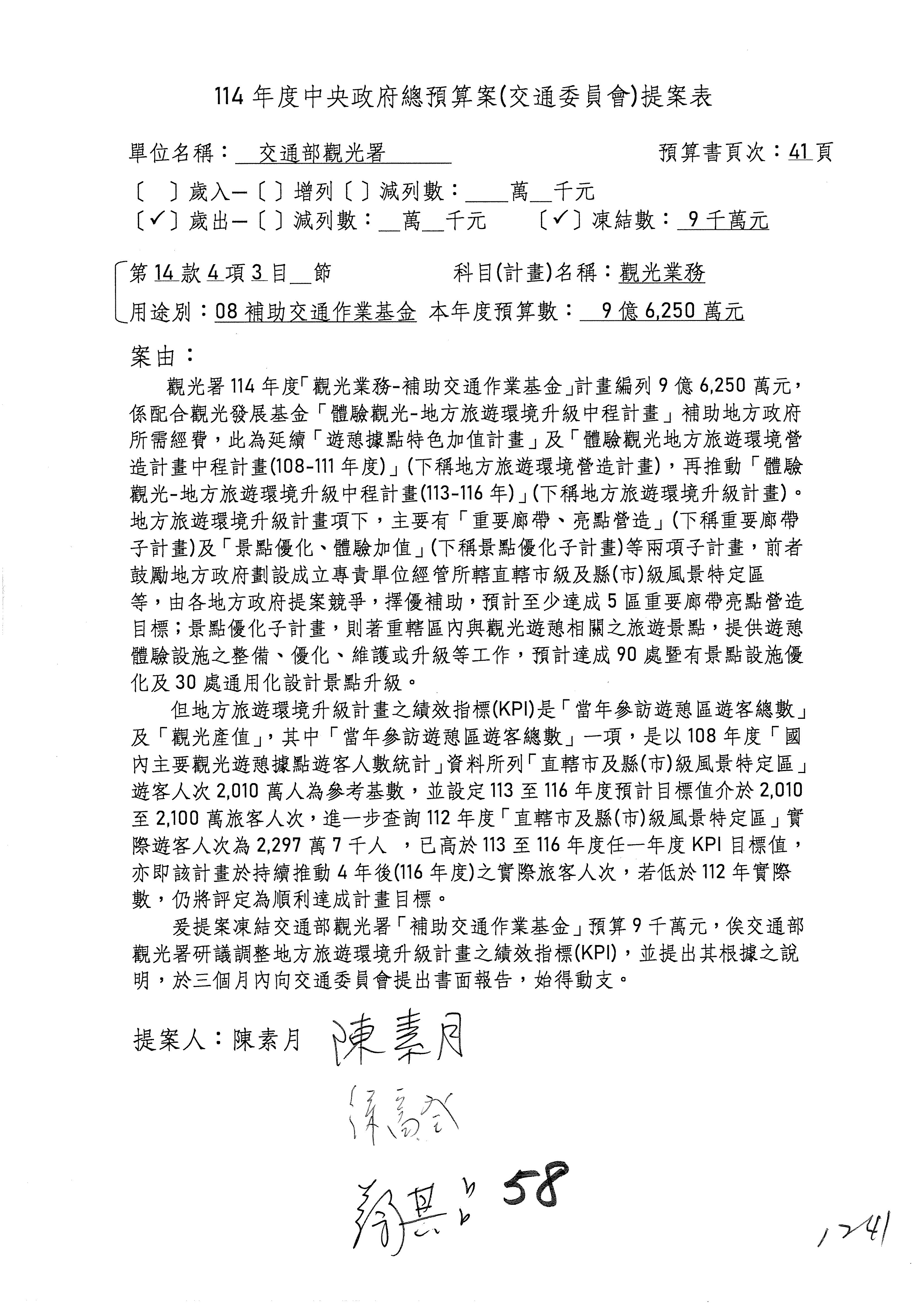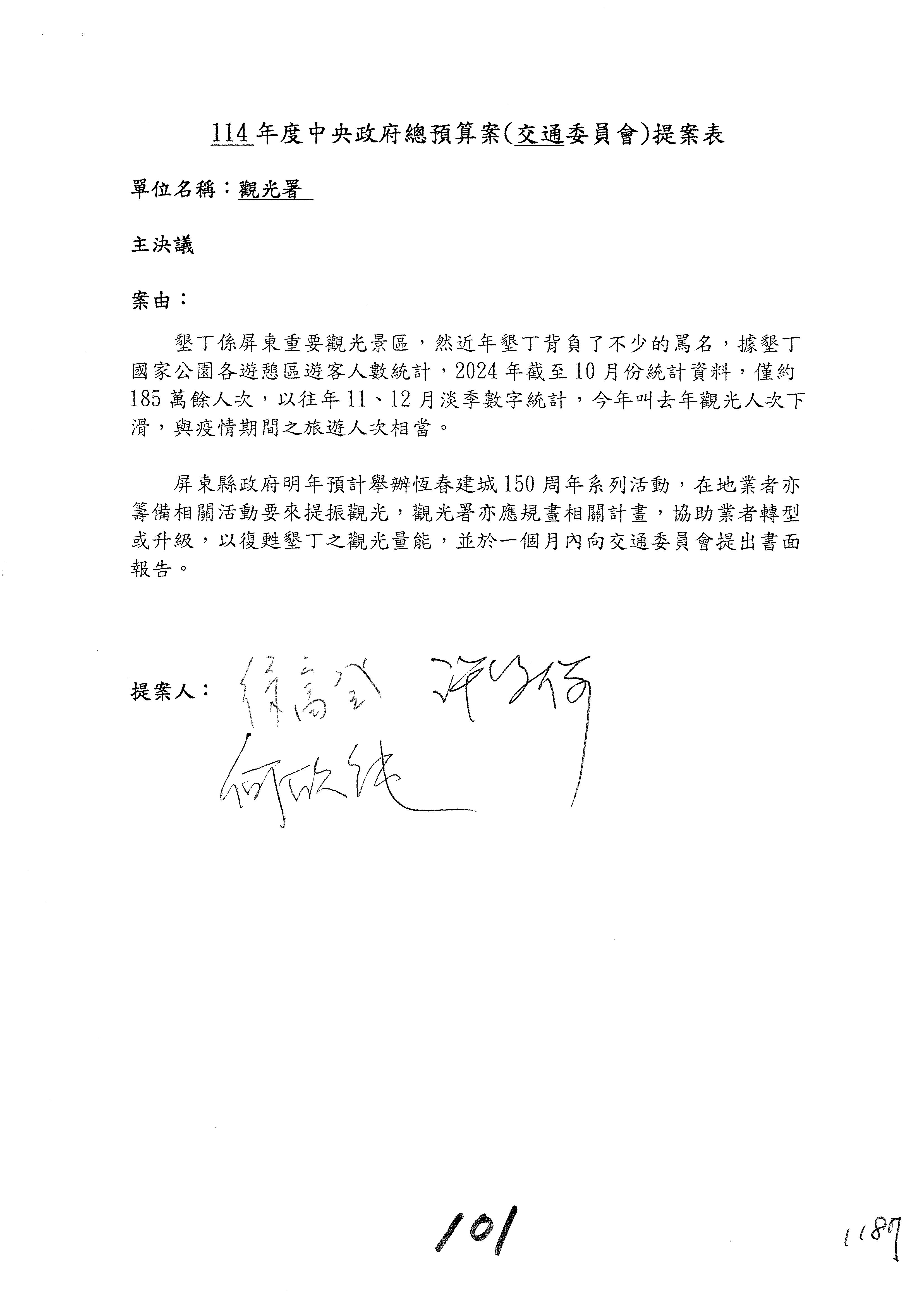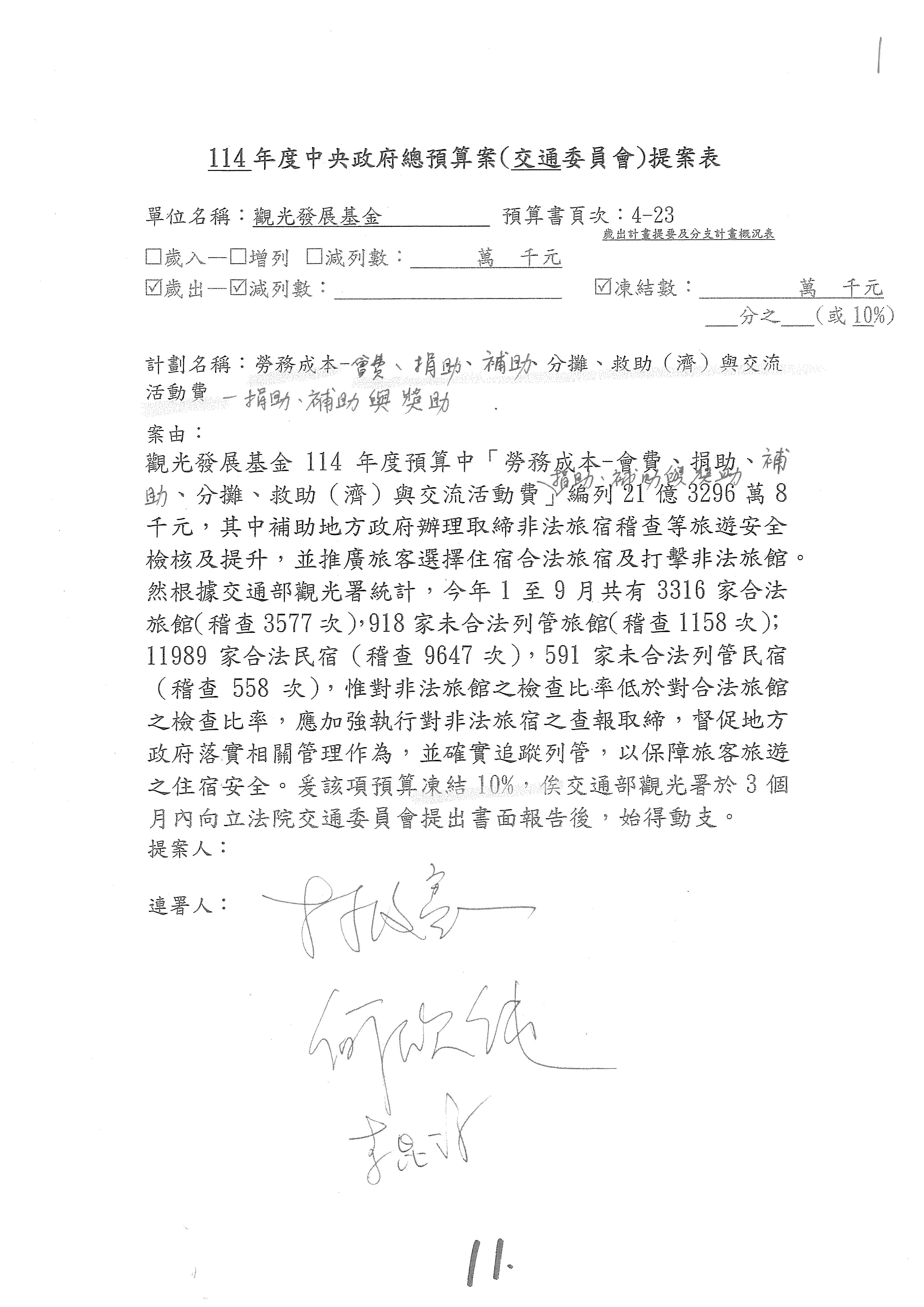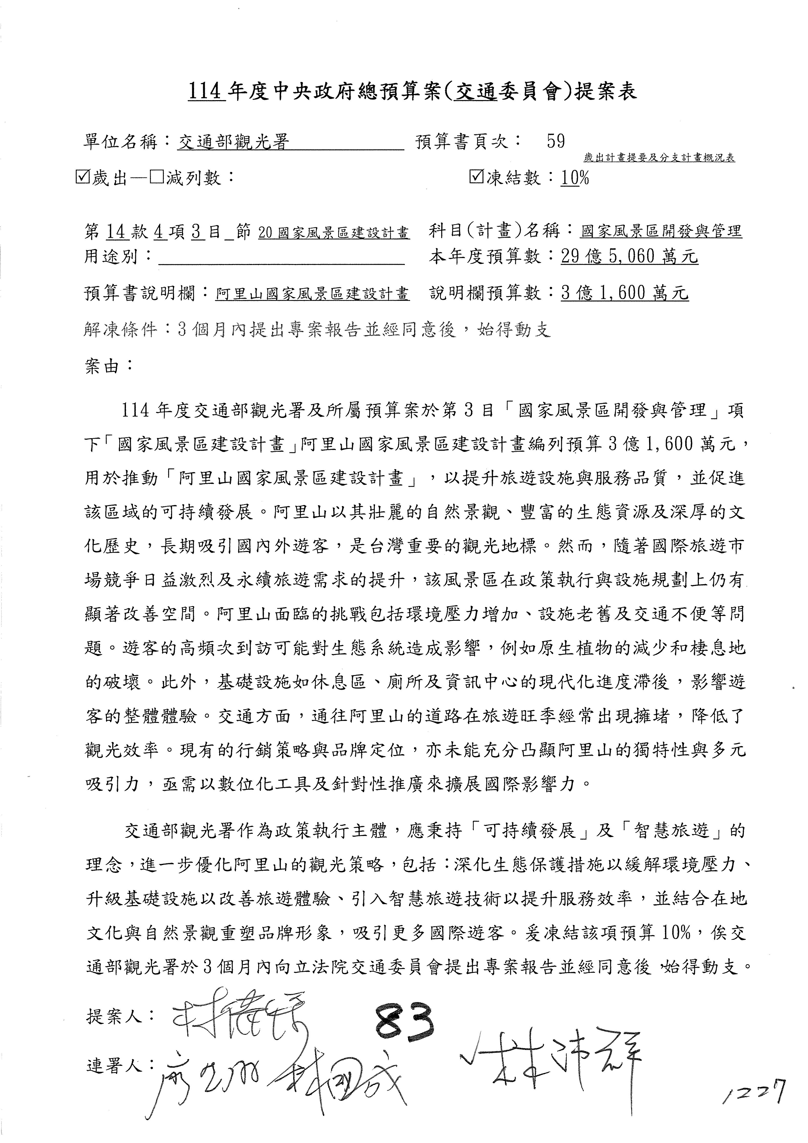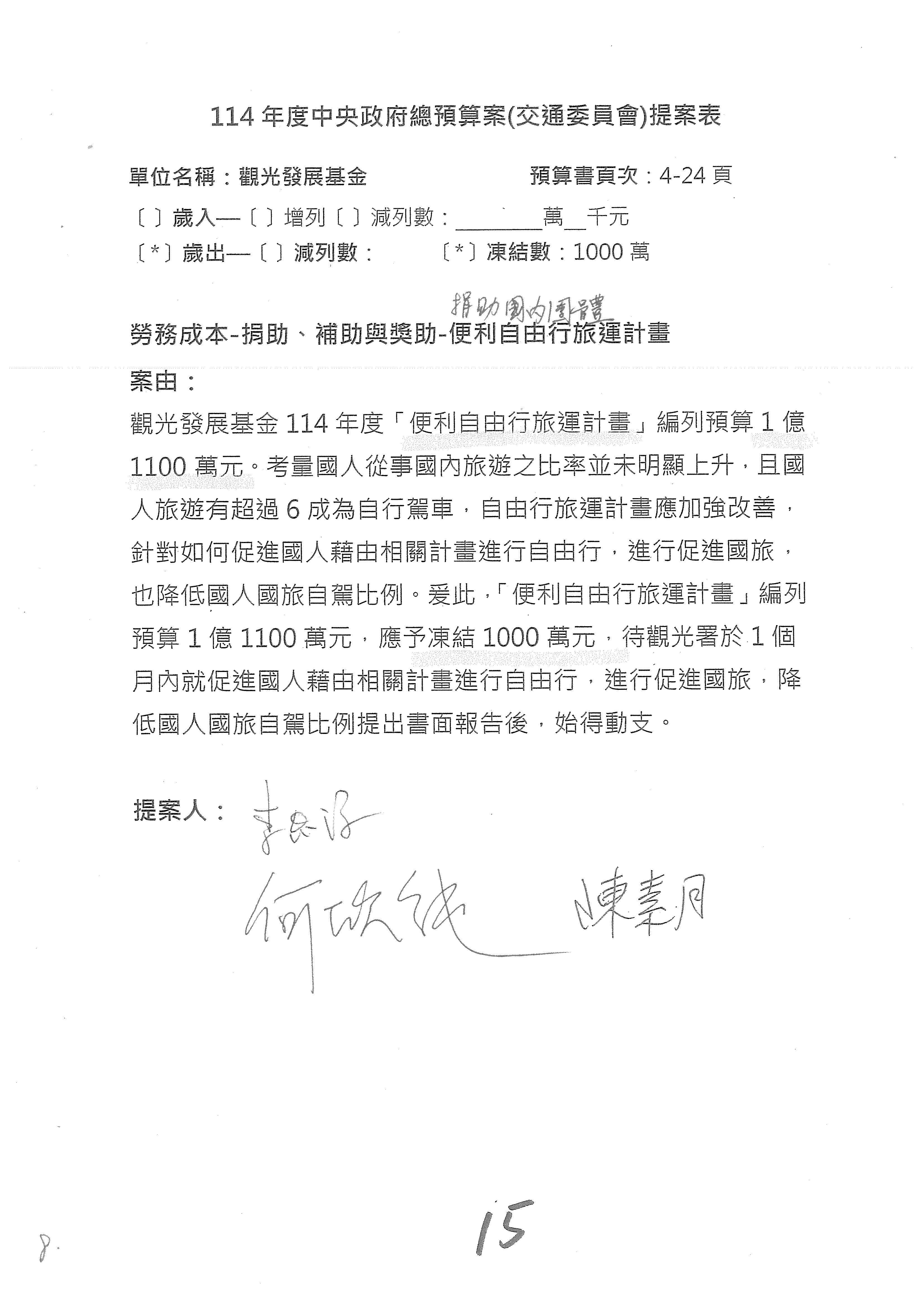 接下來處理交通部觀光發展基金114年度附屬單位預算,請各位參照建議併案及預算表。開始處理第1案。第1案林國成委員已經改主決議,沒問題吧?