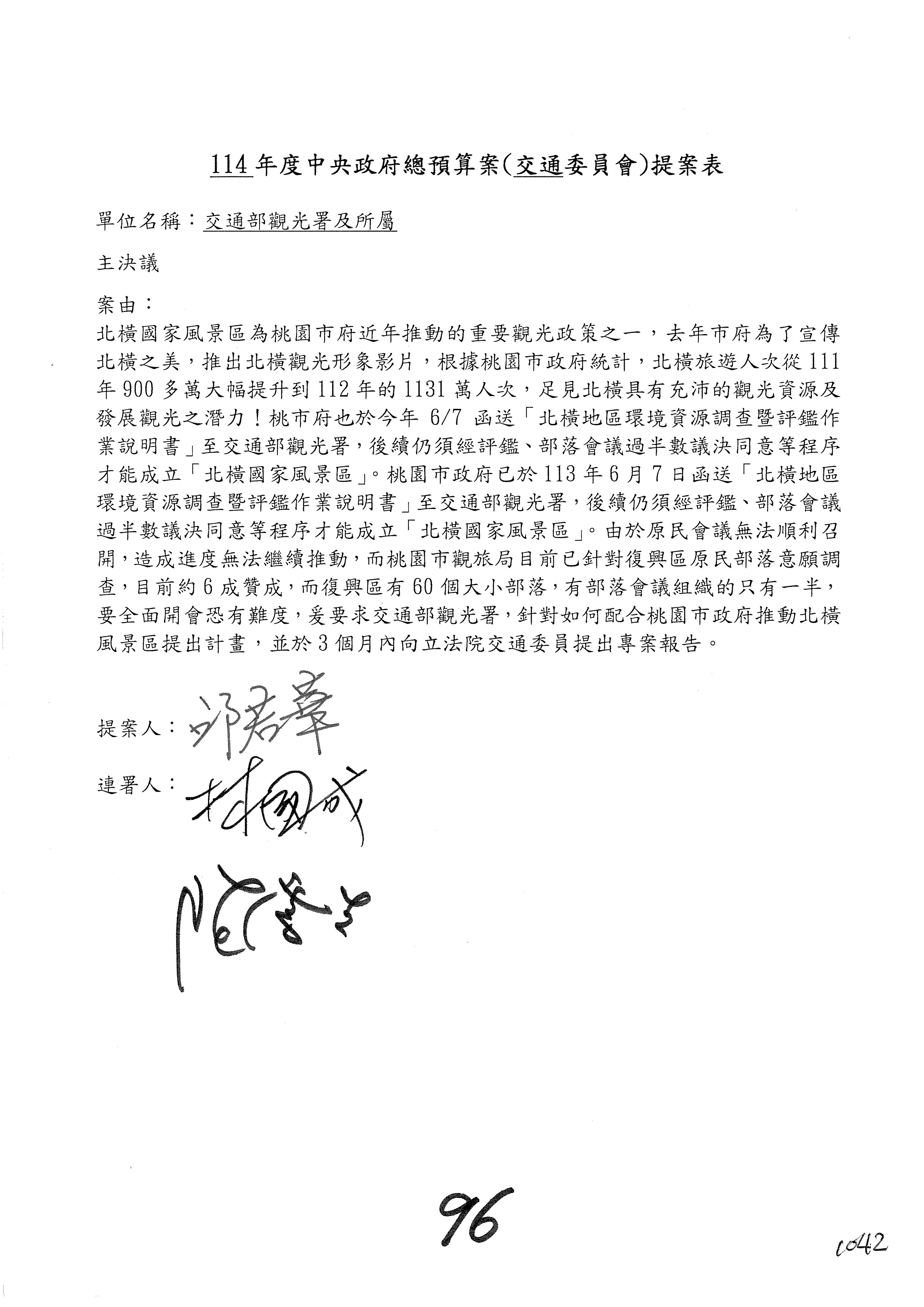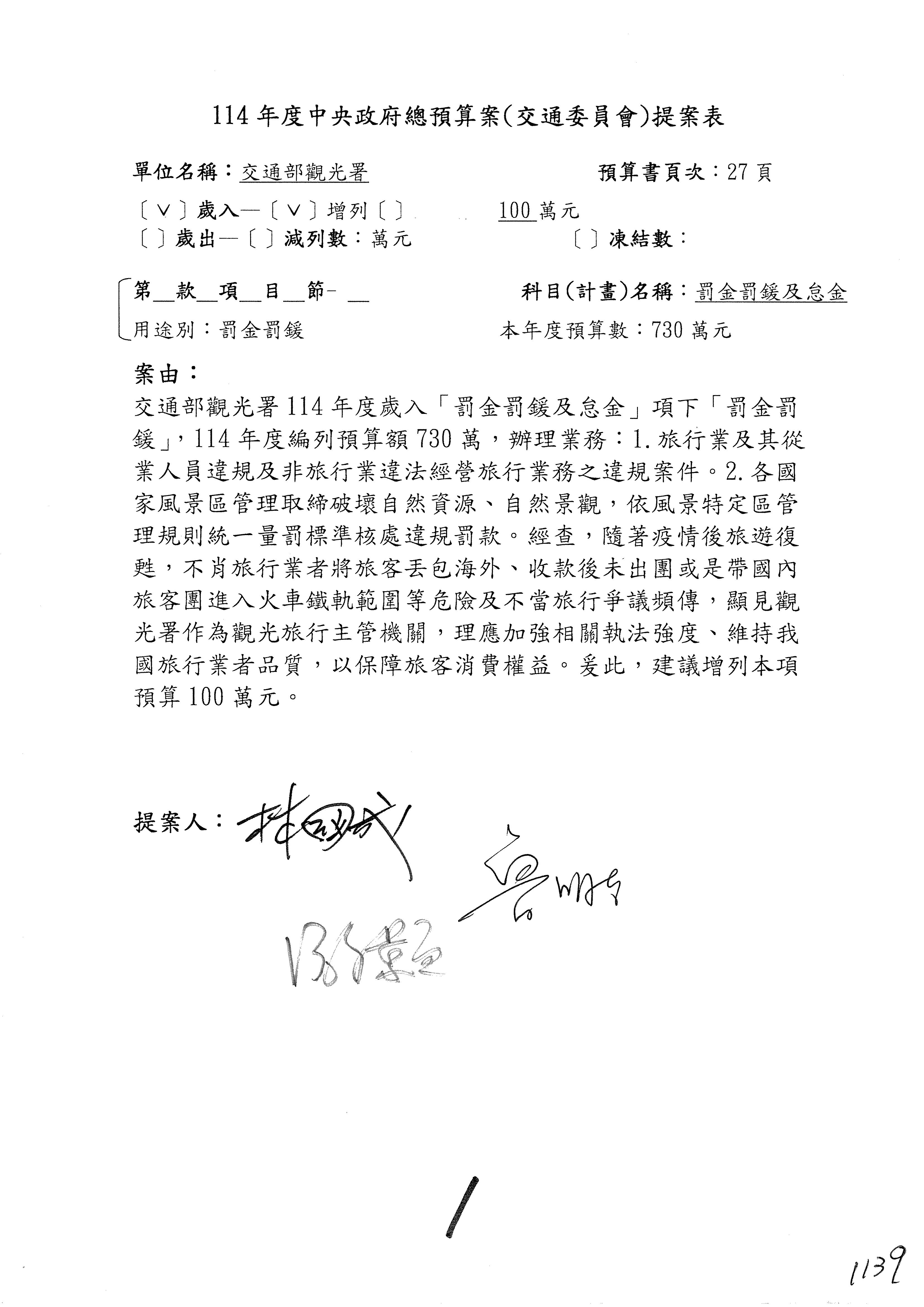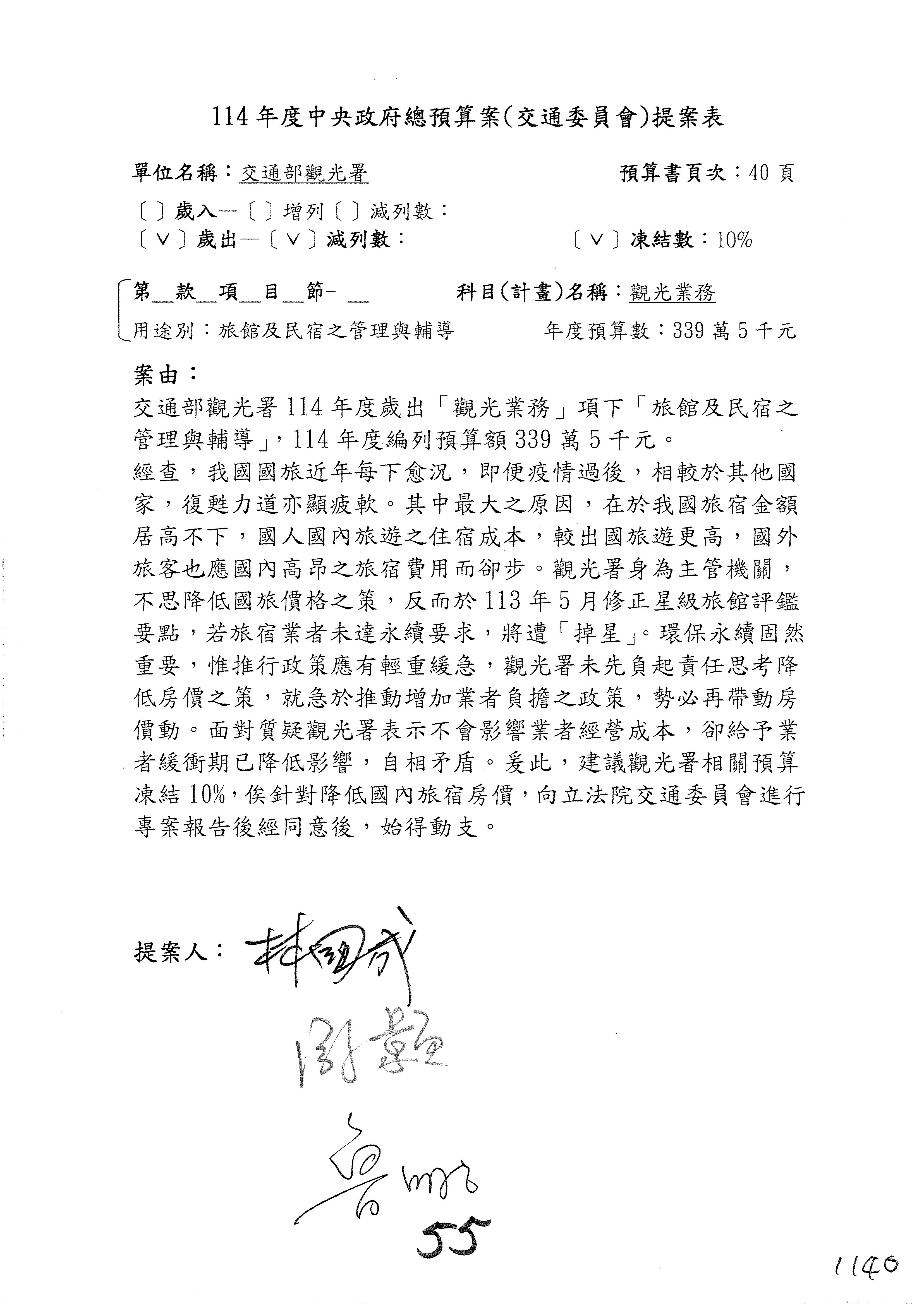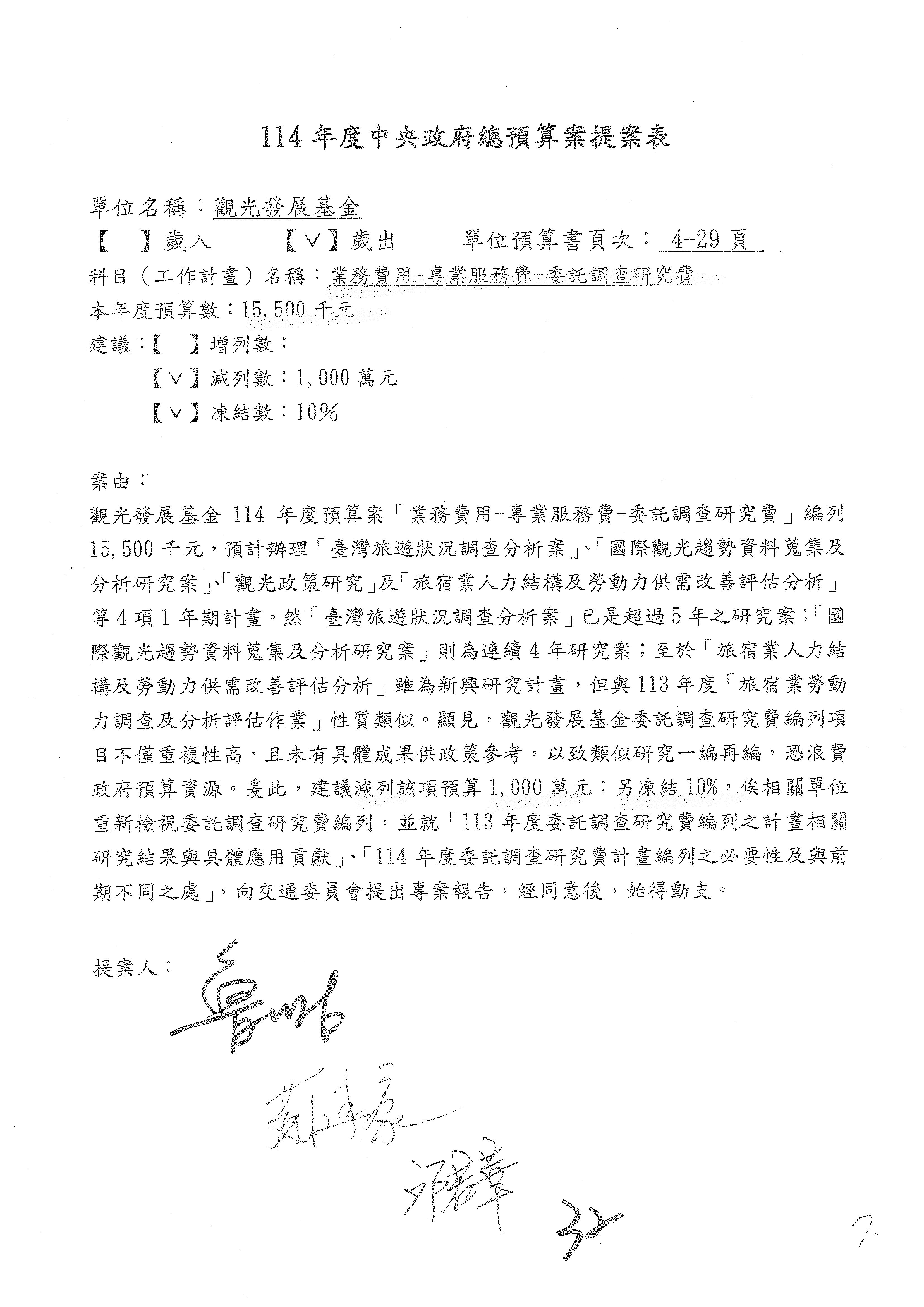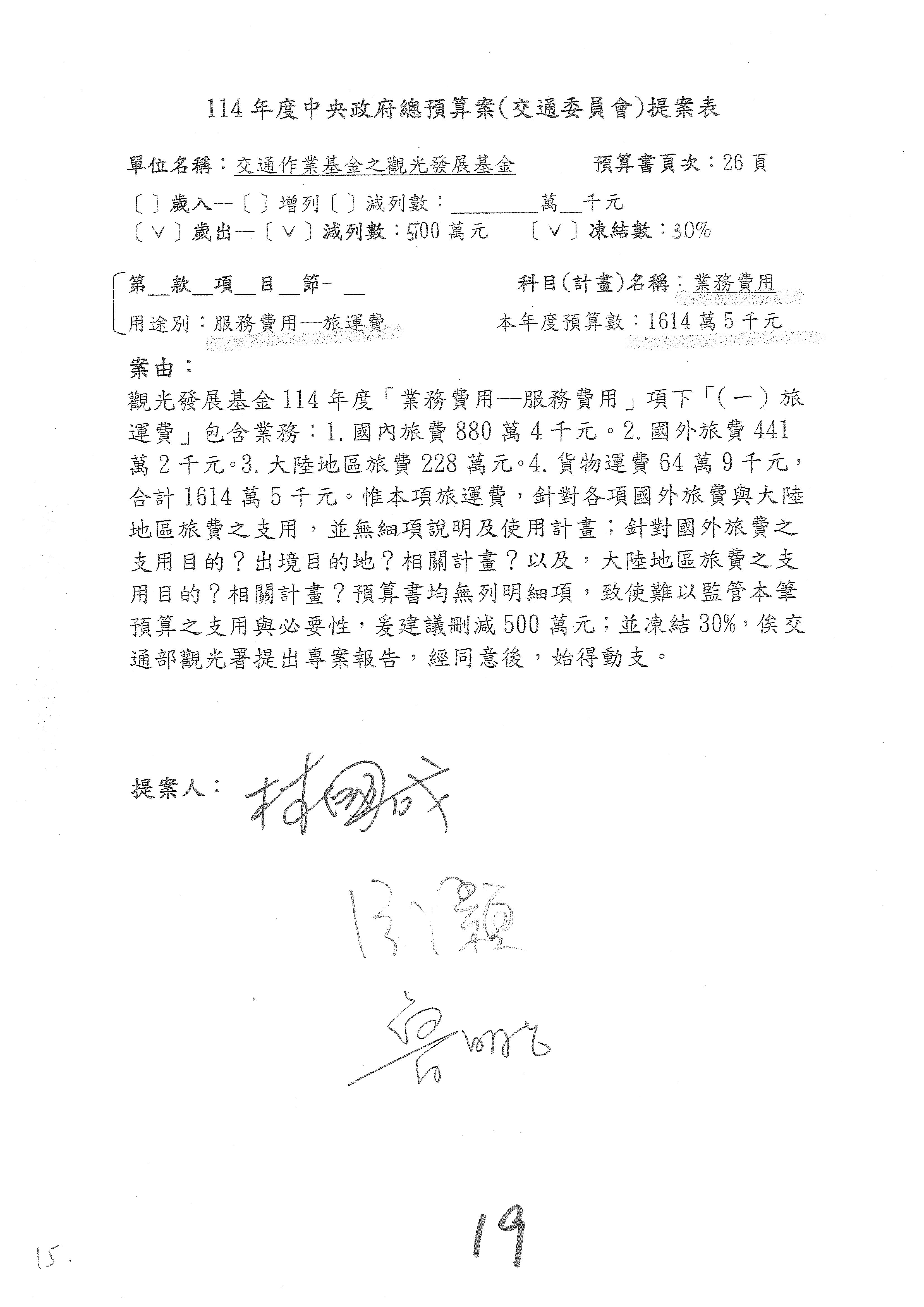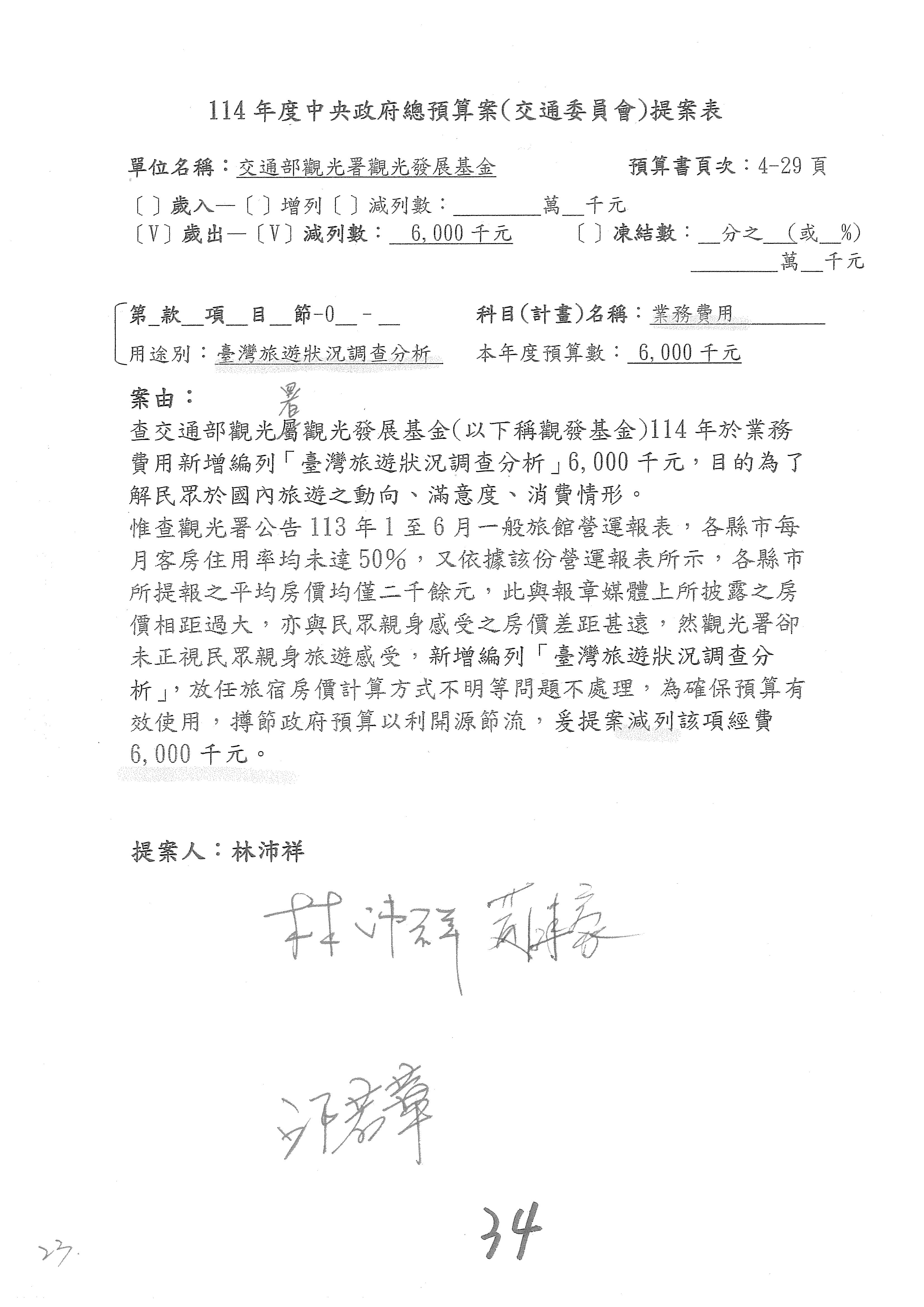 接下來處理交通部觀光發展基金114年度附屬單位預算,請各位參照建議併案及預算表。開始處理第1案。第1案林國成委員已經改主決議,沒問題吧?