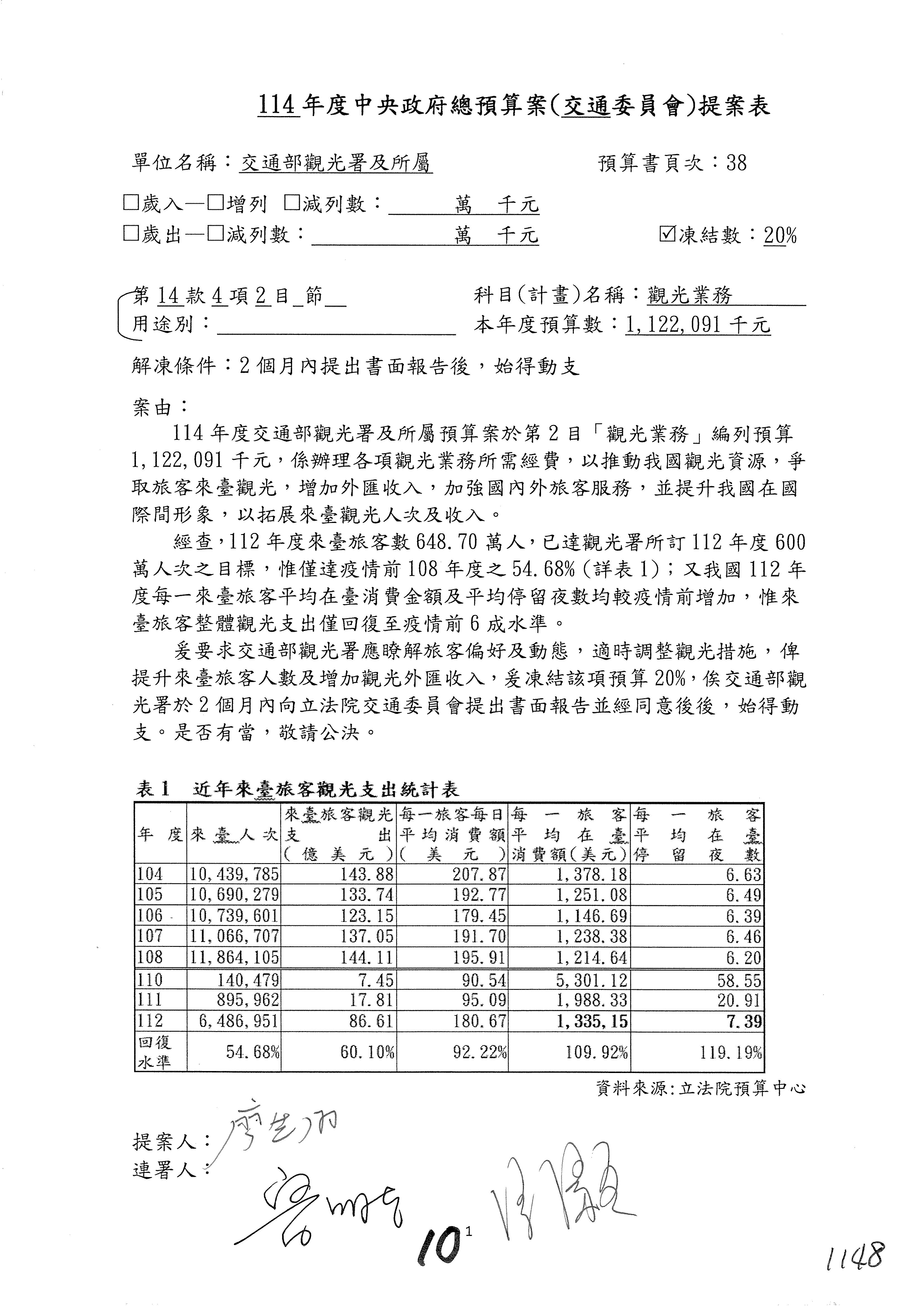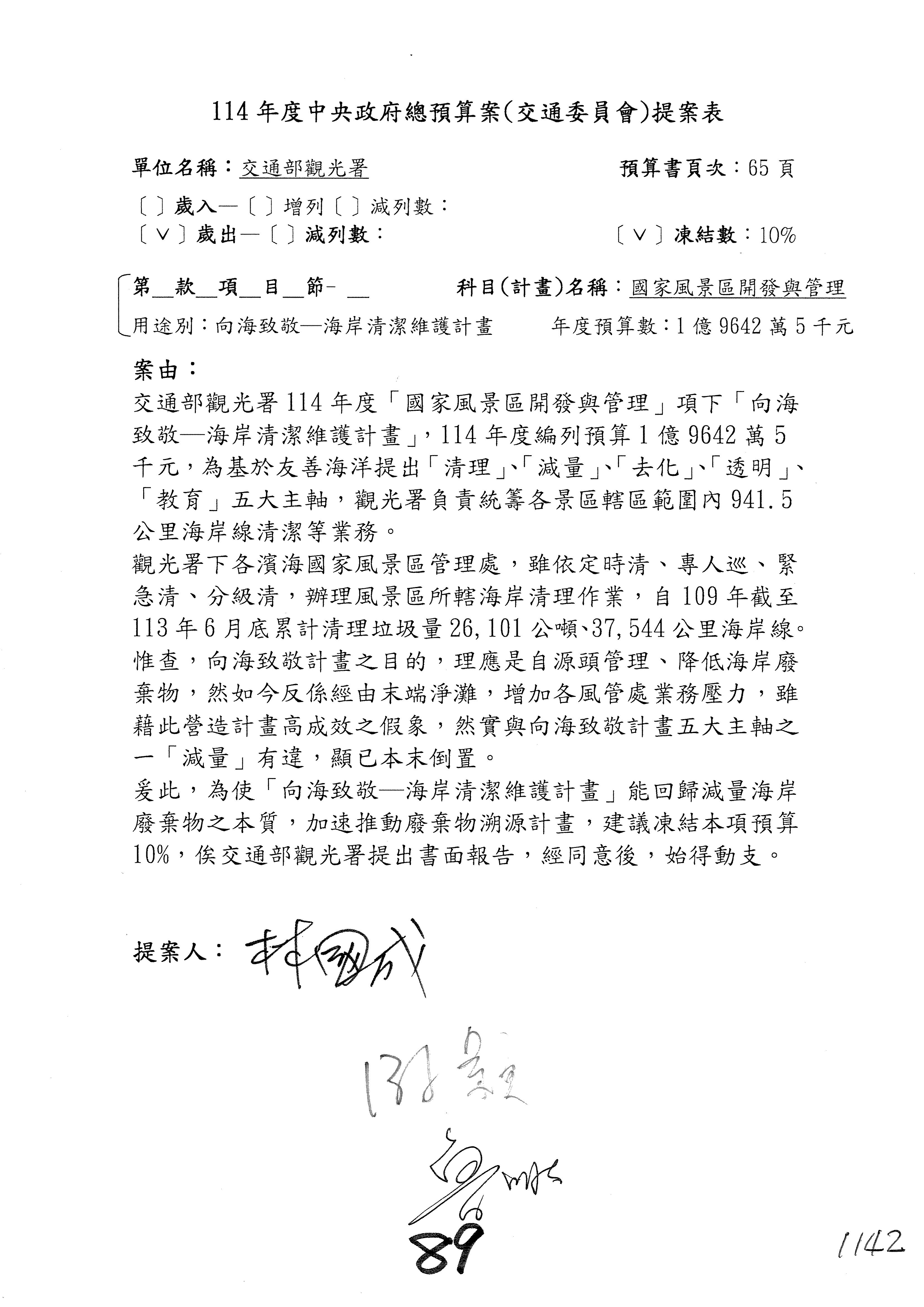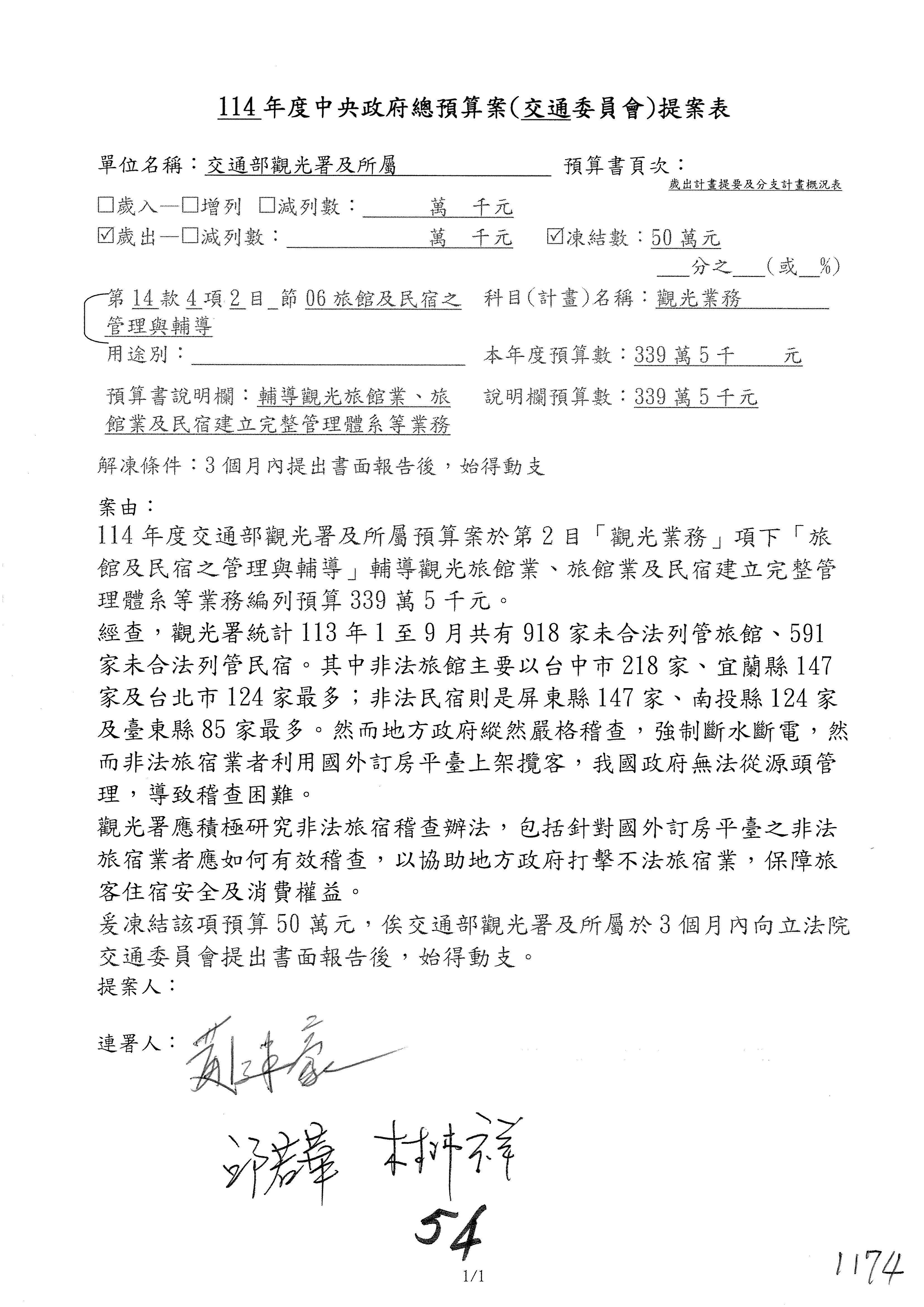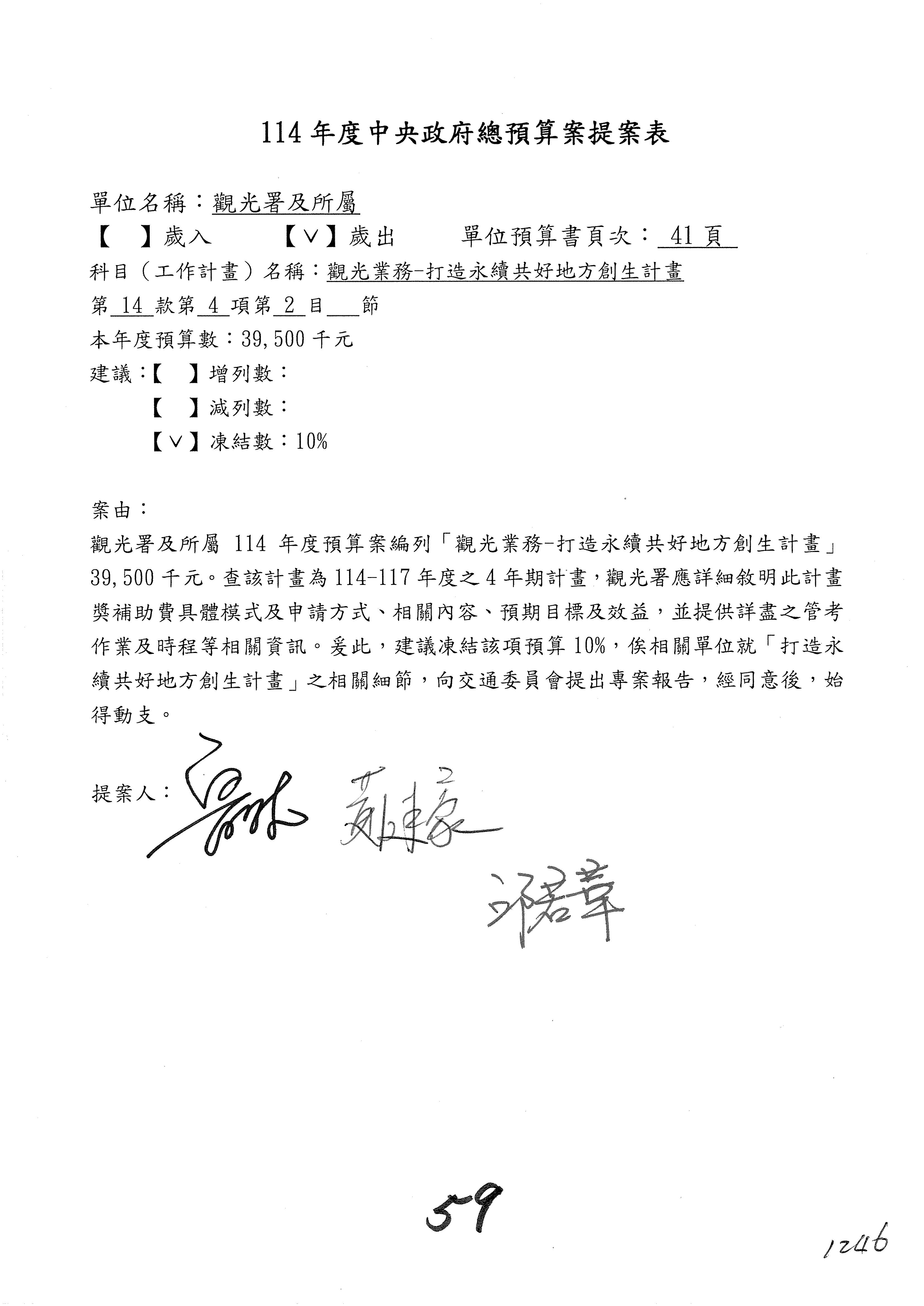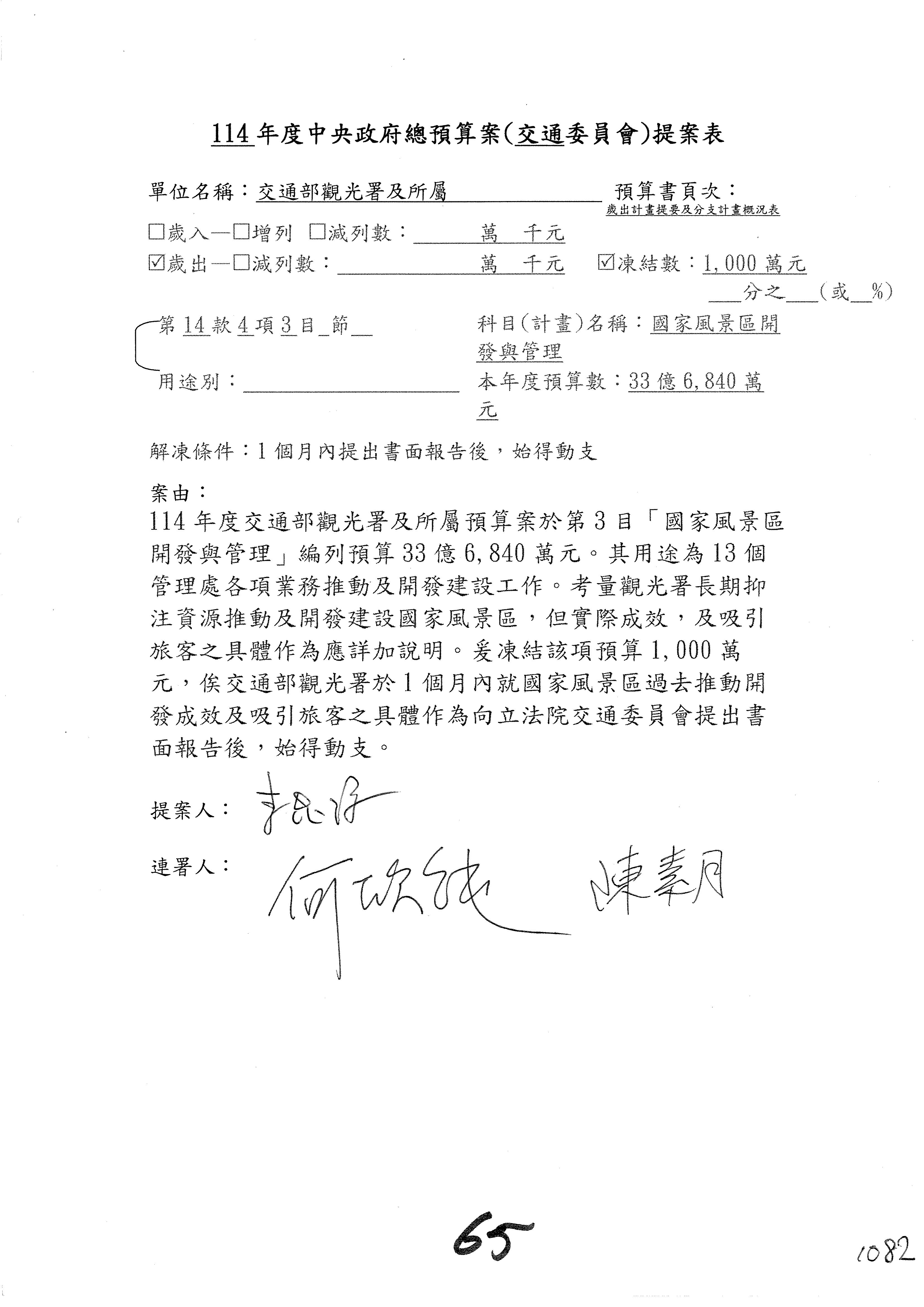 接下來處理交通部觀光發展基金114年度附屬單位預算,請各位參照建議併案及預算表。開始處理第1案。第1案林國成委員已經改主決議,沒問題吧?