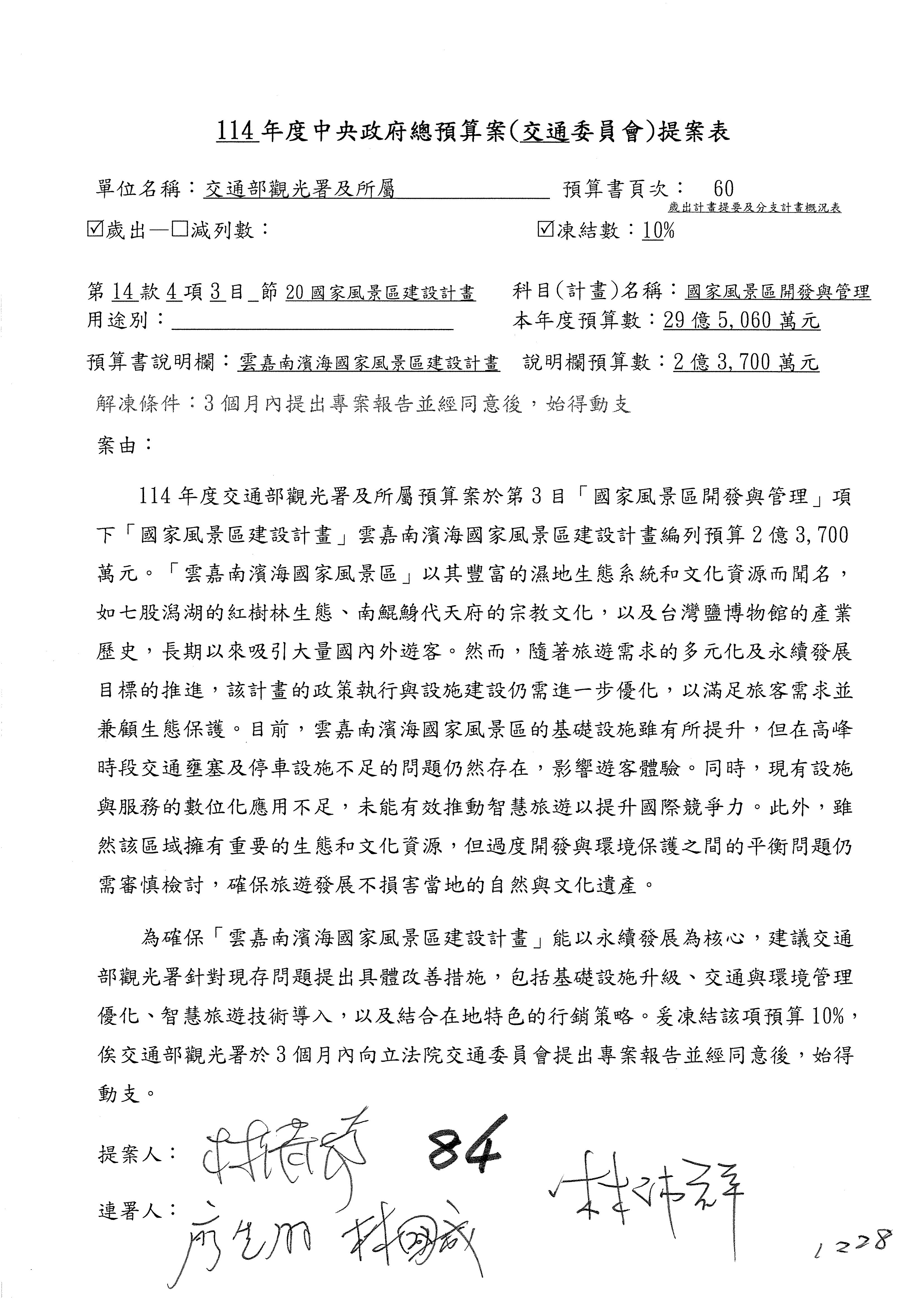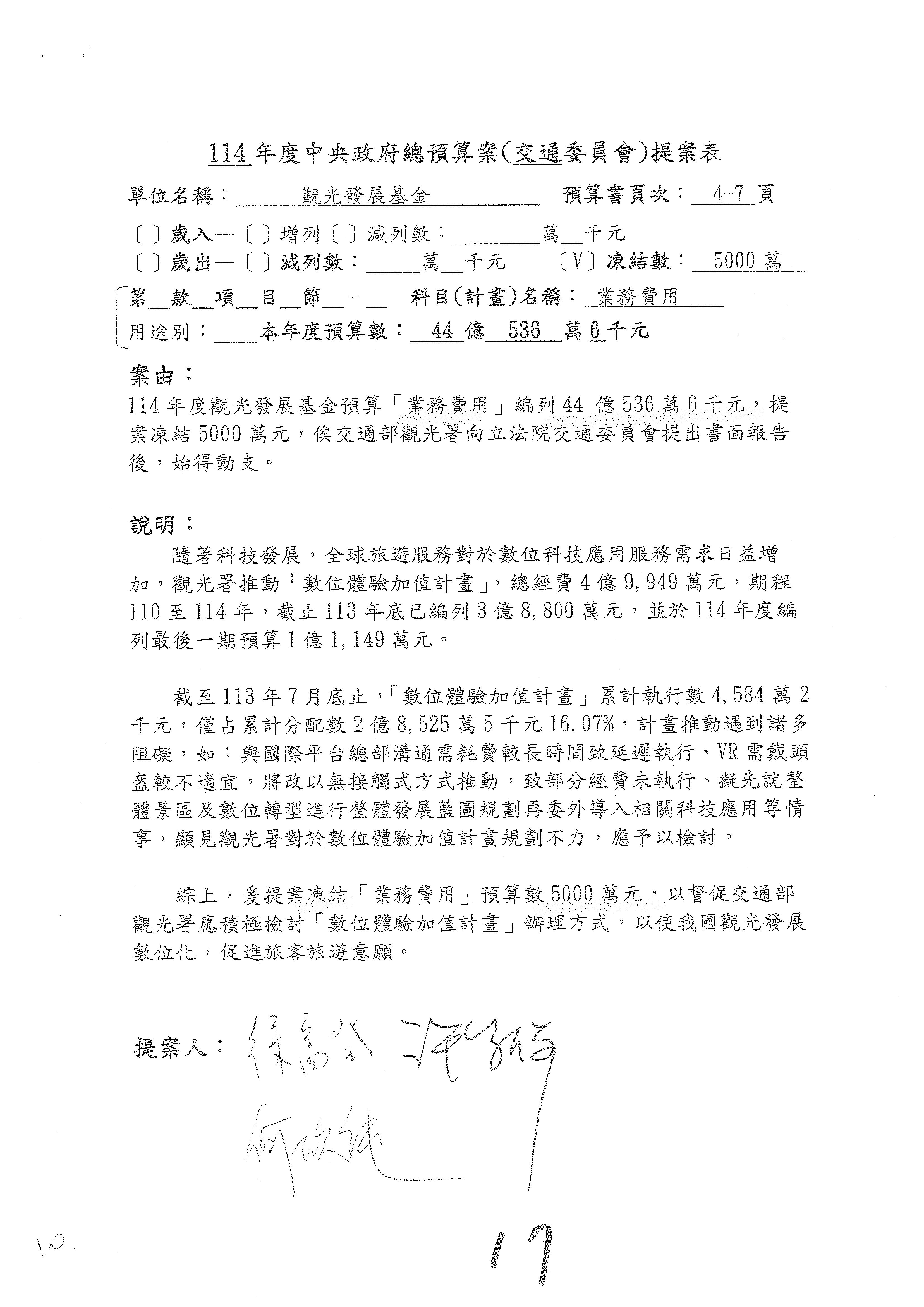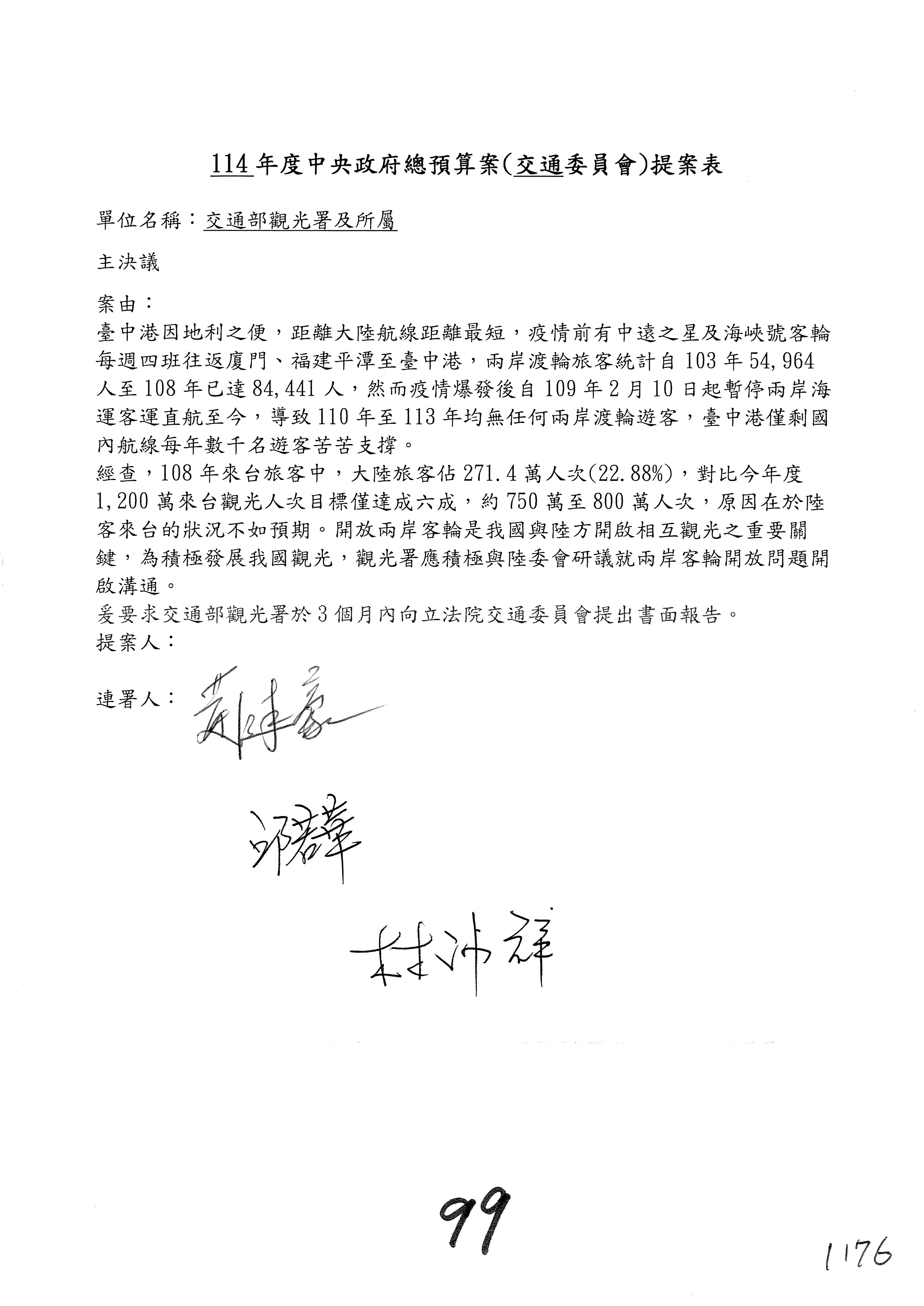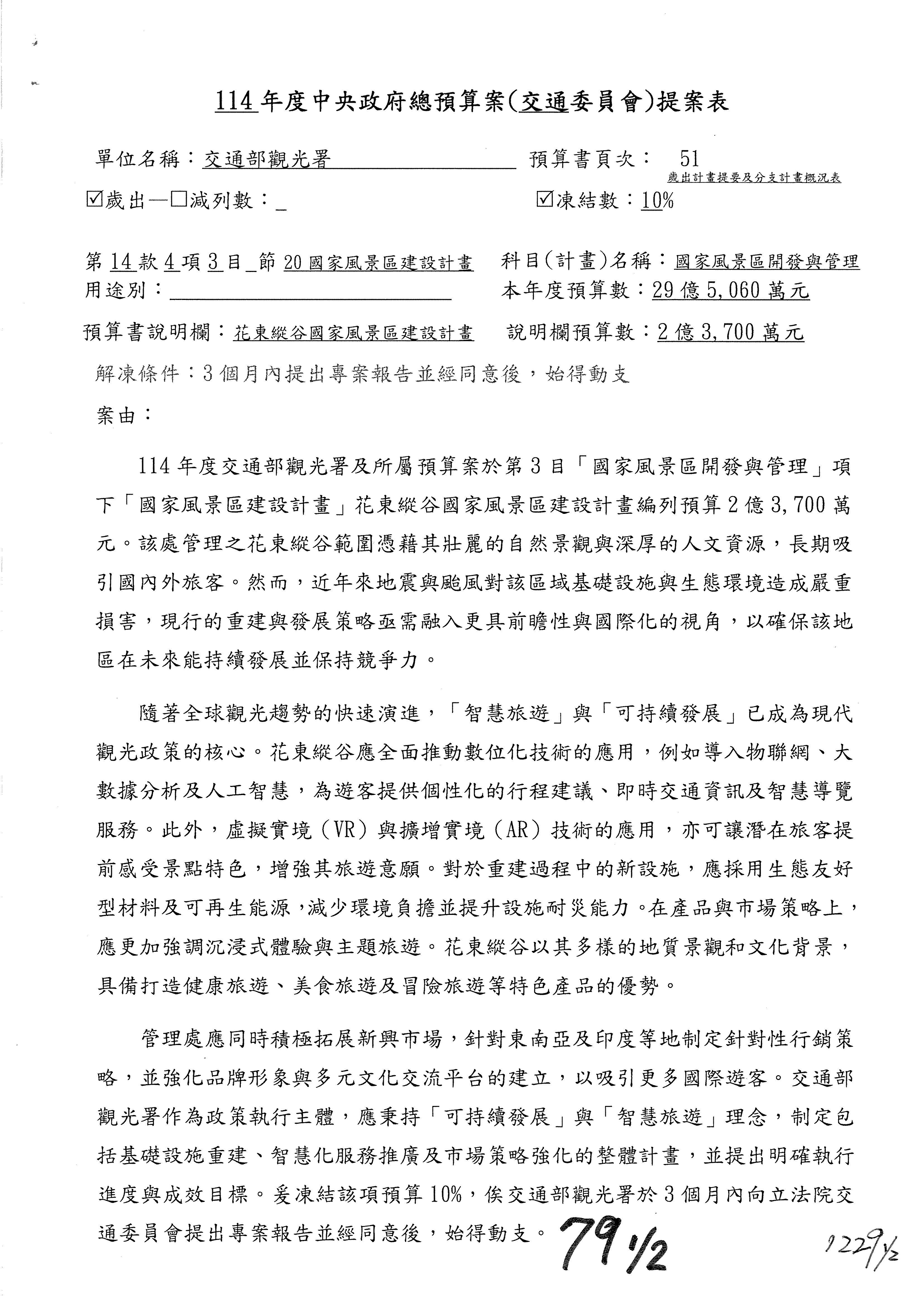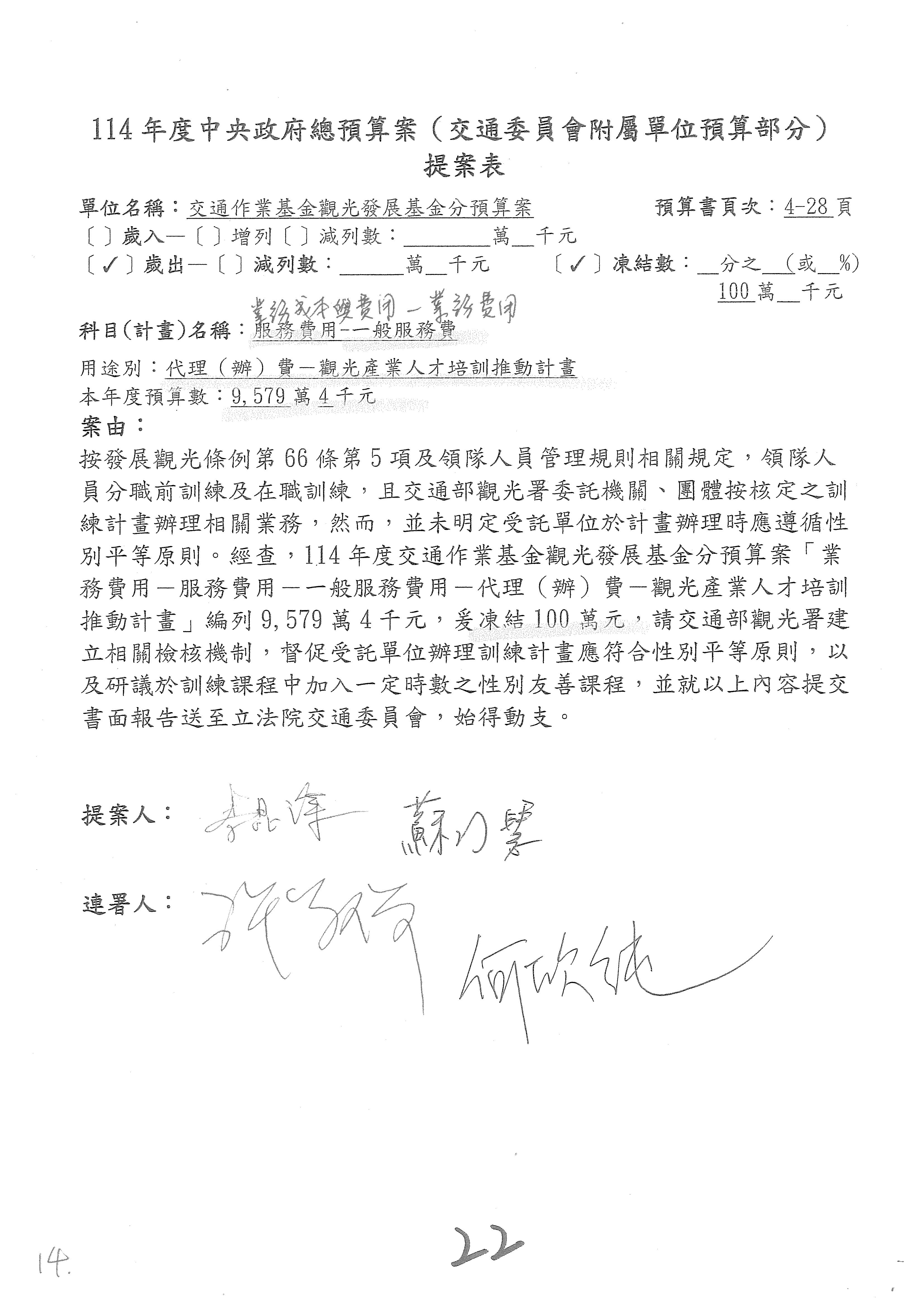 接下來處理交通部觀光發展基金114年度附屬單位預算,請各位參照建議併案及預算表。開始處理第1案。第1案林國成委員已經改主決議,沒問題吧?