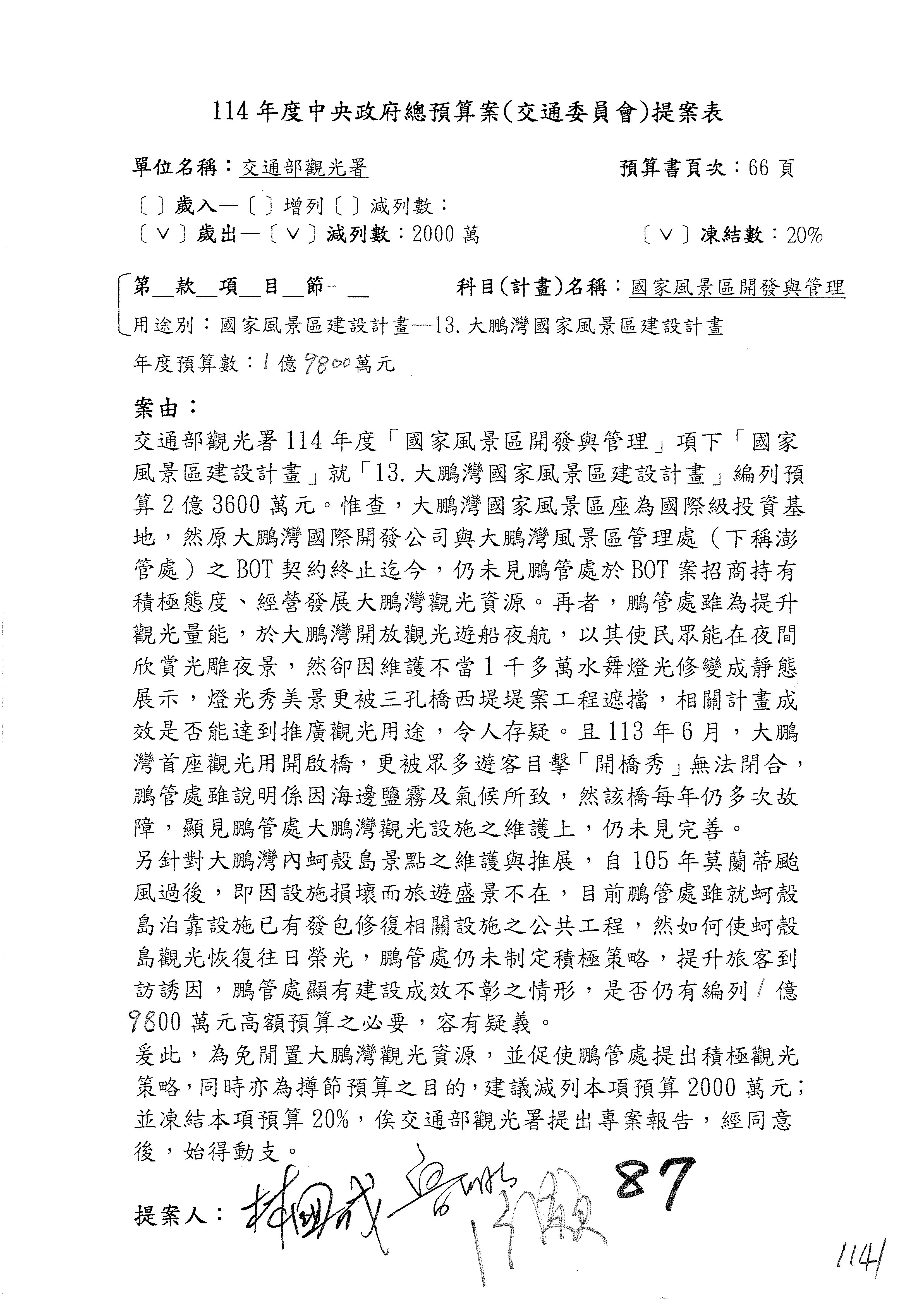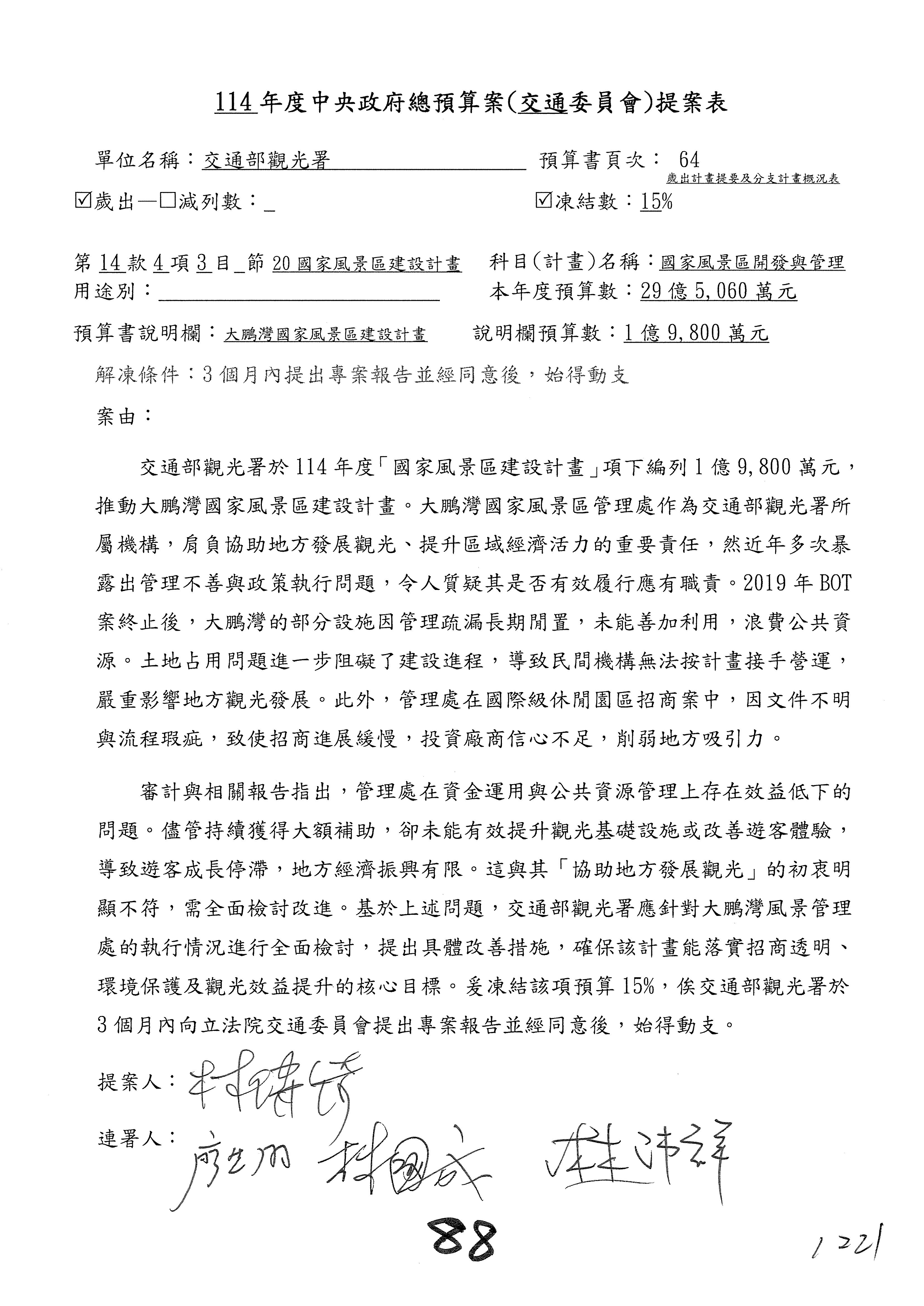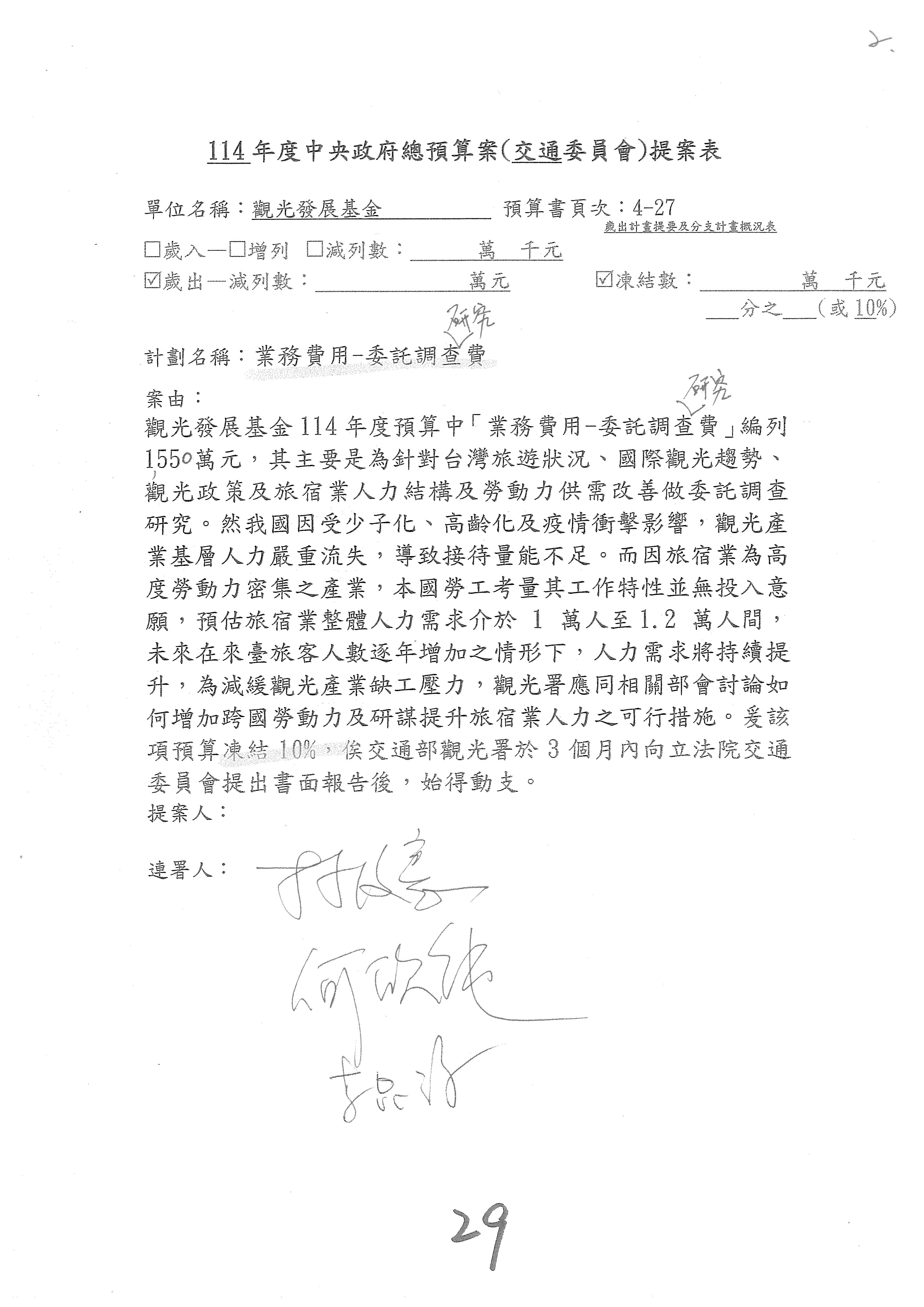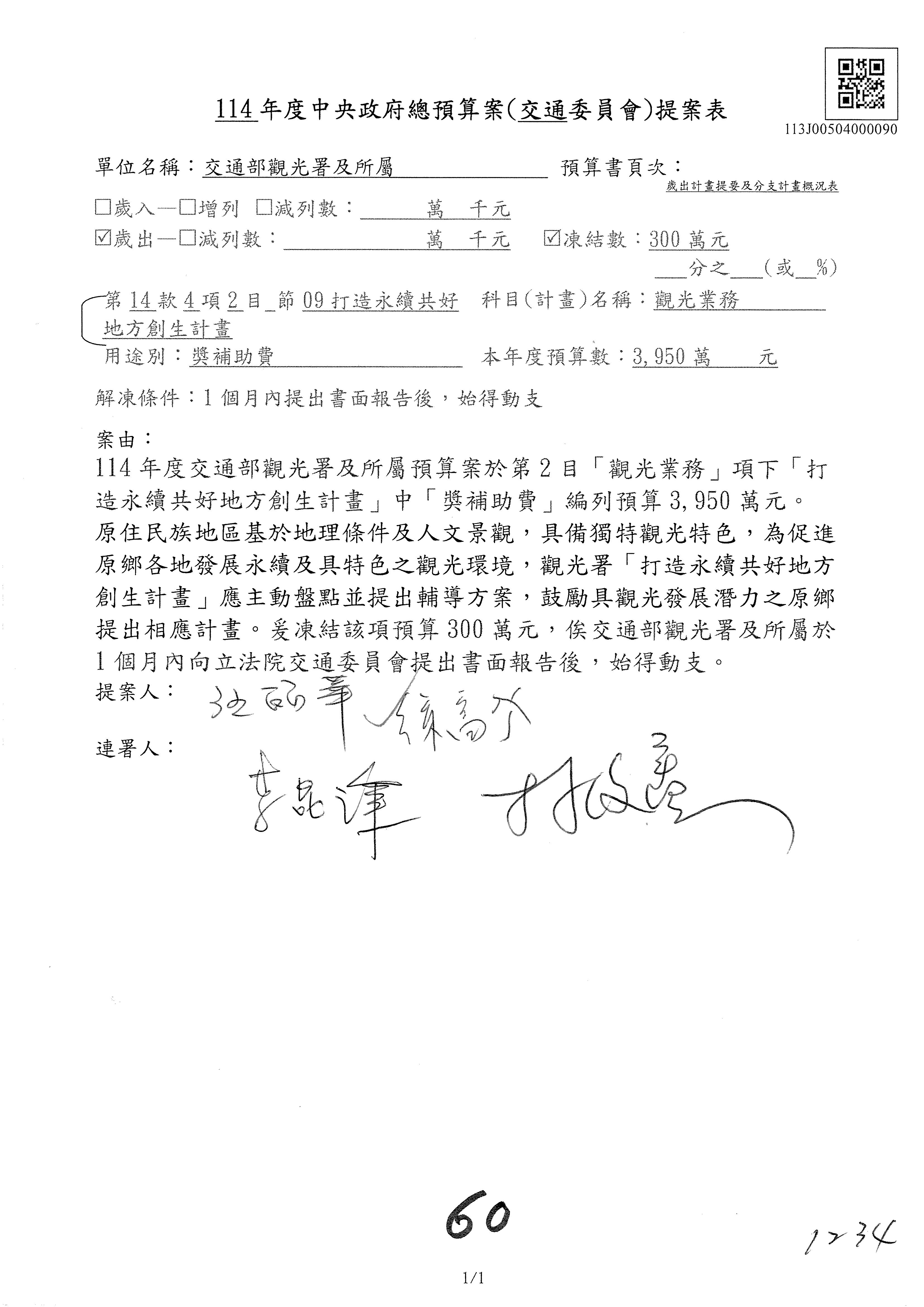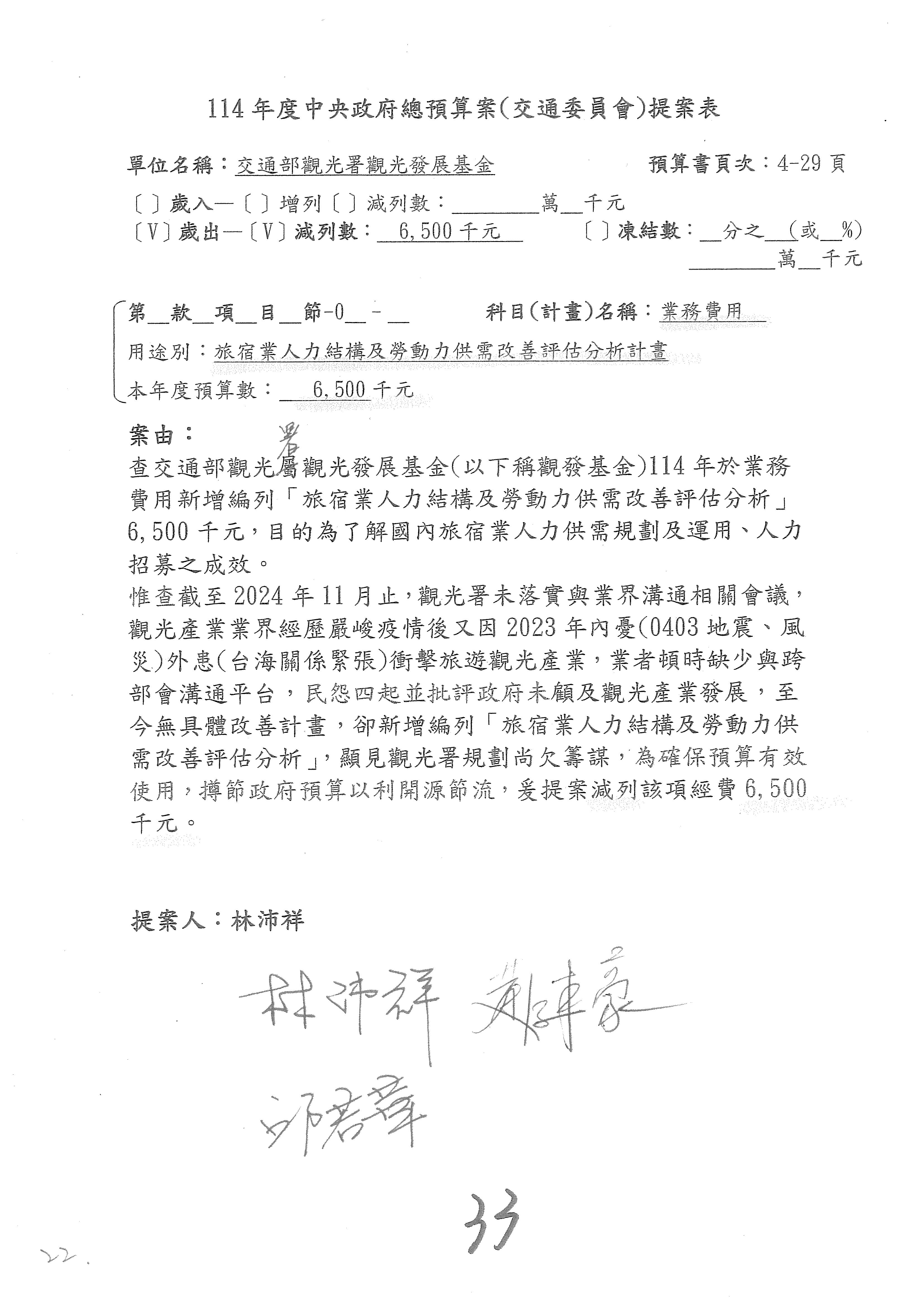 接下來處理交通部觀光發展基金114年度附屬單位預算,請各位參照建議併案及預算表。開始處理第1案。第1案林國成委員已經改主決議,沒問題吧?