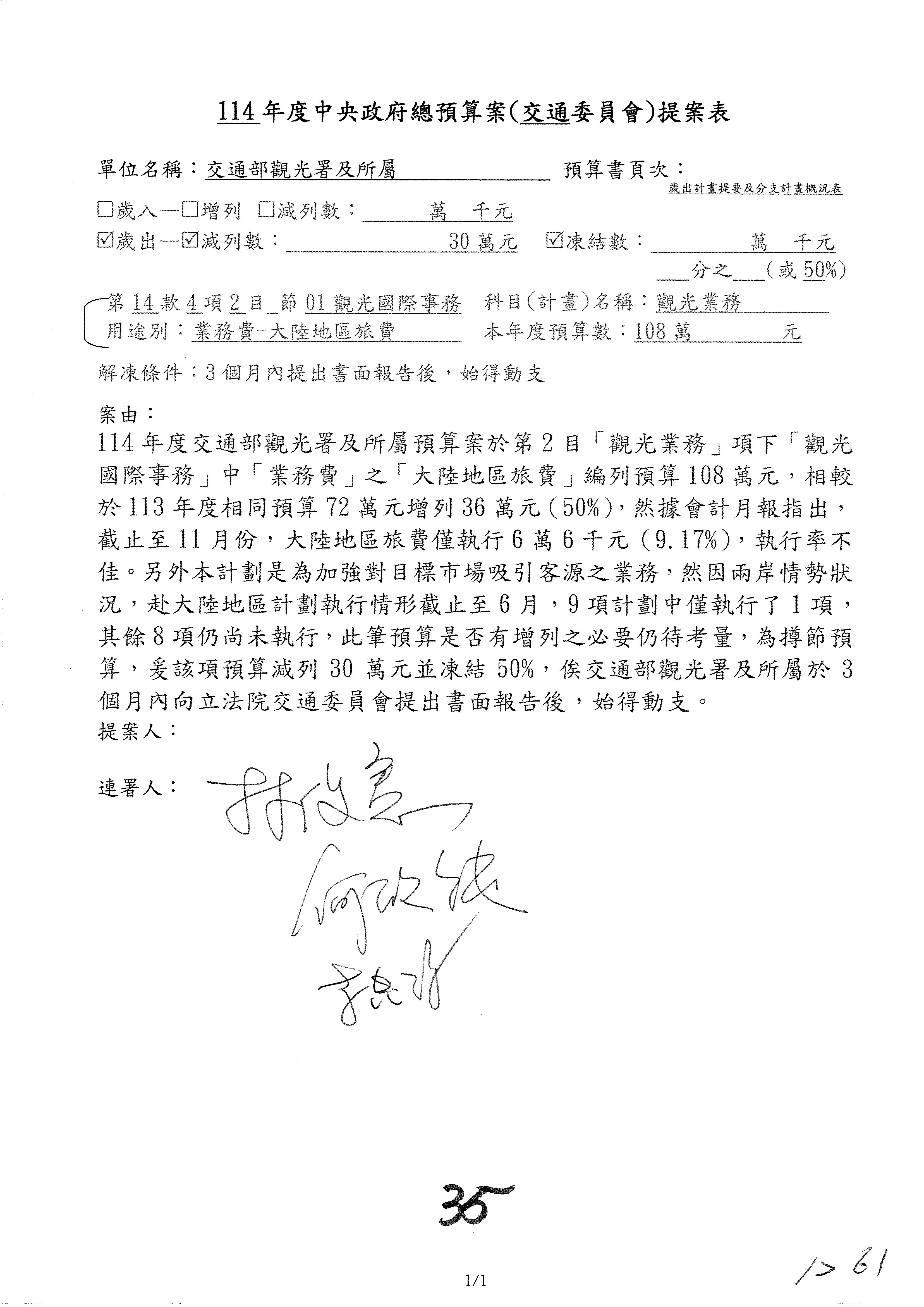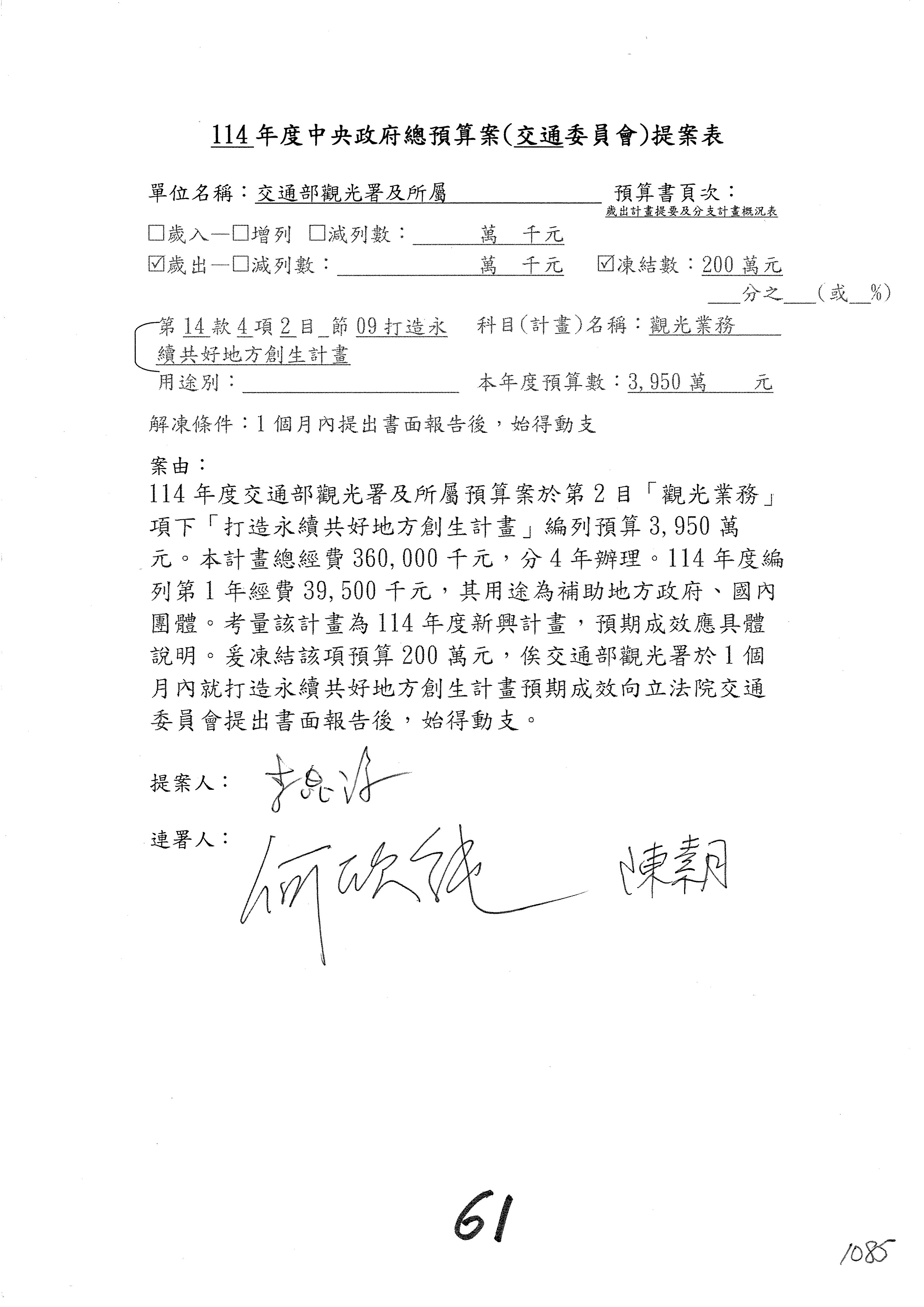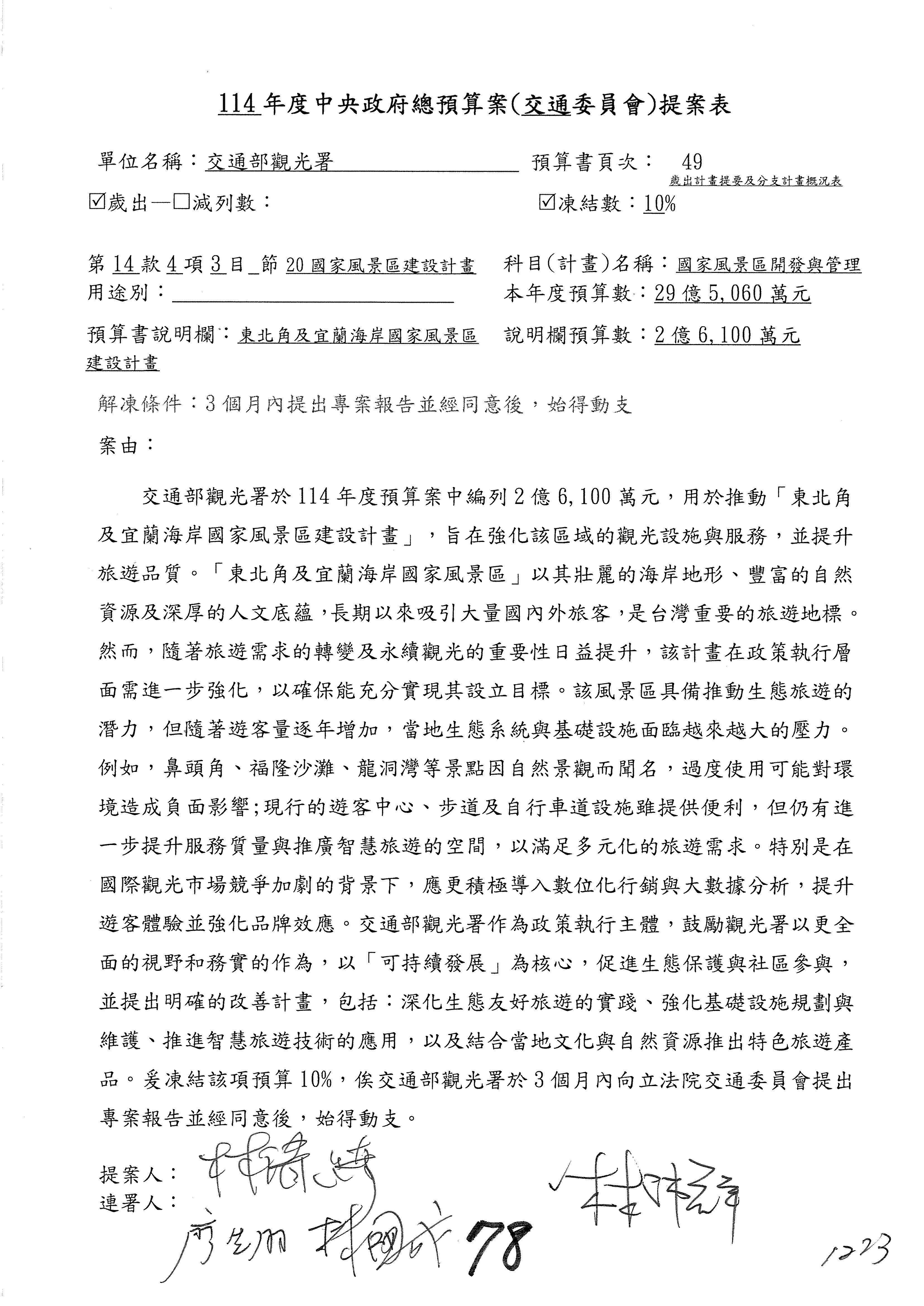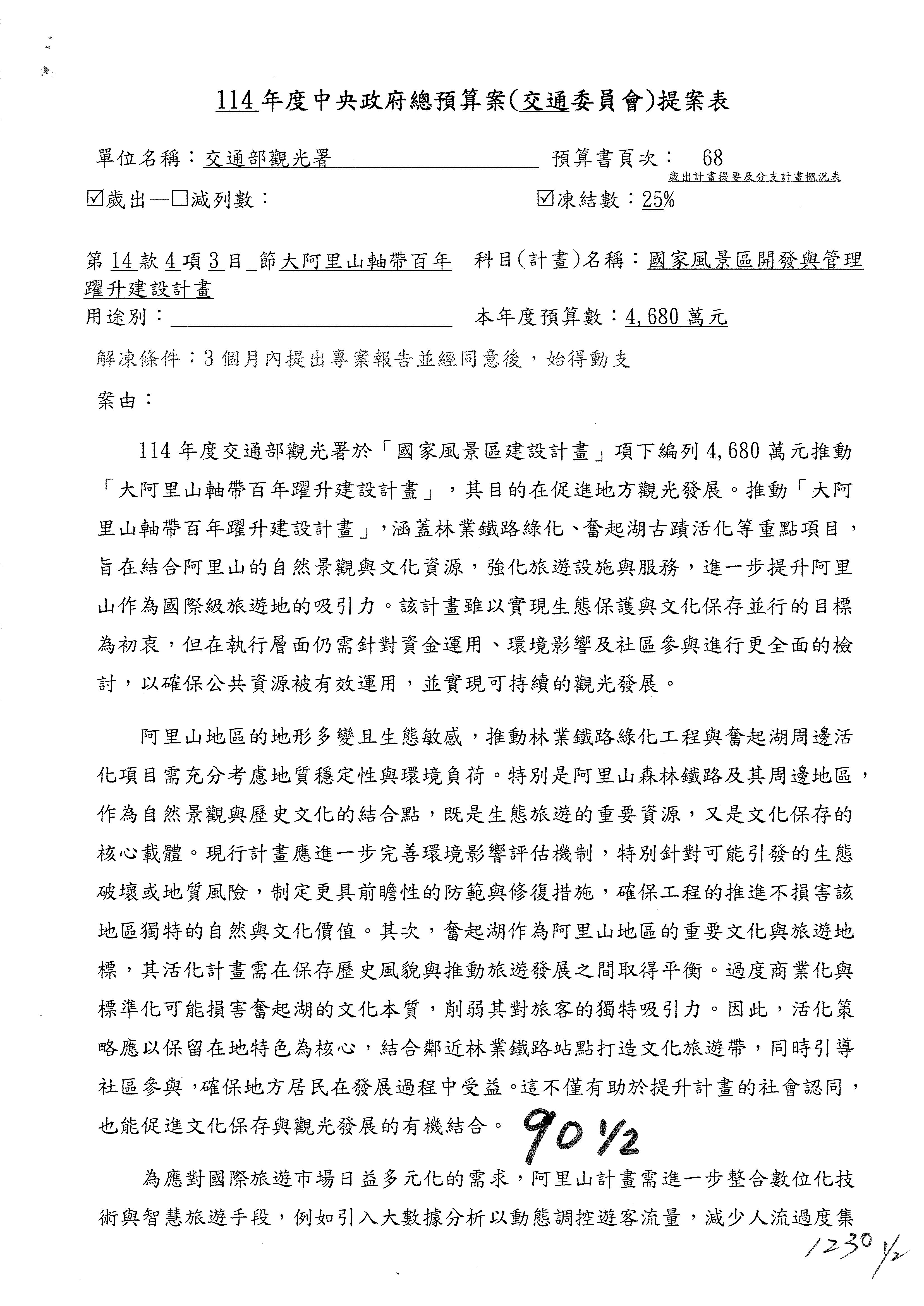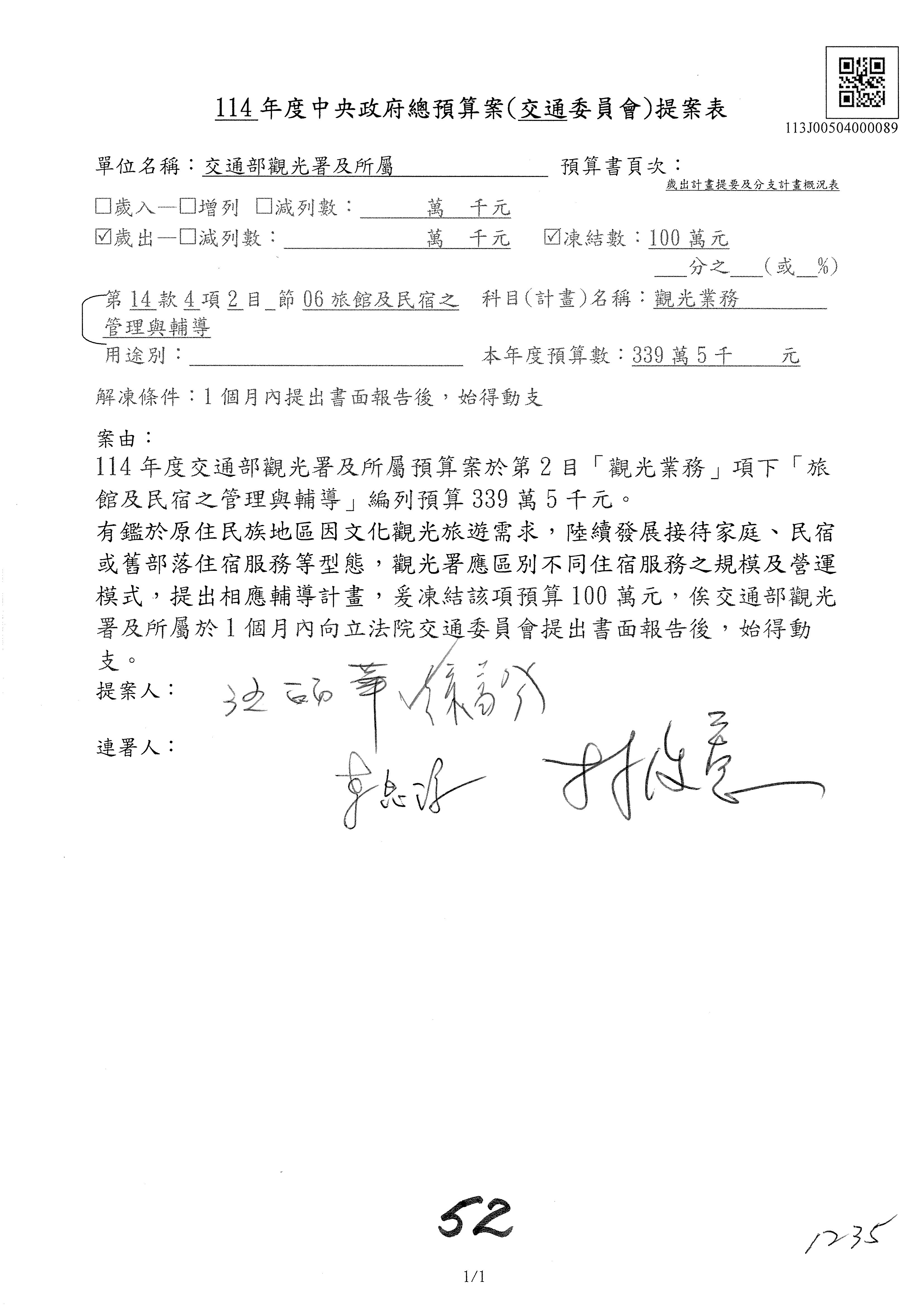接下來處理交通部觀光發展基金114年度附屬單位預算,請各位參照建議併案及預算表。開始處理第1案。第1案林國成委員已經改主決議,沒問題吧?