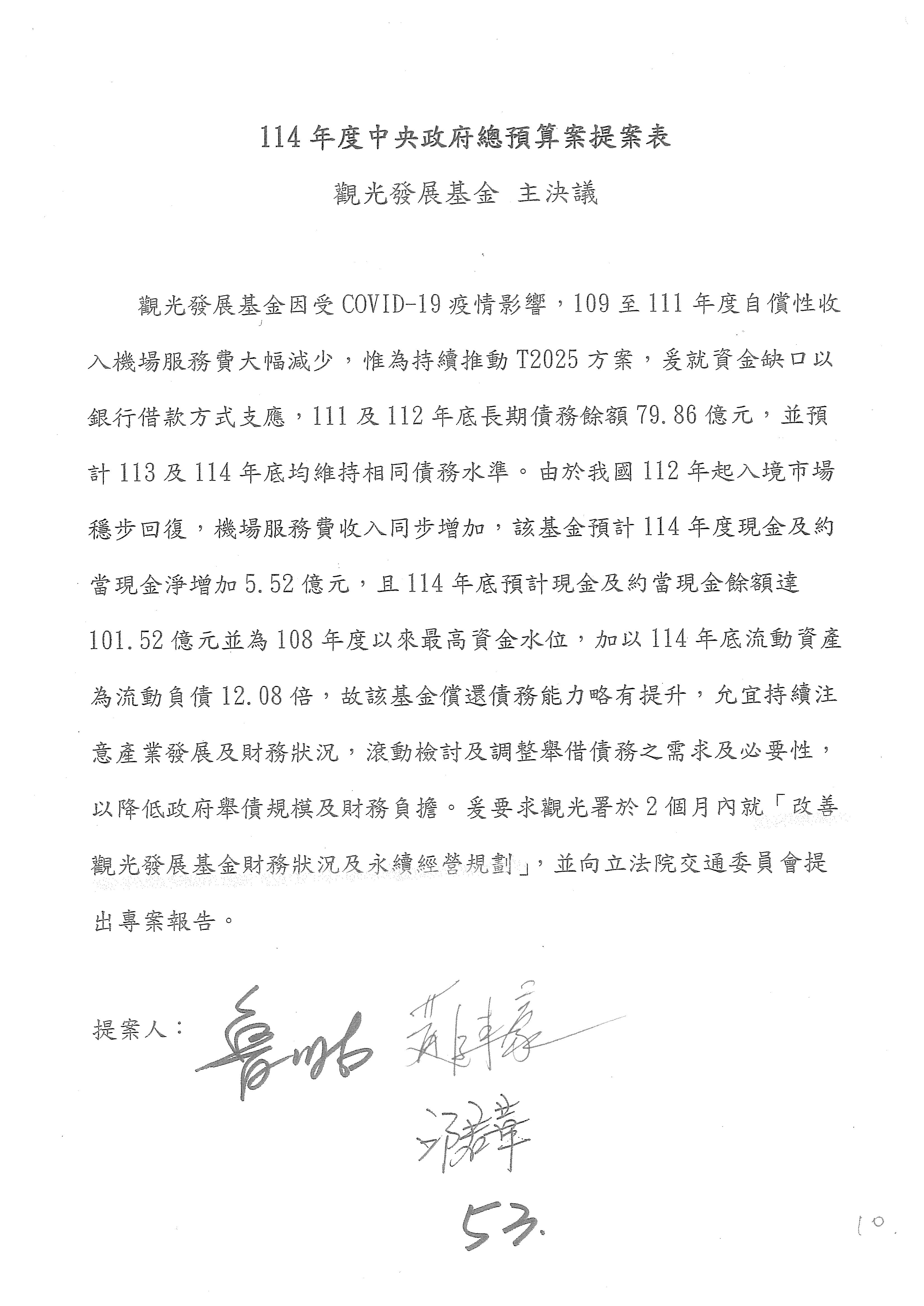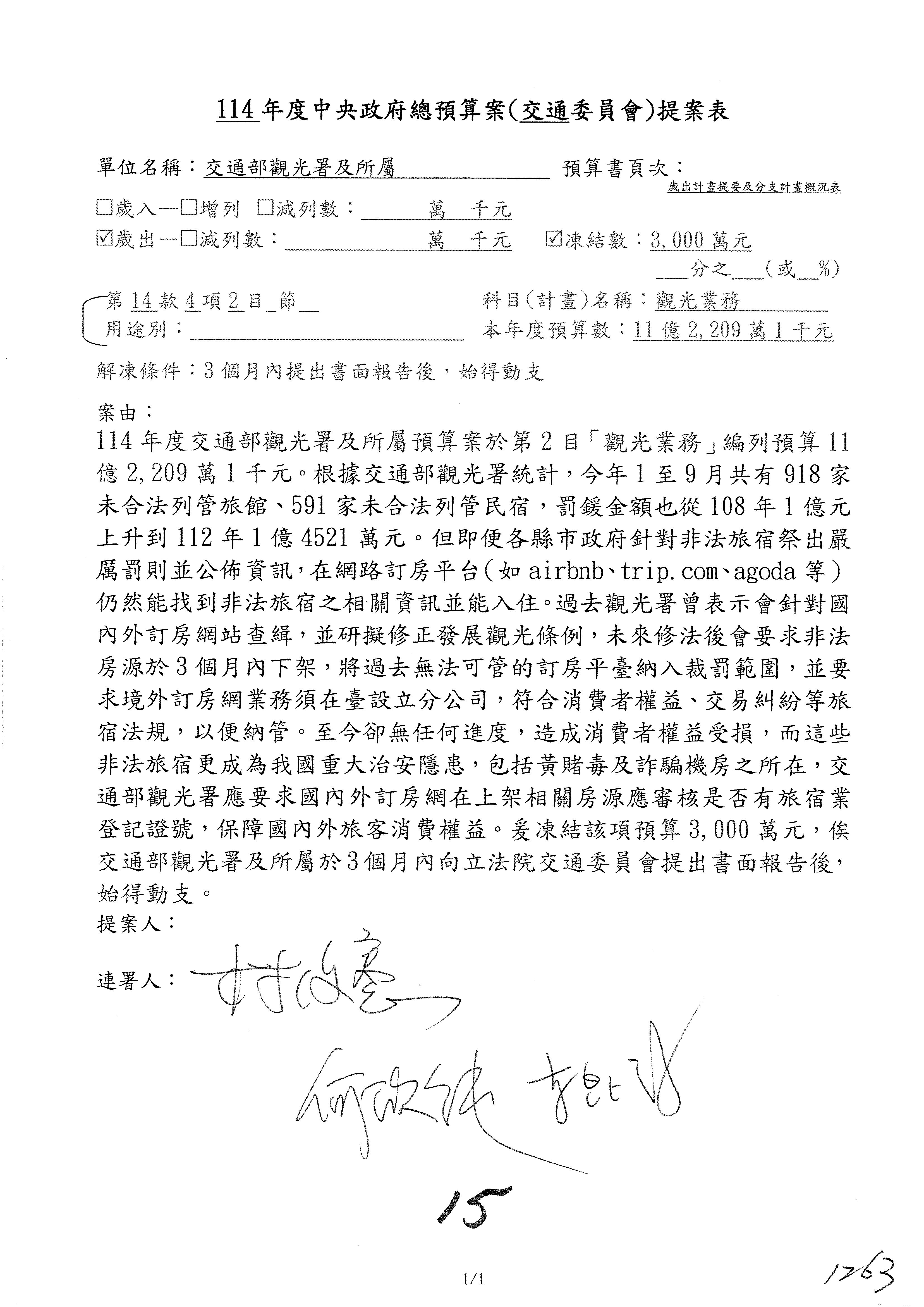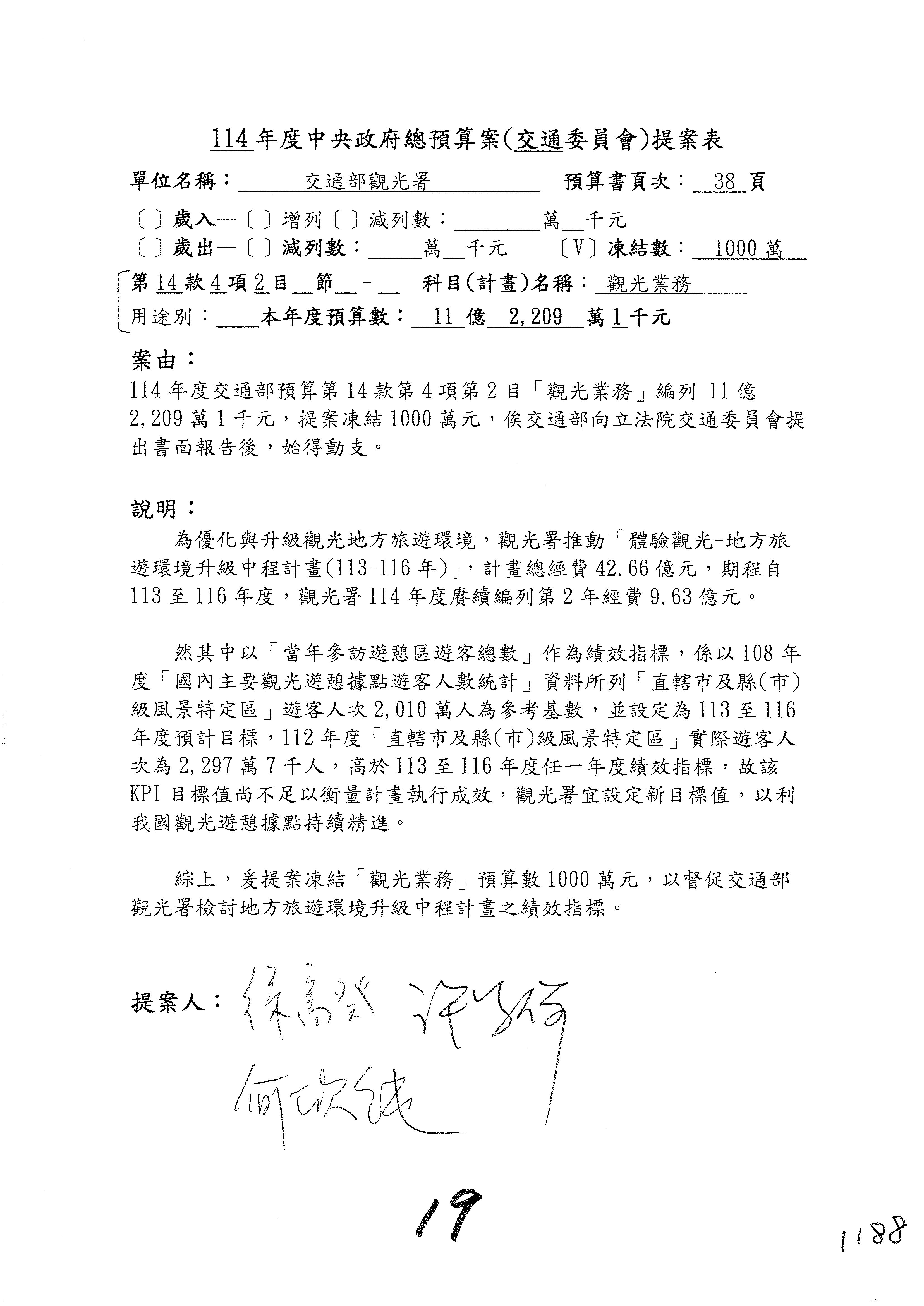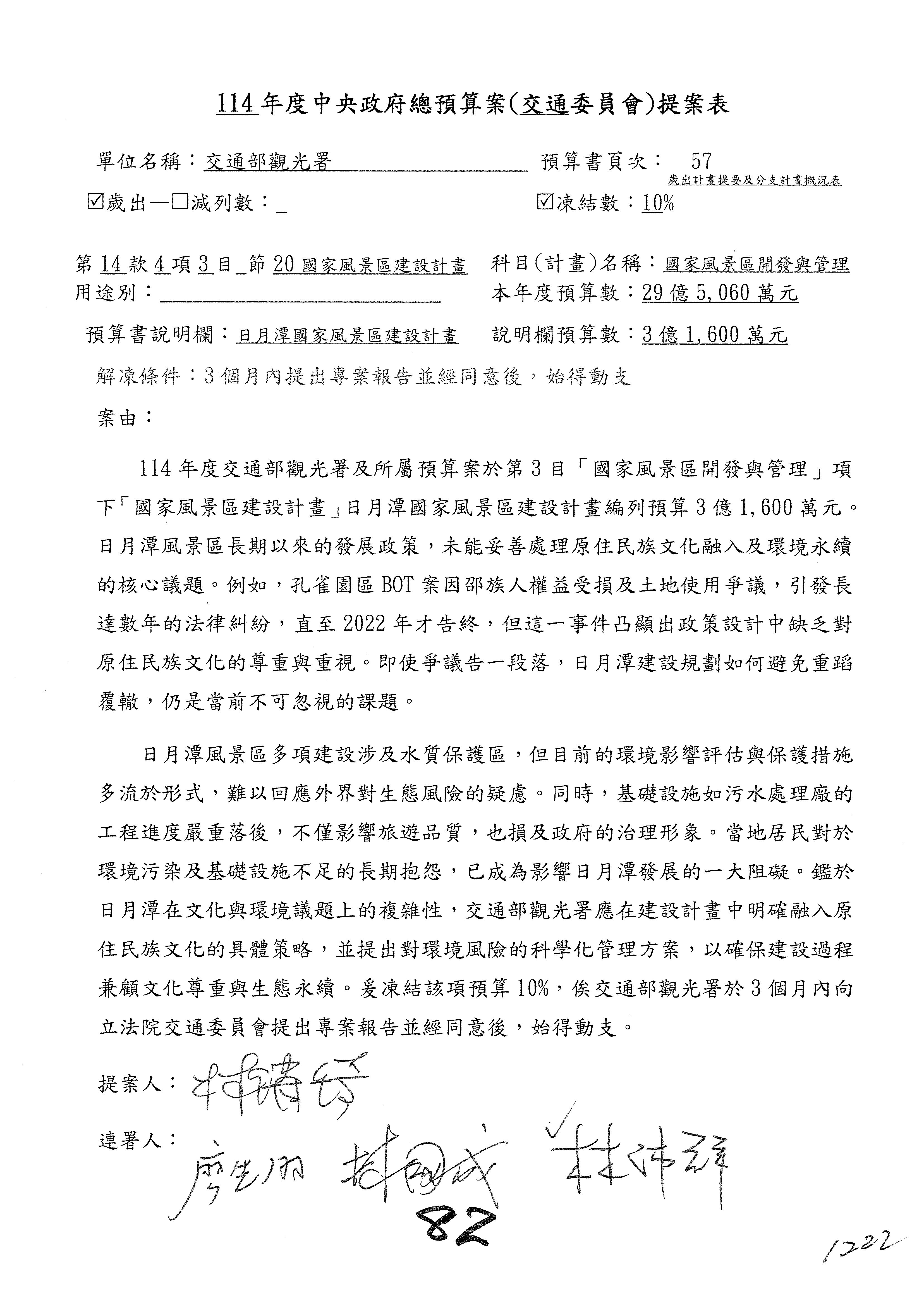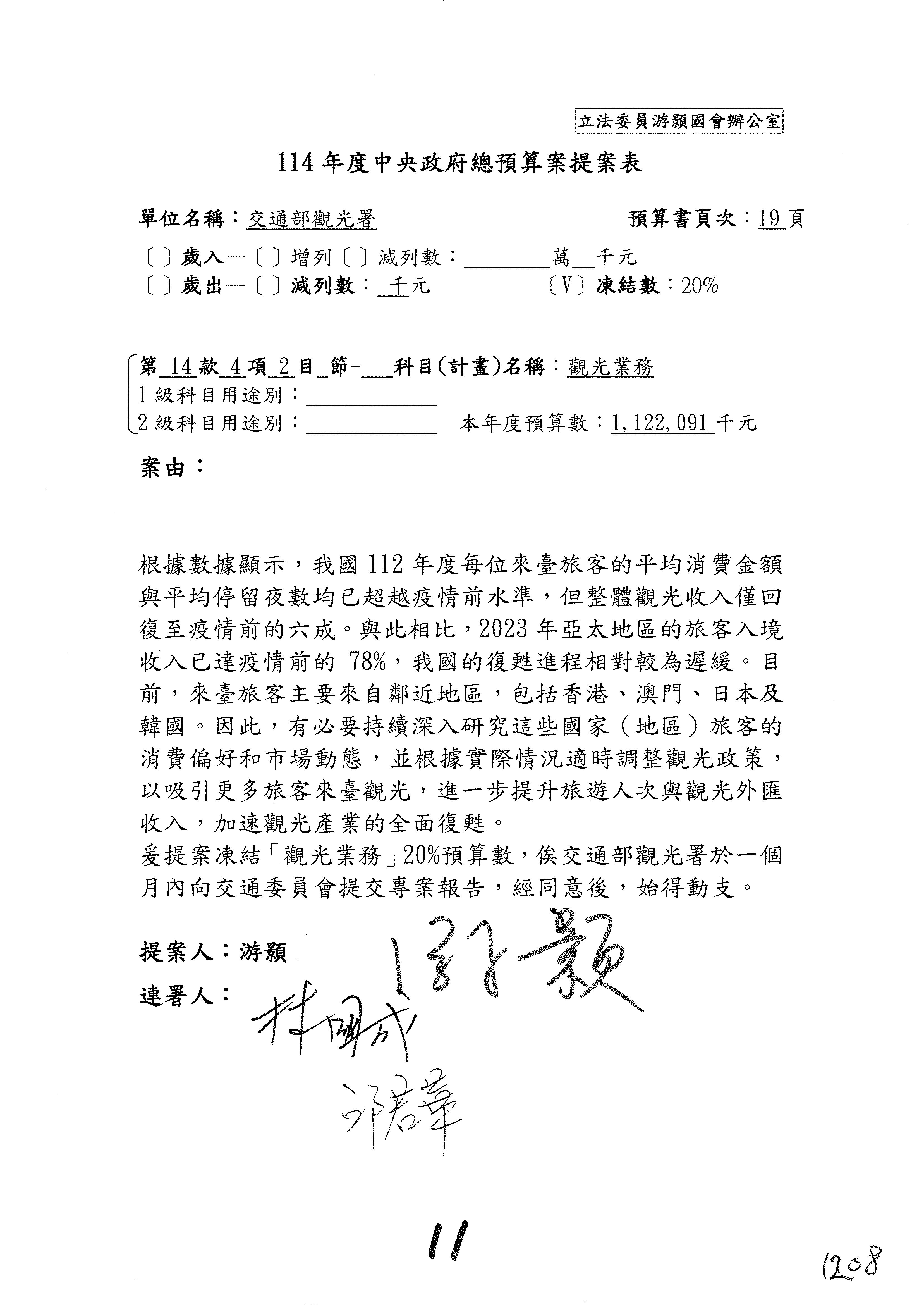 接下來處理交通部觀光發展基金114年度附屬單位預算,請各位參照建議併案及預算表。開始處理第1案。第1案林國成委員已經改主決議,沒問題吧?