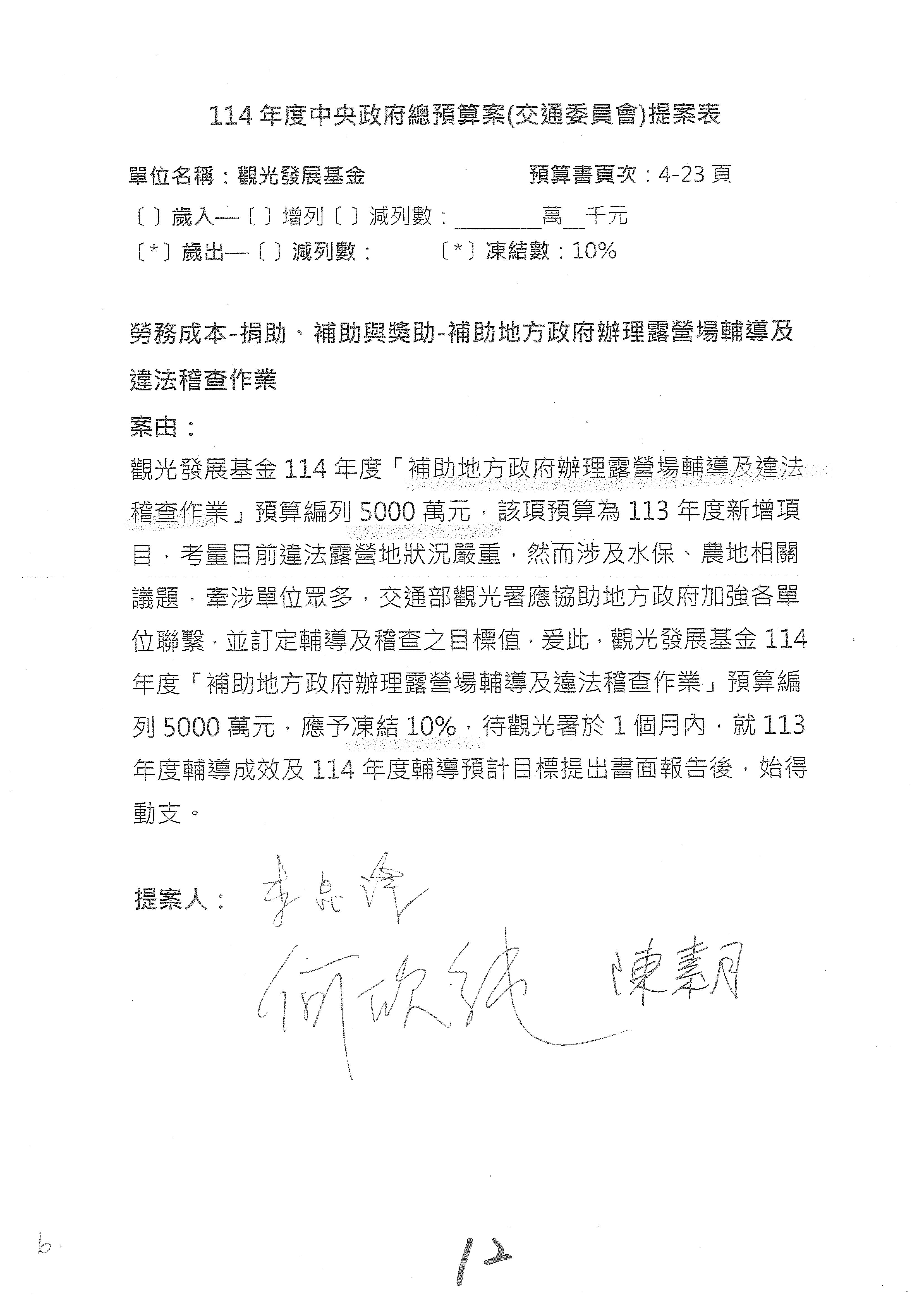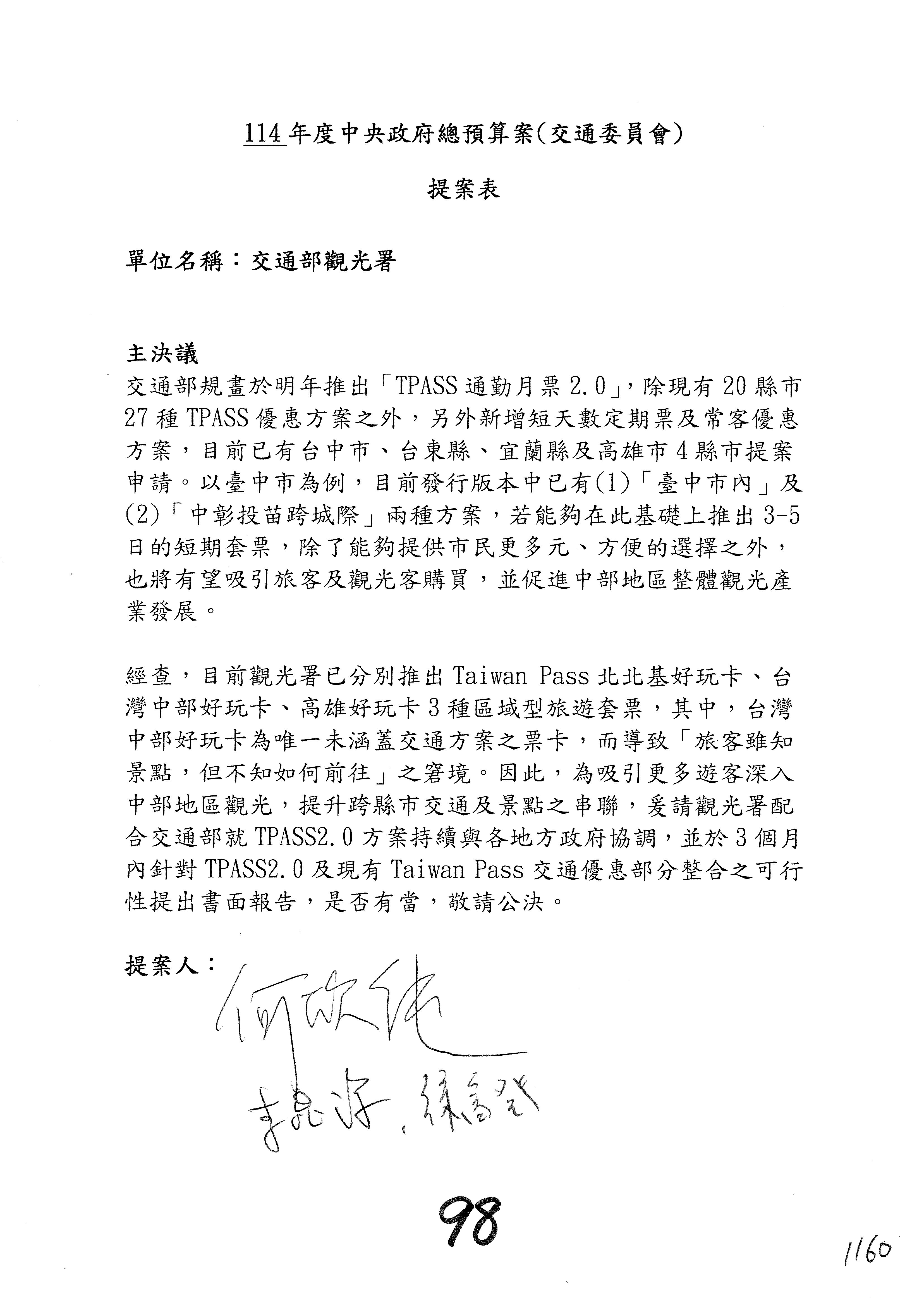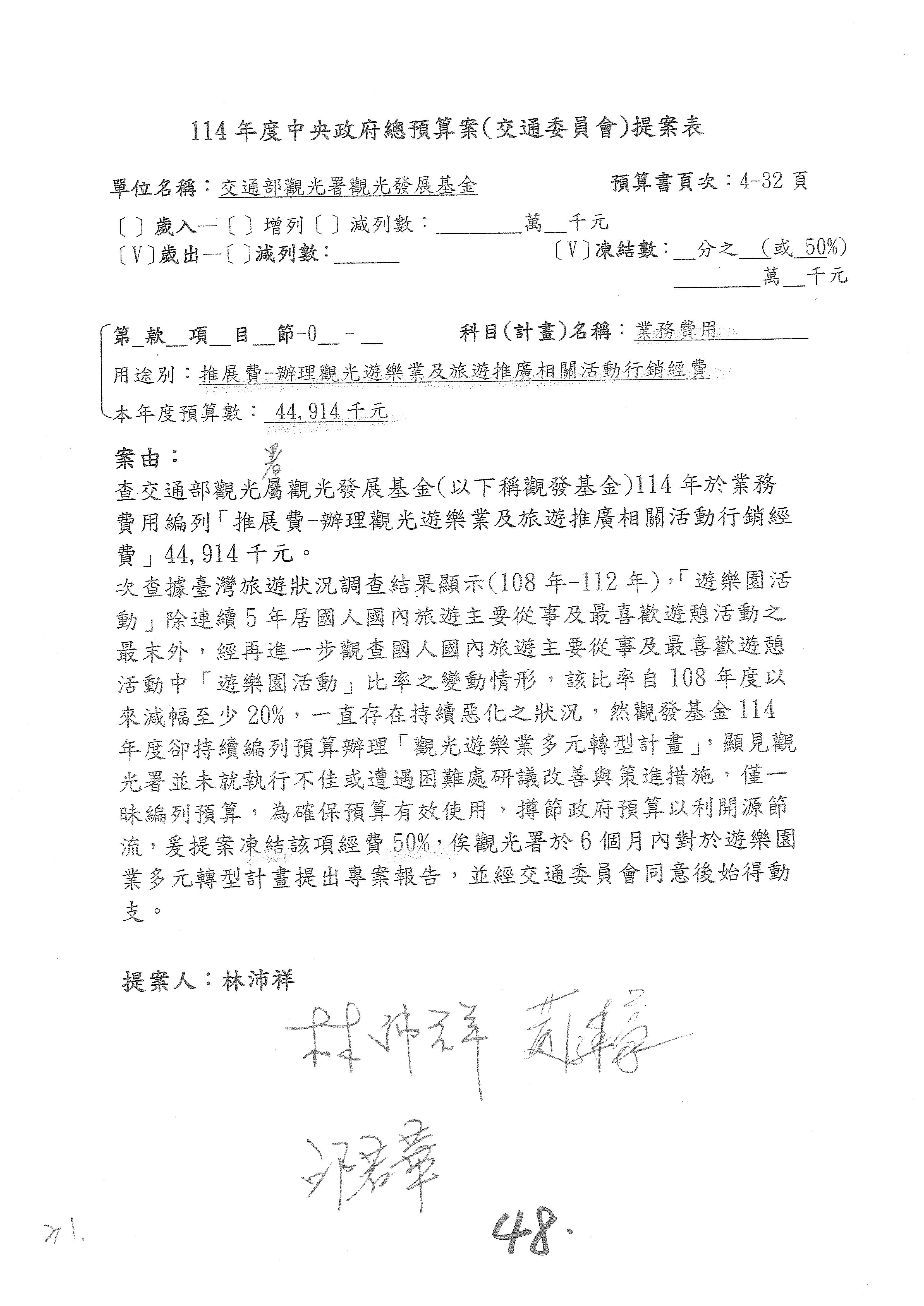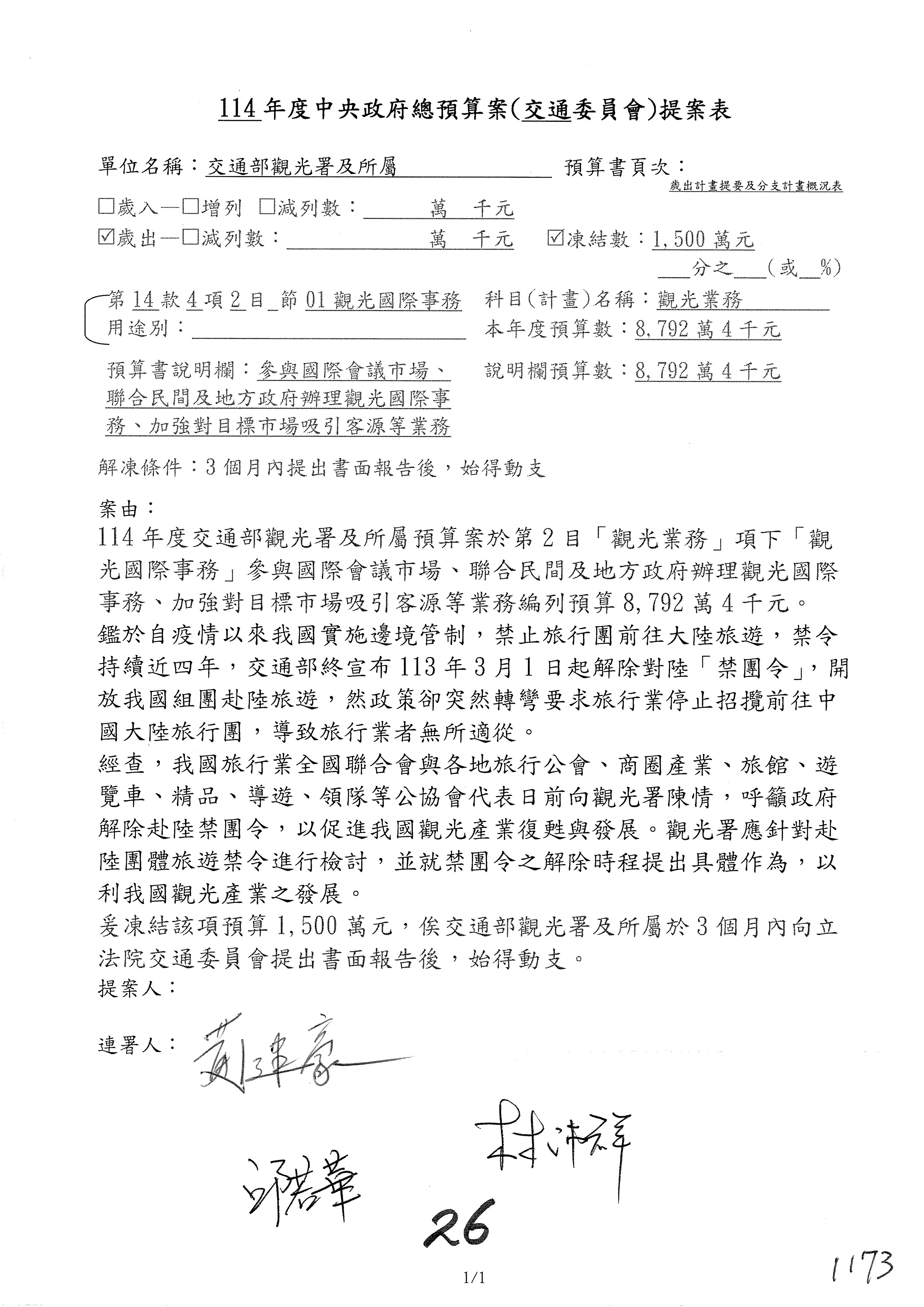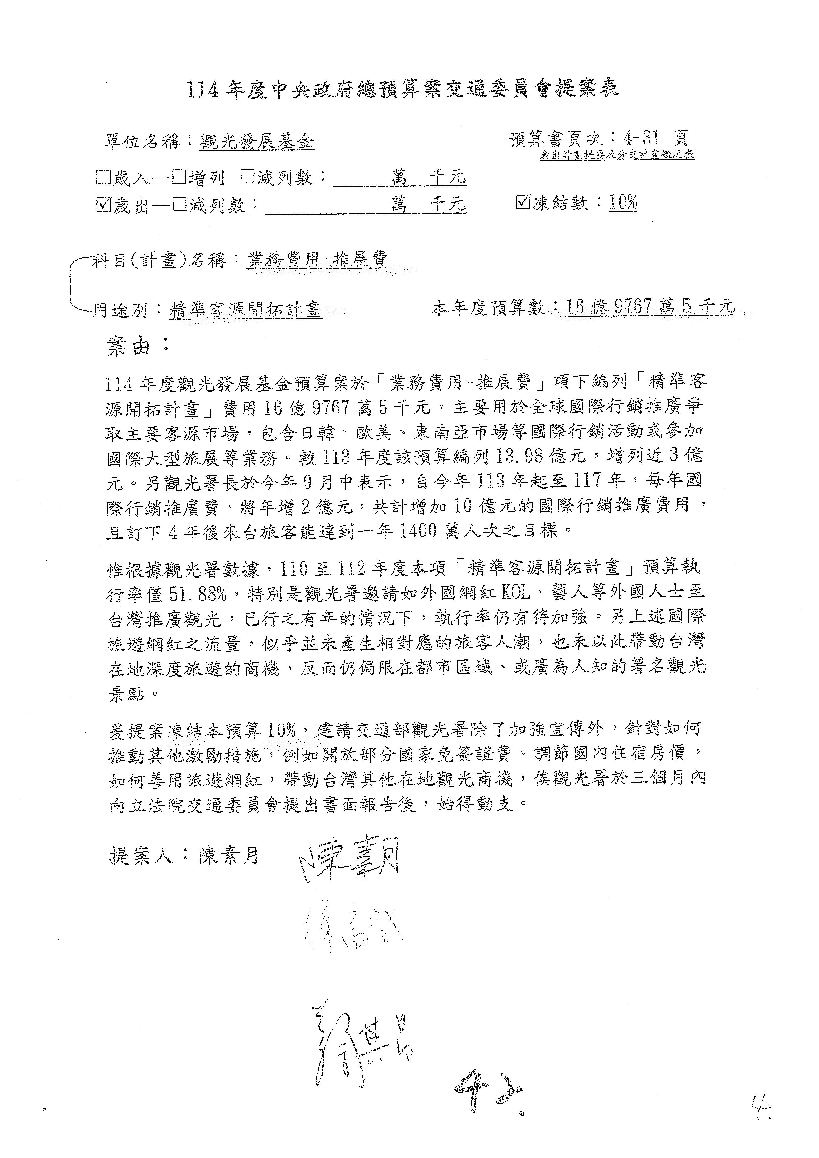 接下來處理交通部觀光發展基金114年度附屬單位預算,請各位參照建議併案及預算表。開始處理第1案。第1案林國成委員已經改主決議,沒問題吧?